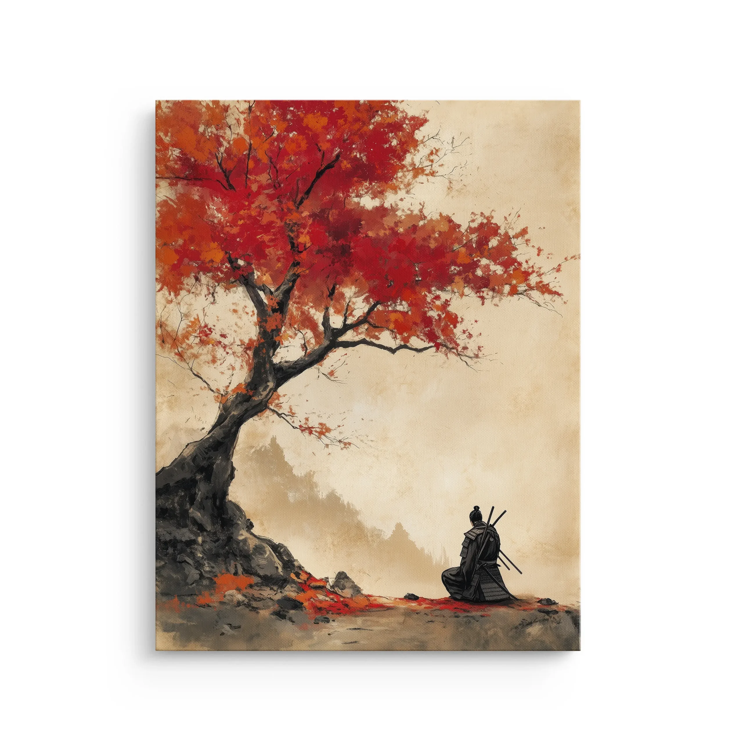 Autumn Warrior captures a quiet moment of reflection beneath a blazing maple canopy, blending ink-wash textures with warm fall tones and calm negative space.