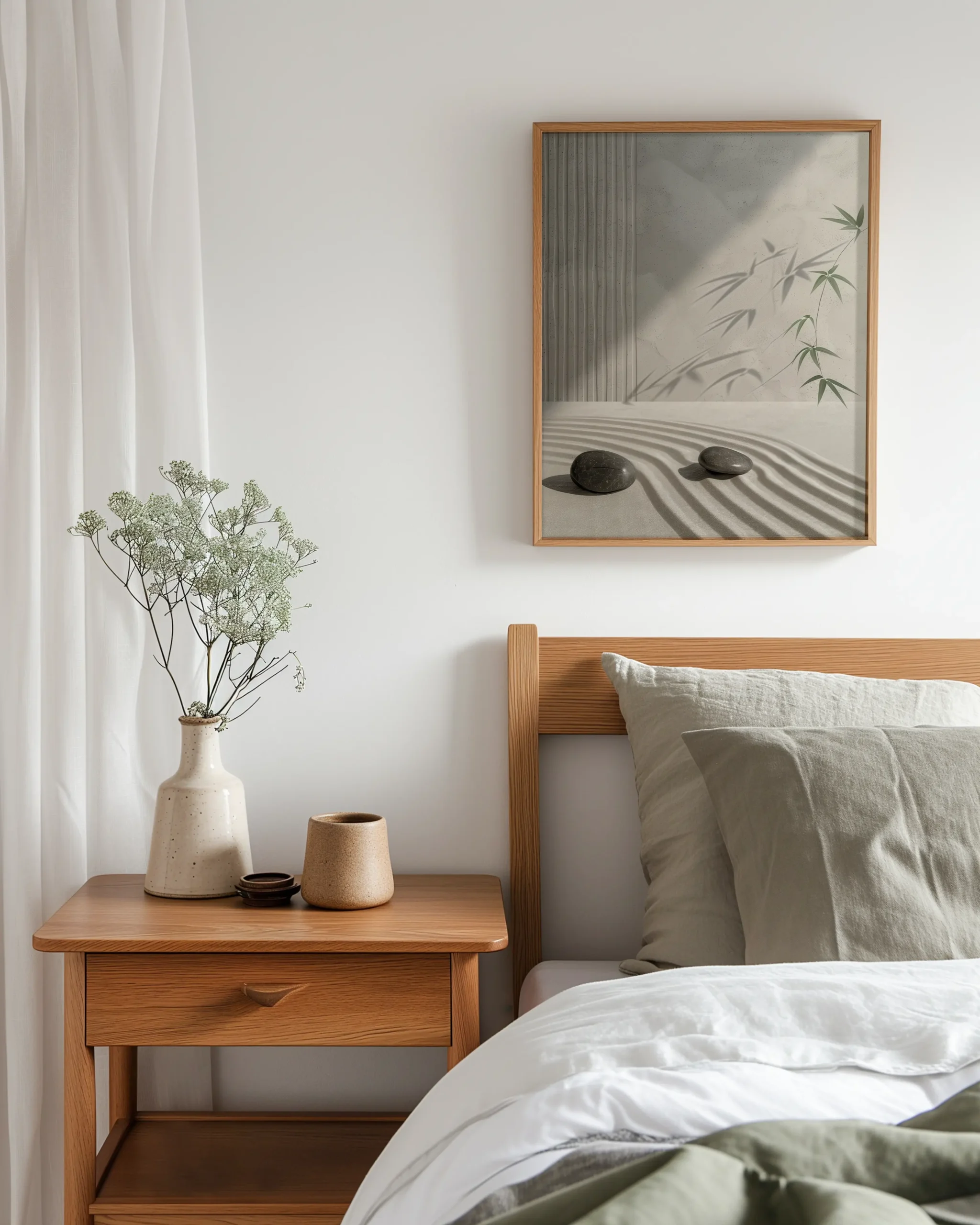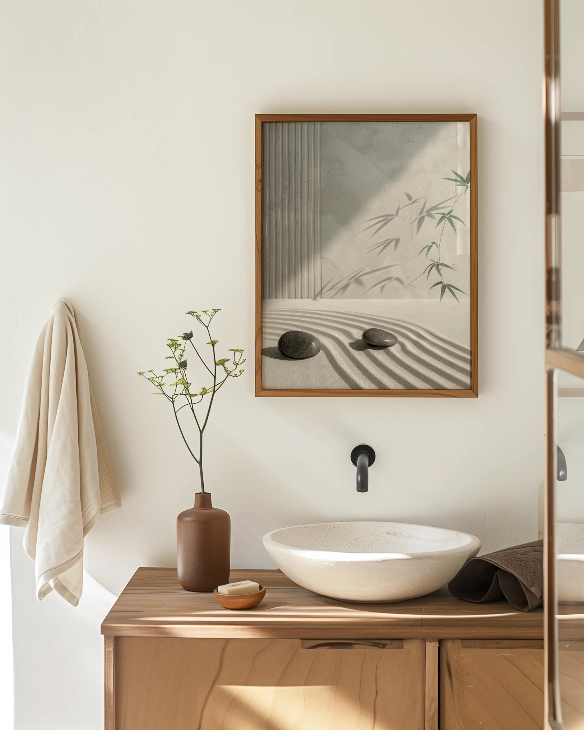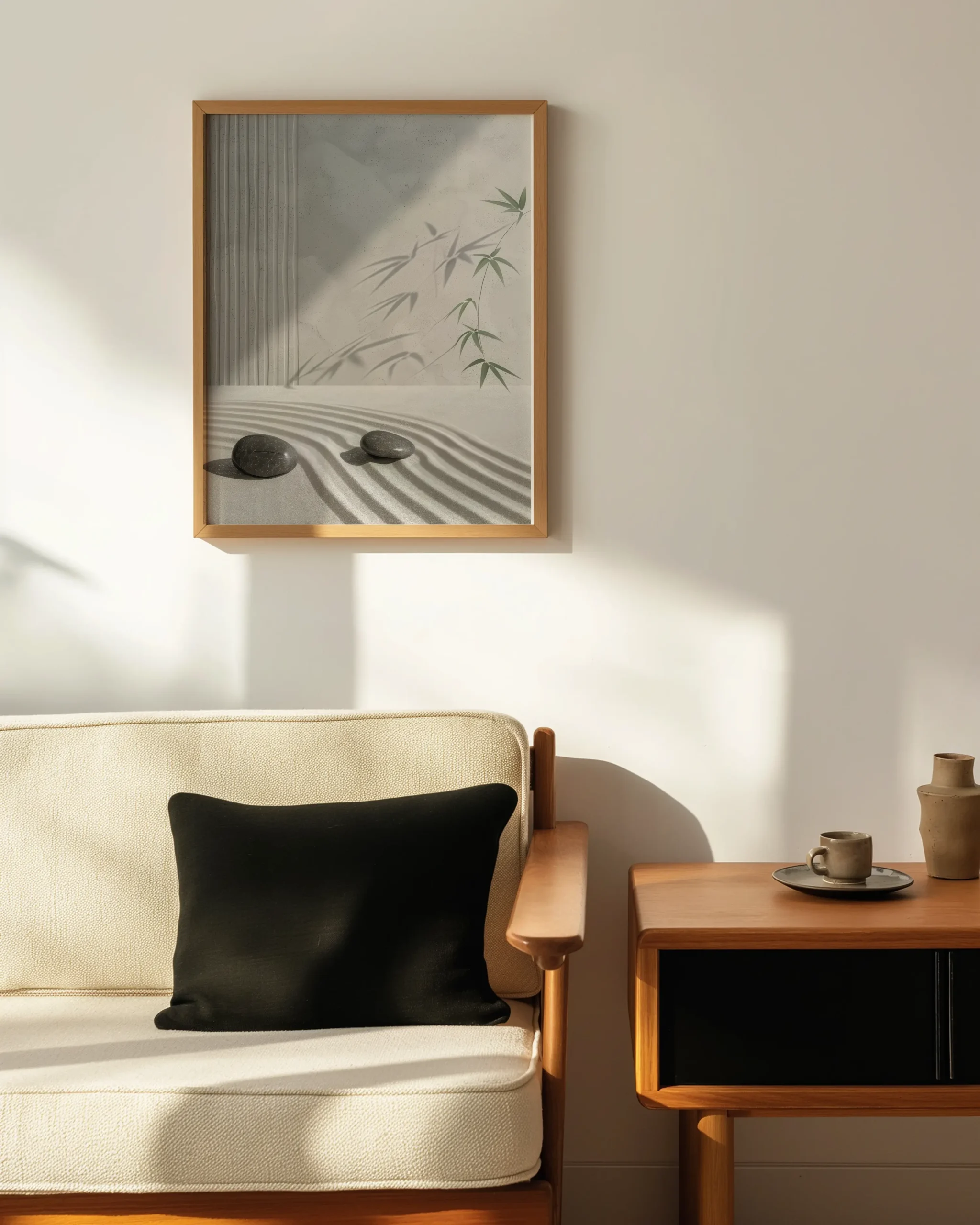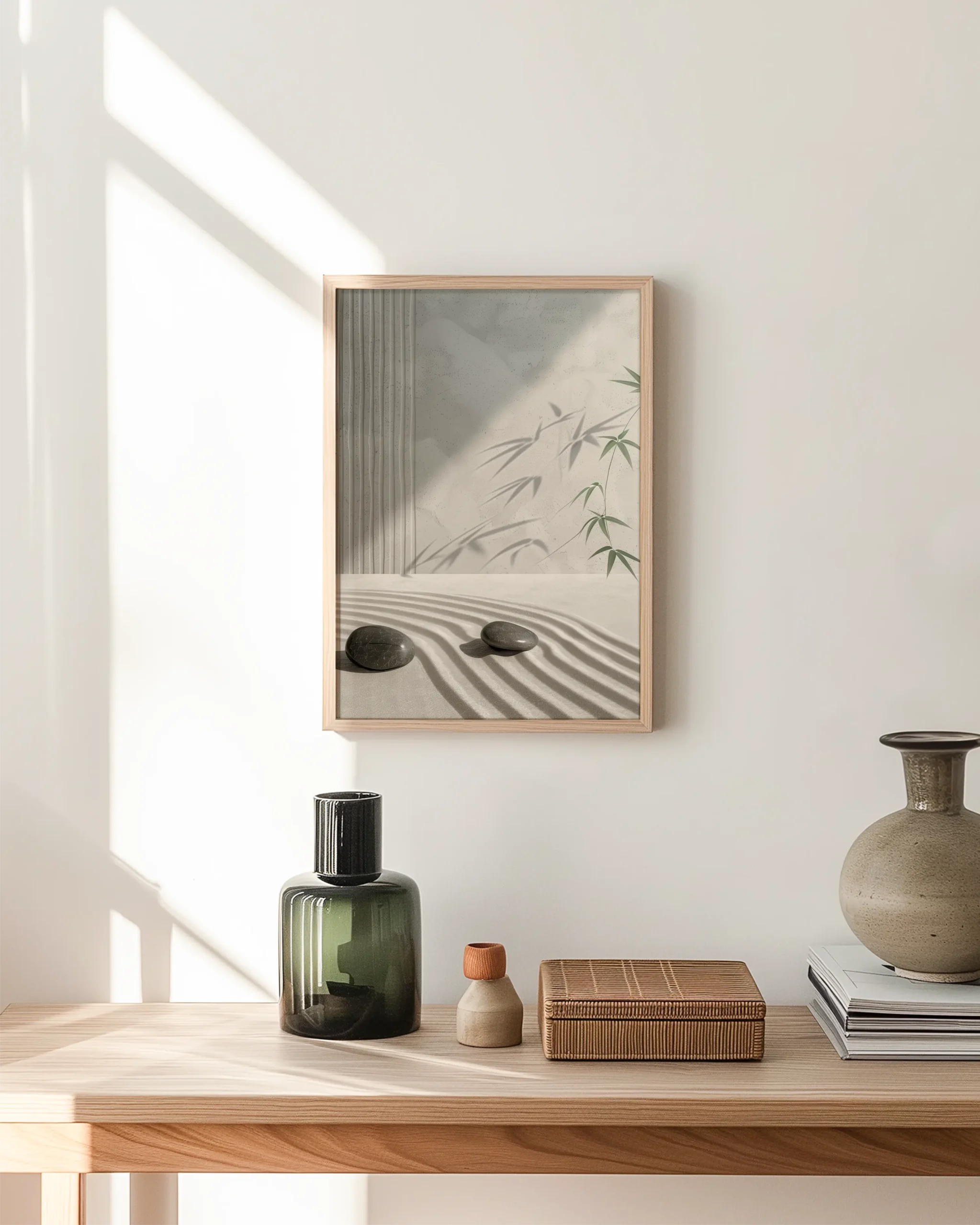 Bamboo shadows fall across raked sand and smooth river stones—a serene Japandi zen garden printed on museum-quality enhanced matte paper. Framed and ready to hang with your preferred frame (Black, White, or Red Oak).