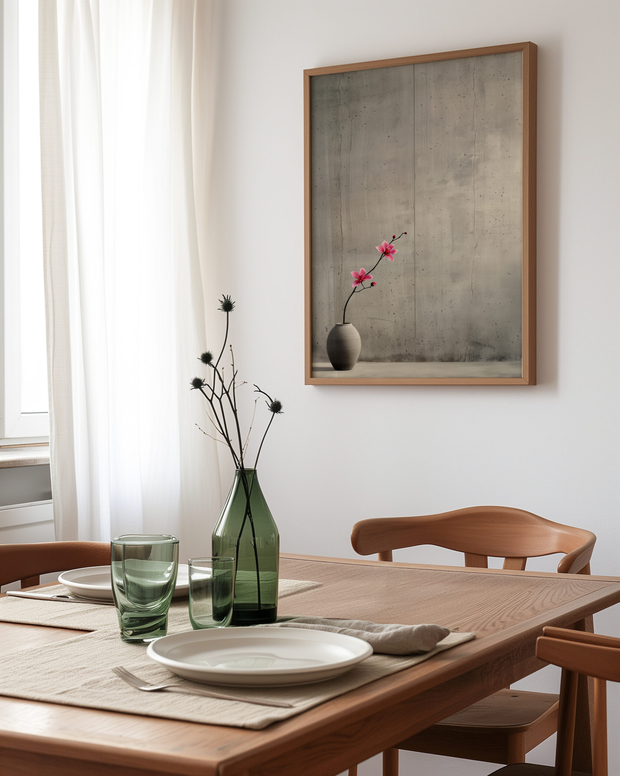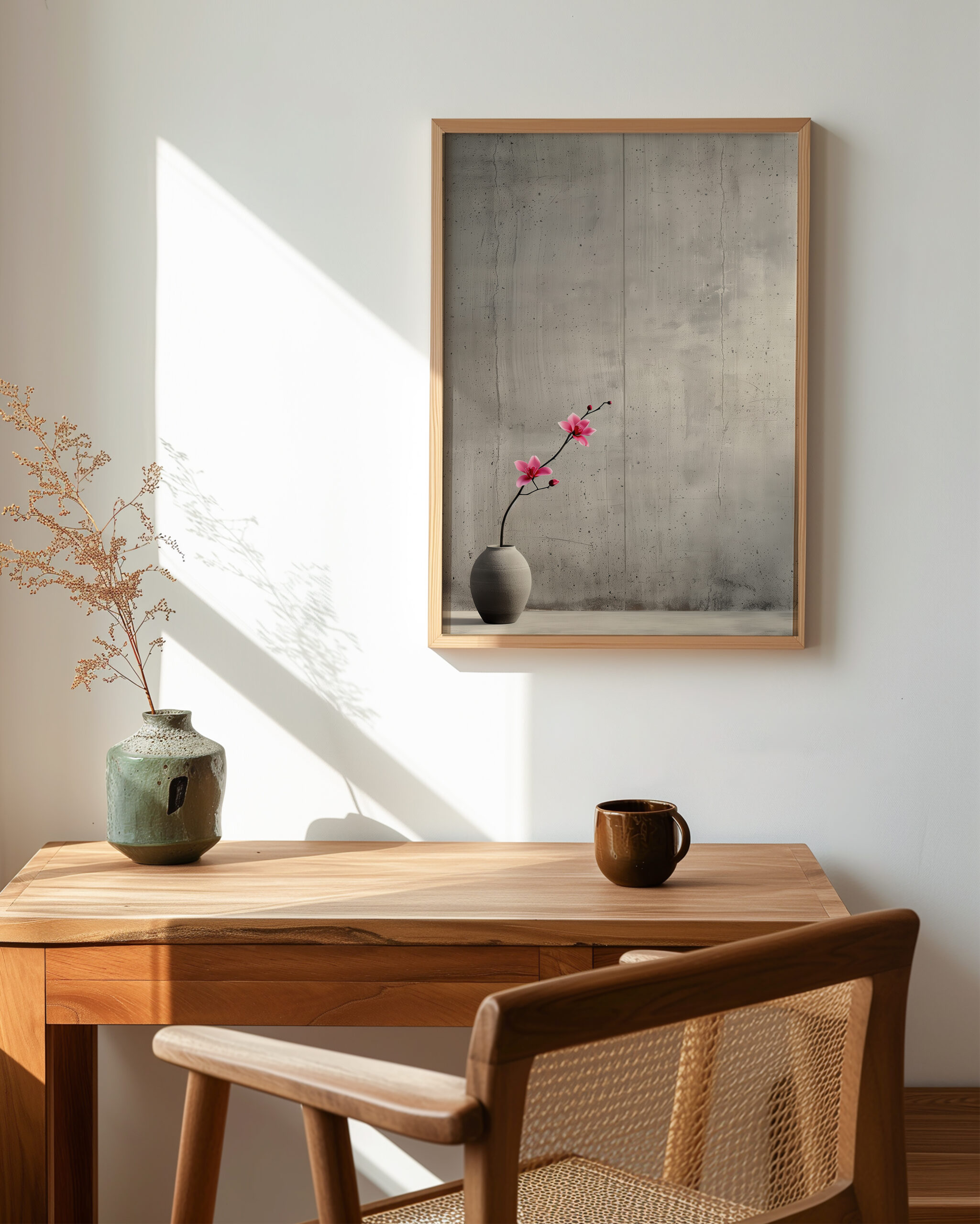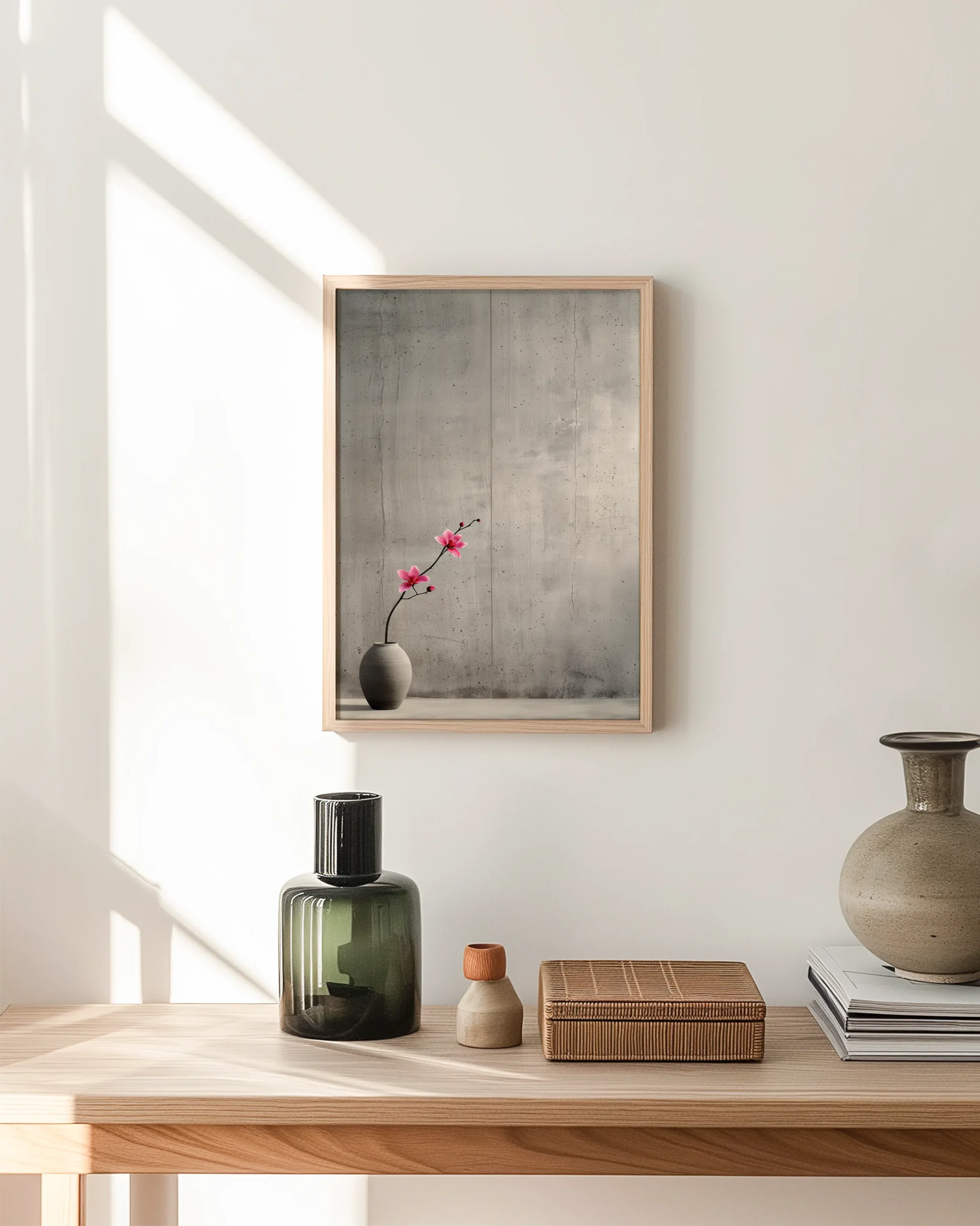 Blossom Curve in Ikebana celebrates restraint: a single stem bends with quiet grace, its pink petals glowing against a textured, concrete-like wall. The generous negative space and natural materials echo Japanese ikebana principles, bringing calm balance to modern interiors.