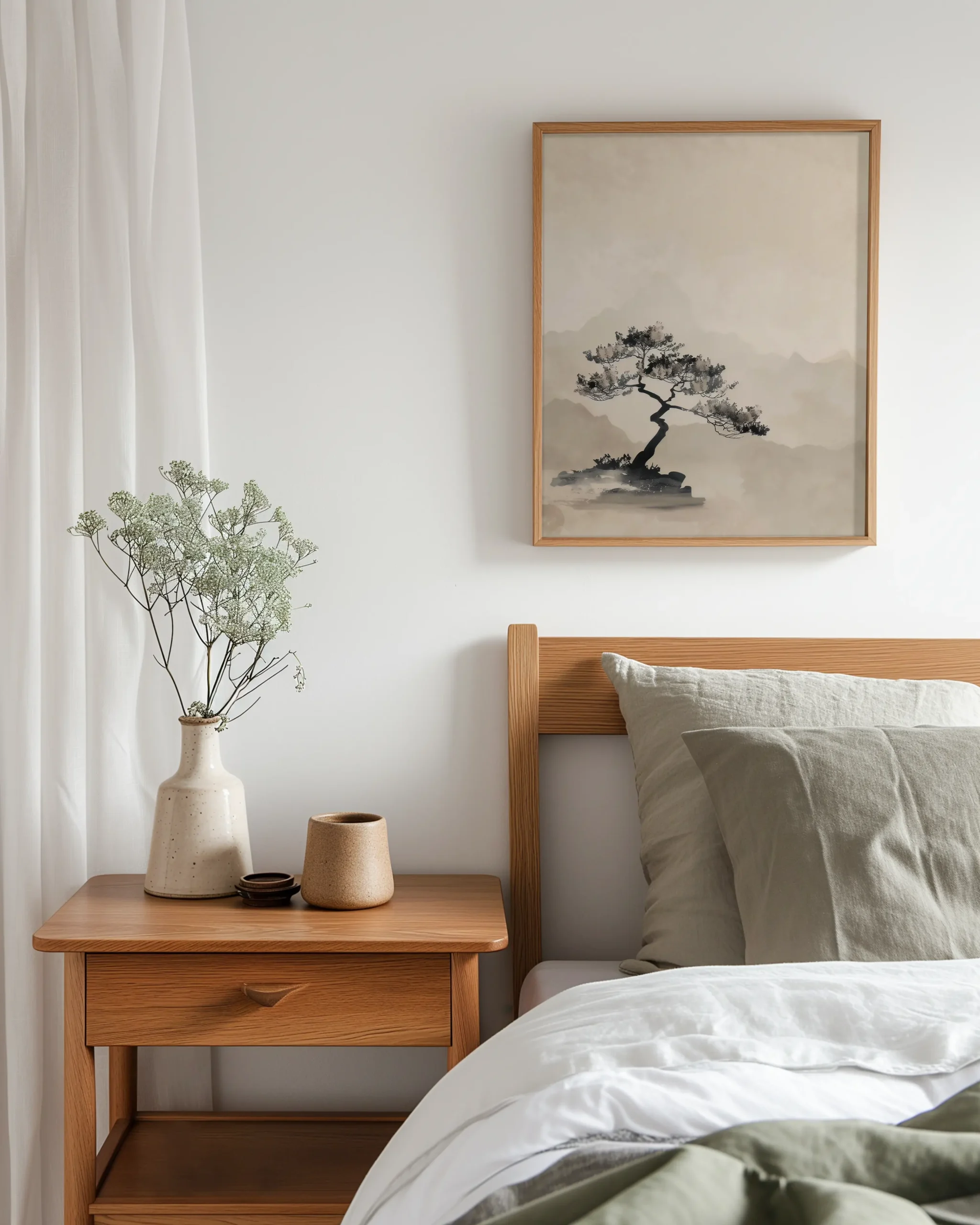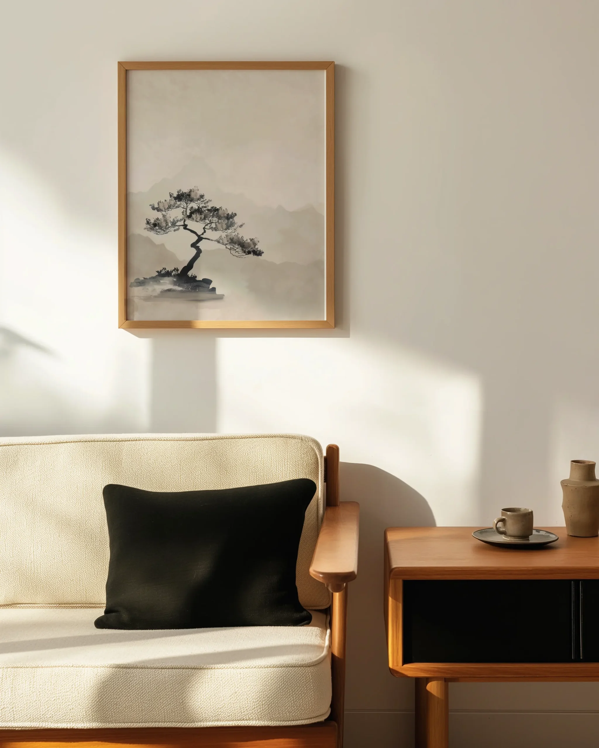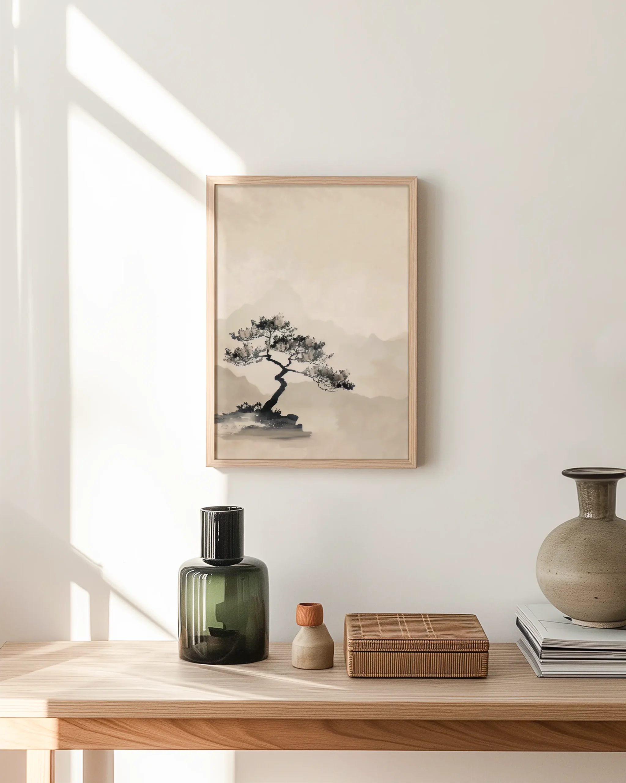 A solitary Sumi-e bonsai rises from a rocky ledge against misty mountains in soft ink-wash neutrals — a calm focal point for Japandi and minimalist interiors, printed on museum-quality enhanced matte paper. Framed and ready to hang with your preferred frame (Black, White, or Red Oak).