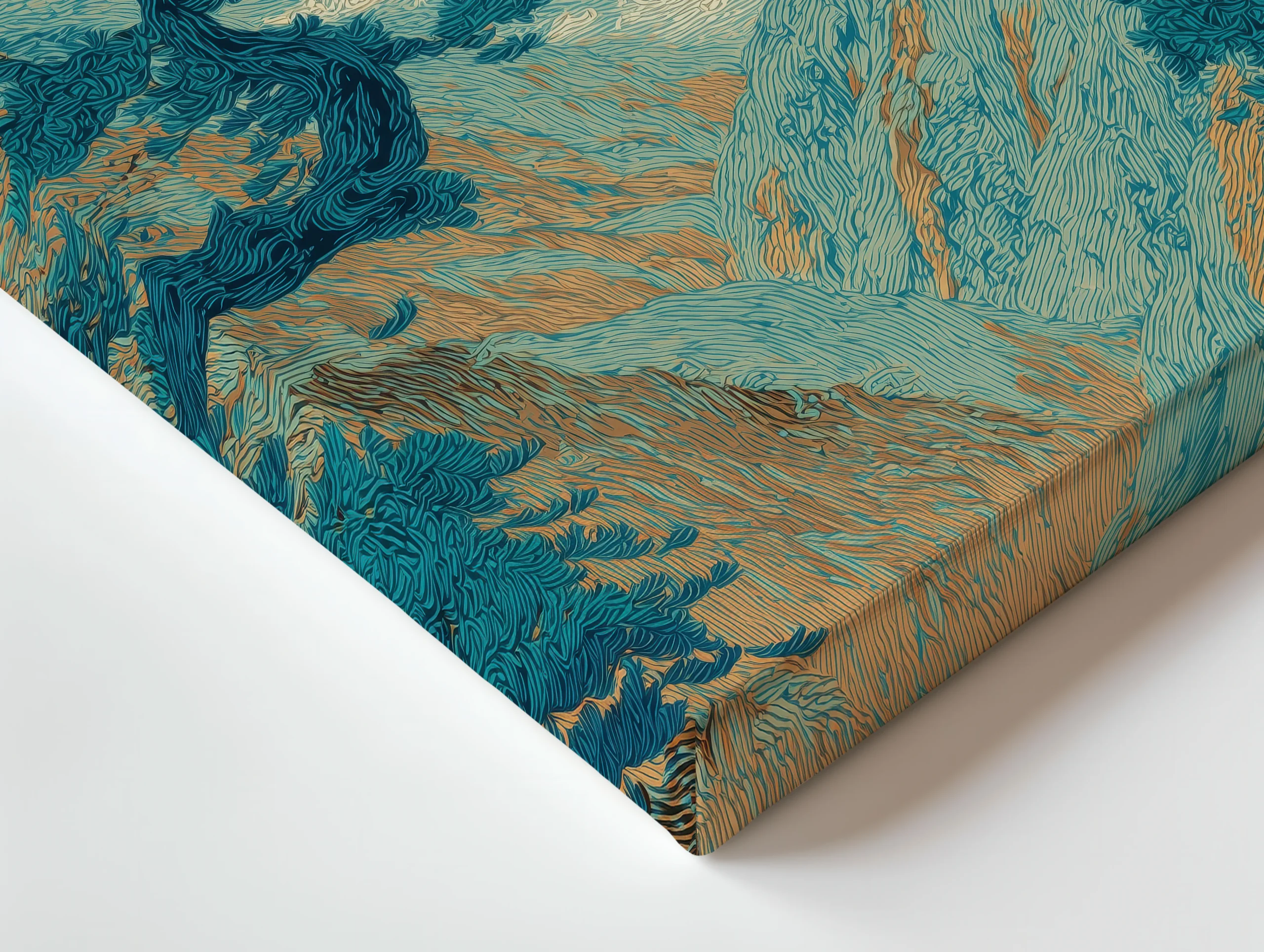 Hokusai-inspired ukiyo-e landscape thin canvas featuring a lone wanderer on a cliff above layered mountains and swirling clouds in teal and warm ochre tones, printed on a premium thin canvas and ready to hang.