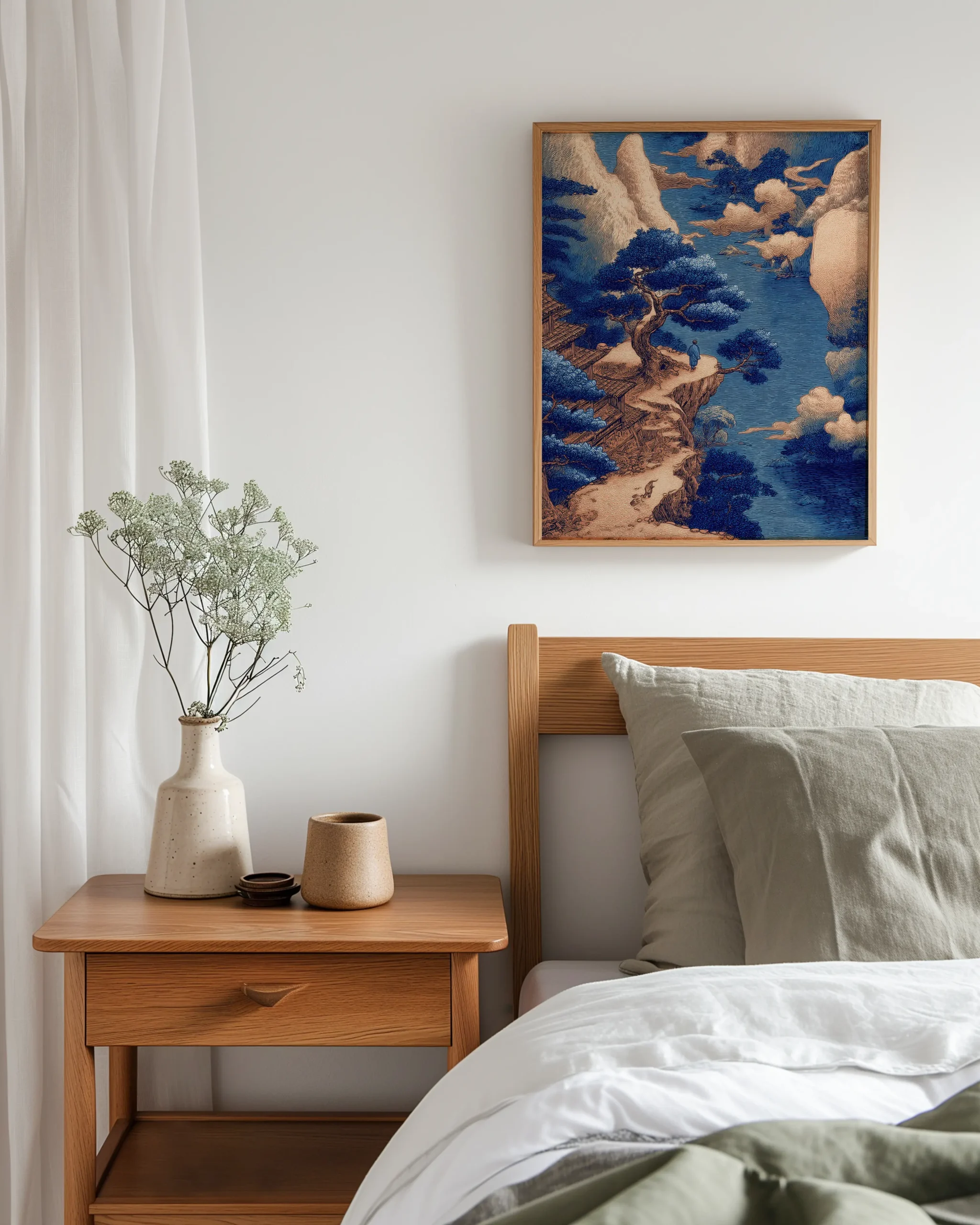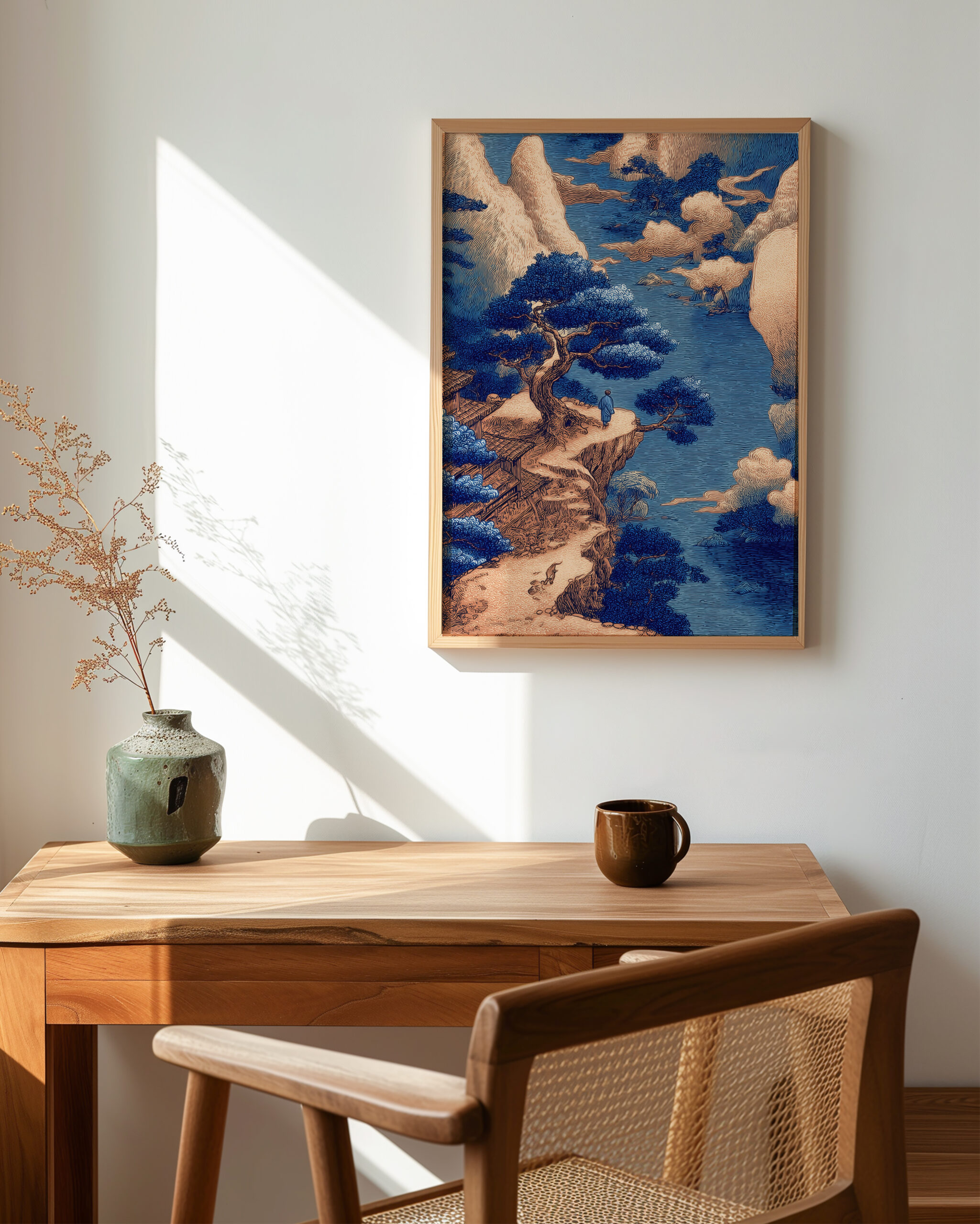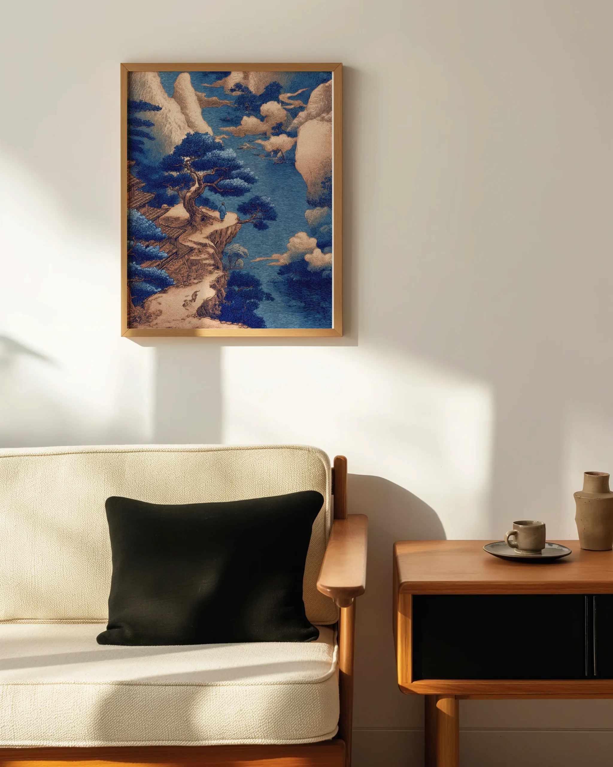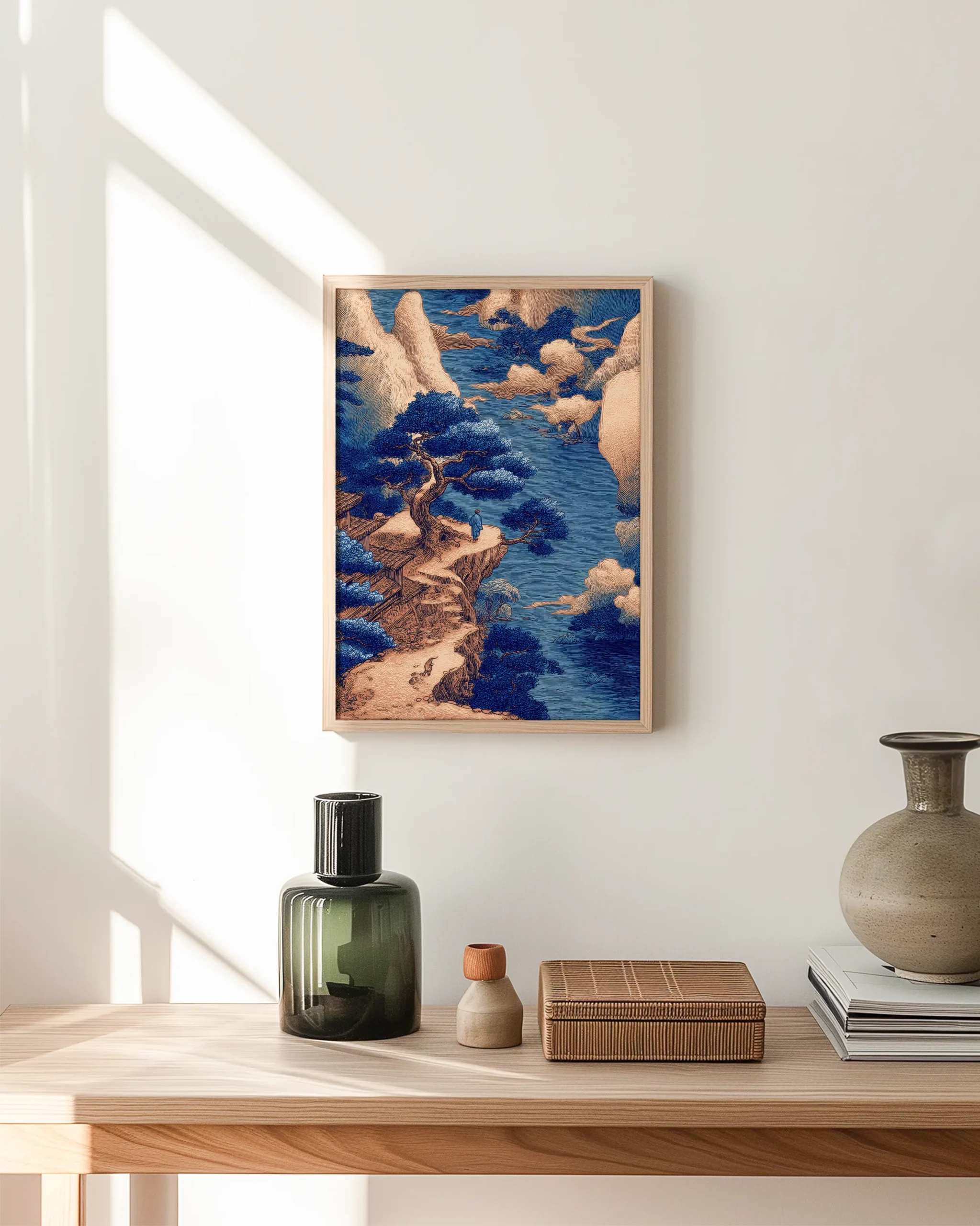 Ukiyo-e inspired indigo landscape of a cliffside pine and distant temple—an elegant statement piece for Japandi, modern, and wabi-sabi interiors; printed on museum-quality enhanced matte paper. Framed and ready to hang with your preferred frame (Black, White, or Red Oak).