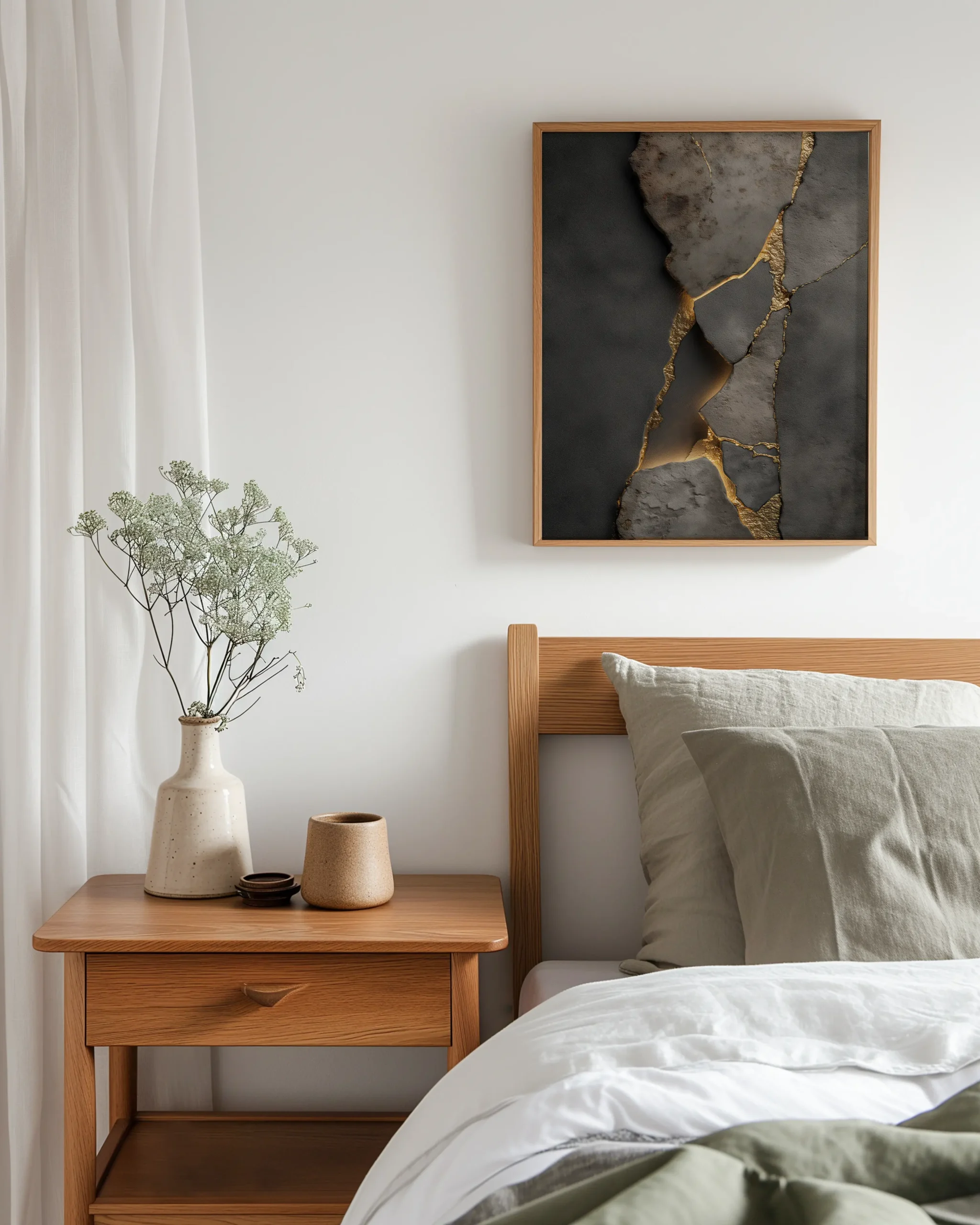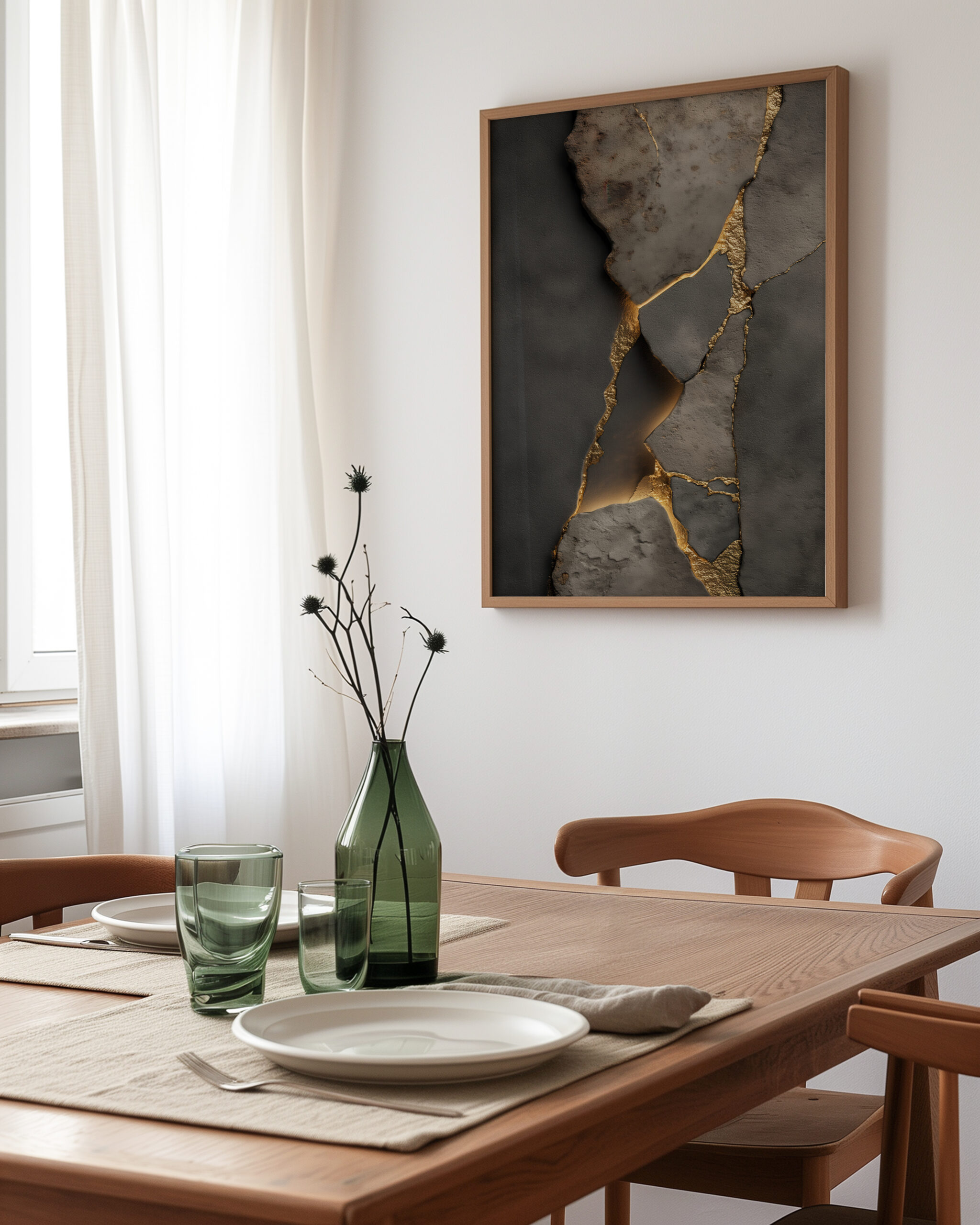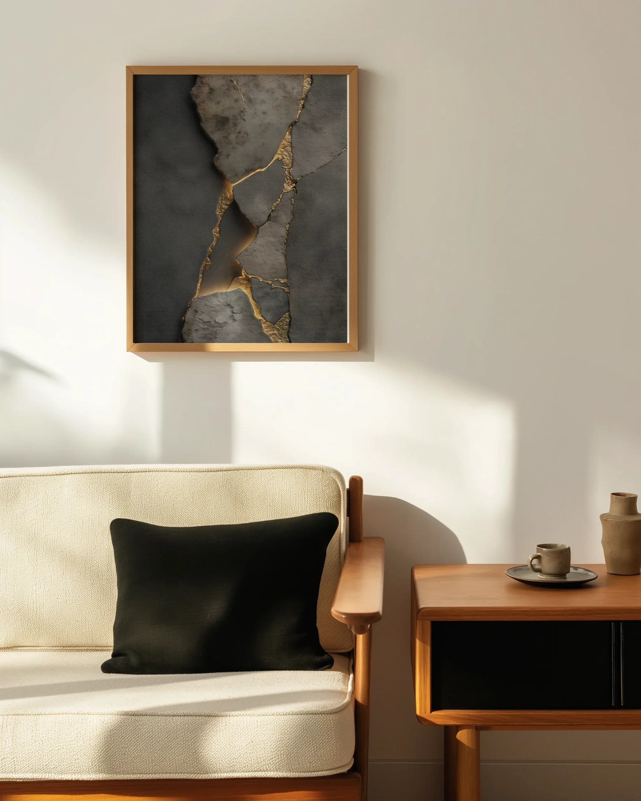 Charcoal stone textures split by glowing gold-toned Kintsugi seams, printed on museum-quality enhanced matte paper. Framed and ready to hang with your preferred frame (Black, White, or Red Oak).