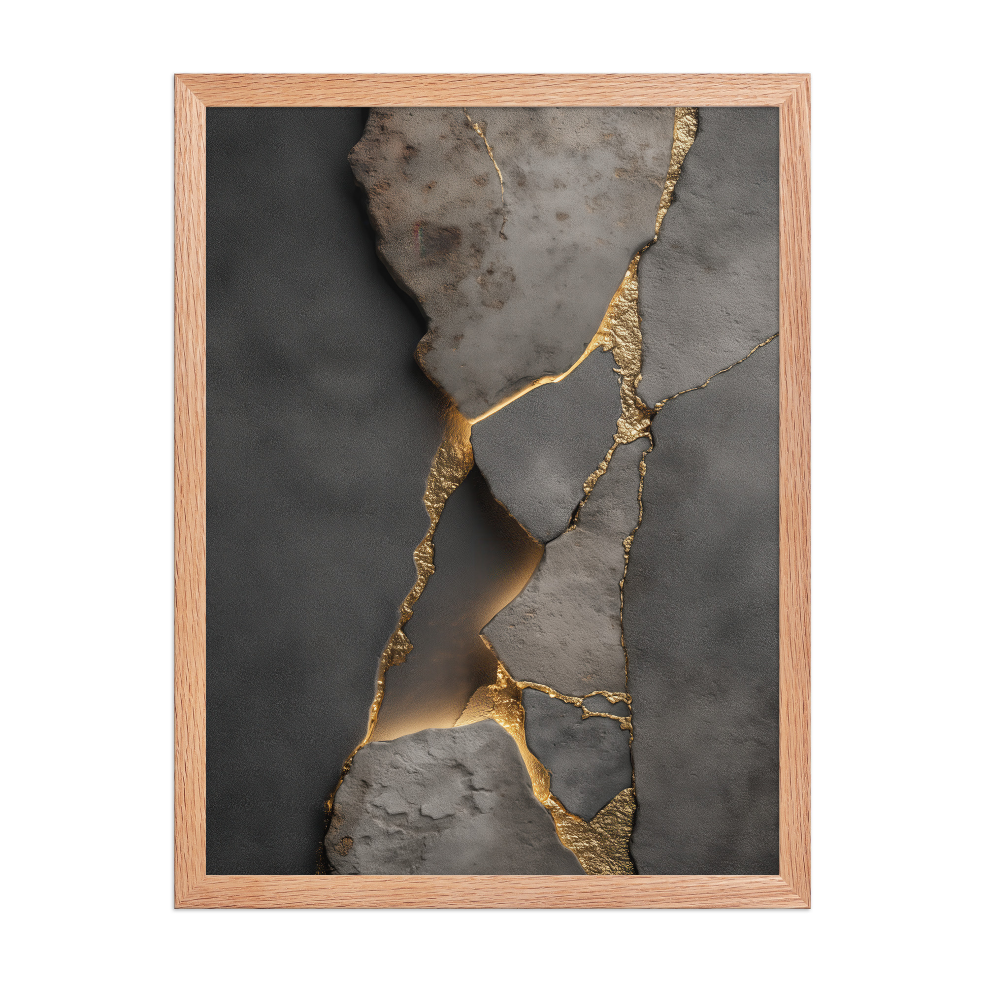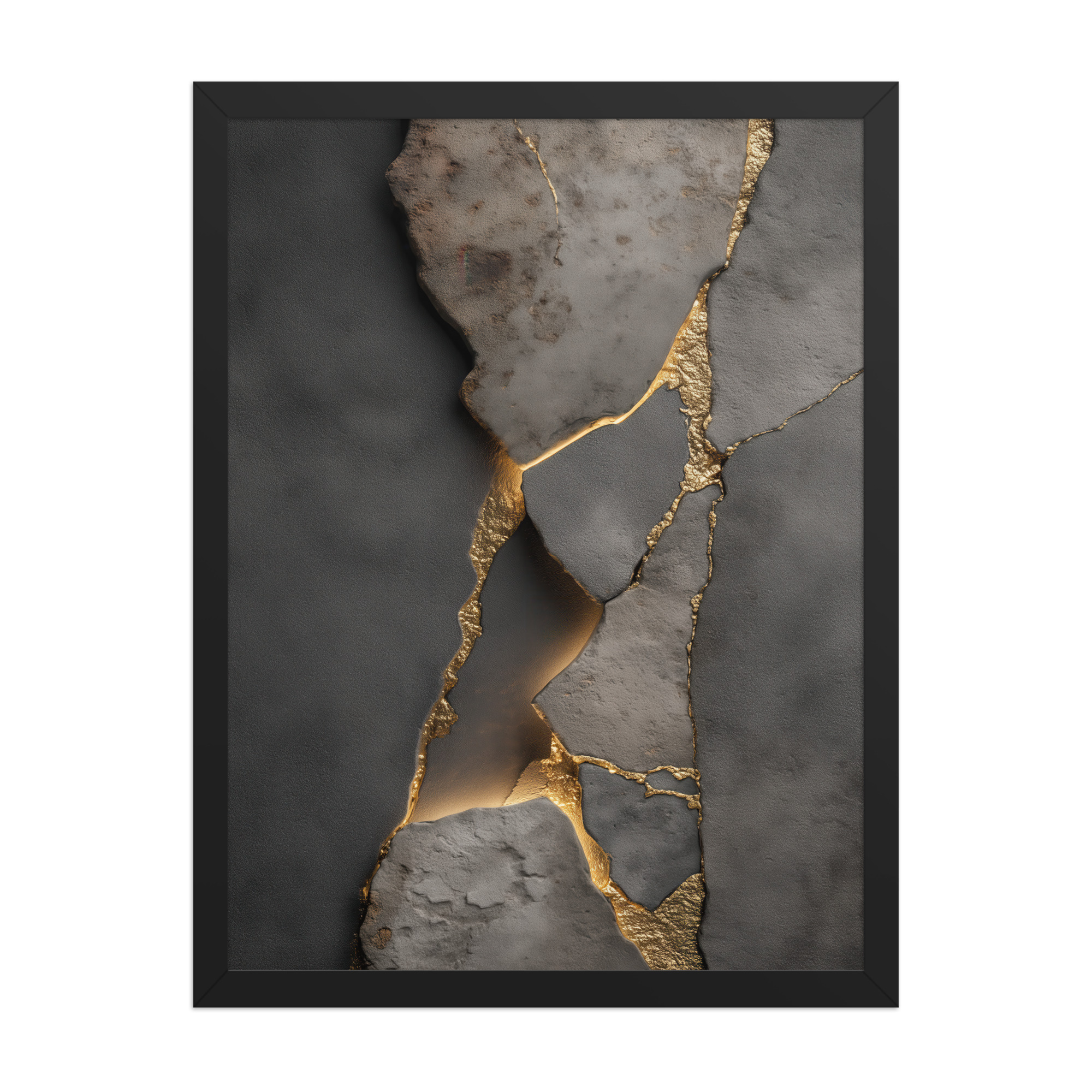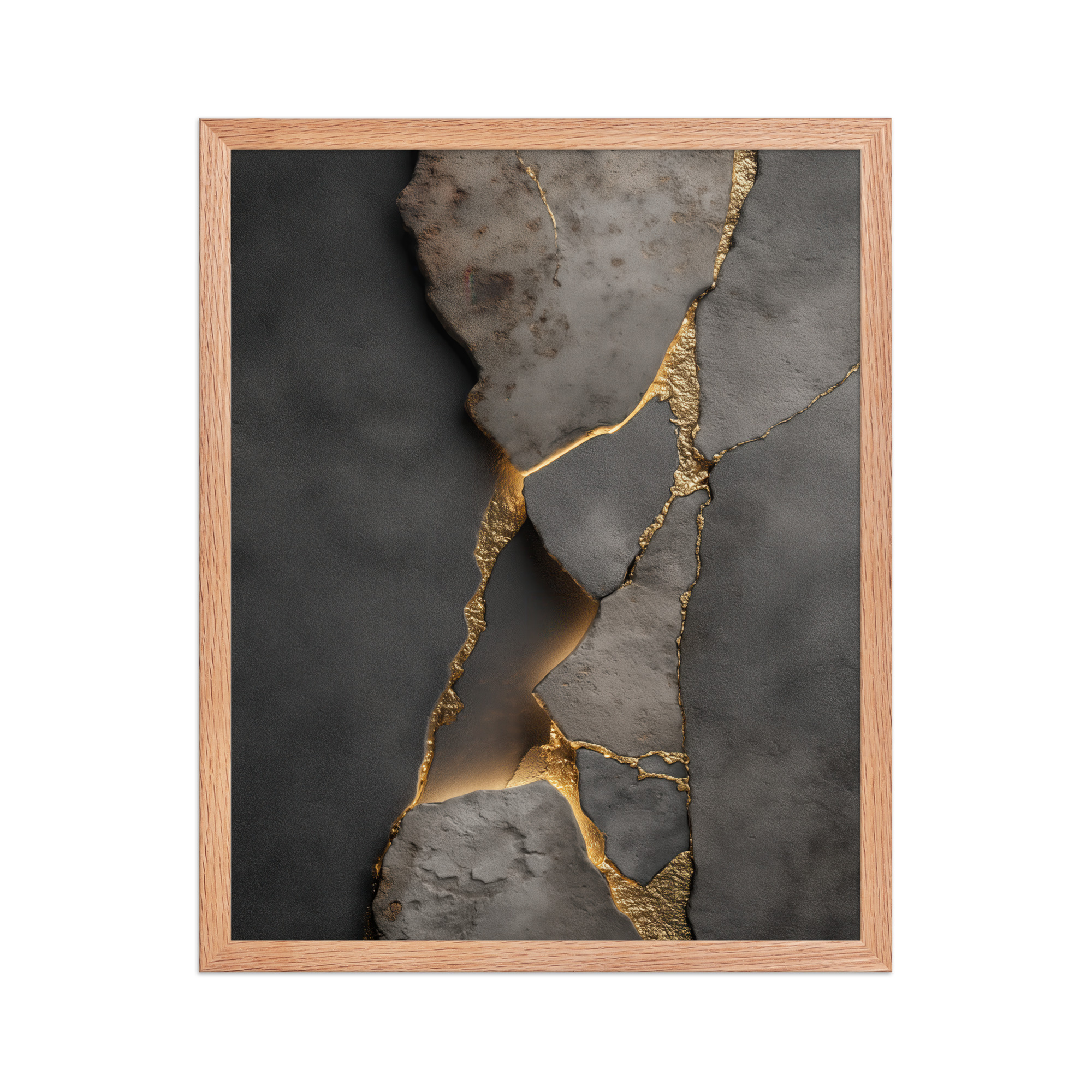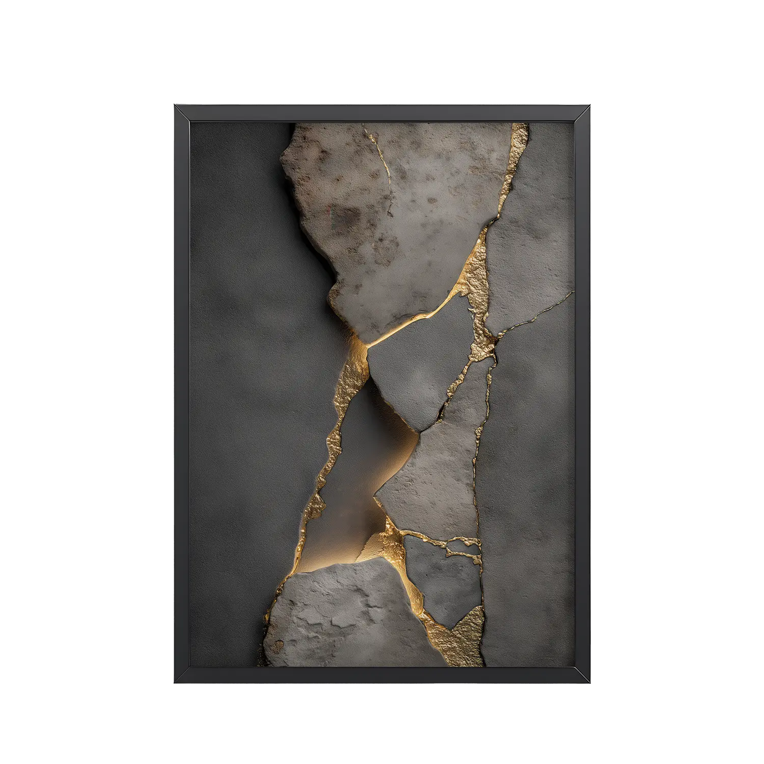 Weathered stone plates meet along molten gold seams in a quiet study of contrast and repair. Matte charcoal grounds the composition while luminous Kintsugi lines suggest inner light—an elegant nod to wabi-sabi and mindful restoration.