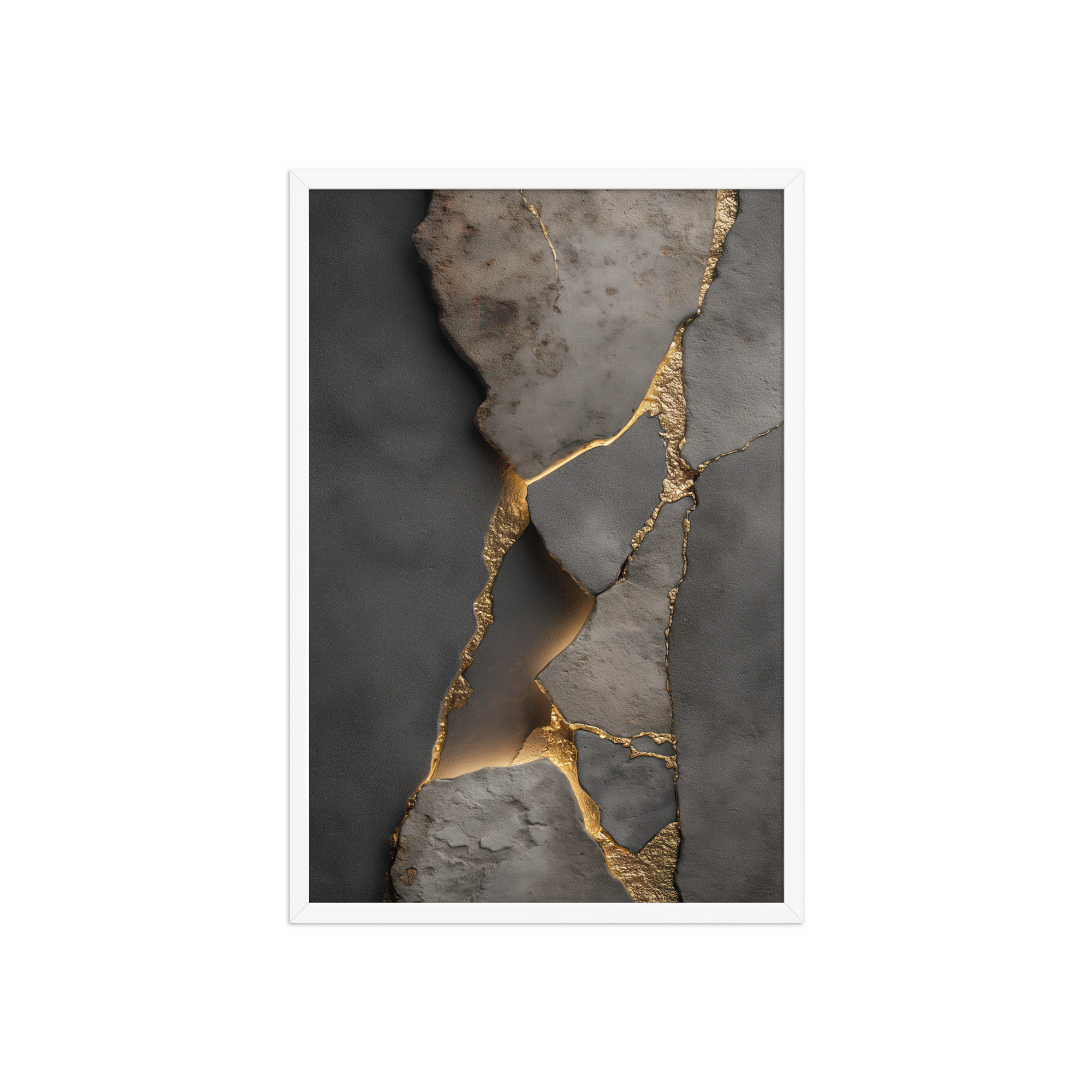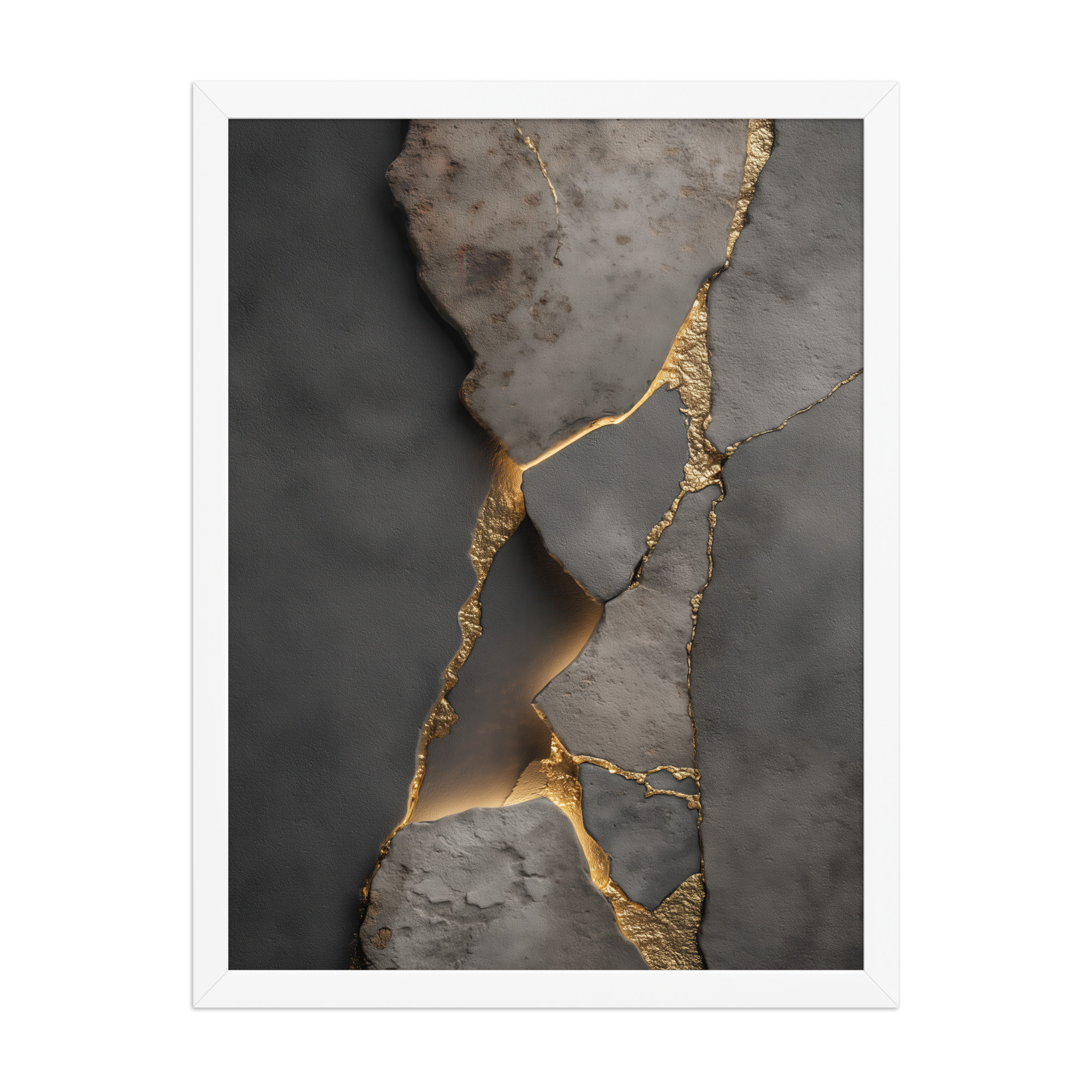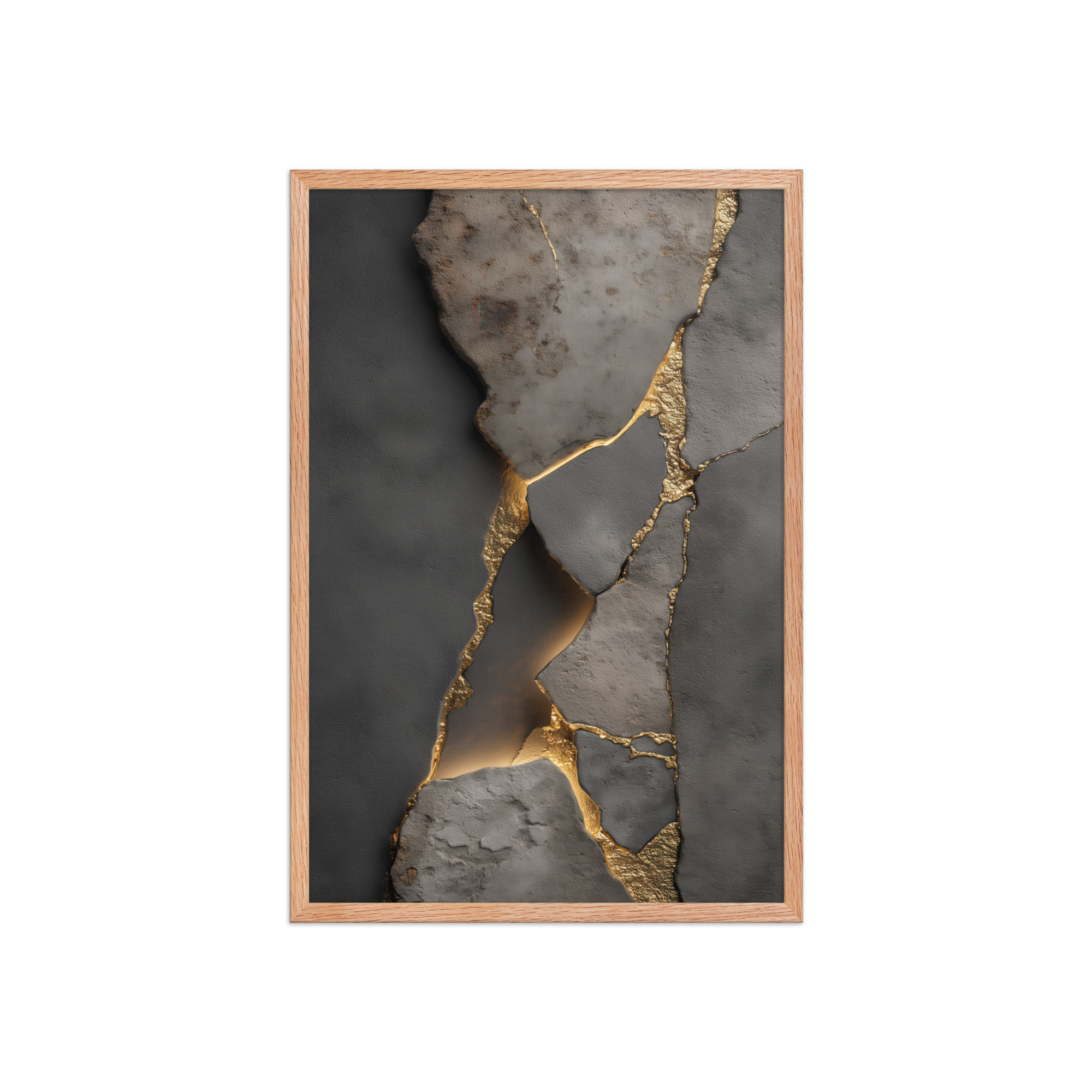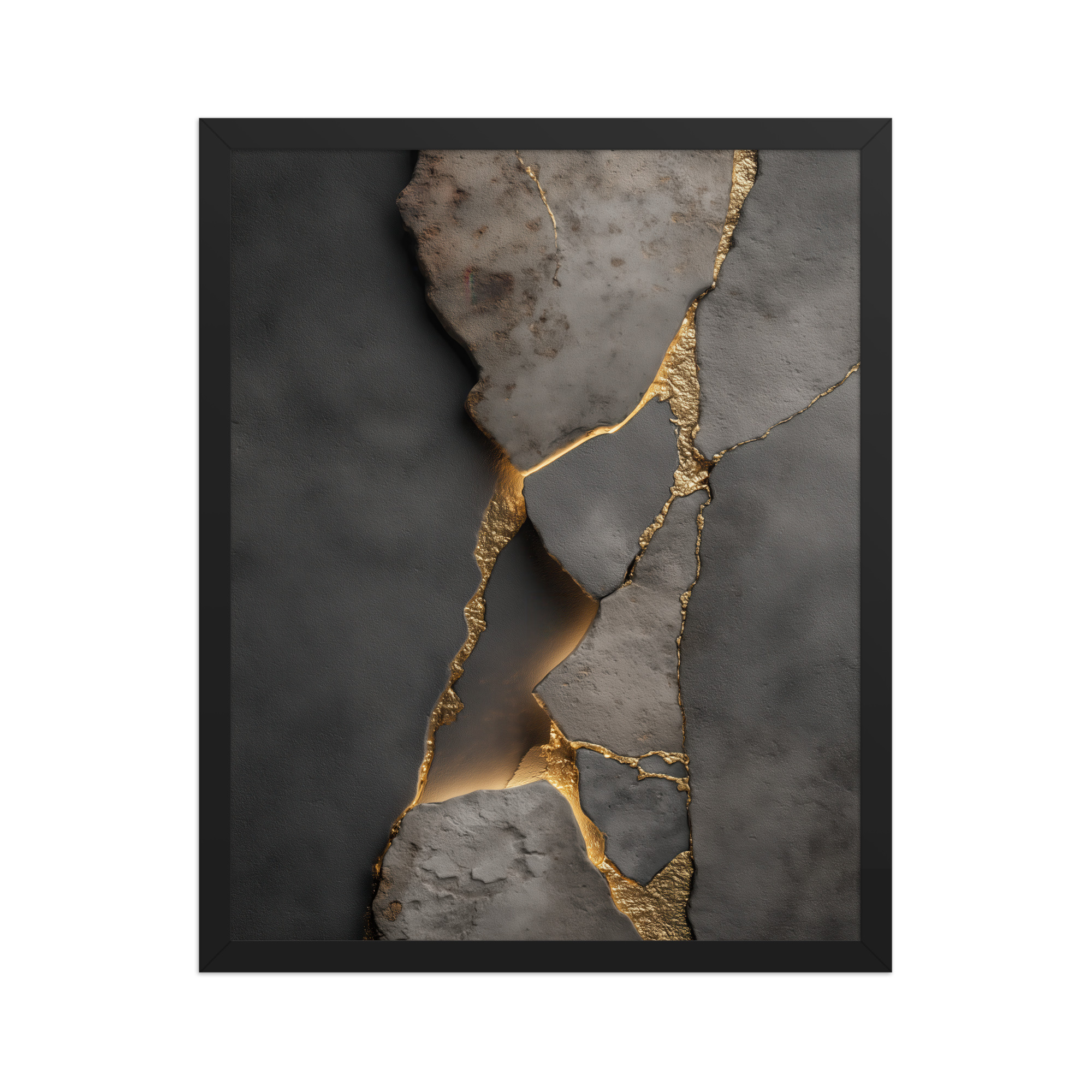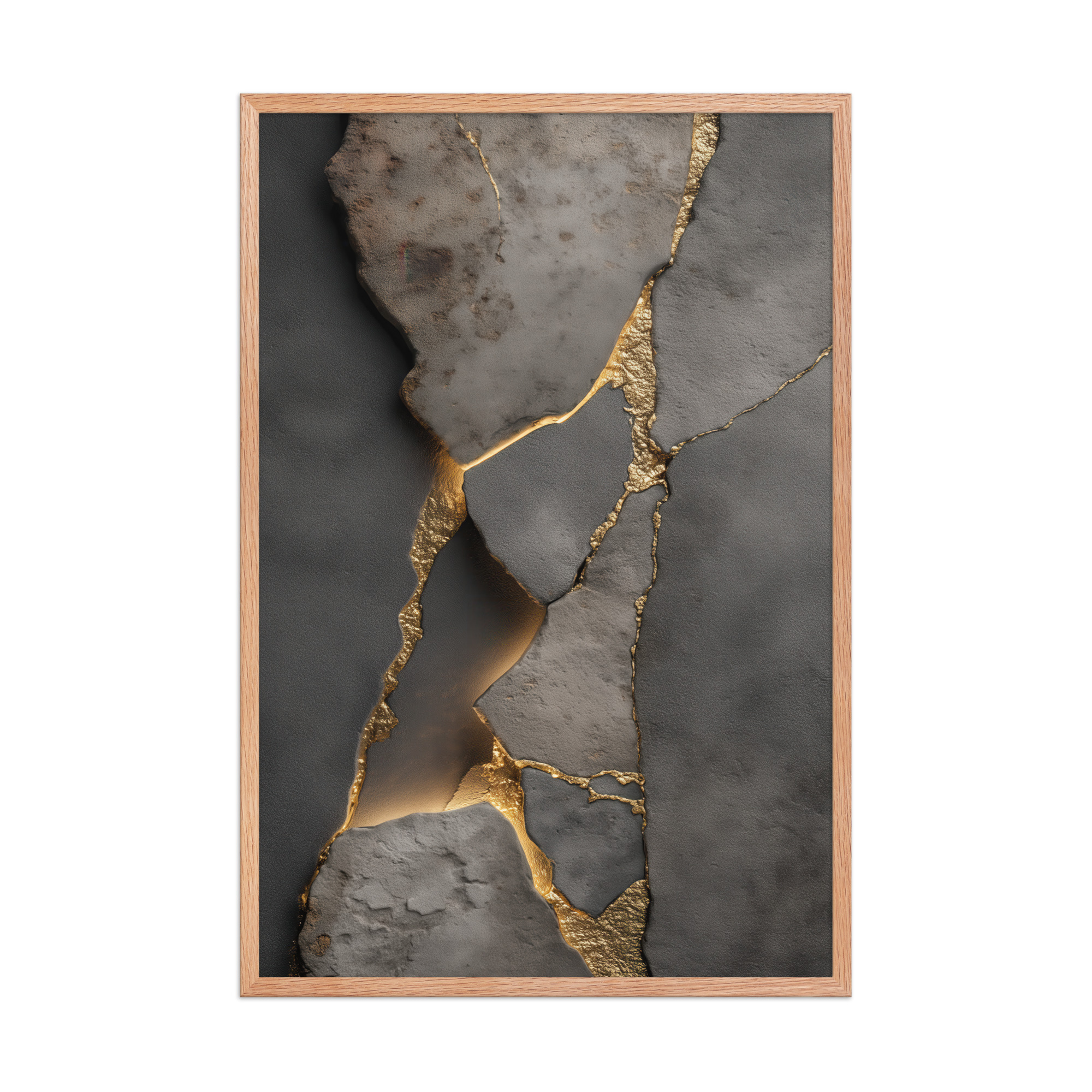 Weathered stone plates meet along molten gold seams in a quiet study of contrast and repair. Matte charcoal grounds the composition while luminous Kintsugi lines suggest inner light—an elegant nod to wabi-sabi and mindful restoration.