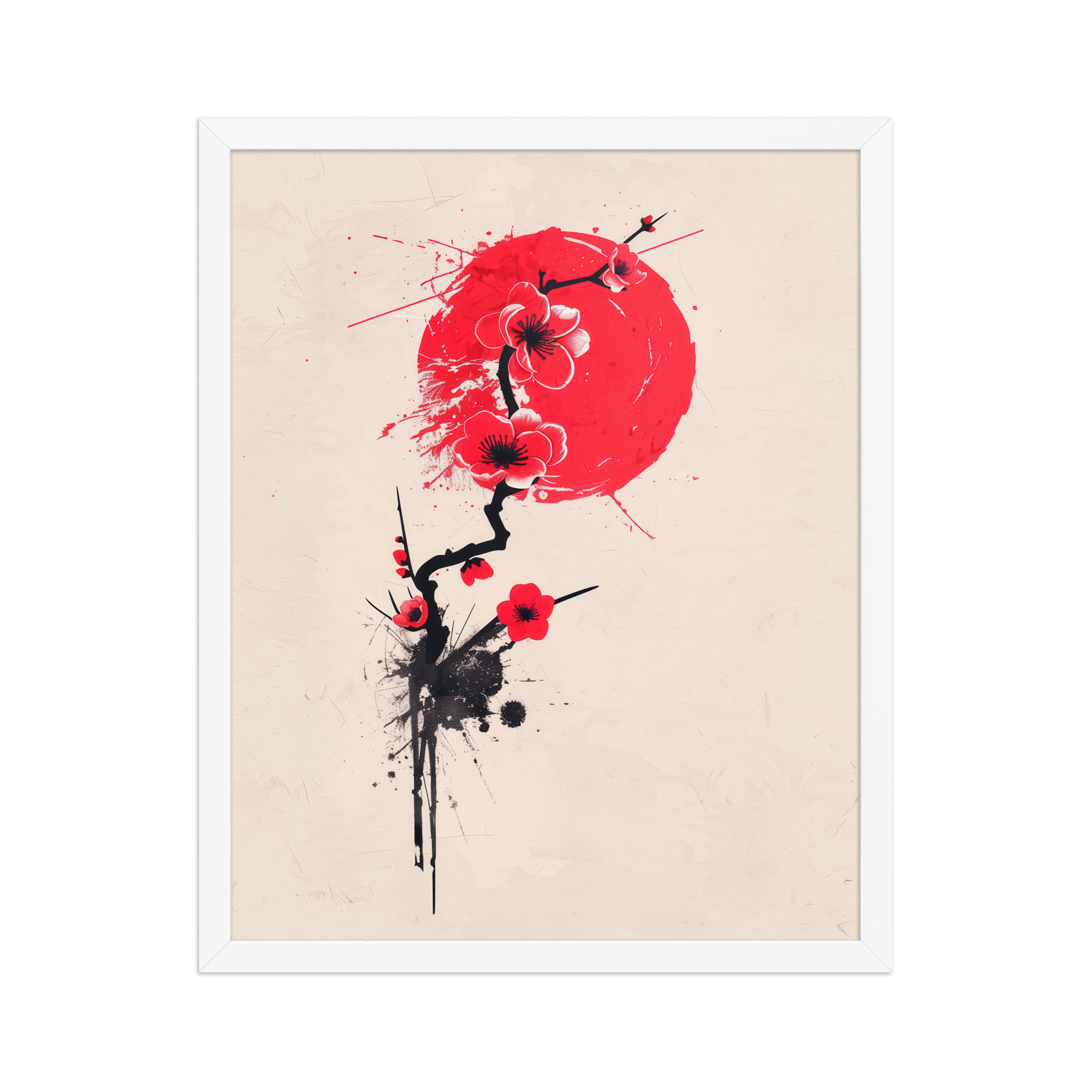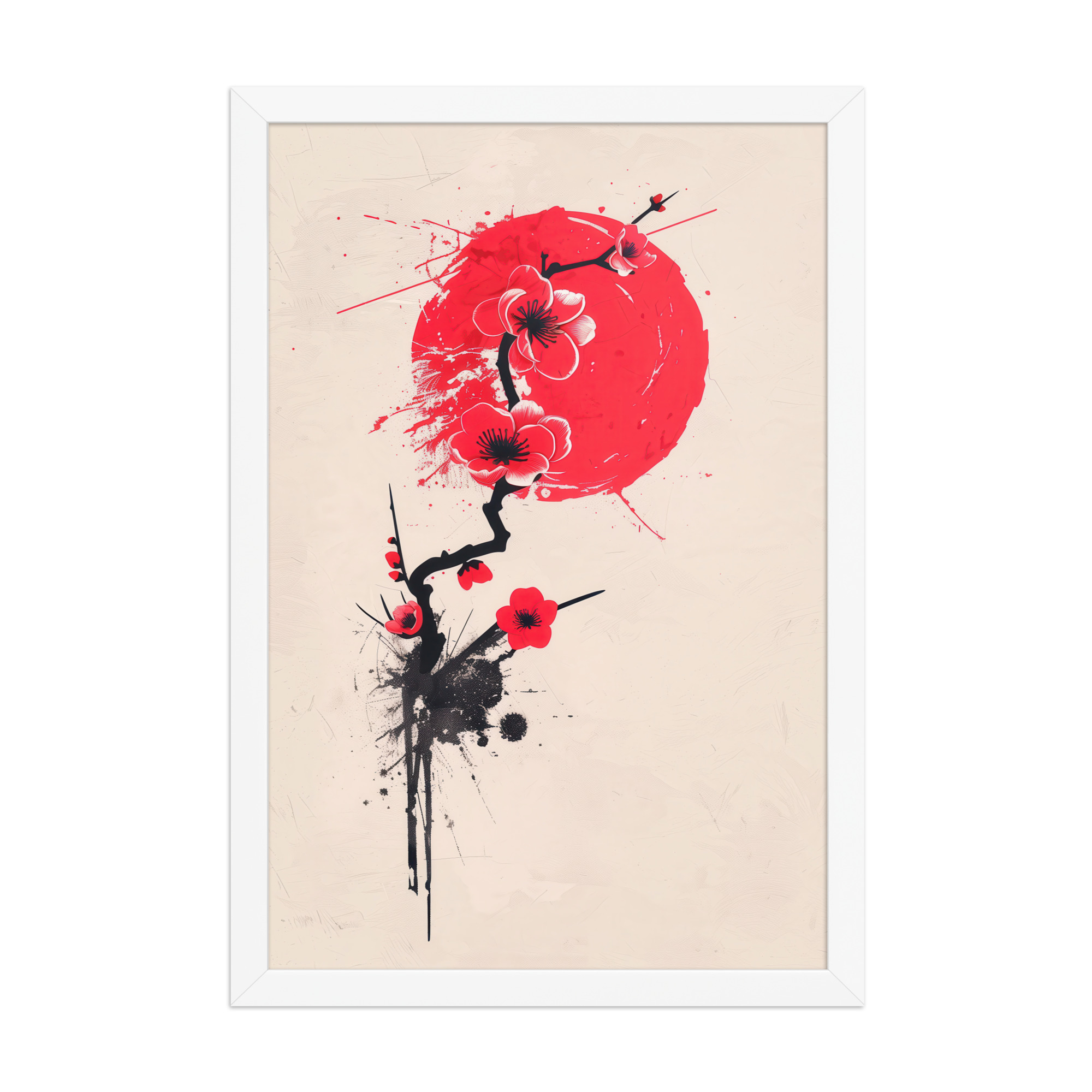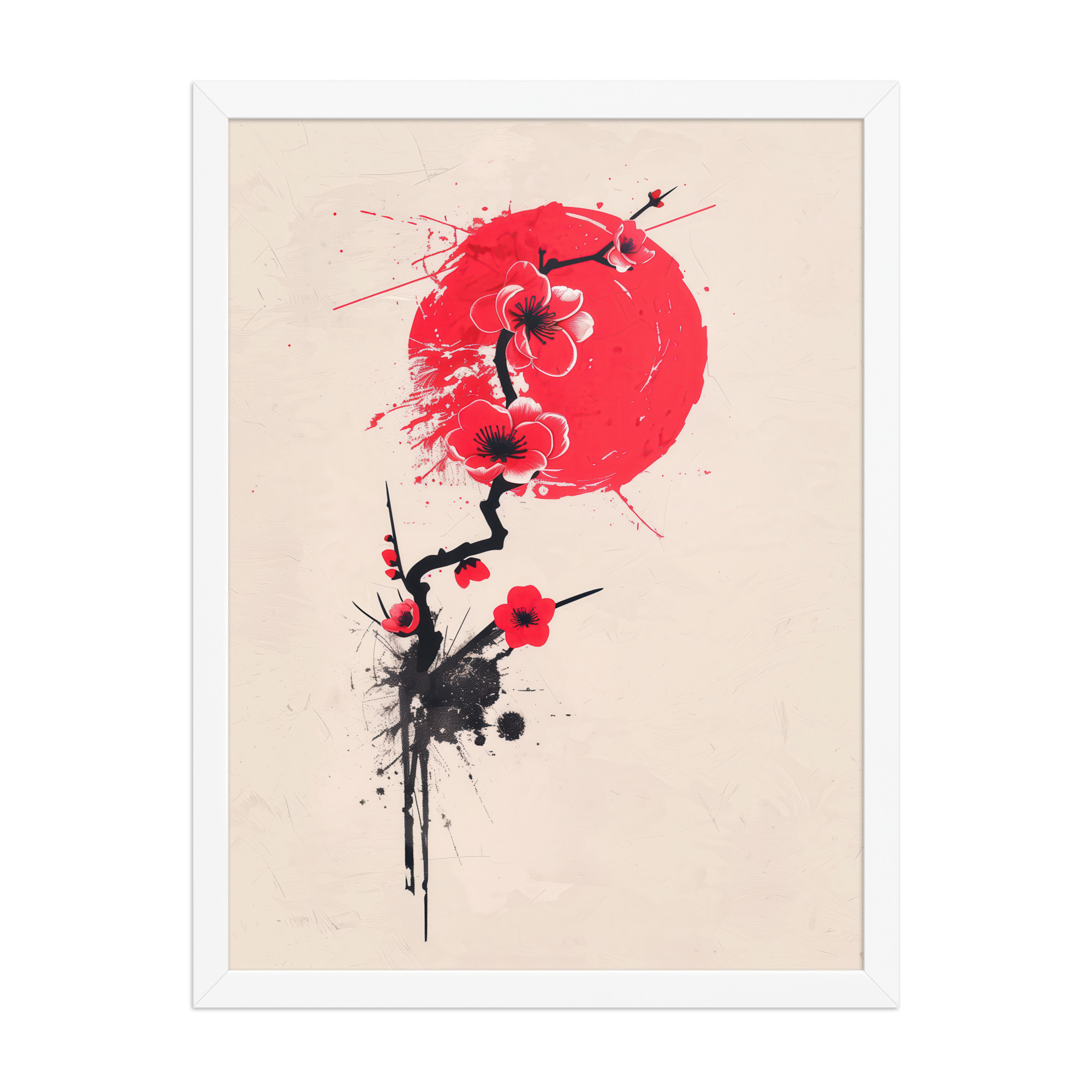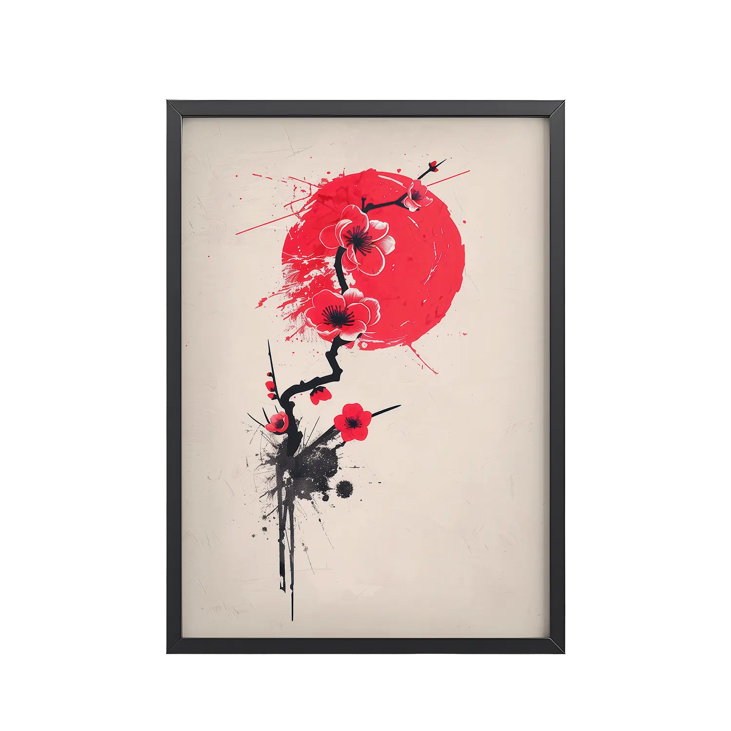 Crimson Blossoms channels the energy of calligraphy: a single cherry branch arcs through a vivid red sun, splashed with lively ink textures. The composition feels modern and ceremonial at once—perfect for bringing focus and warmth to calm, minimalist spaces.