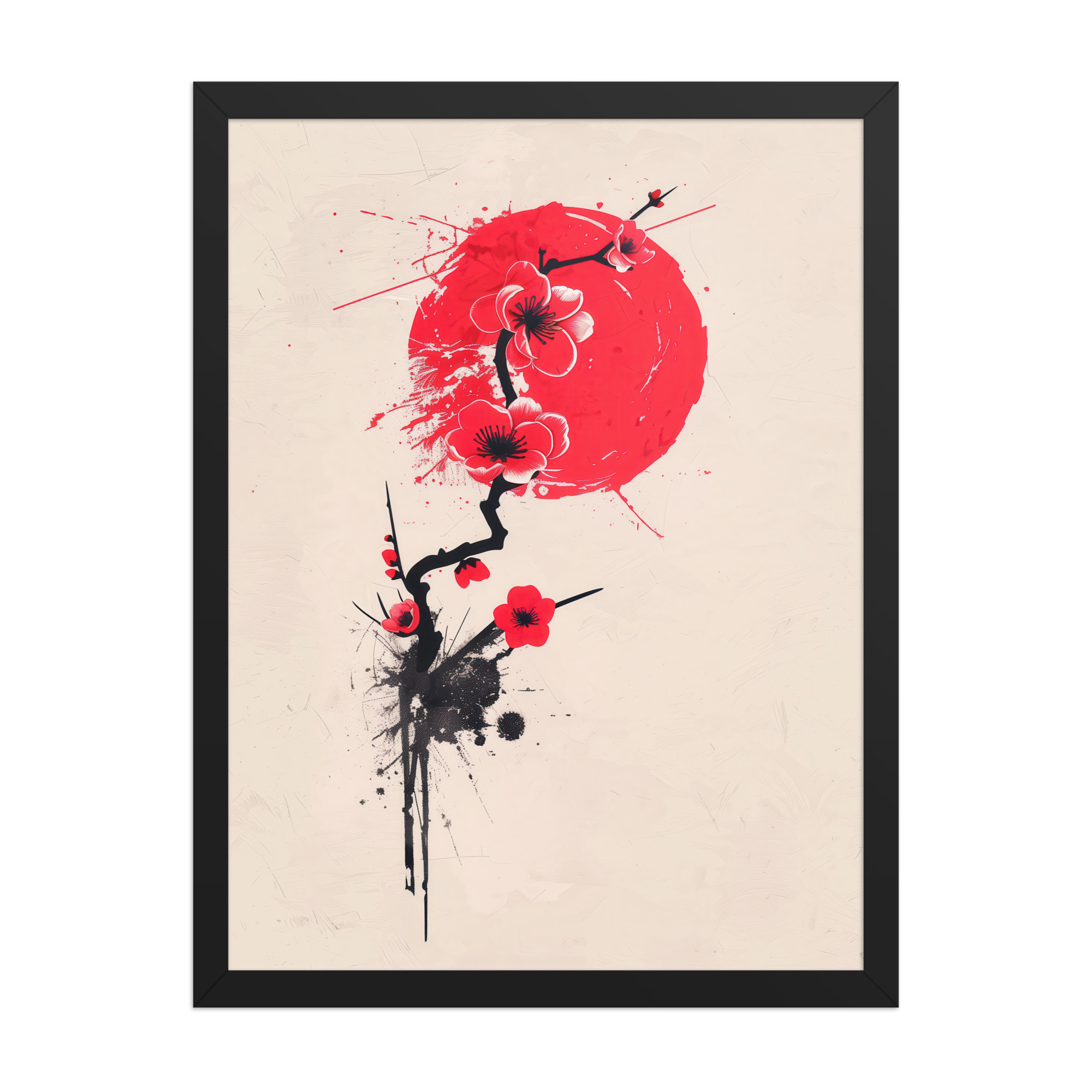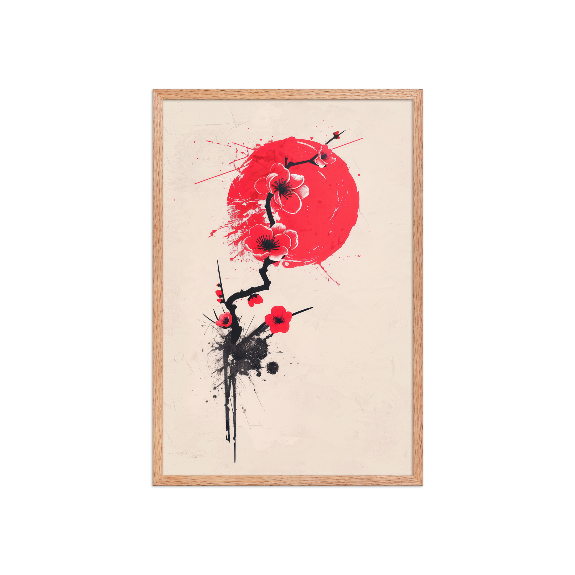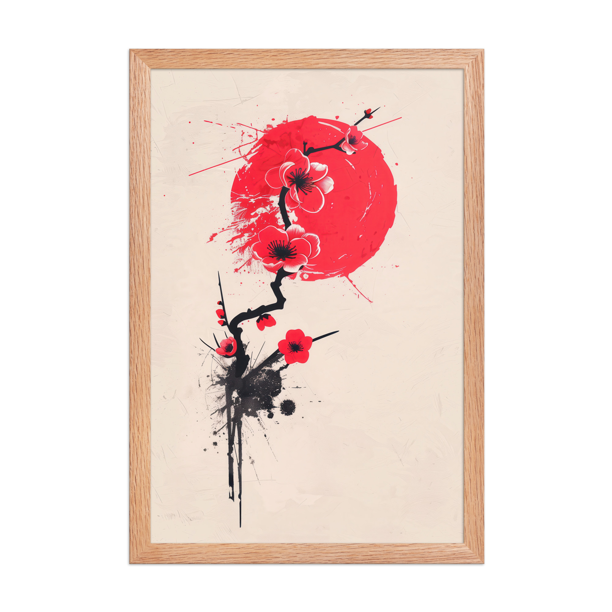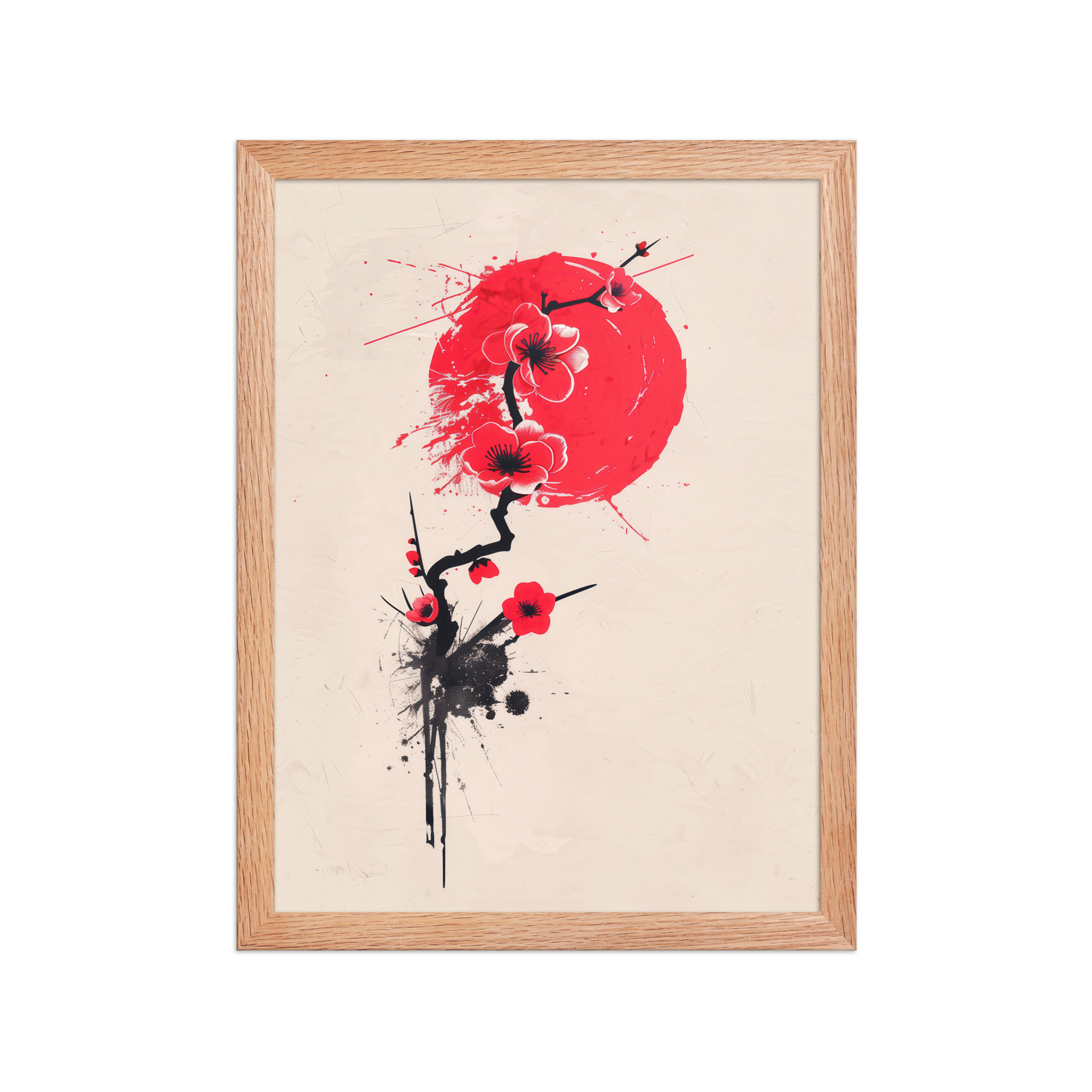 Crimson Blossoms channels the energy of calligraphy: a single cherry branch arcs through a vivid red sun, splashed with lively ink textures. The composition feels modern and ceremonial at once—perfect for bringing focus and warmth to calm, minimalist spaces.