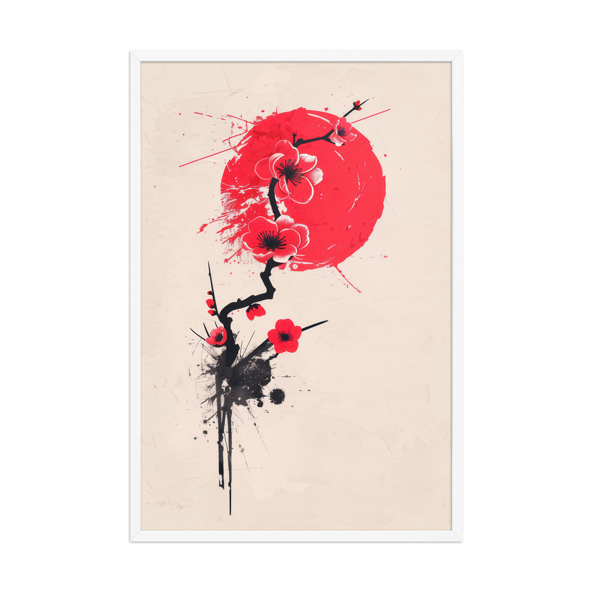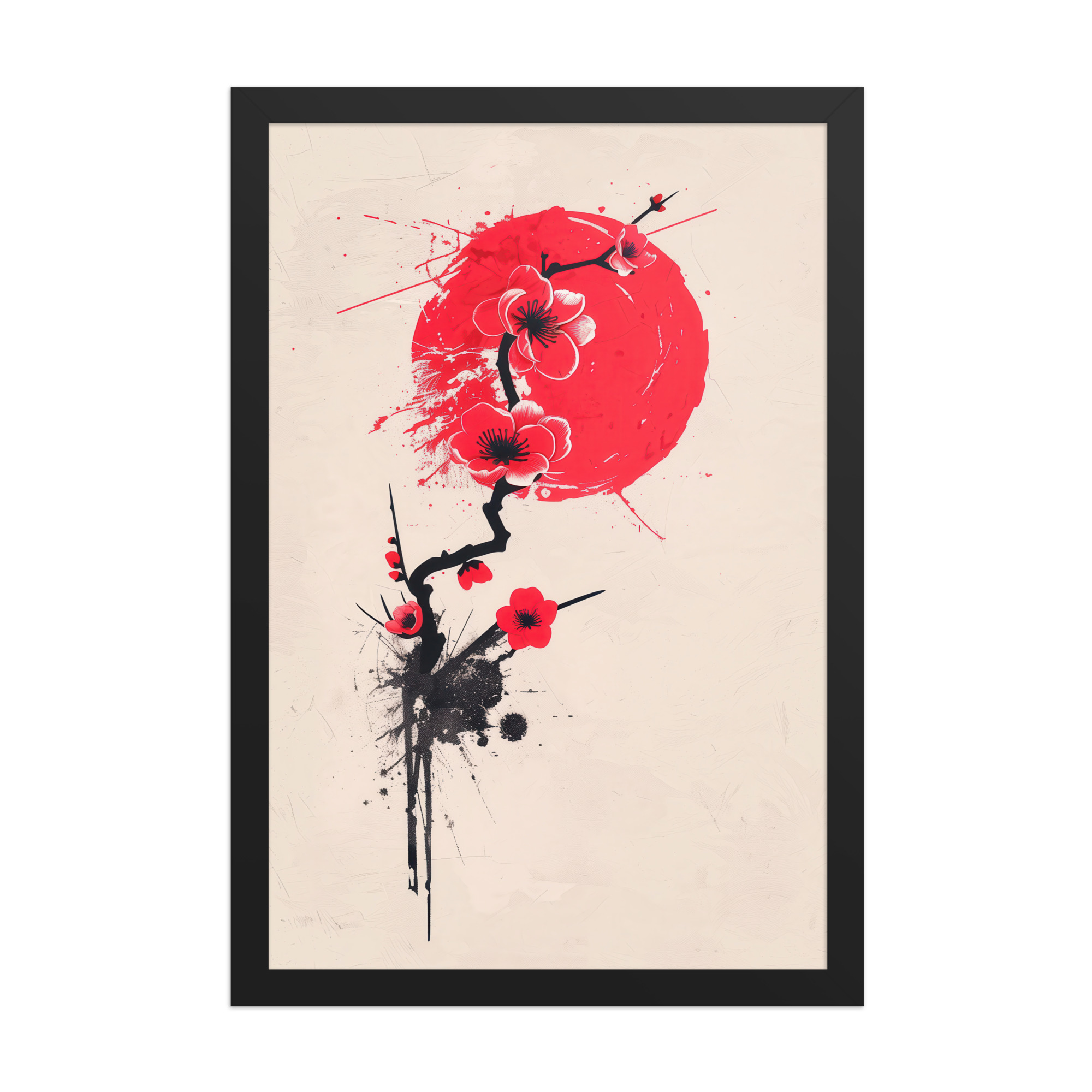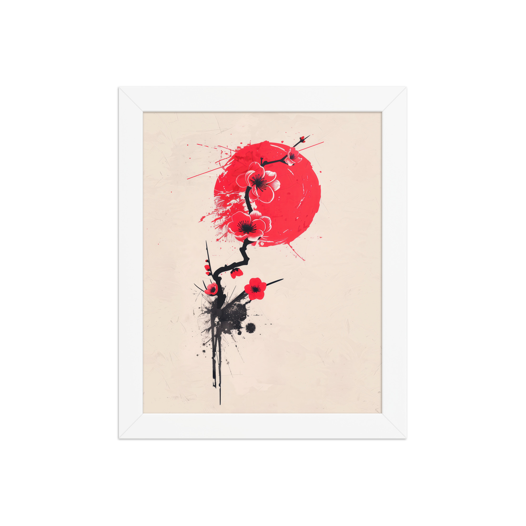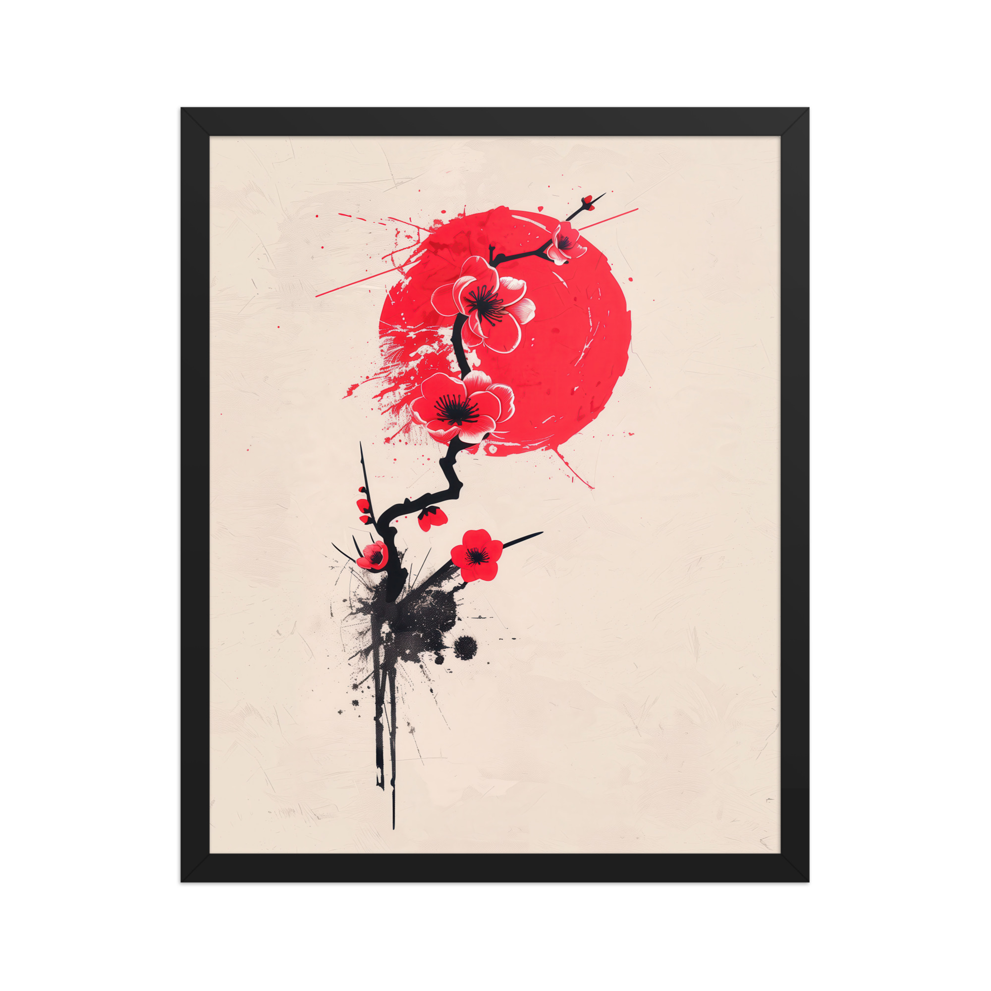 Crimson Blossoms channels the energy of calligraphy: a single cherry branch arcs through a vivid red sun, splashed with lively ink textures. The composition feels modern and ceremonial at once—perfect for bringing focus and warmth to calm, minimalist spaces.
