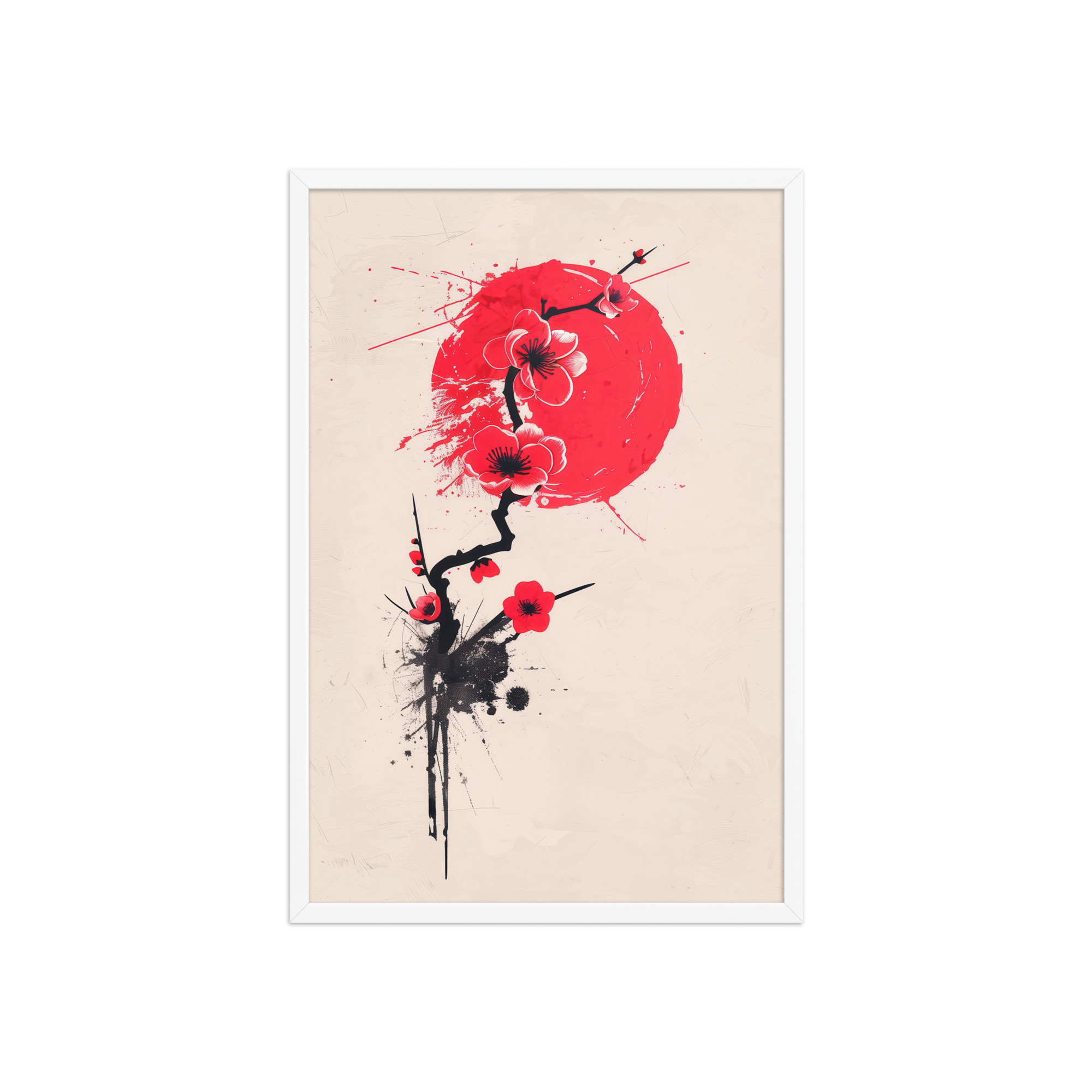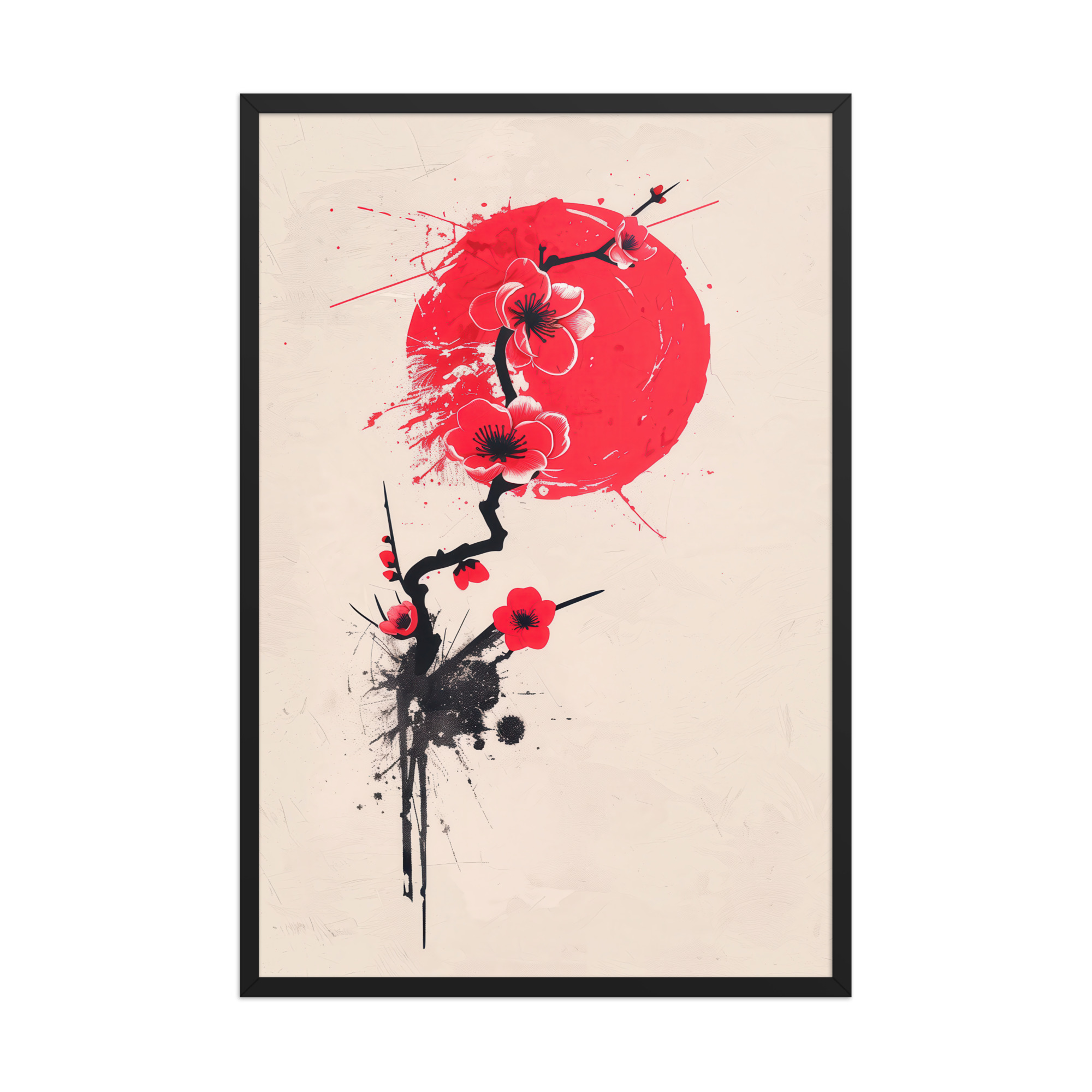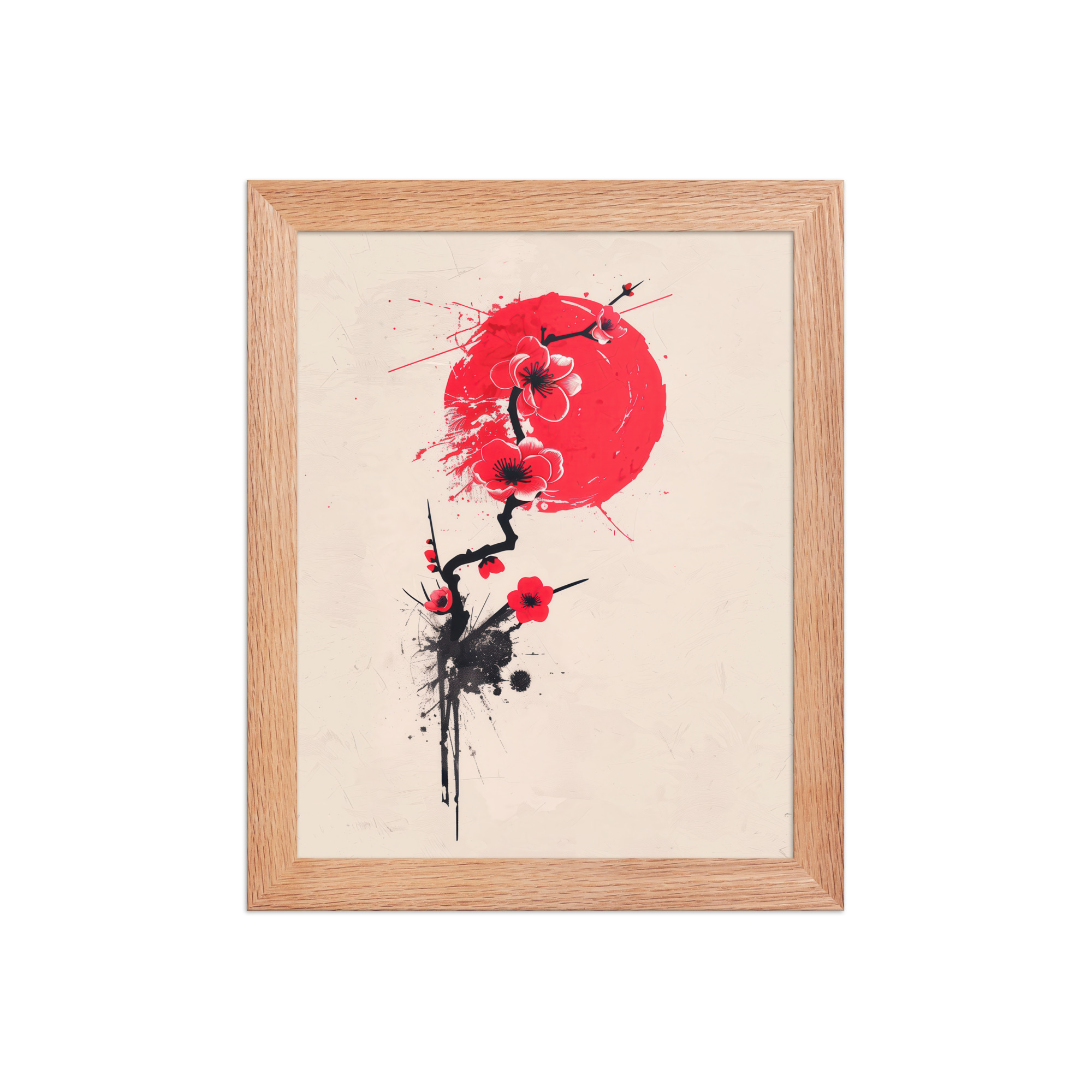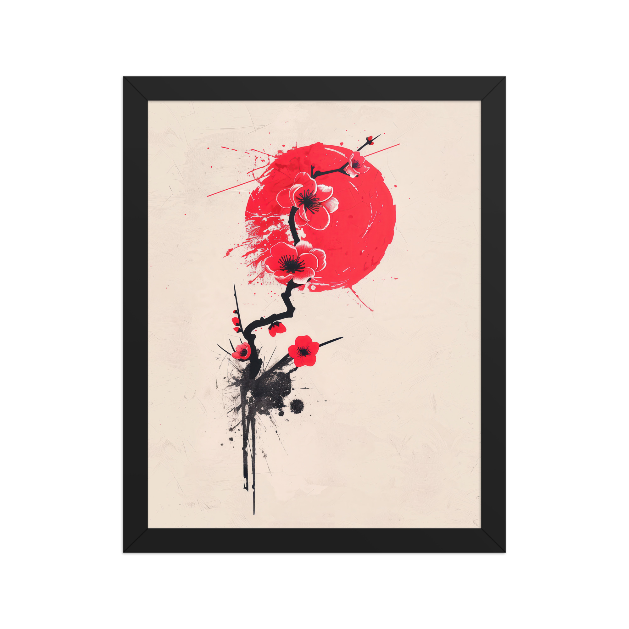 Crimson Blossoms channels the energy of calligraphy: a single cherry branch arcs through a vivid red sun, splashed with lively ink textures. The composition feels modern and ceremonial at once—perfect for bringing focus and warmth to calm, minimalist spaces.