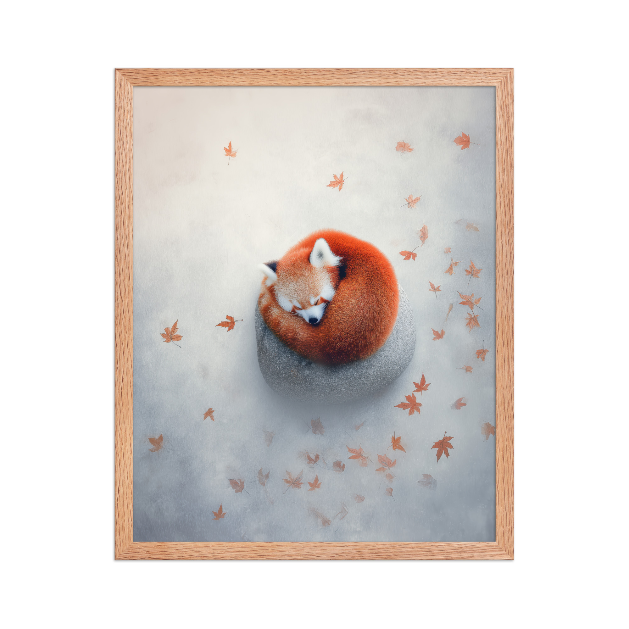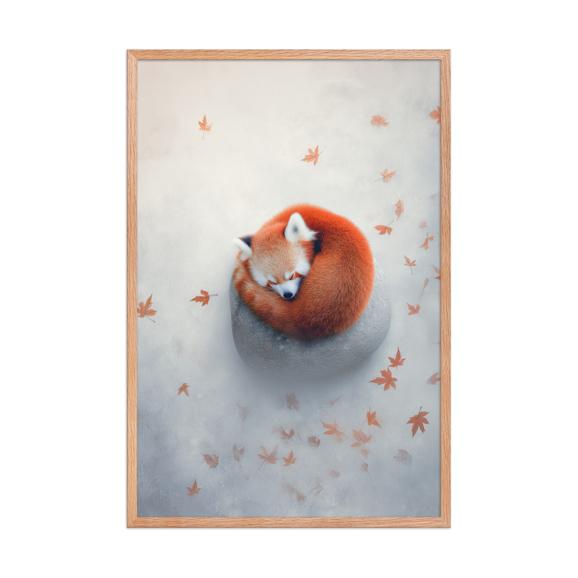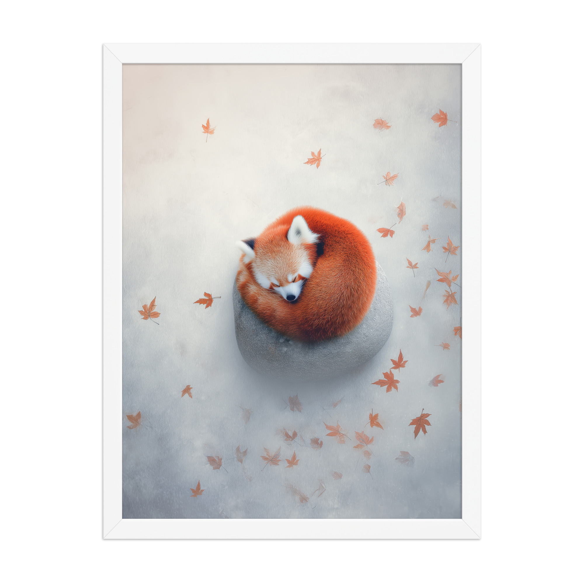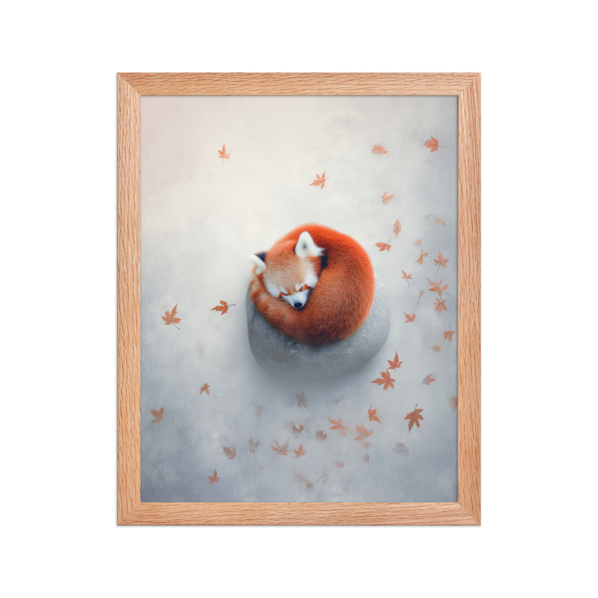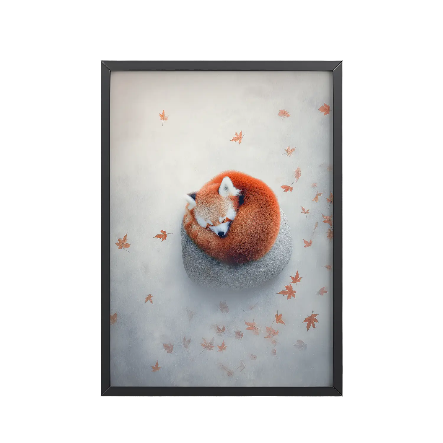 Curled Calm captures a tender, overhead view: a red panda tucked into a perfect circle atop a smooth stone while tiny Japanese maple leaves scatter like whispers around it. The cool mist ground and warm auburn fur create a soothing balance that fits effortlessly into Japandi, Scandinavian, and modern spaces.