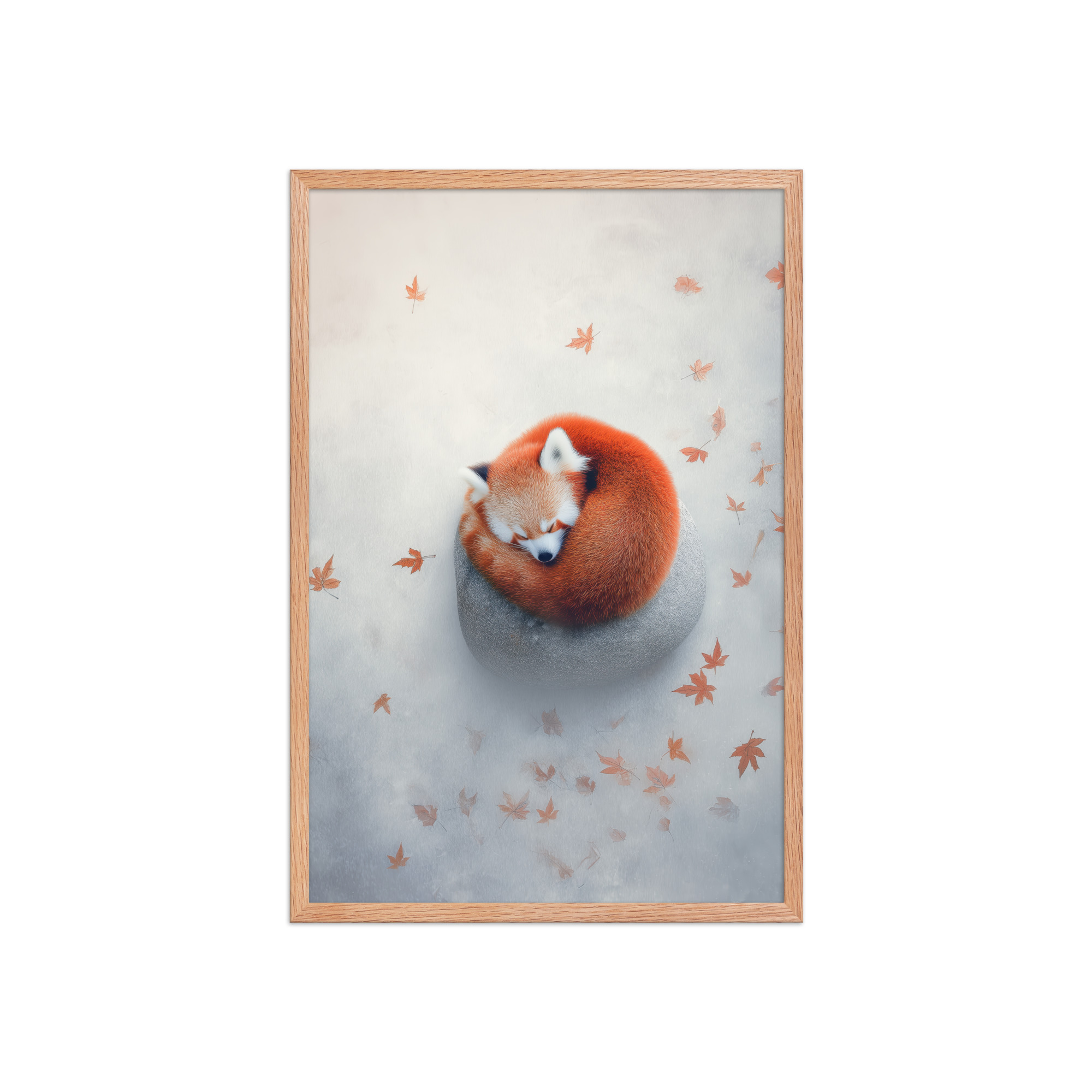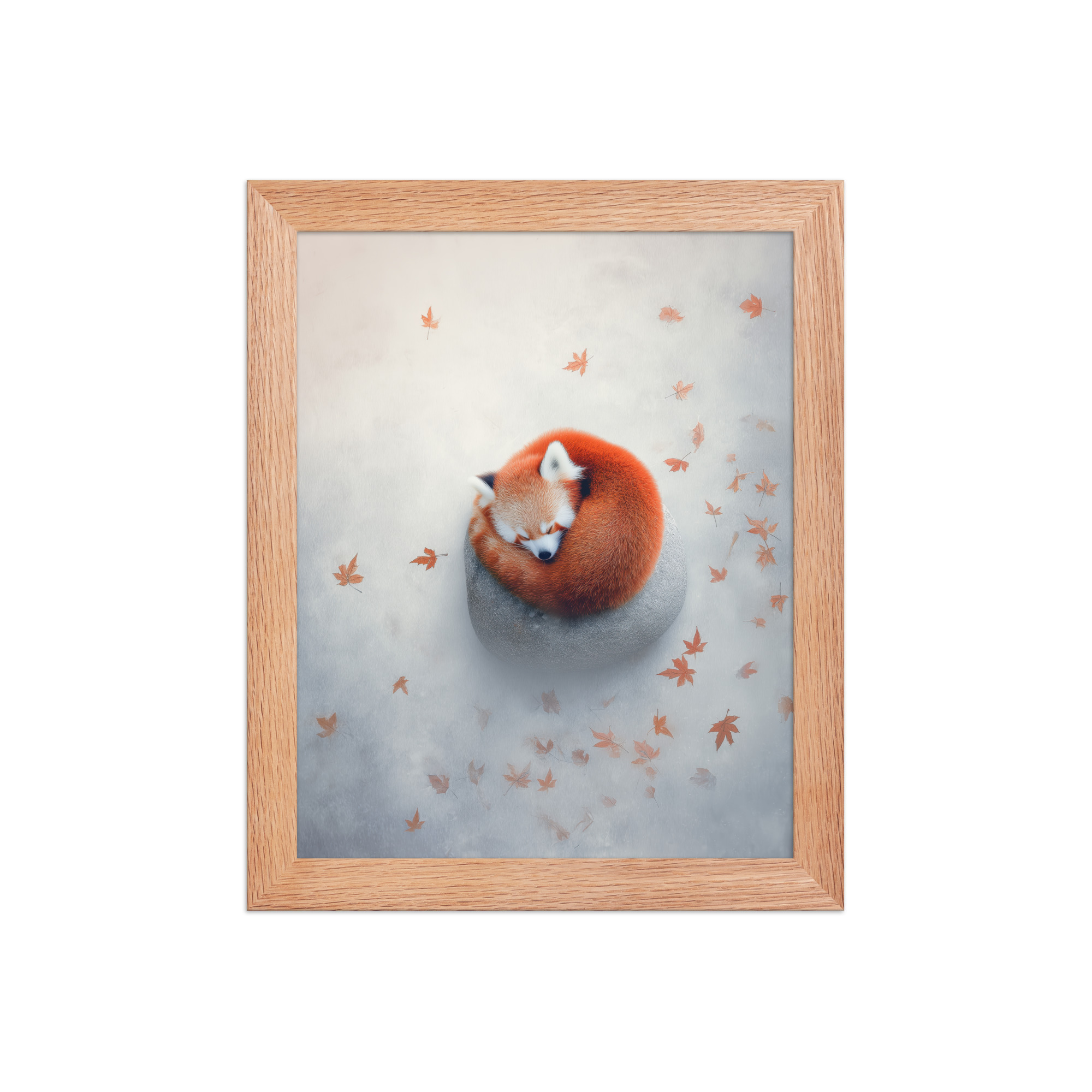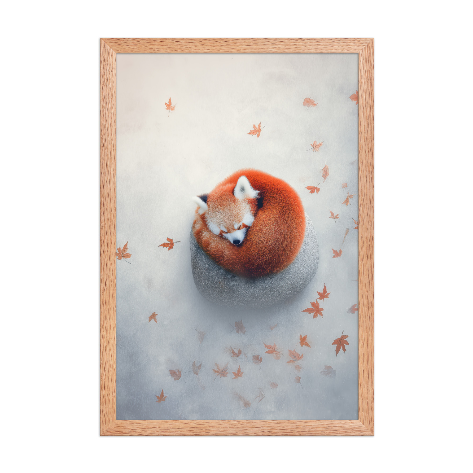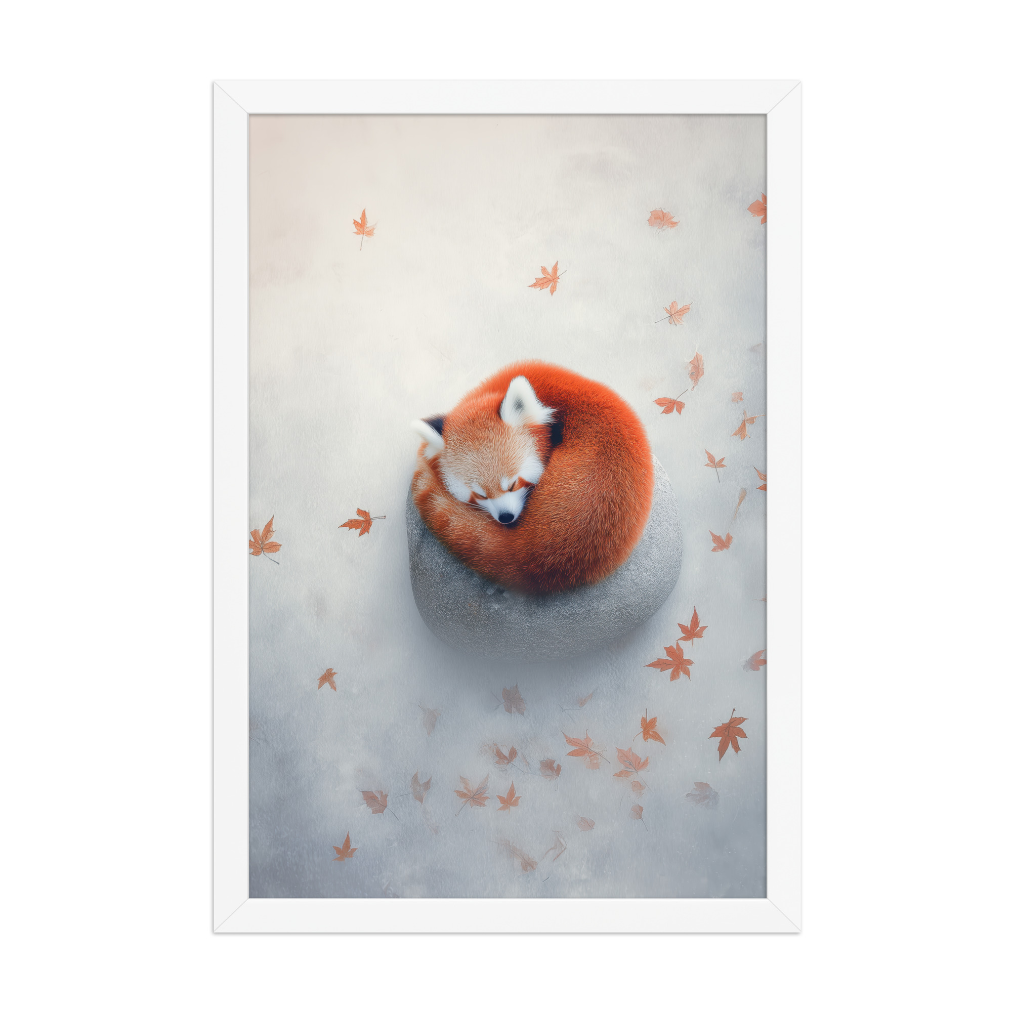 Curled Calm captures a tender, overhead view: a red panda tucked into a perfect circle atop a smooth stone while tiny Japanese maple leaves scatter like whispers around it. The cool mist ground and warm auburn fur create a soothing balance that fits effortlessly into Japandi, Scandinavian, and modern spaces.
