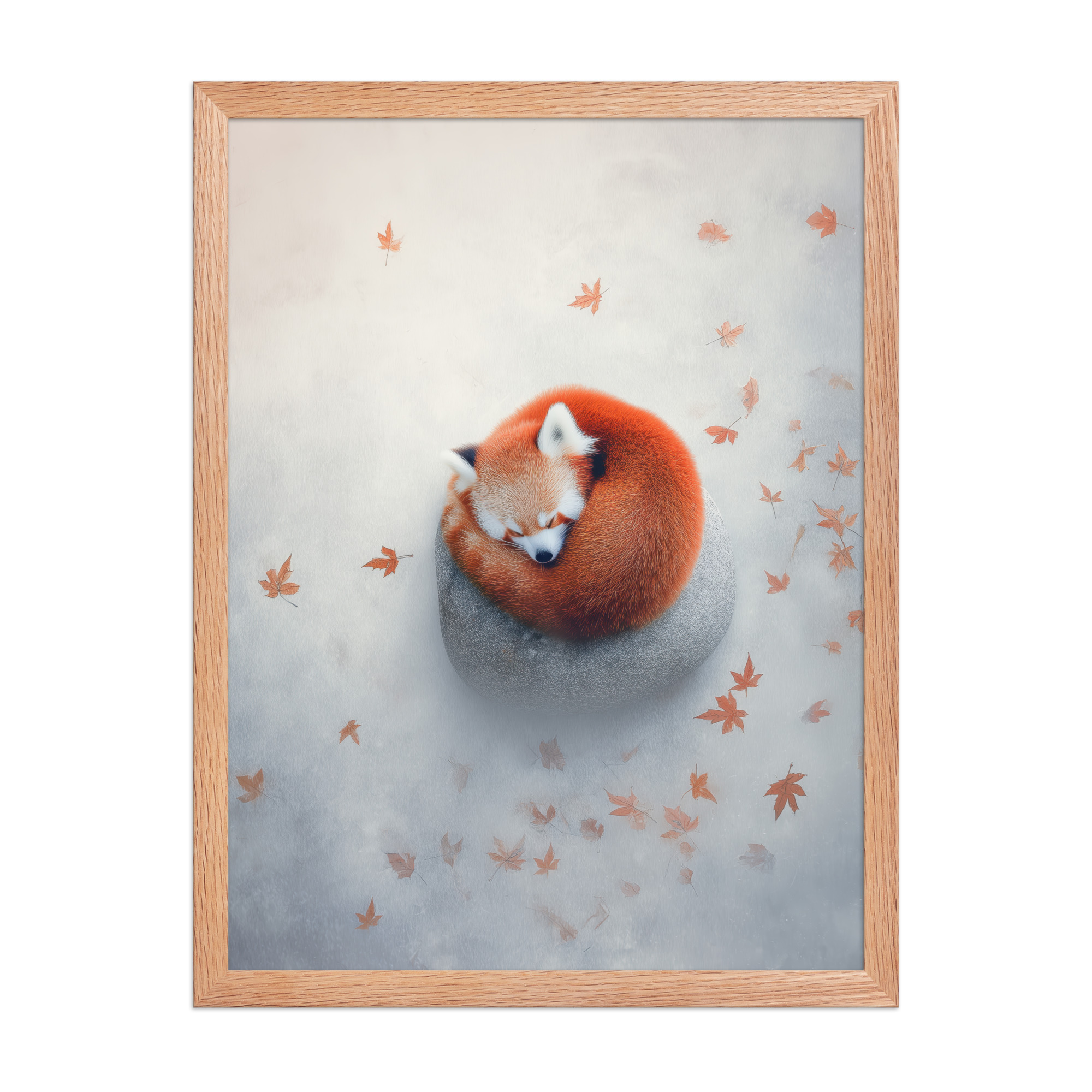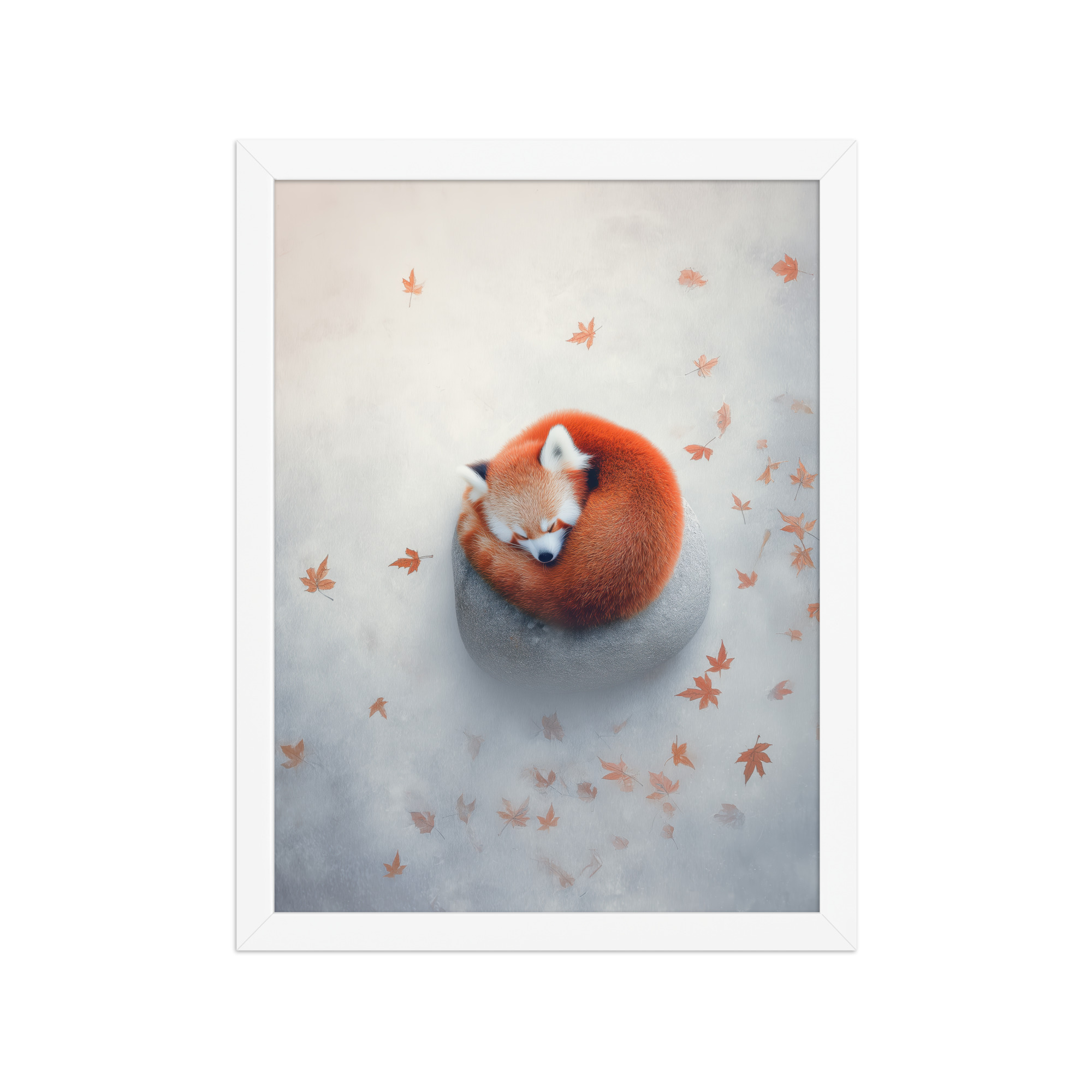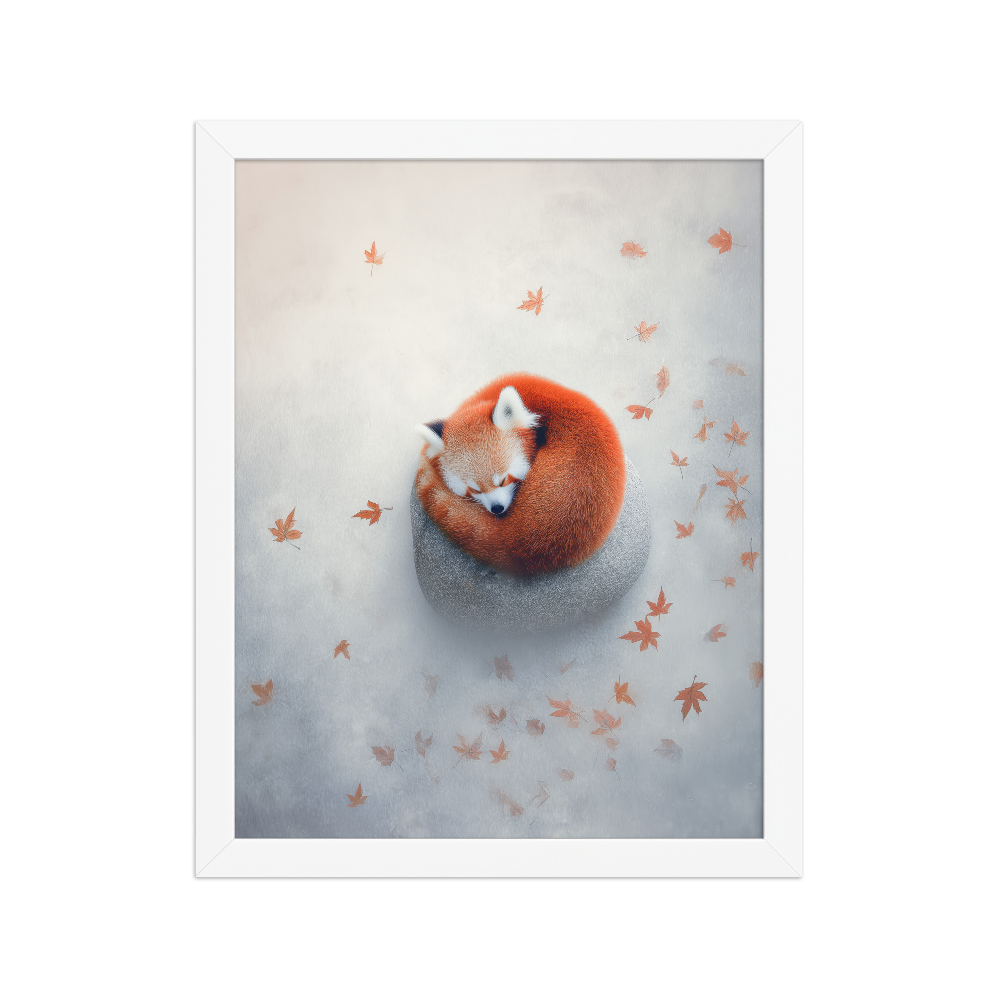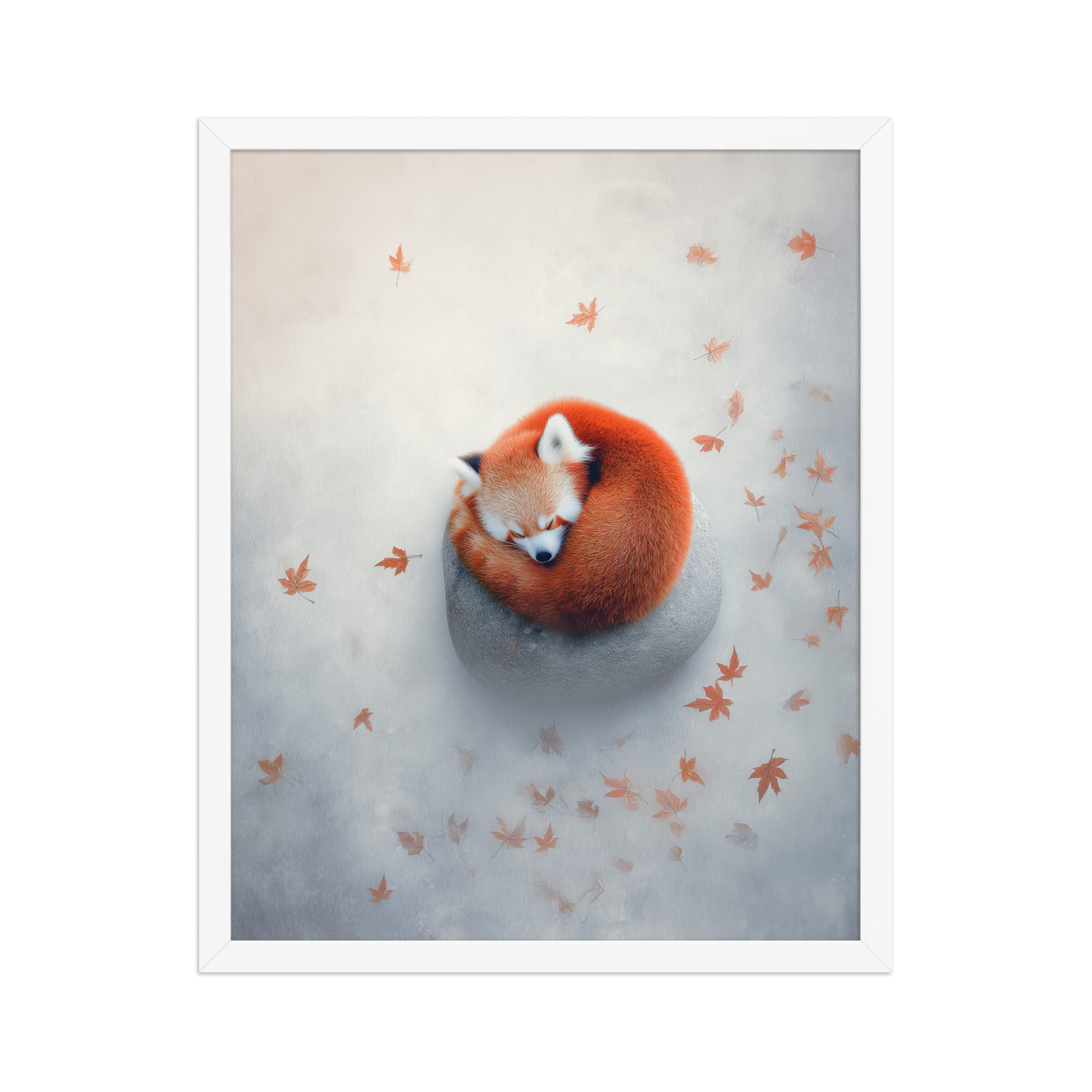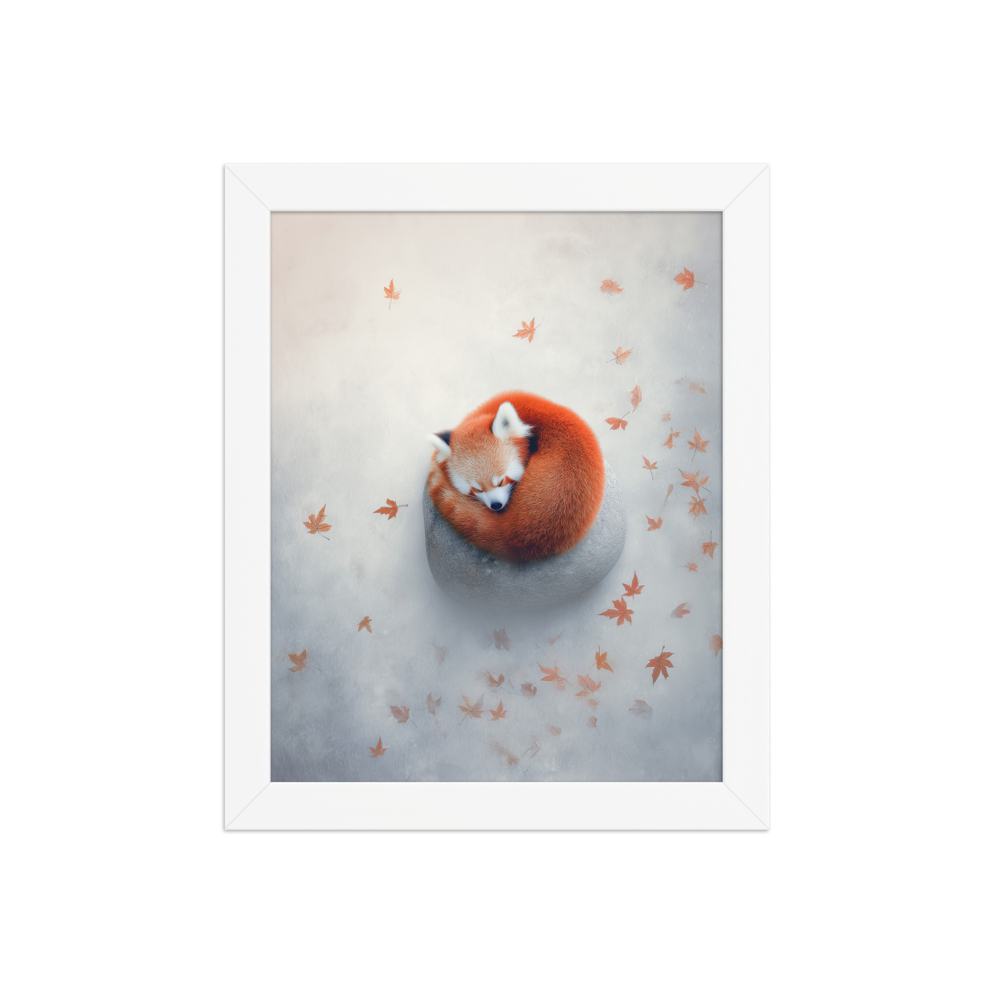 Curled Calm captures a tender, overhead view: a red panda tucked into a perfect circle atop a smooth stone while tiny Japanese maple leaves scatter like whispers around it. The cool mist ground and warm auburn fur create a soothing balance that fits effortlessly into Japandi, Scandinavian, and modern spaces.