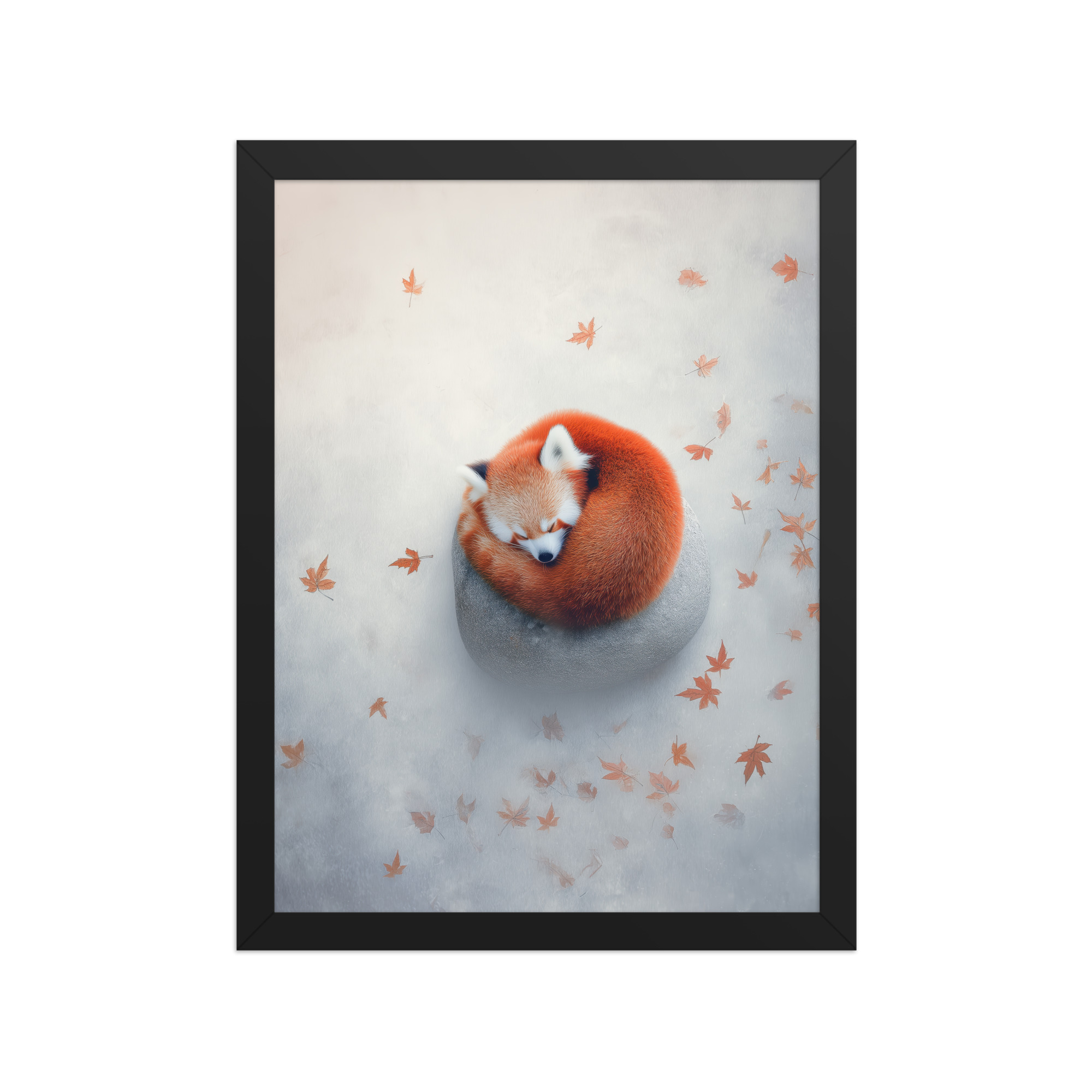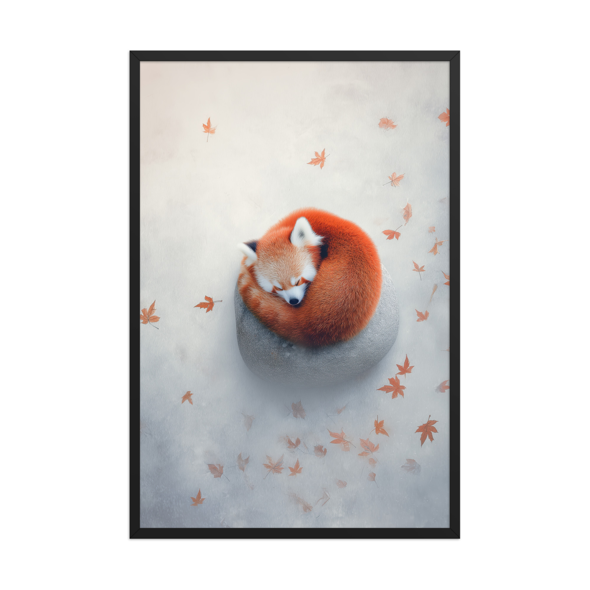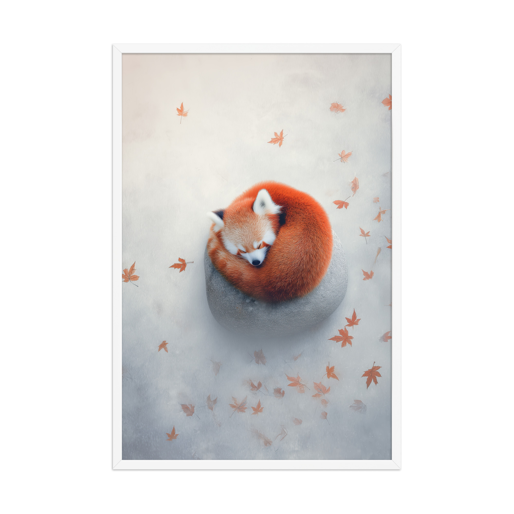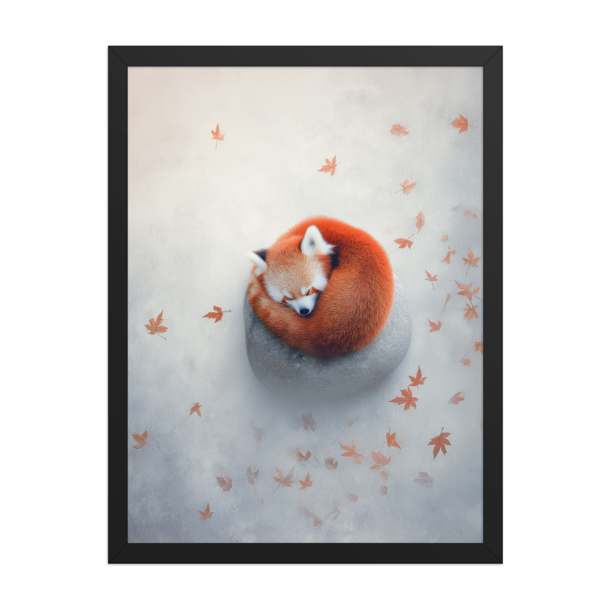 Curled Calm captures a tender, overhead view: a red panda tucked into a perfect circle atop a smooth stone while tiny Japanese maple leaves scatter like whispers around it. The cool mist ground and warm auburn fur create a soothing balance that fits effortlessly into Japandi, Scandinavian, and modern spaces.