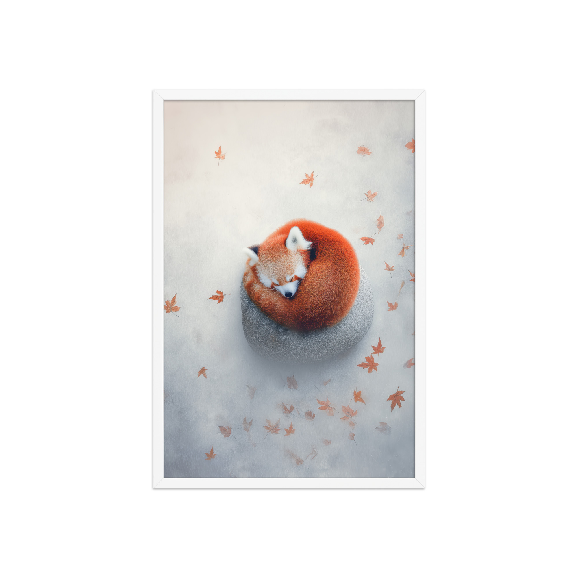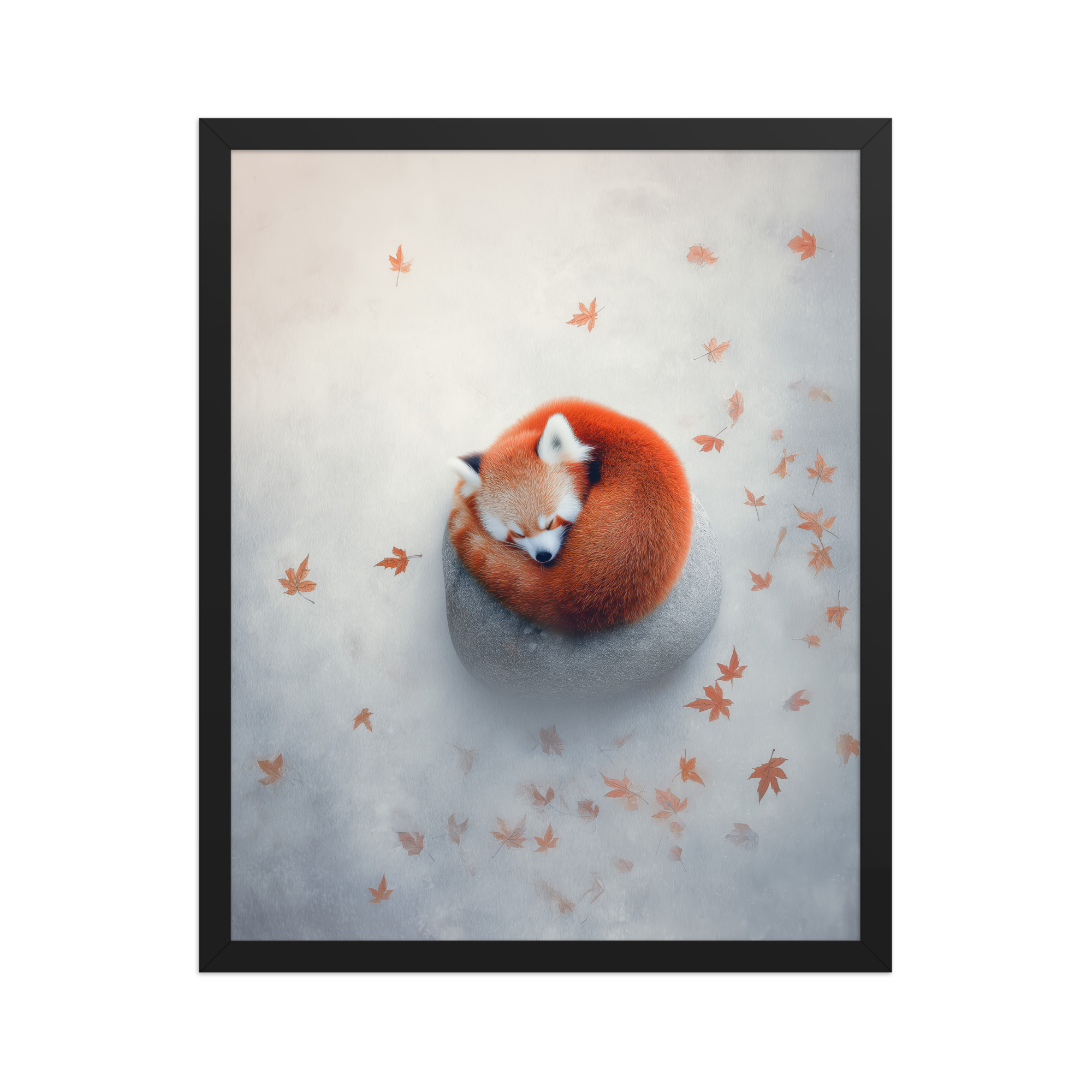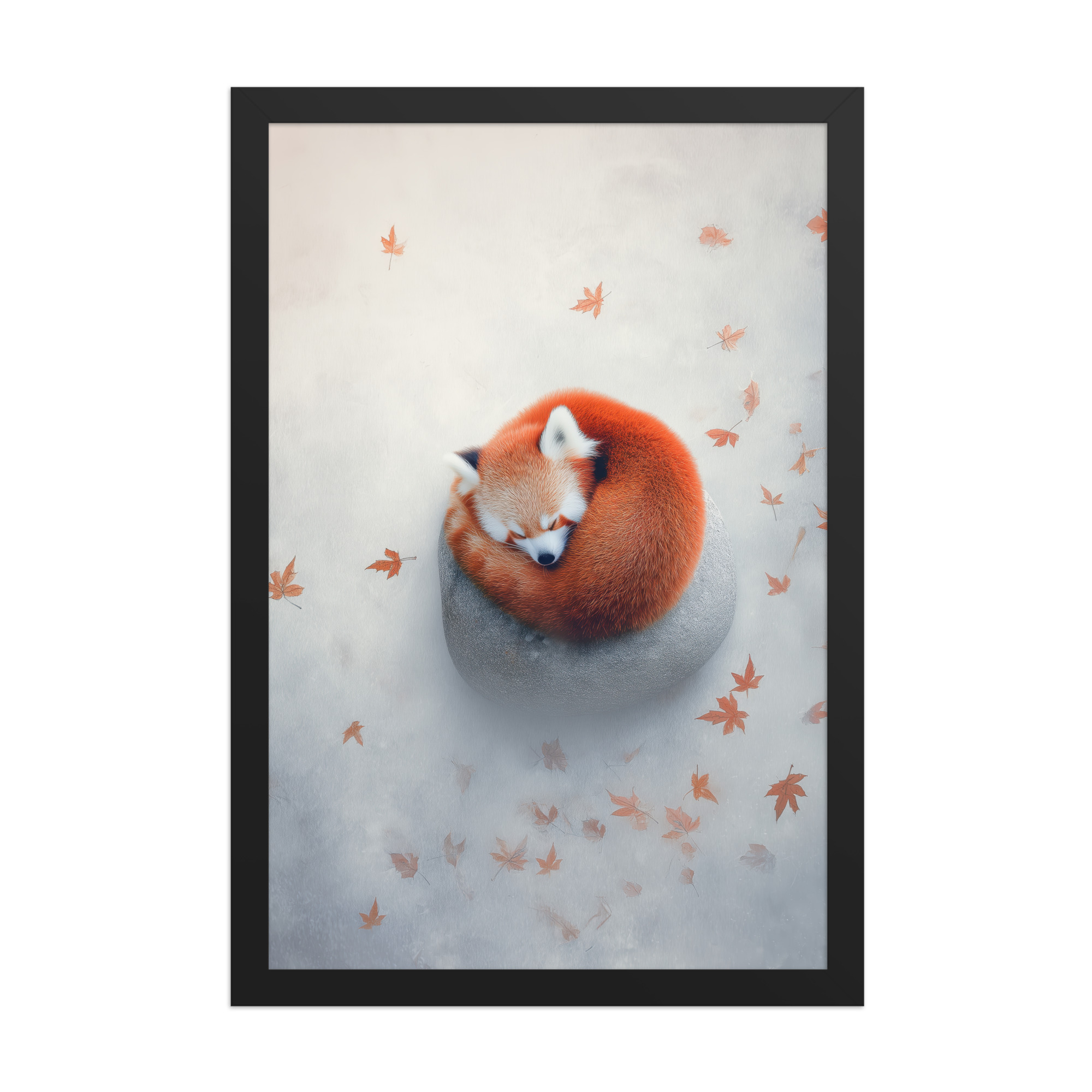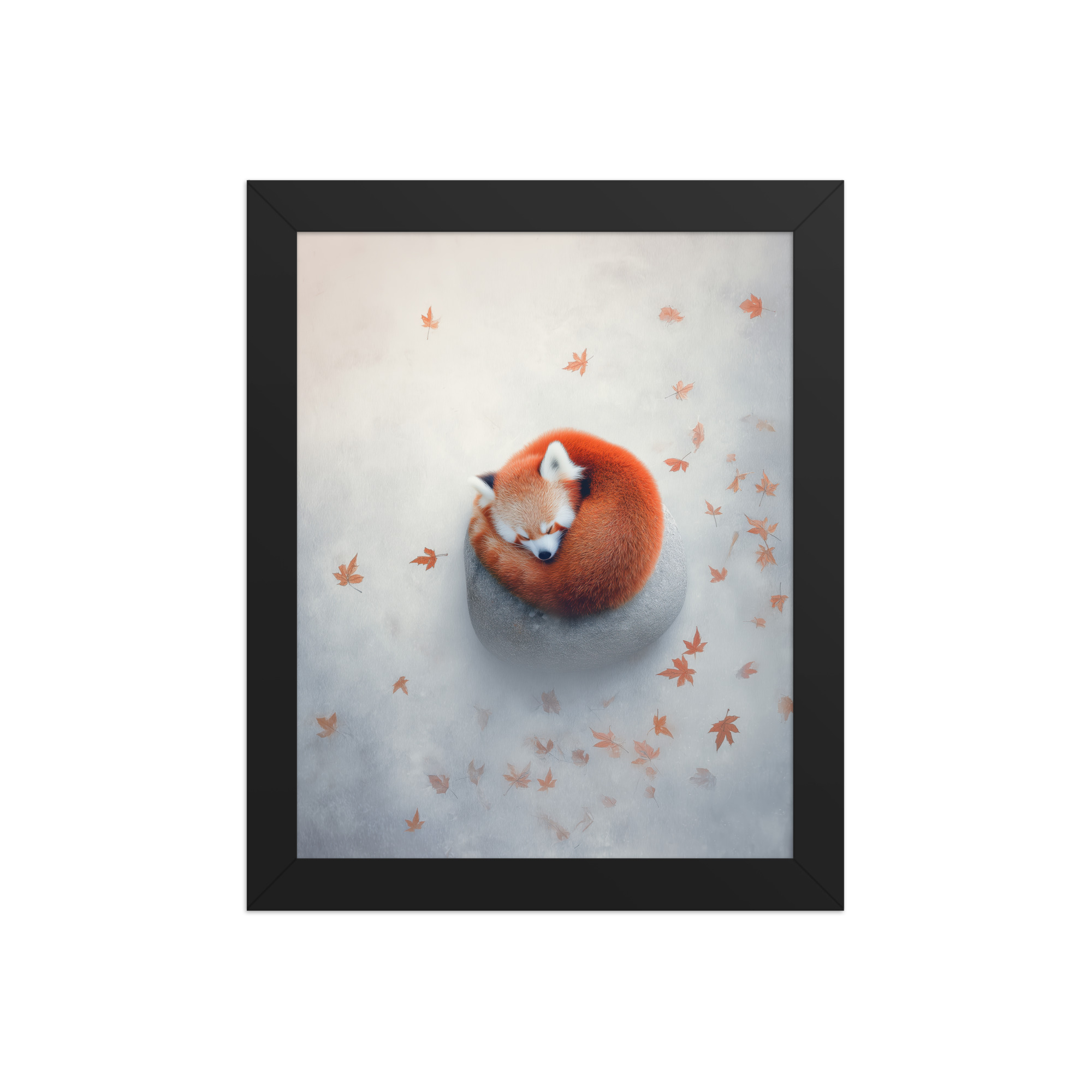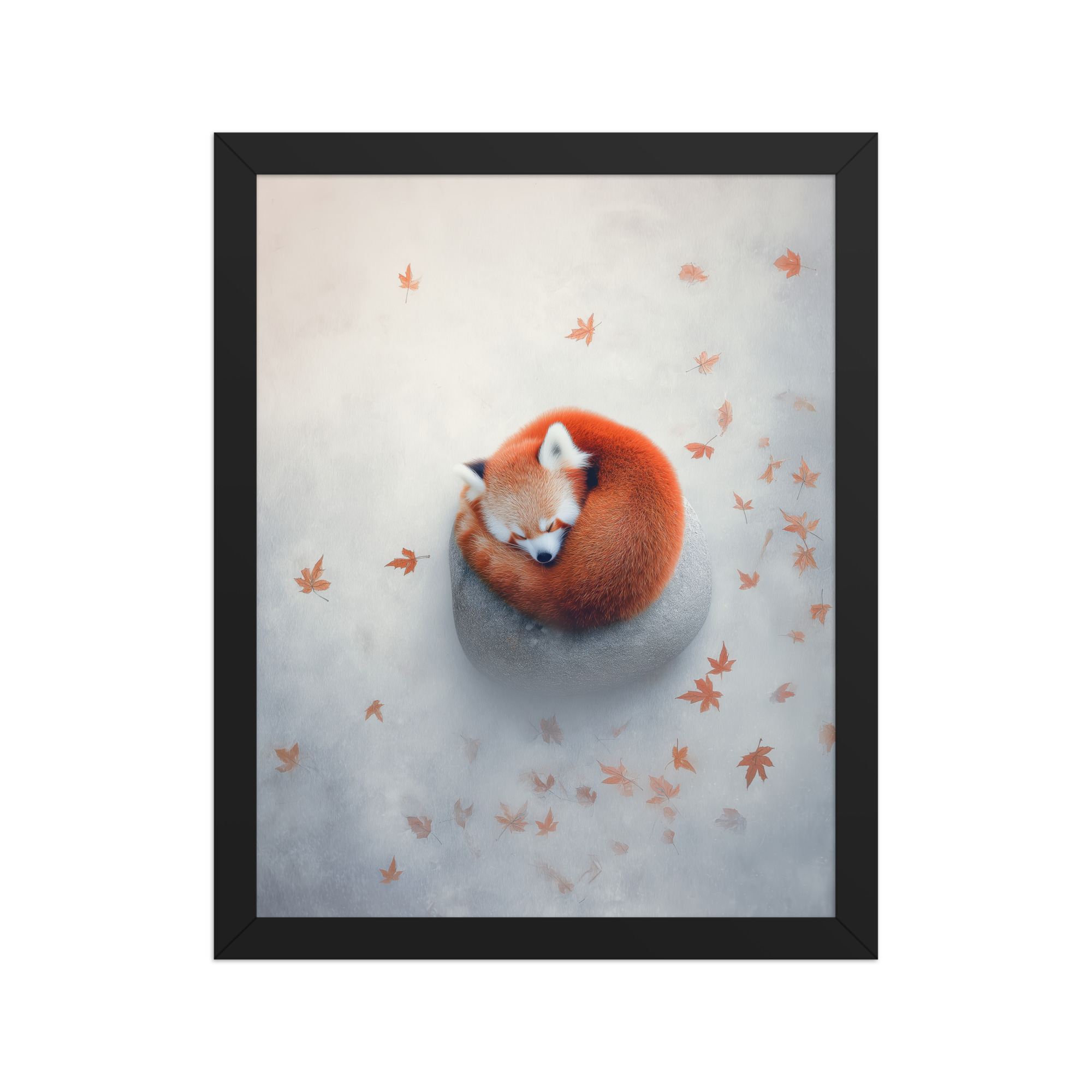 Curled Calm captures a tender, overhead view: a red panda tucked into a perfect circle atop a smooth stone while tiny Japanese maple leaves scatter like whispers around it. The cool mist ground and warm auburn fur create a soothing balance that fits effortlessly into Japandi, Scandinavian, and modern spaces.