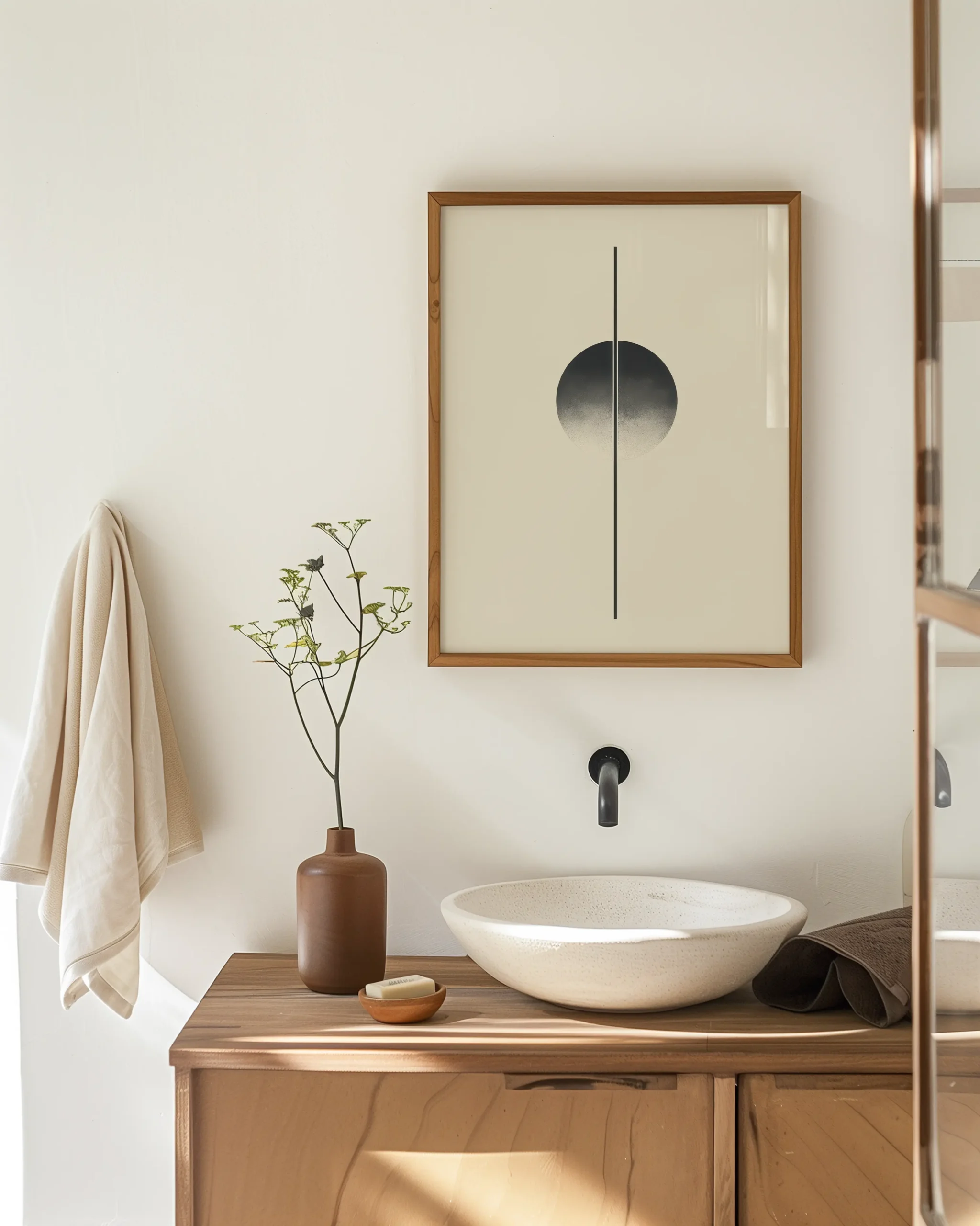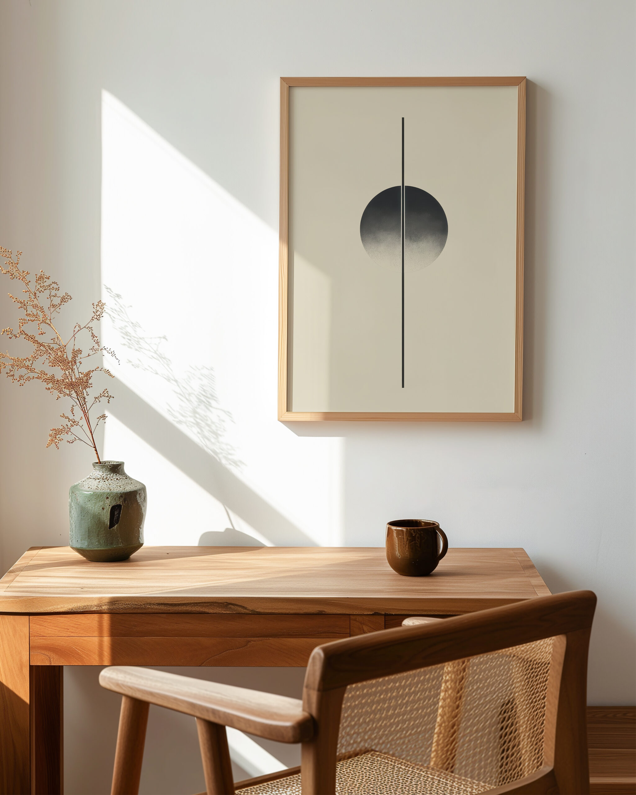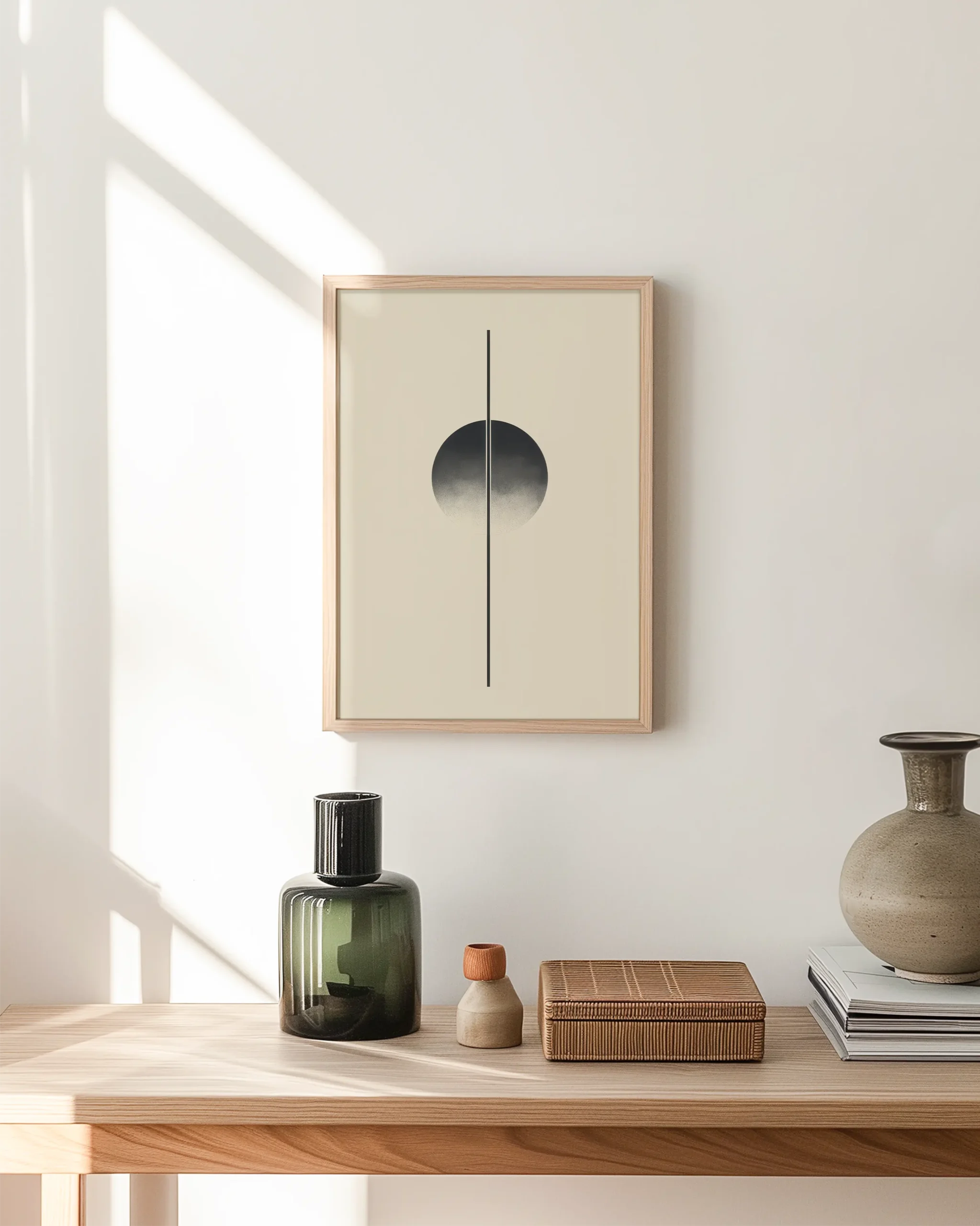 A single vertical line intersects a misted charcoal circle, distilling balance and presence into pure form. The spacious negative space invites quiet focus and effortless harmony.