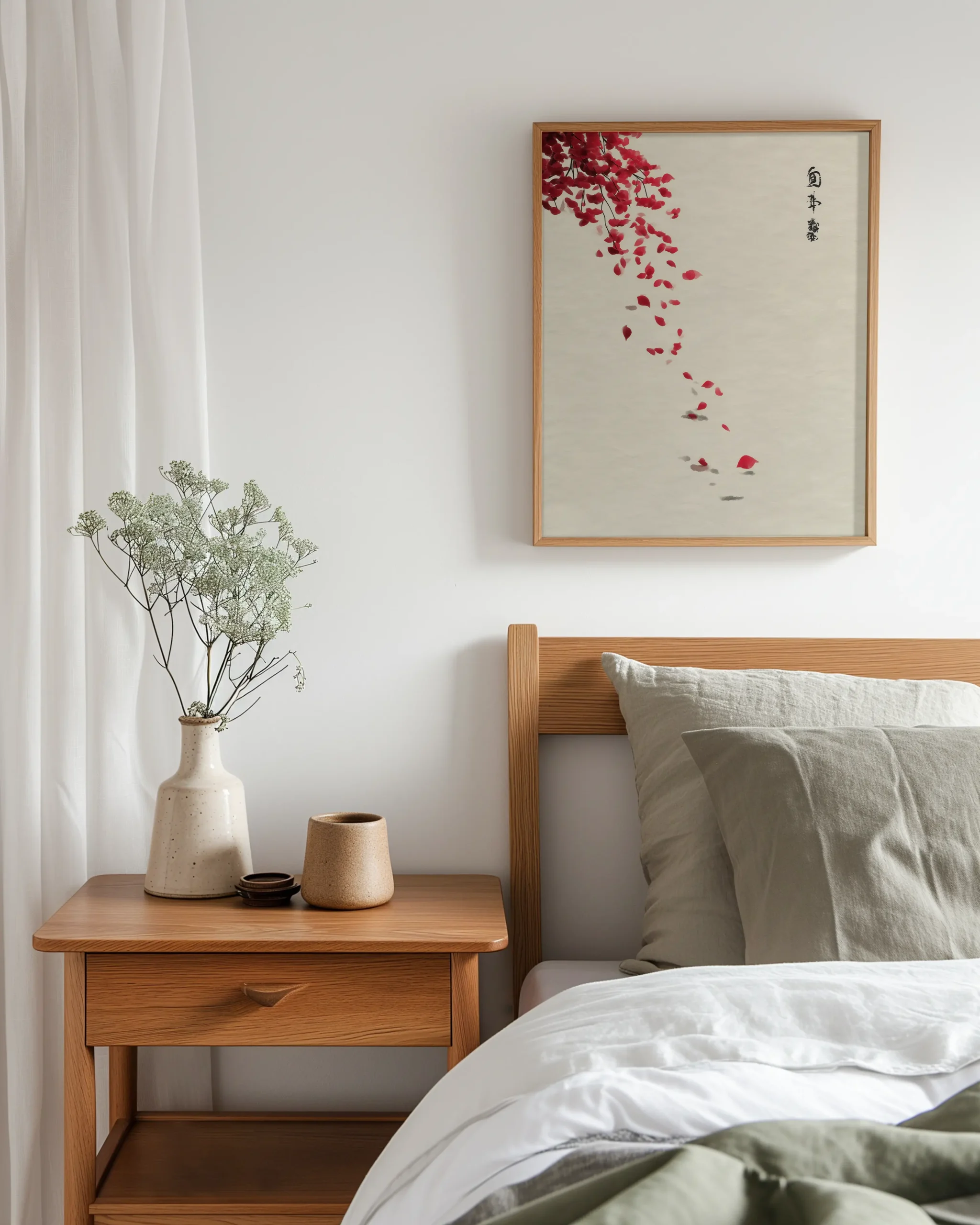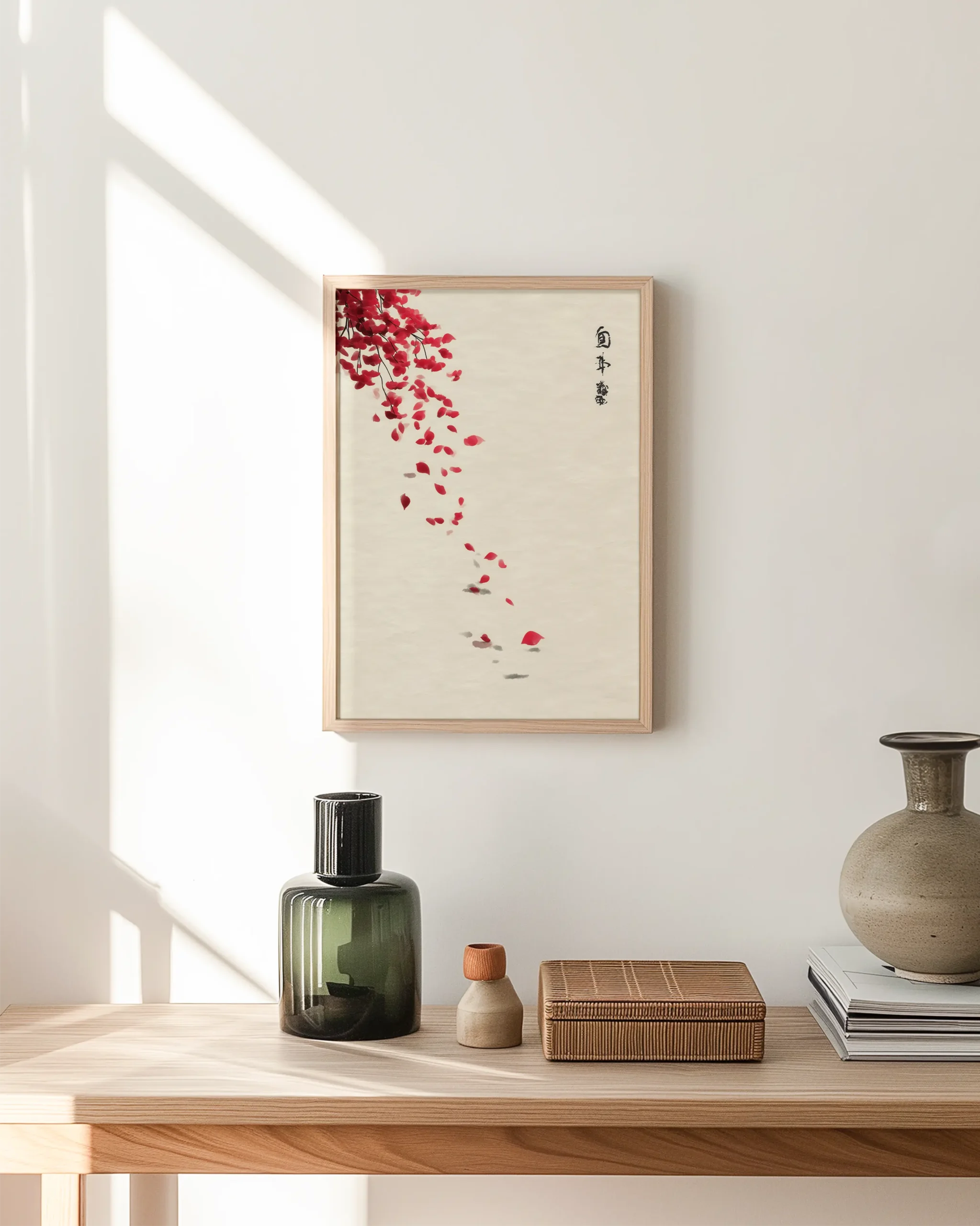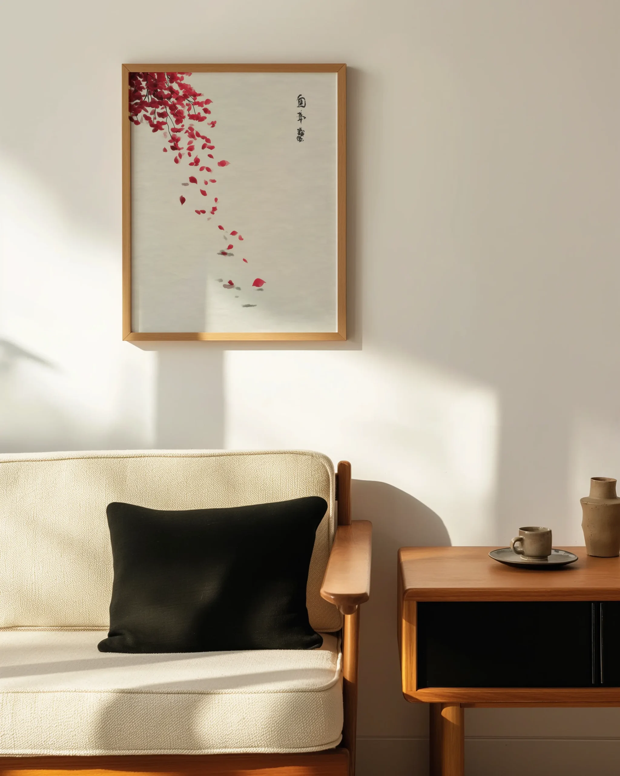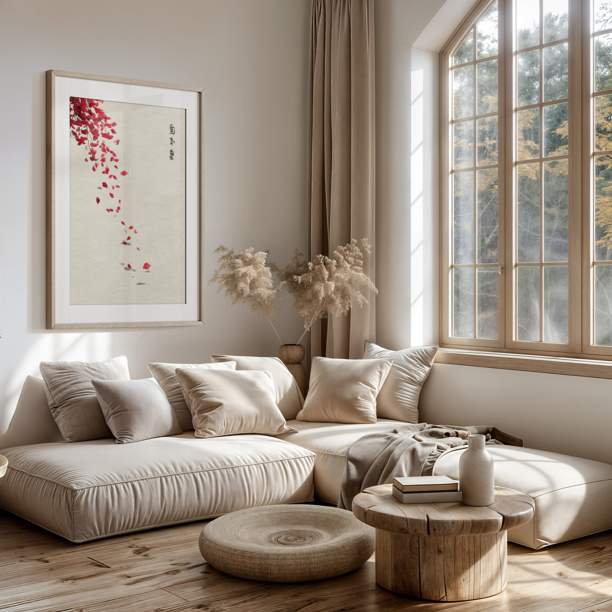 Falling Petals evokes a quiet moment beneath a maple branch as crimson leaves lift and scatter on a gentle breeze. The generous negative space and ink-brush accents channel wabi-sabi calm, making this an elegant focal point for Japandi and modern, minimalist interiors.