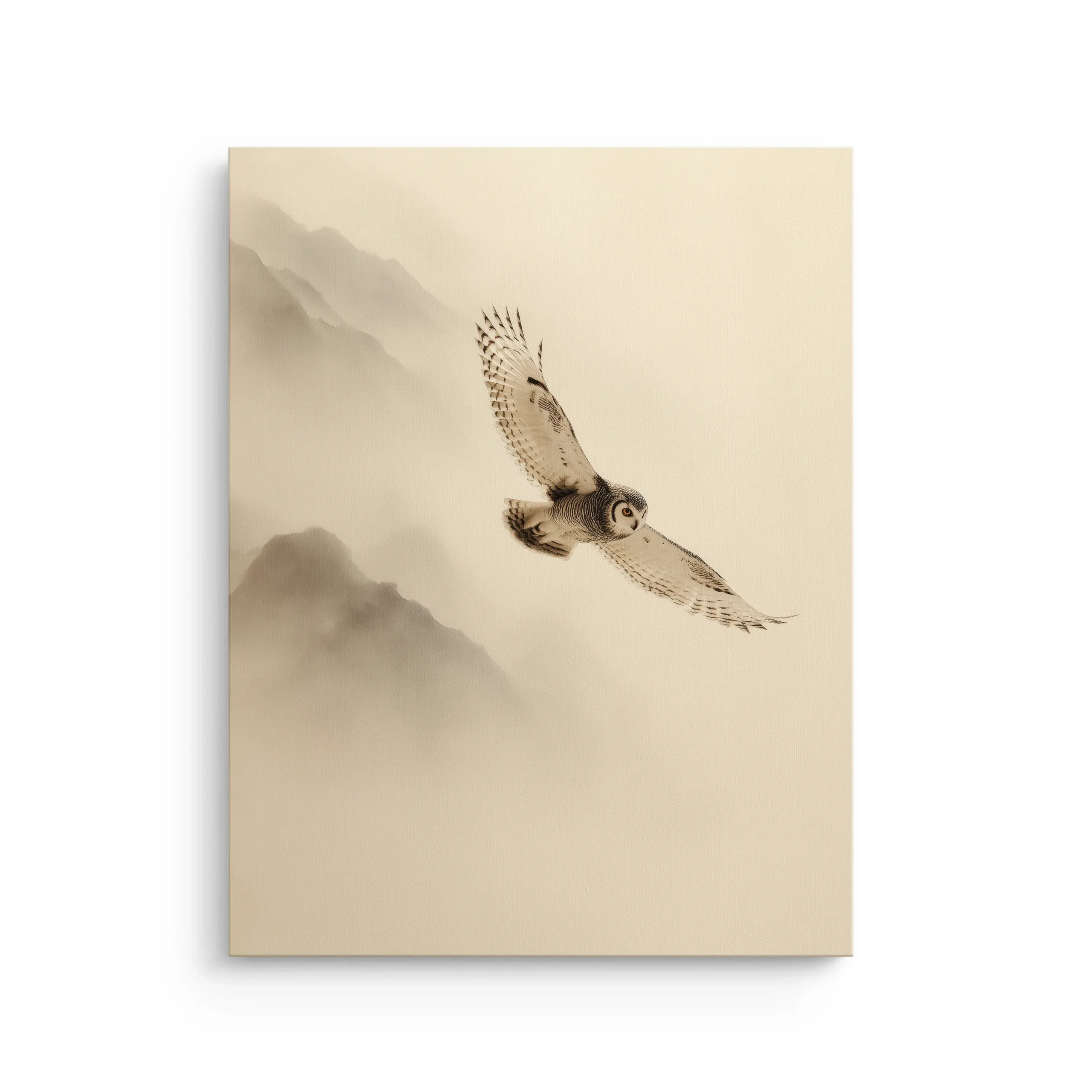 A quiet owl moves through open sky above misty mountain silhouettes, rendered with a subtle Japanese ink-wash feel and airy negative space. The muted tones and calm composition create a balanced Japandi mood that feels light, peaceful, and timeless.