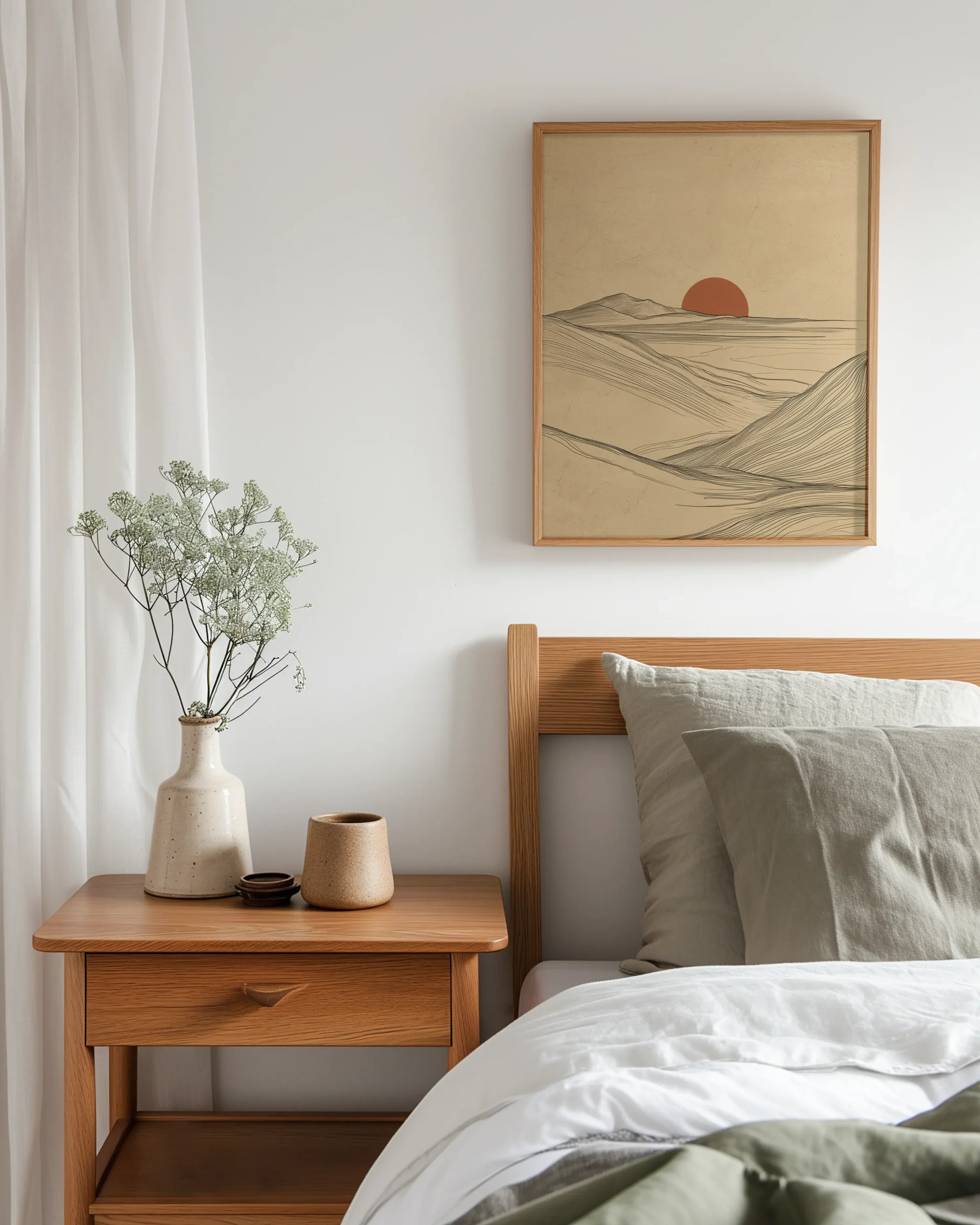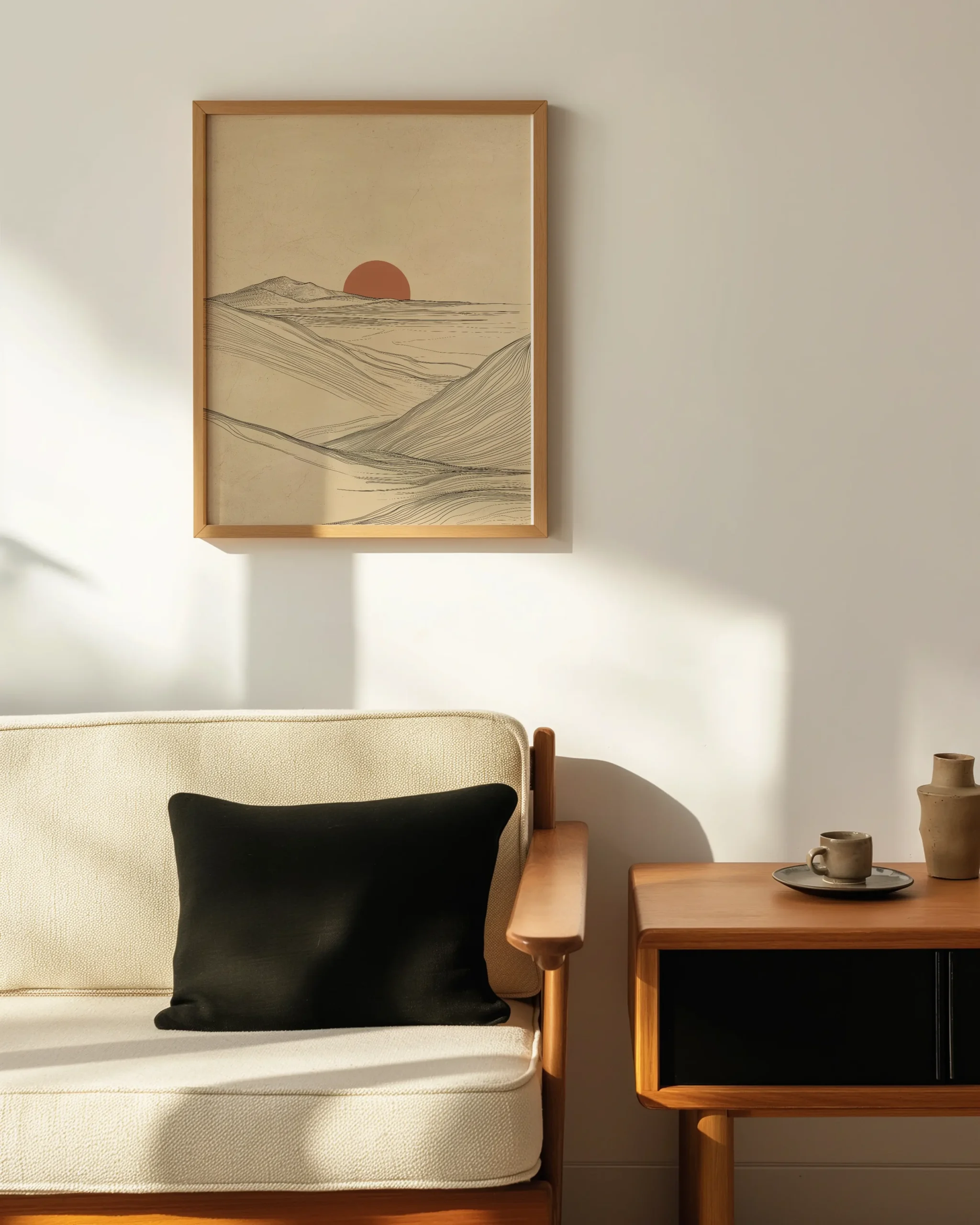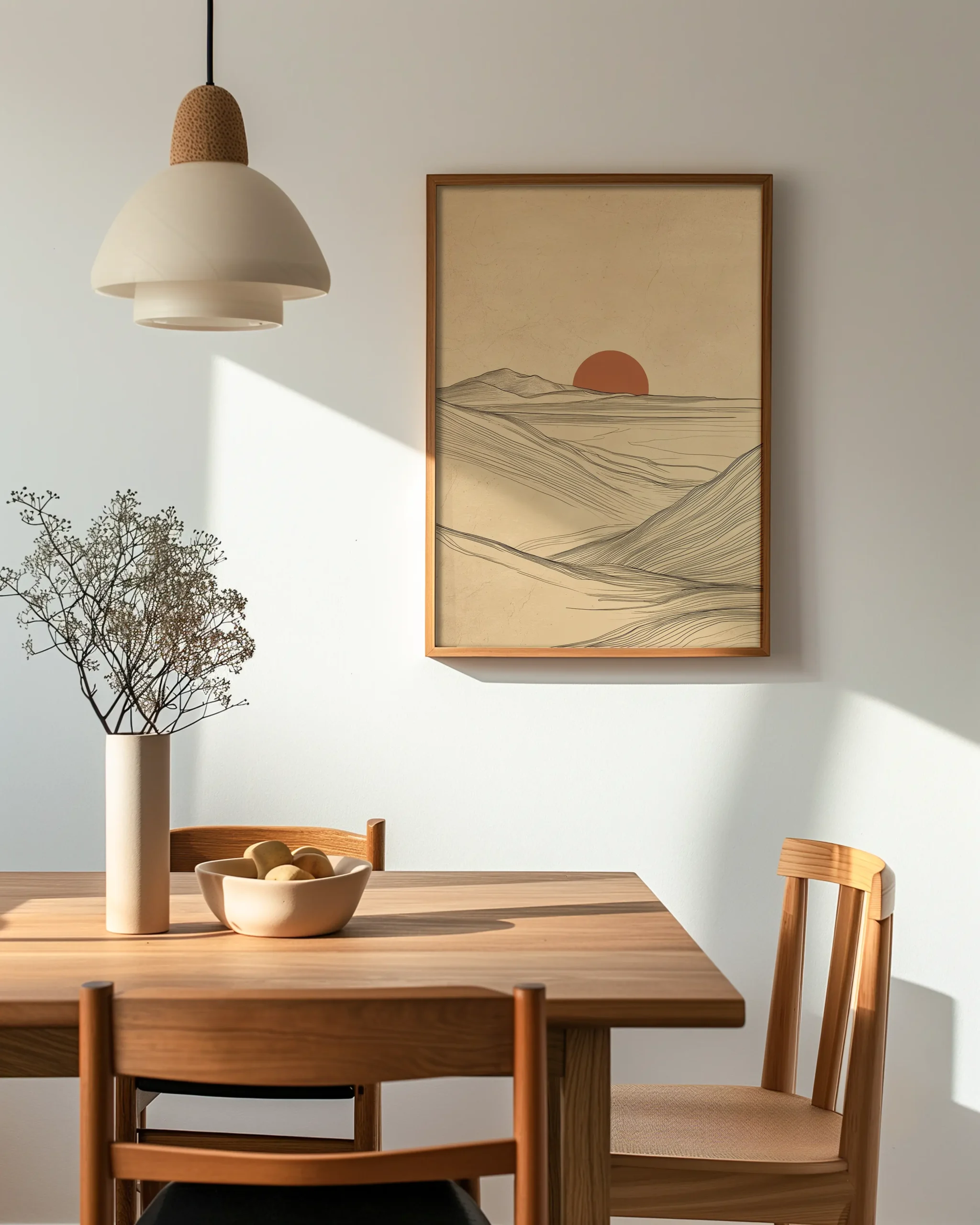 Elegant linework sweeps across sand-toned planes as a rust sun rests at the horizon. The minimal composition feels calm, airy, and quietly architectural.