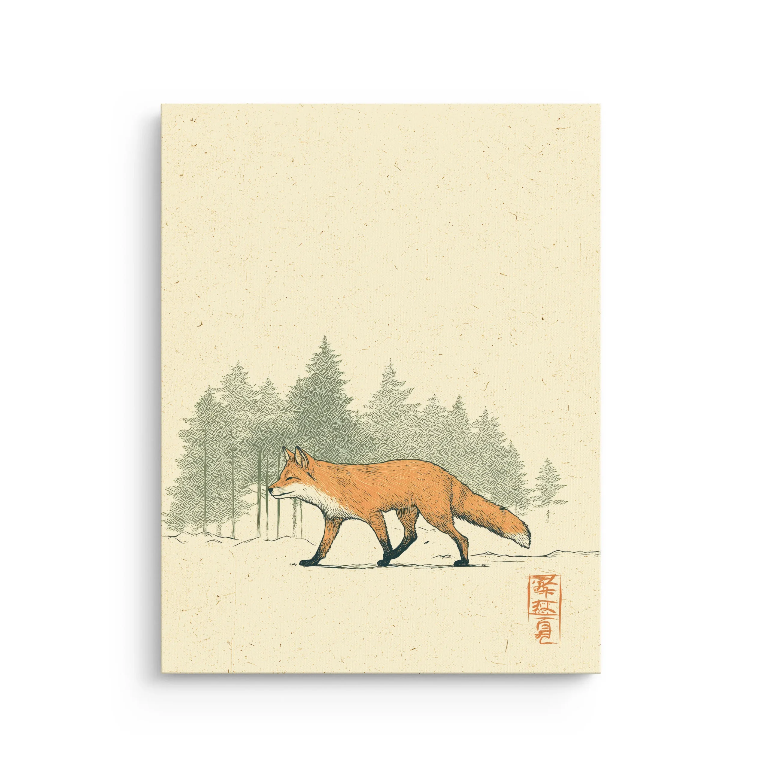 A lone fox pads through a pale winter clearing, set against soft pine shadows with subtle Ukiyo-e-inspired texture and a small red seal mark. The open space and muted tones create a calm Japandi mood that feels light, balanced, and timeless.