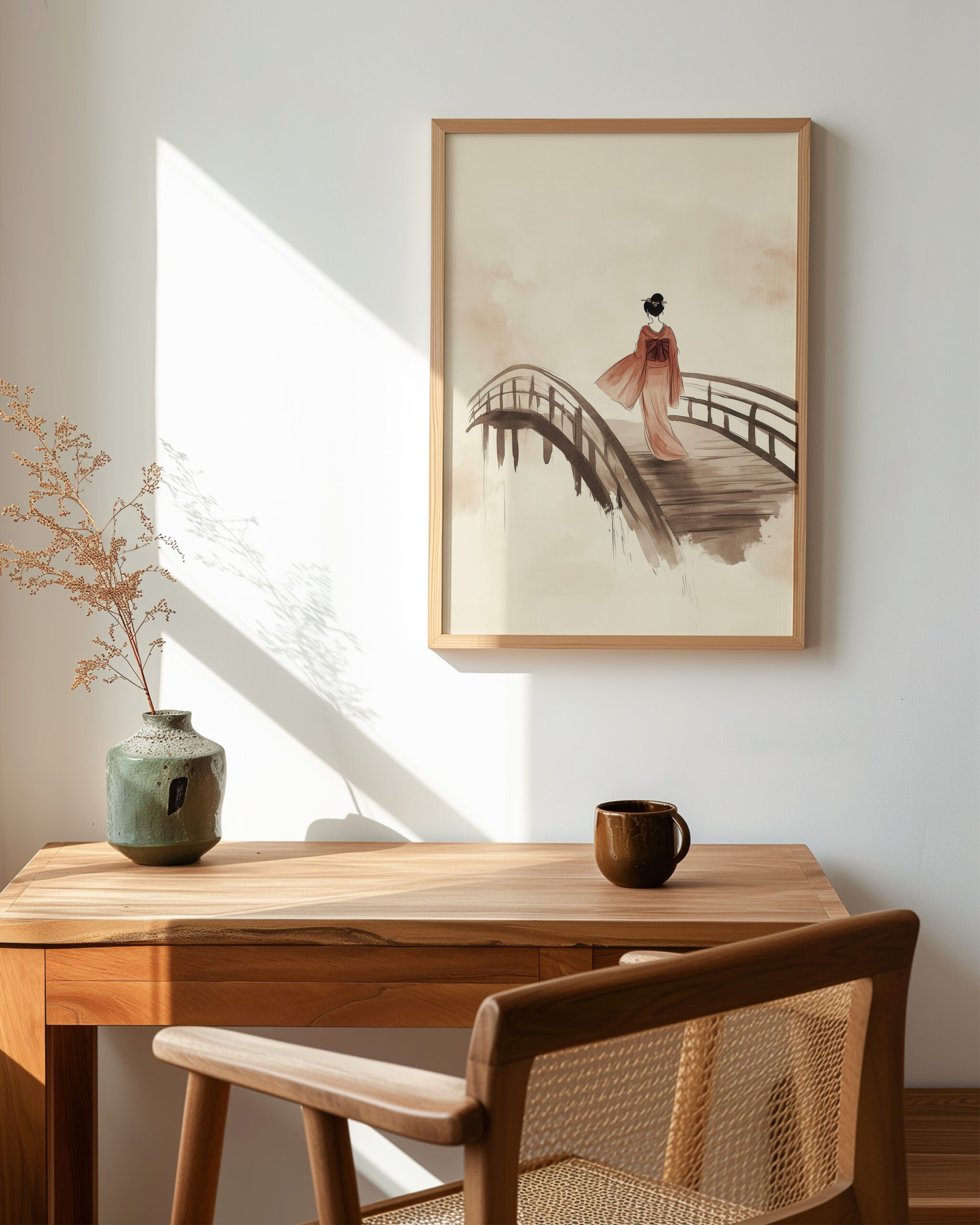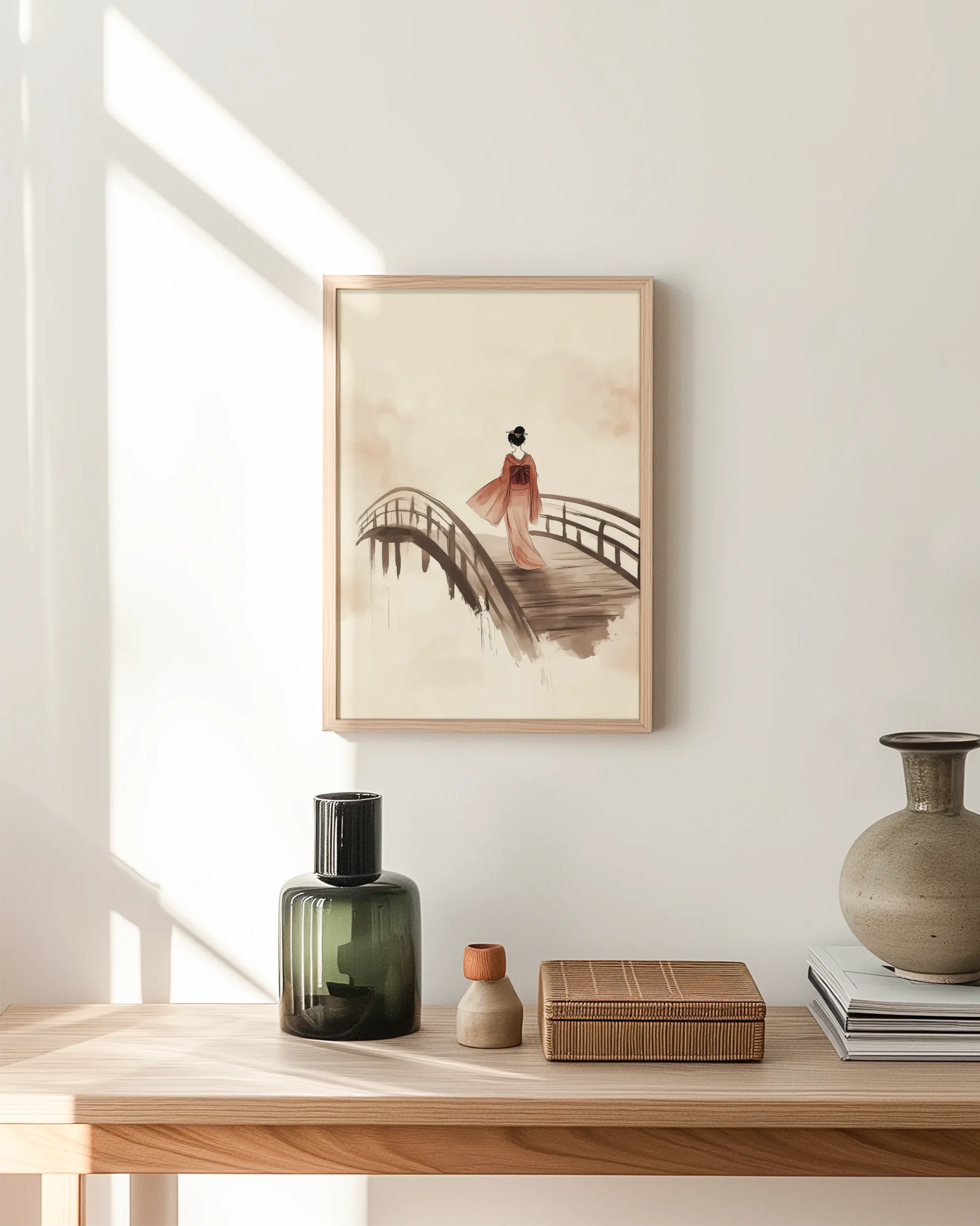 A lone geisha walks across a traditional arched bridge, painted in gentle sepia and blush washes. The open negative space and soft gradients create a calm, contemplative mood.