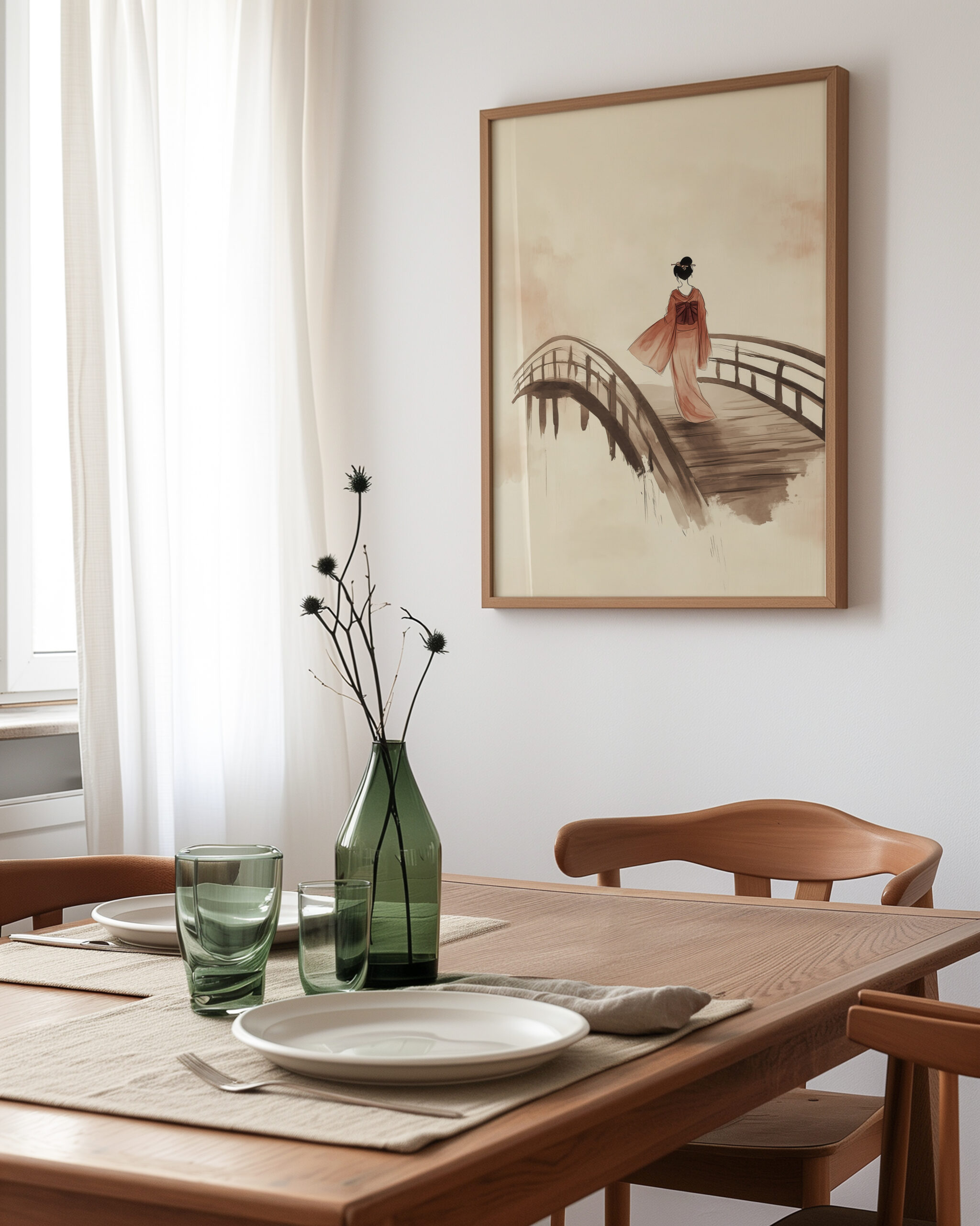 - Elegant figurative scene that adds quiet movement without visual clutter