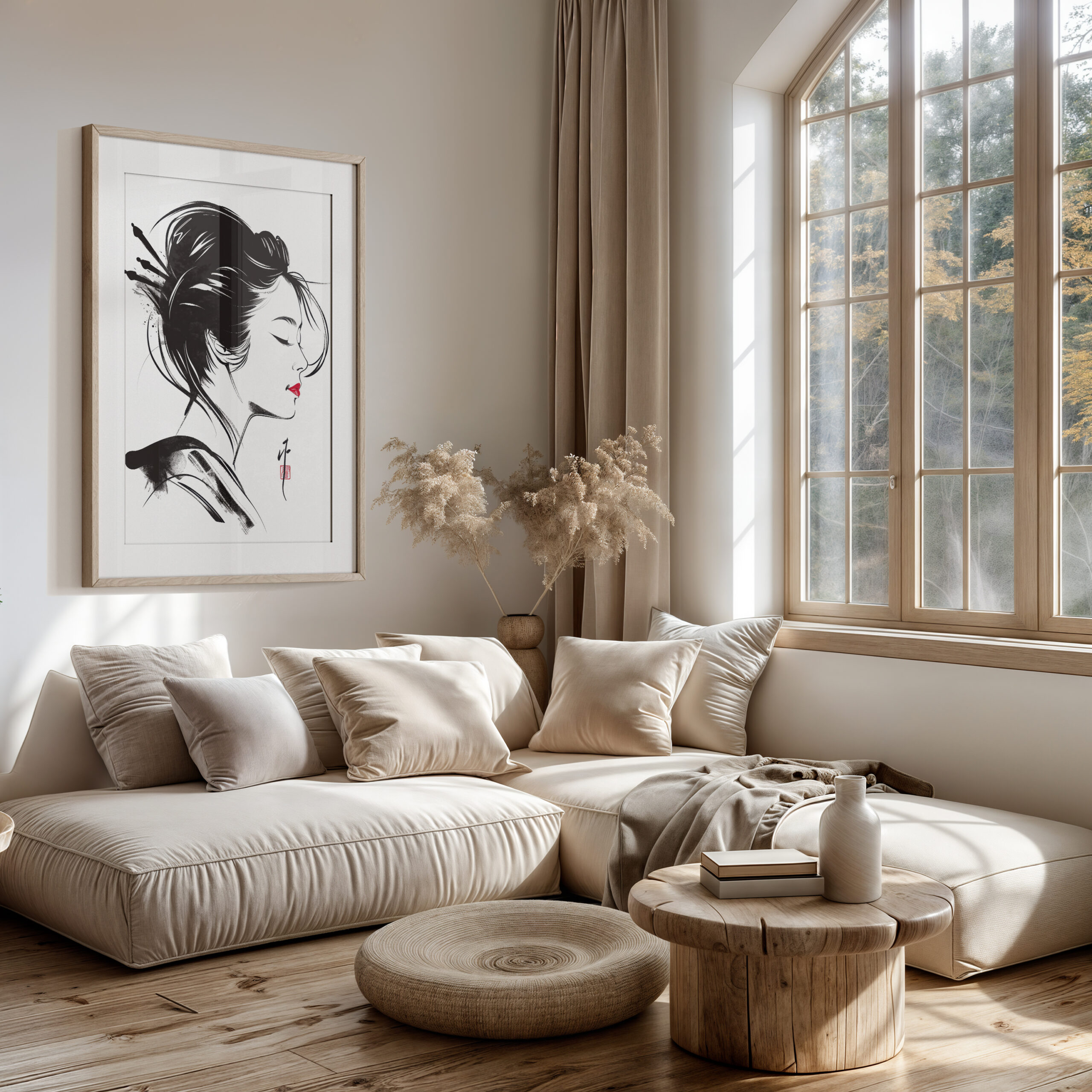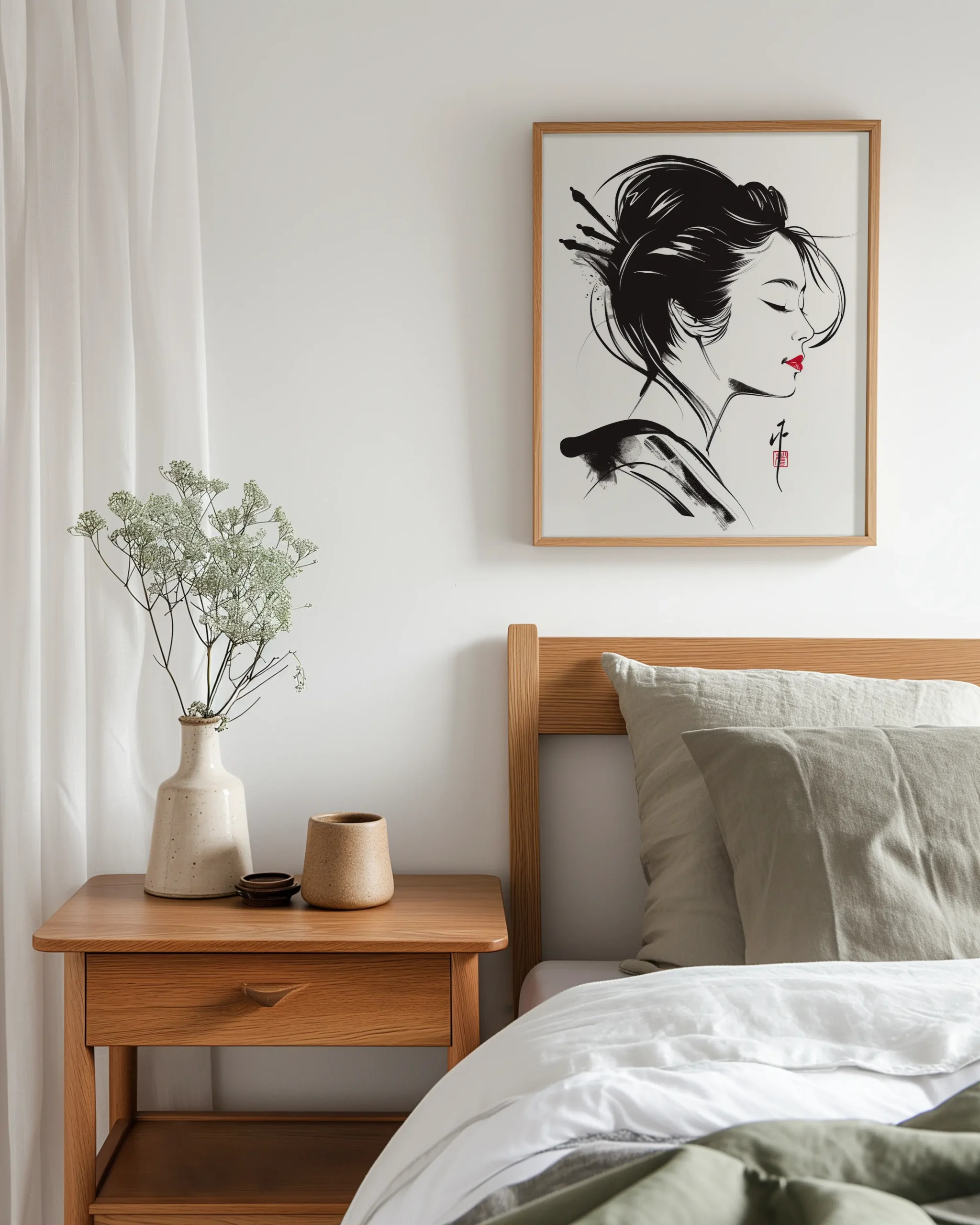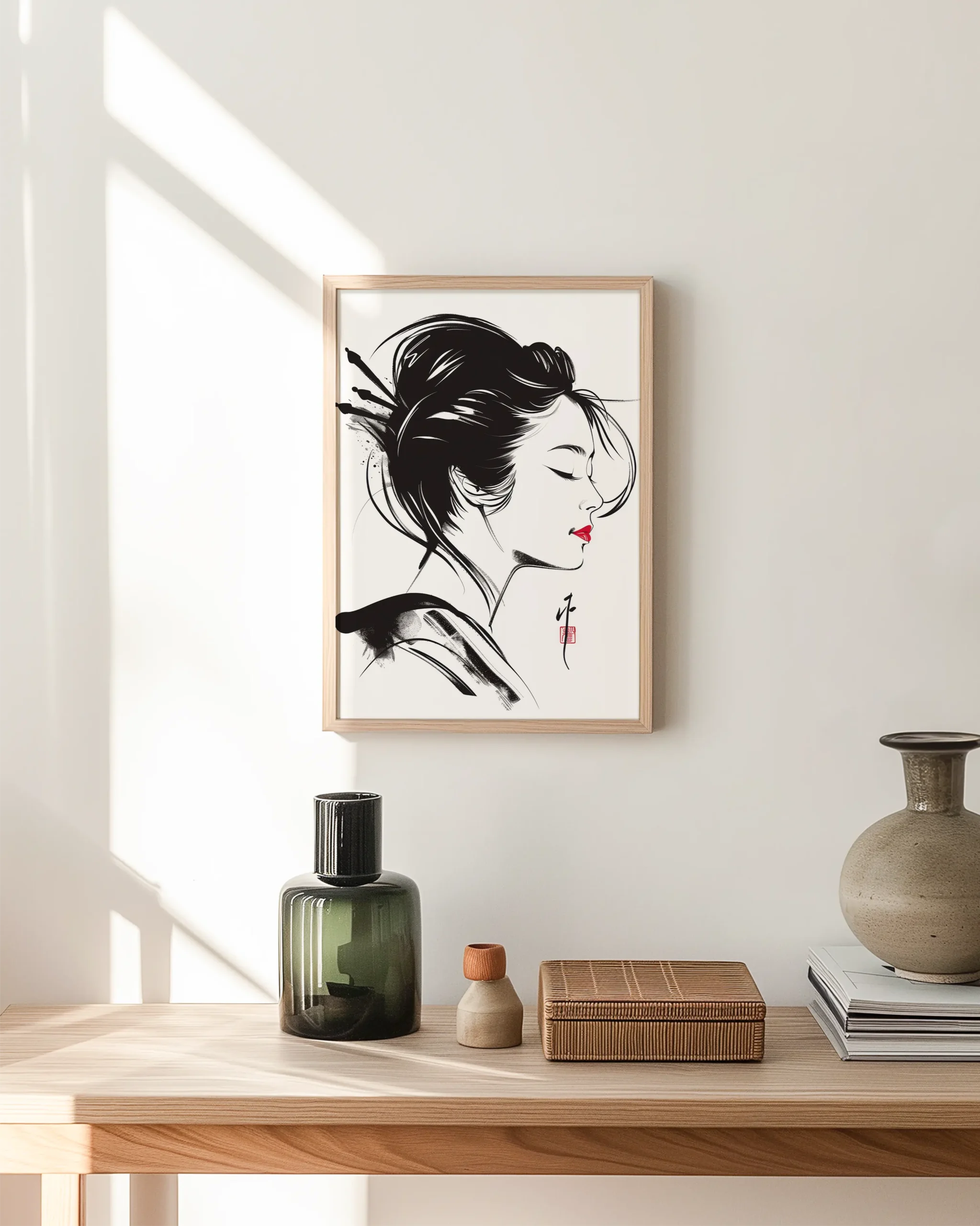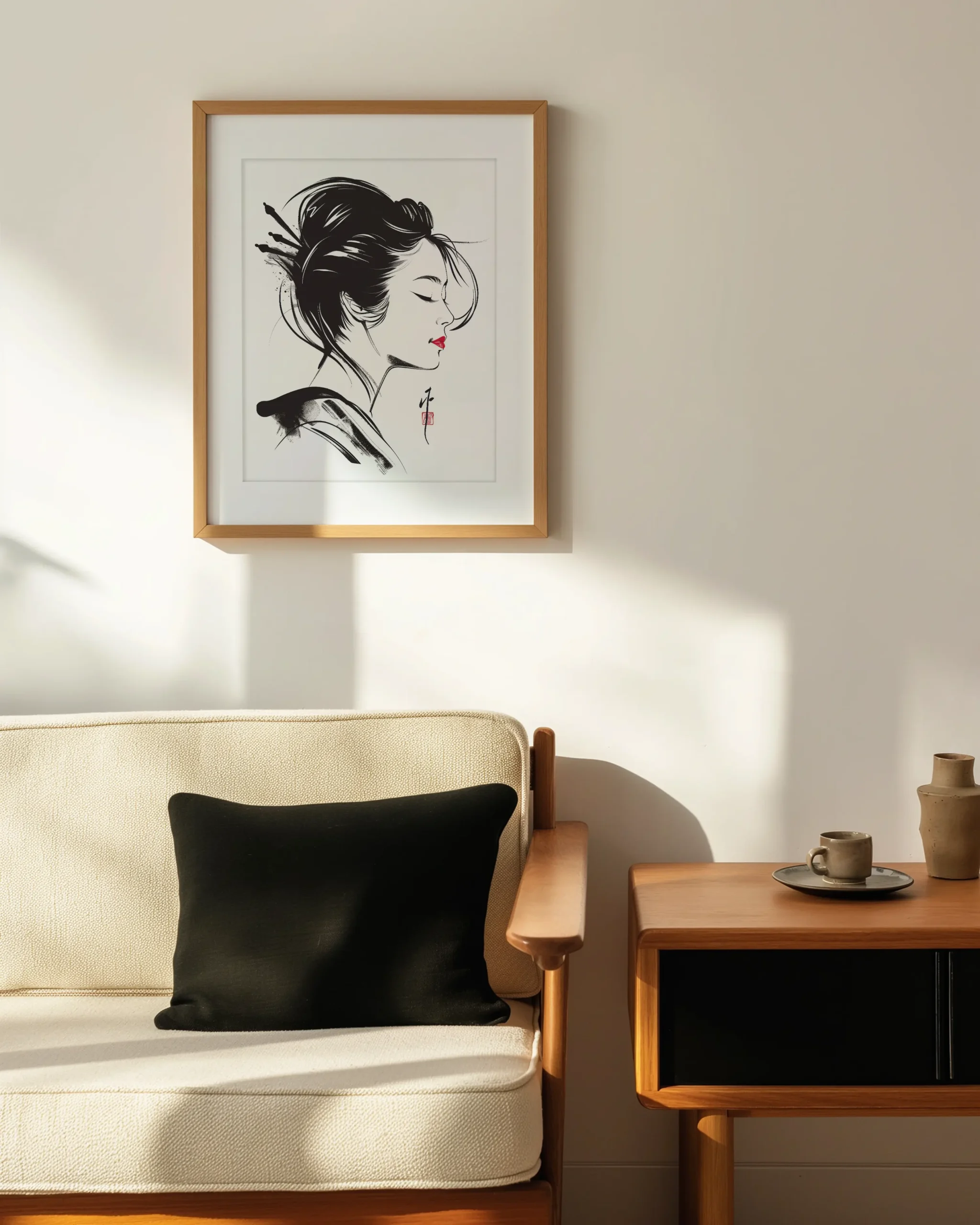 A serene geisha in side profile rendered with expressive sumi-e brushwork and a single red accent—quiet elegance for Japandi and modern minimal interiors—printed on museum-quality enhanced matte paper. Framed and ready to hang with your preferred frame (Black, White, or Red Oak).