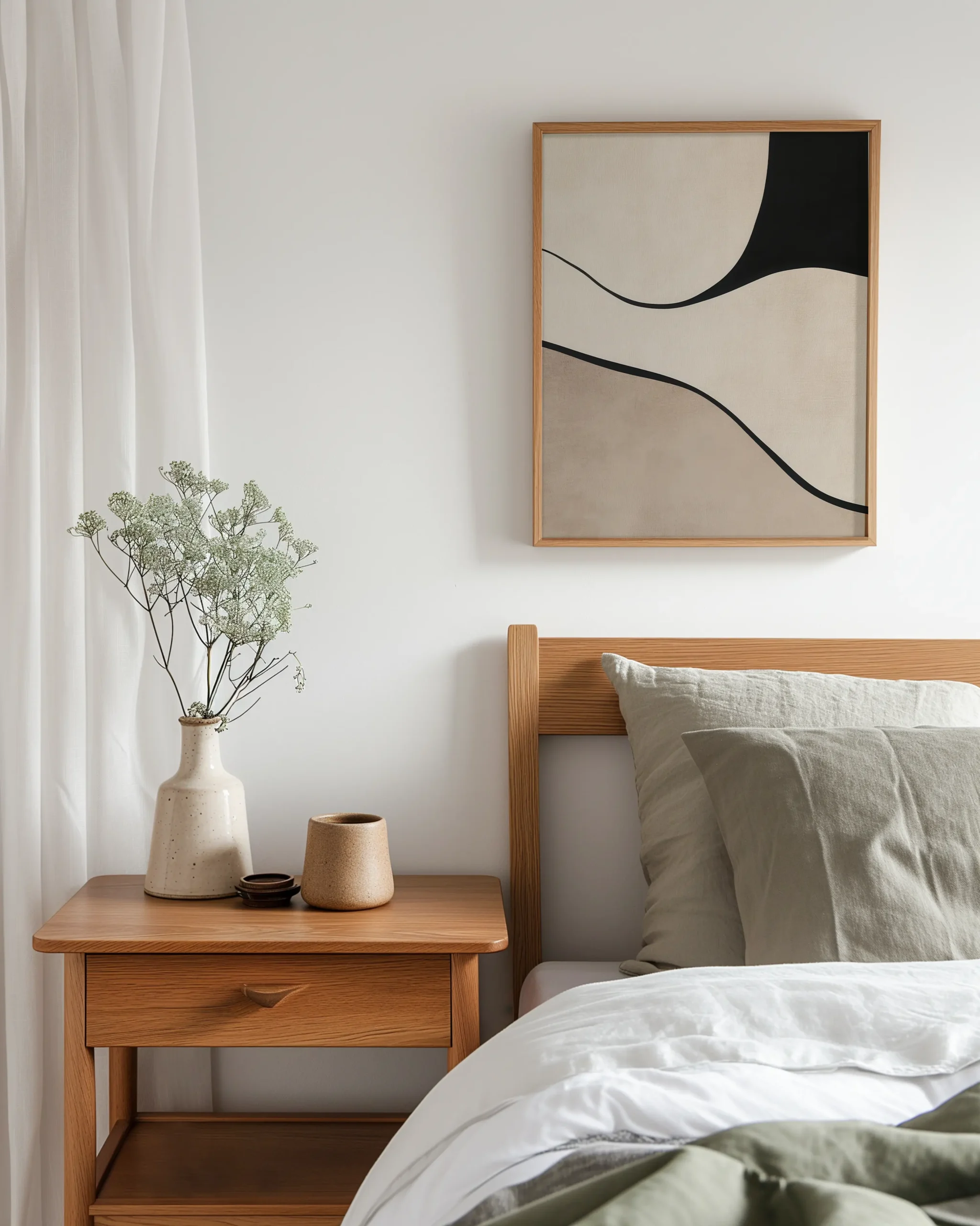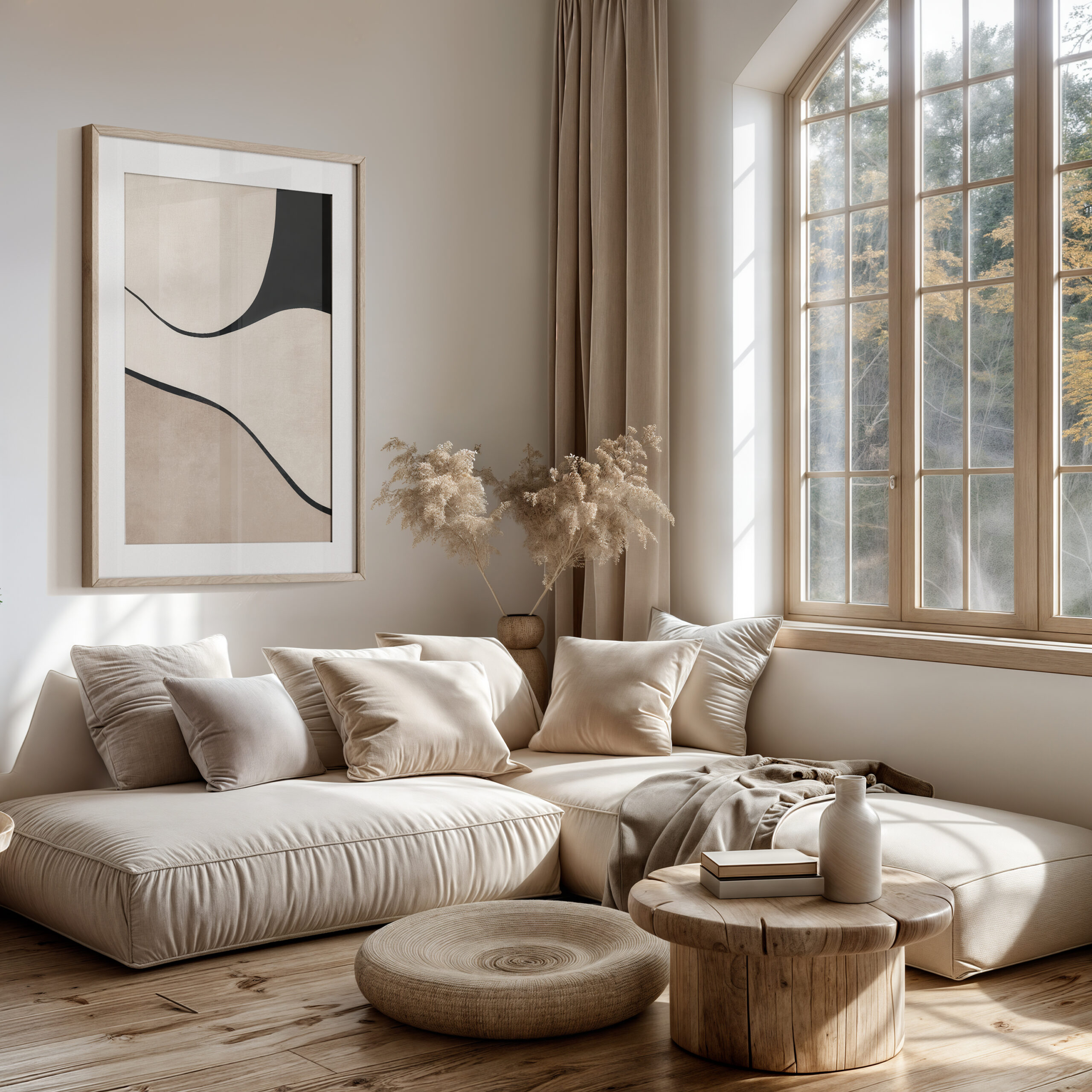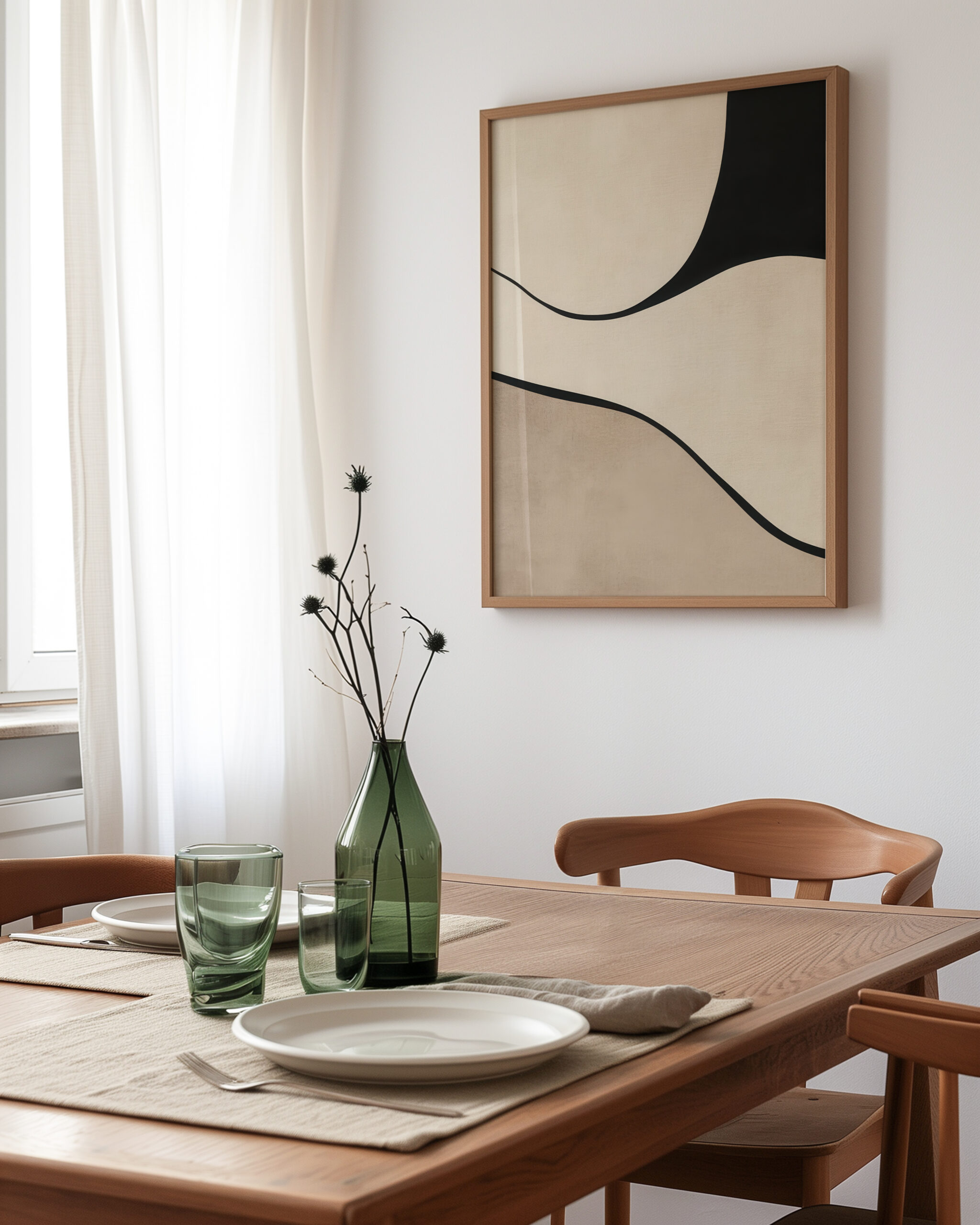 Softly layered shapes in ivory, taupe, and sand sweep beneath a matte black arc, creating a balanced geometric study. Clean lines and generous negative space deliver a refined Japandi calm that complements wood, linen, and stone.