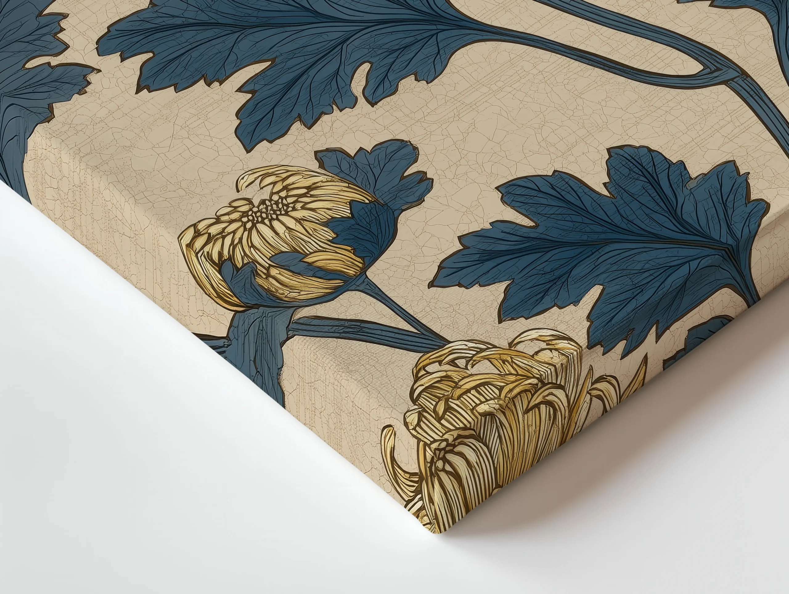 A statement chrysanthemum unfolds in warm gold tones, balanced by rich blue foliage on a softly aged paper texture—an elegant nod to Japanese botanical illustration.