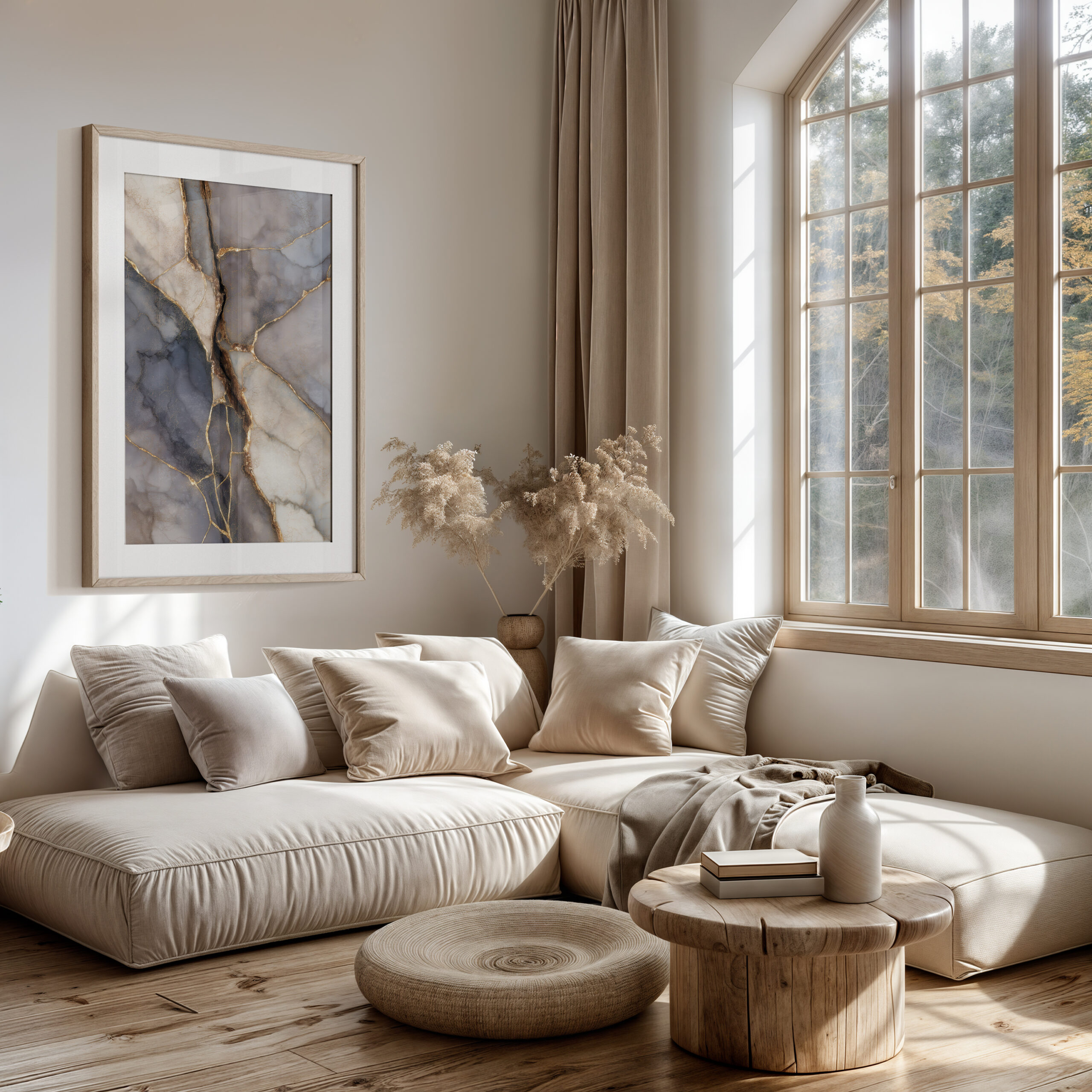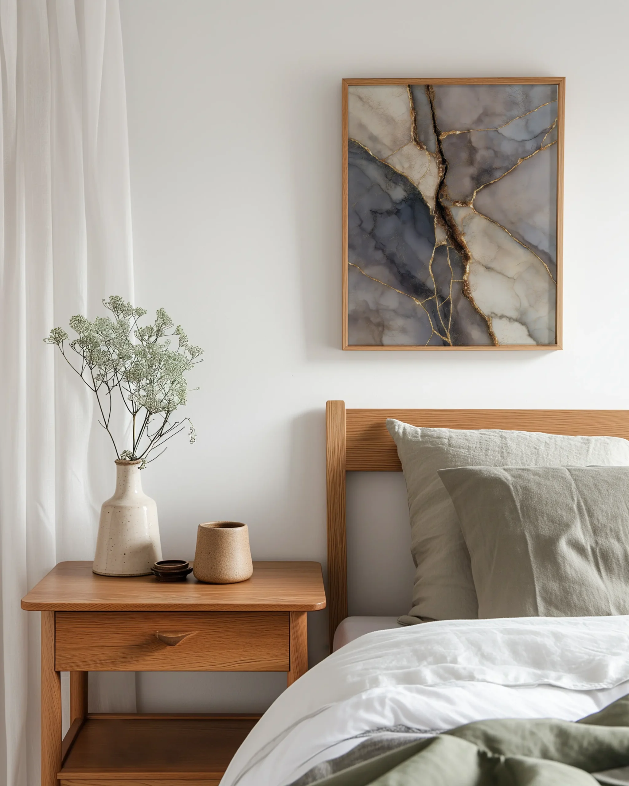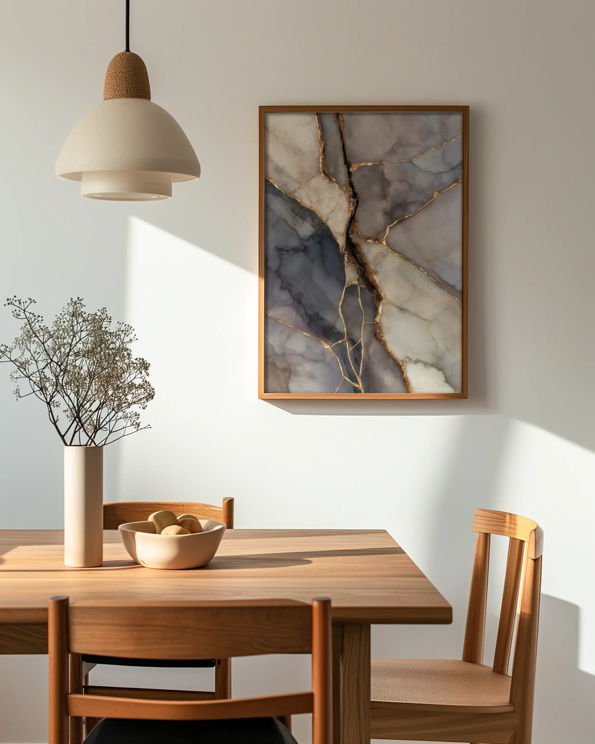 A mineral palette of slate, blue-grey, taupe, and pearl is threaded with luminous golden seams, echoing Japanese Kintsugi and the beauty of repair. The soft, glassy textures and refined contrast bring quiet luxury to Japandi interiors.
