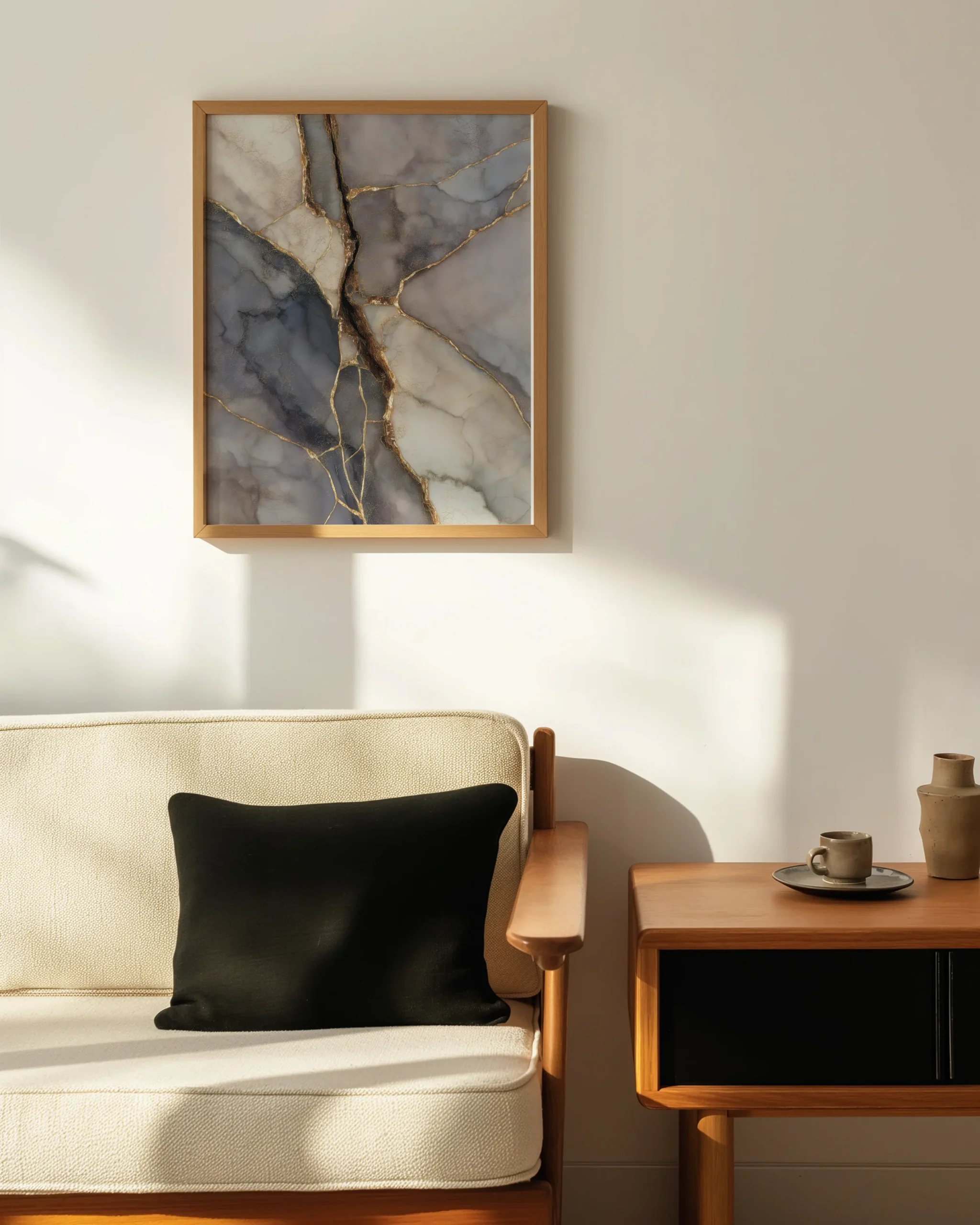 Golden Kintsugi textures flow with radiant gold veins, printed on museum-quality enhanced matte paper. Framed and ready to hang with your preferred frame (Black, White, or Red Oak).