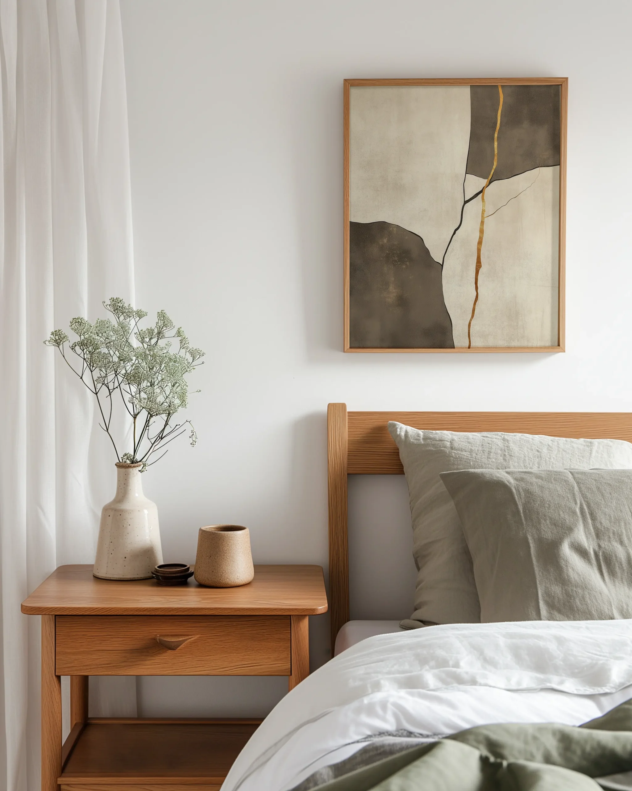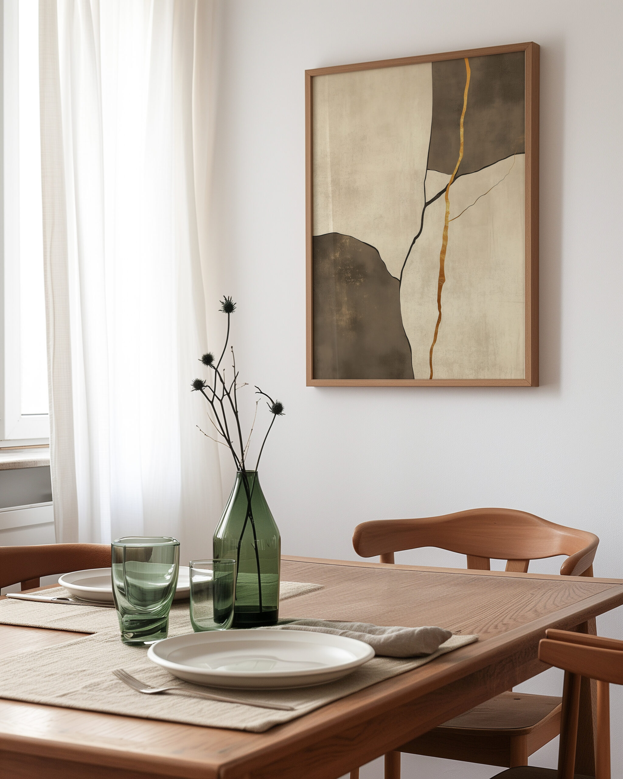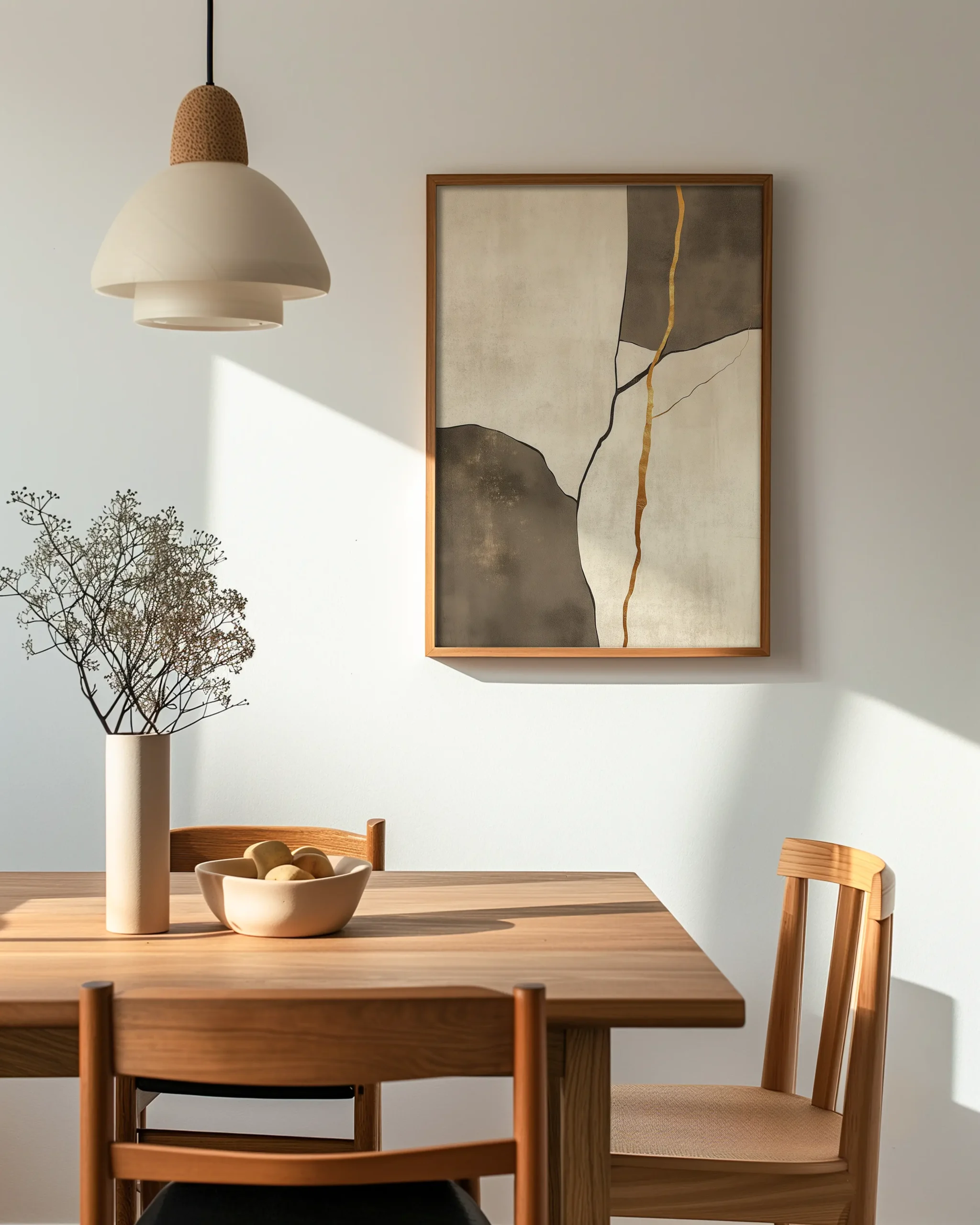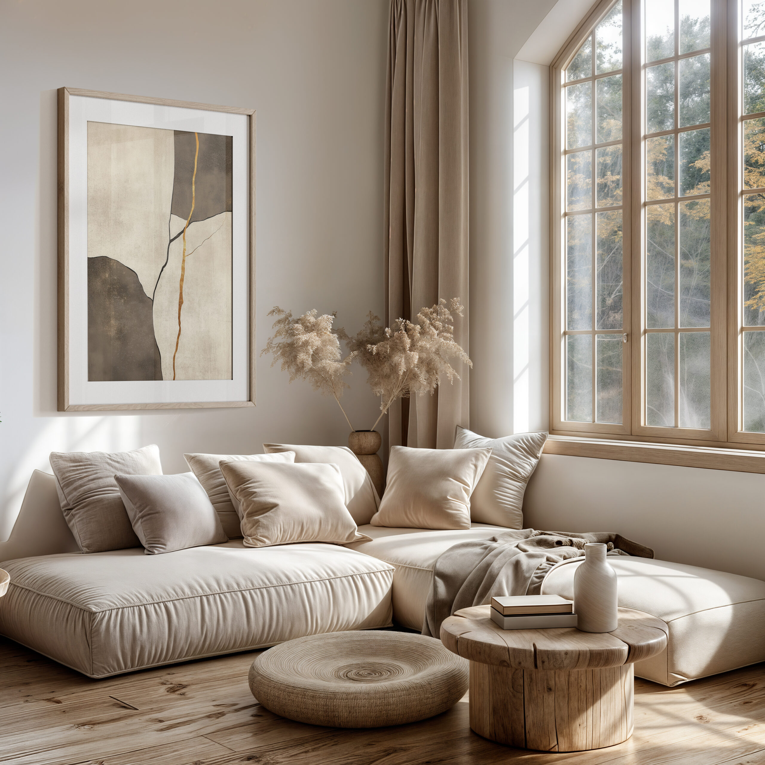 Stone-soft fields of ivory and taupe are gently divided by a vertical, gold-toned seam—an elegant nod to Japanese Kintsugi and the beauty of repair. Subtle texture and generous negative space bring a refined Japandi calm to modern interiors.