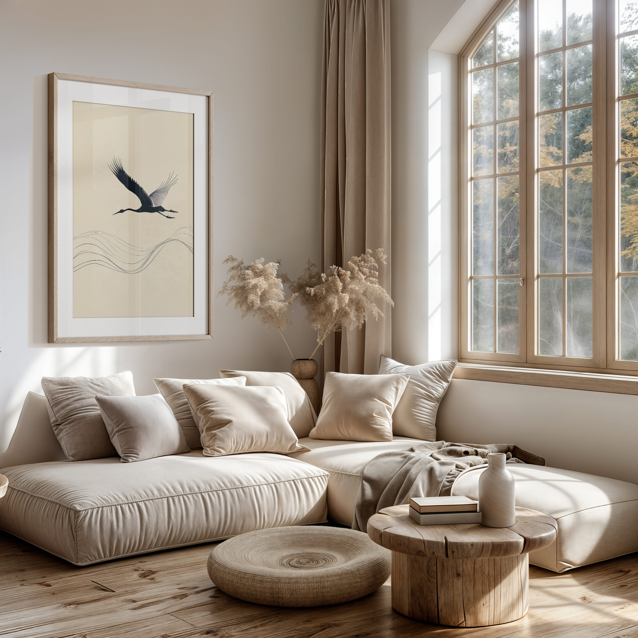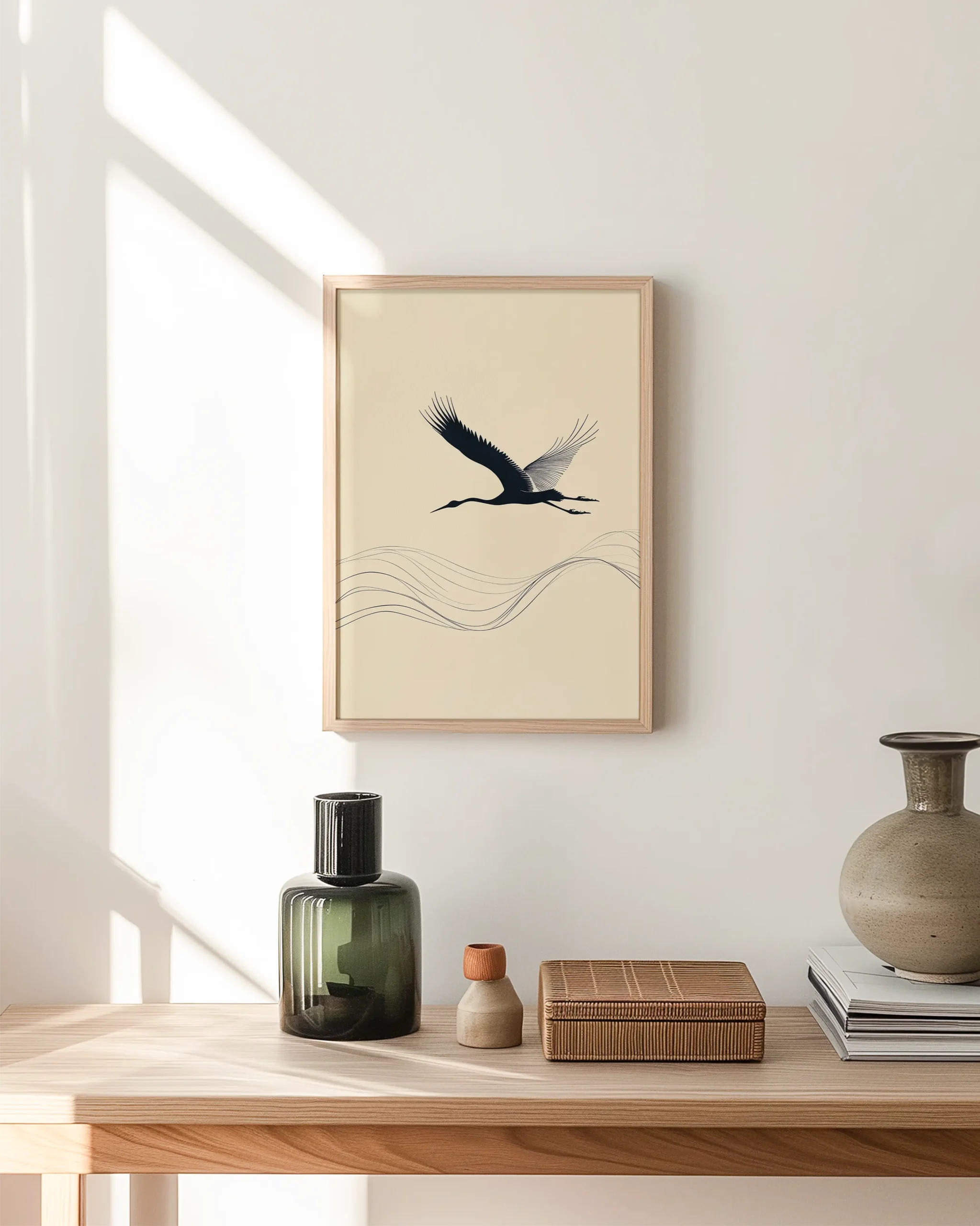 A minimalist crane in graceful flight above flowing linework on a warm cream backdrop — a serene Japandi accent, printed on museum-quality enhanced matte paper. Framed and ready to hang with your preferred frame (Black, White, or Red Oak).