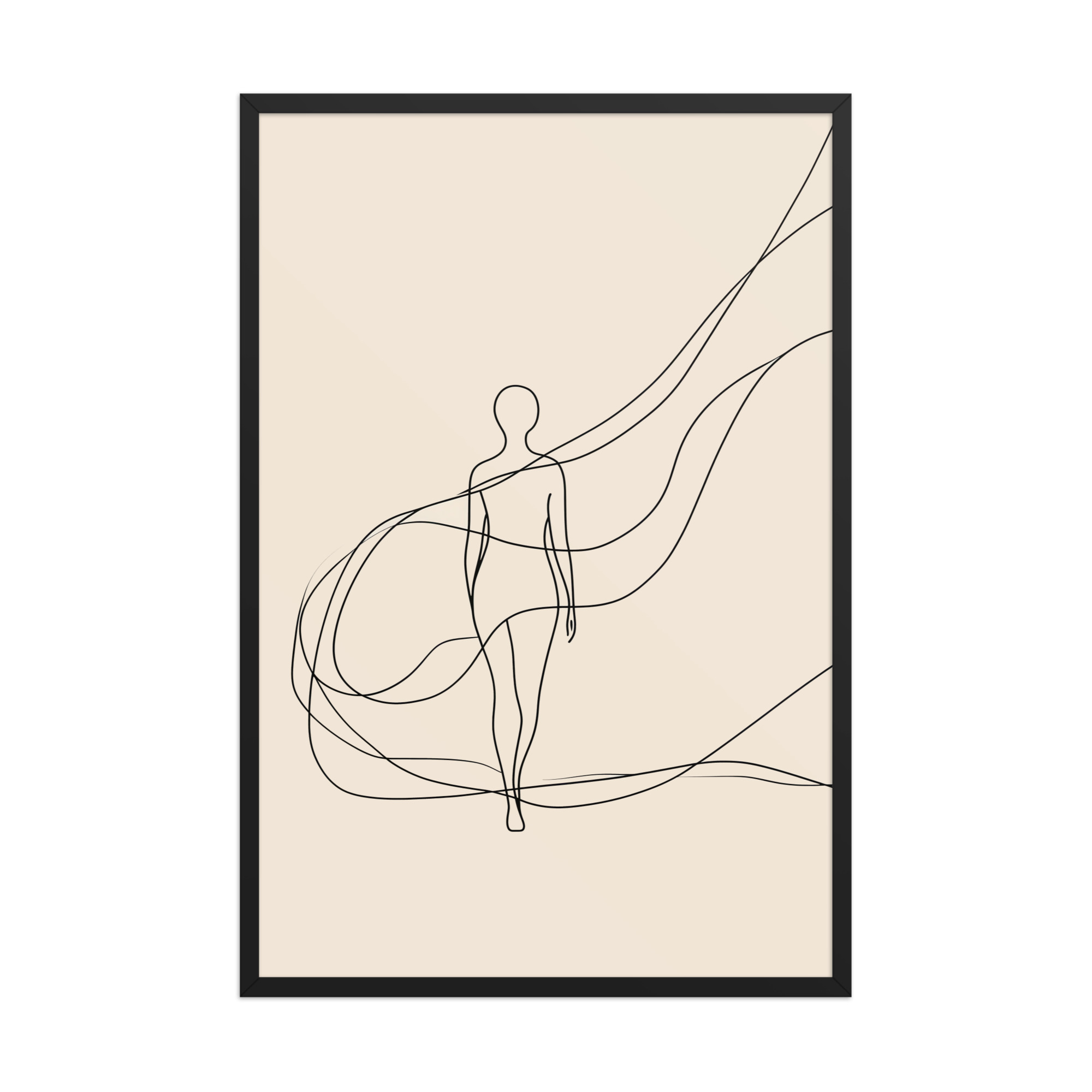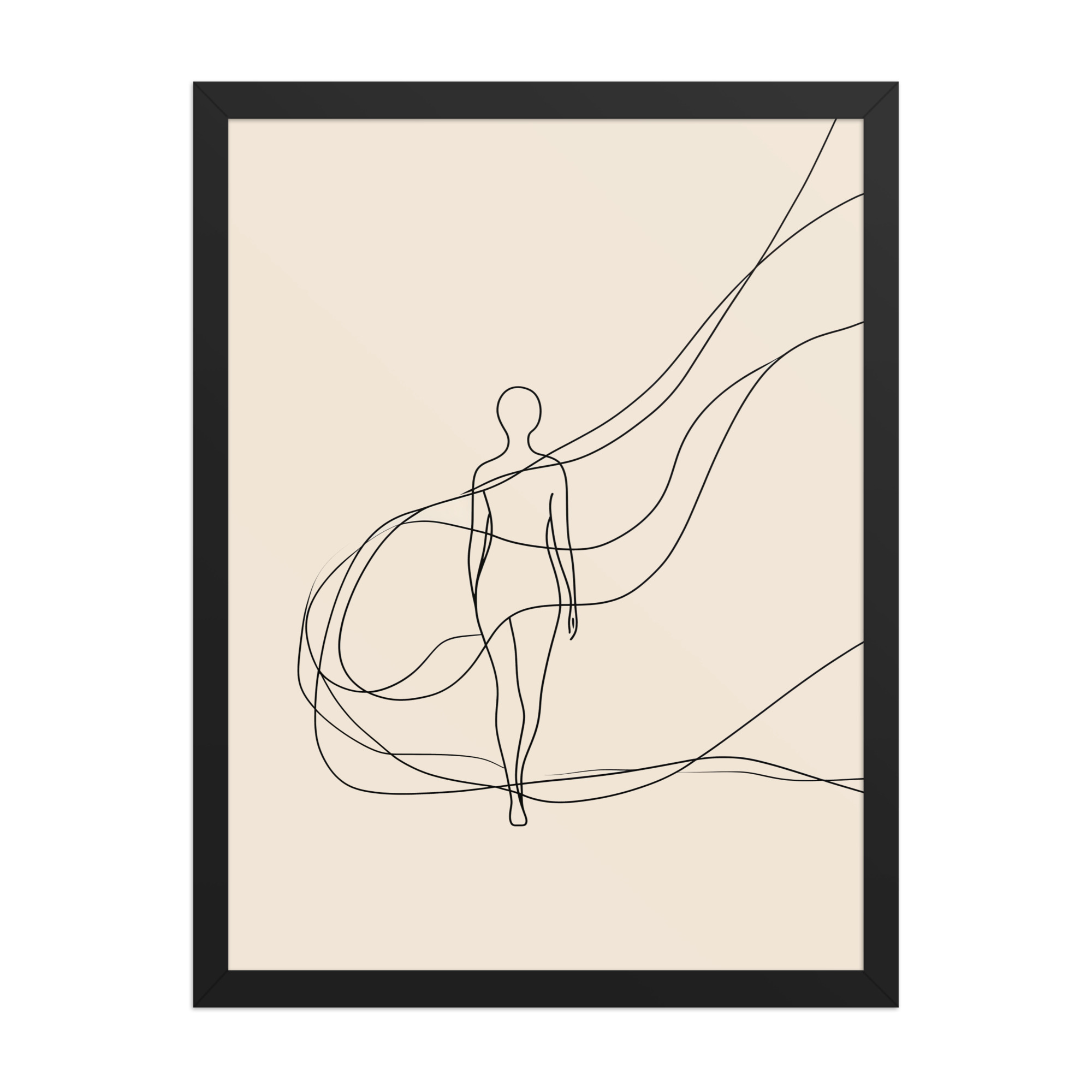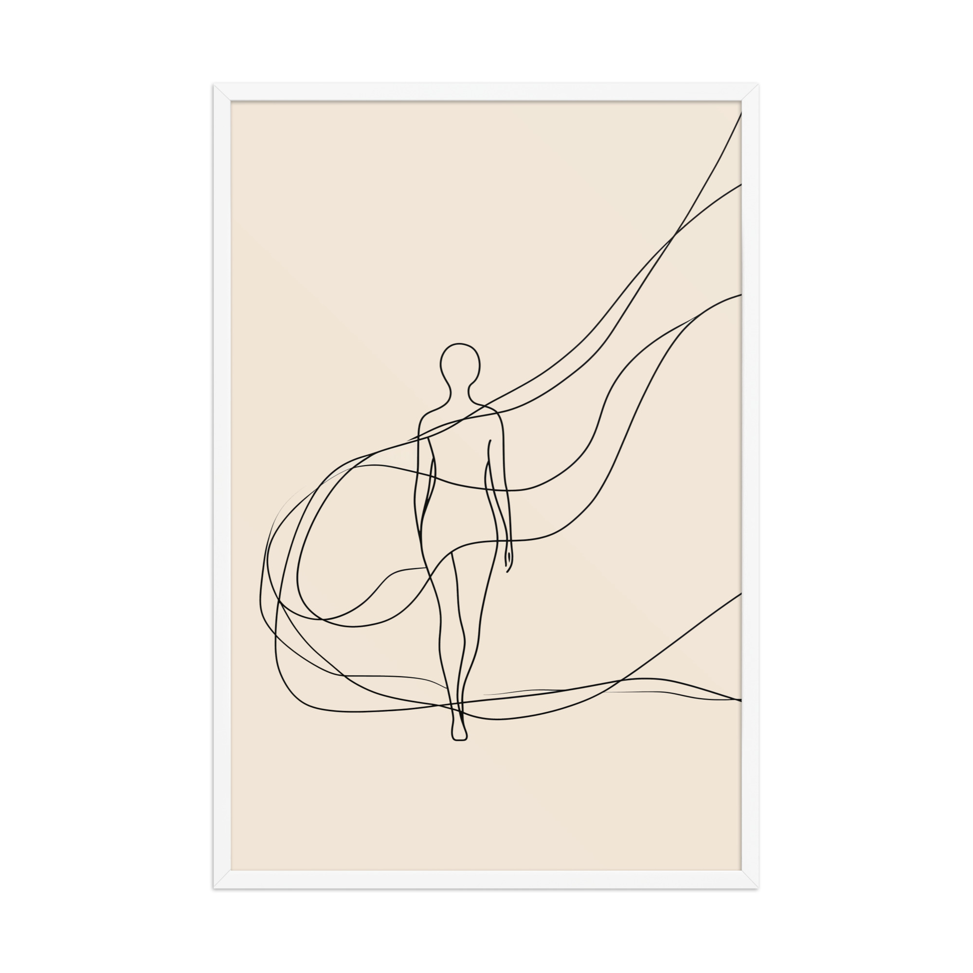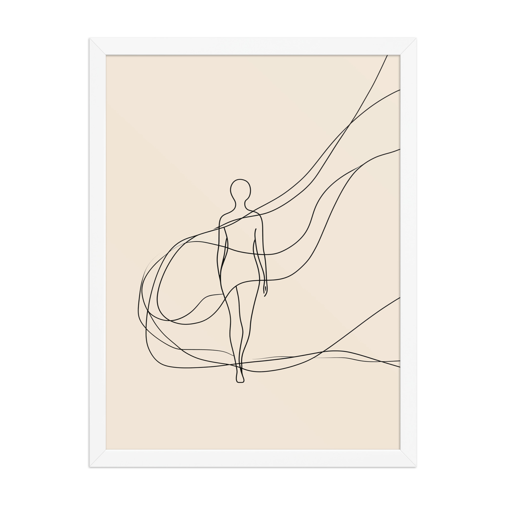 An unbroken line sketches a poised, walking figure as soft ribbons trace its movement. Minimal detail and generous negative space create a calm, modern presence.
