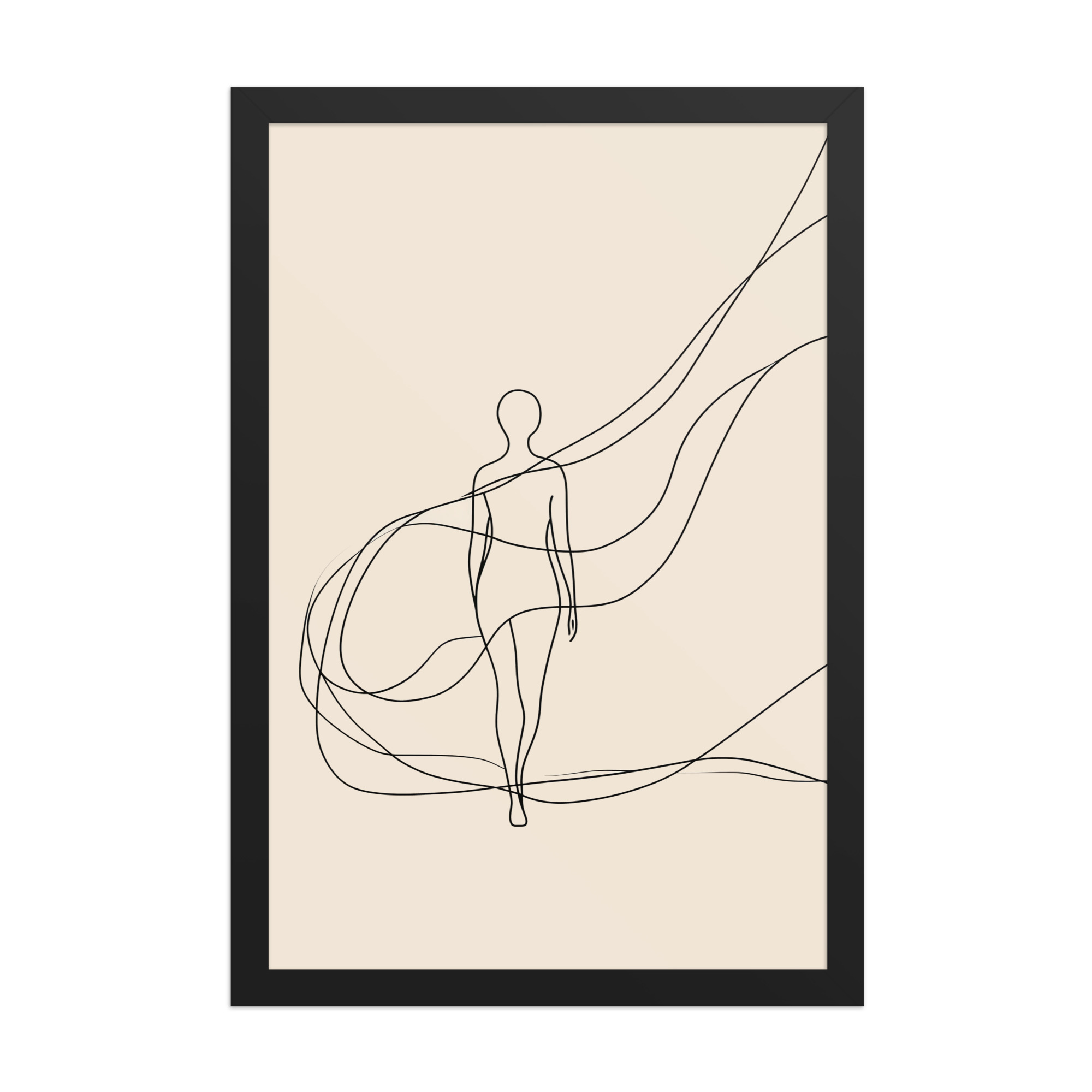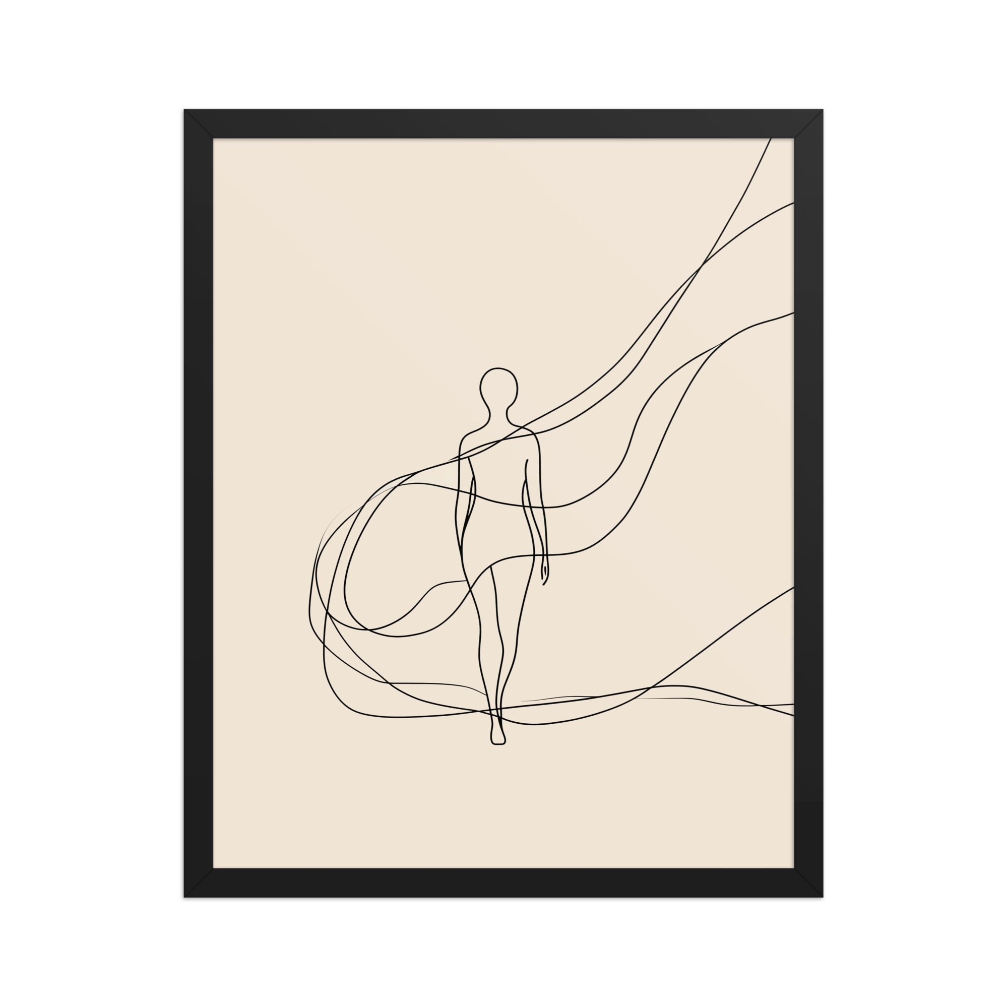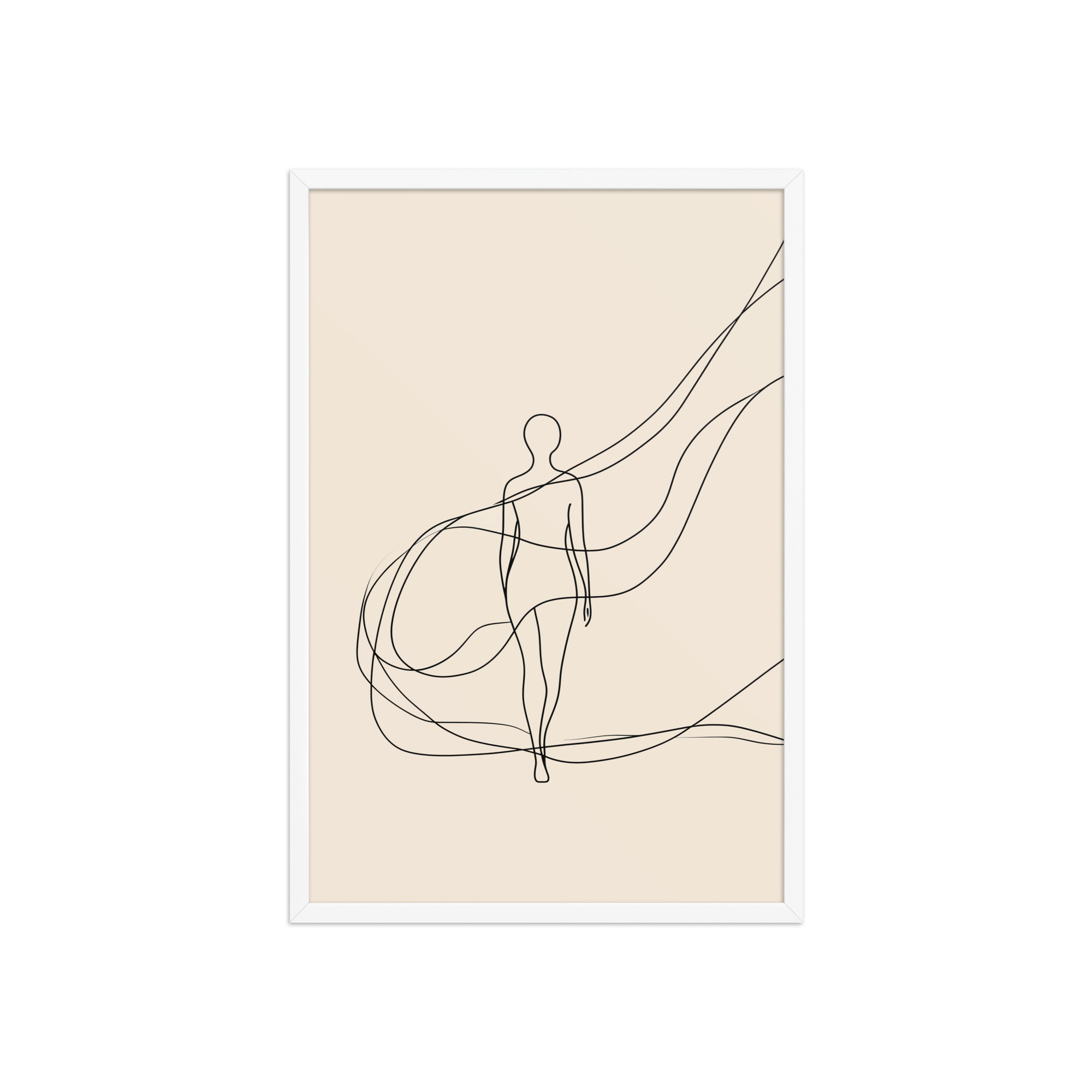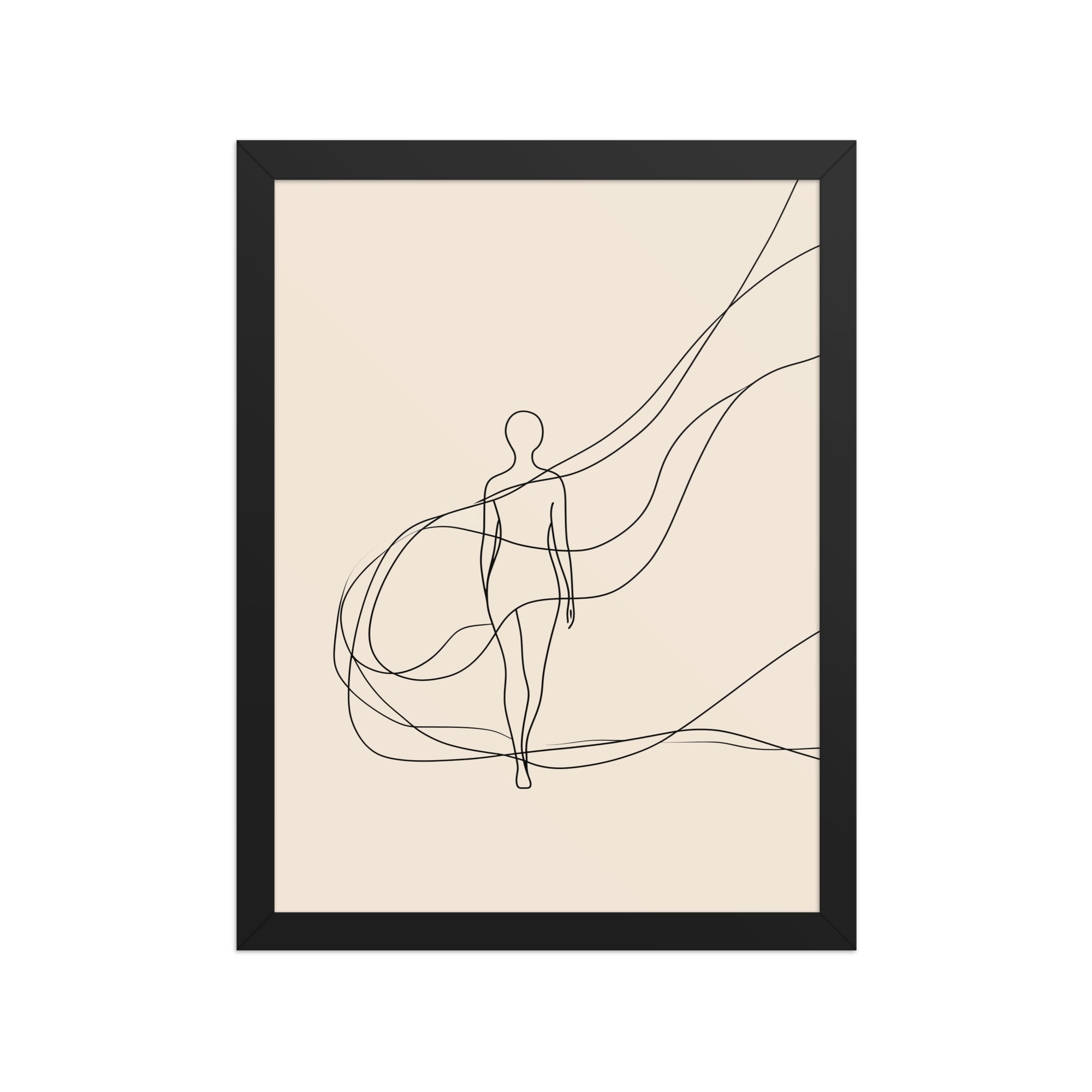 An unbroken line sketches a poised, walking figure as soft ribbons trace its movement. Minimal detail and generous negative space create a calm, modern presence.