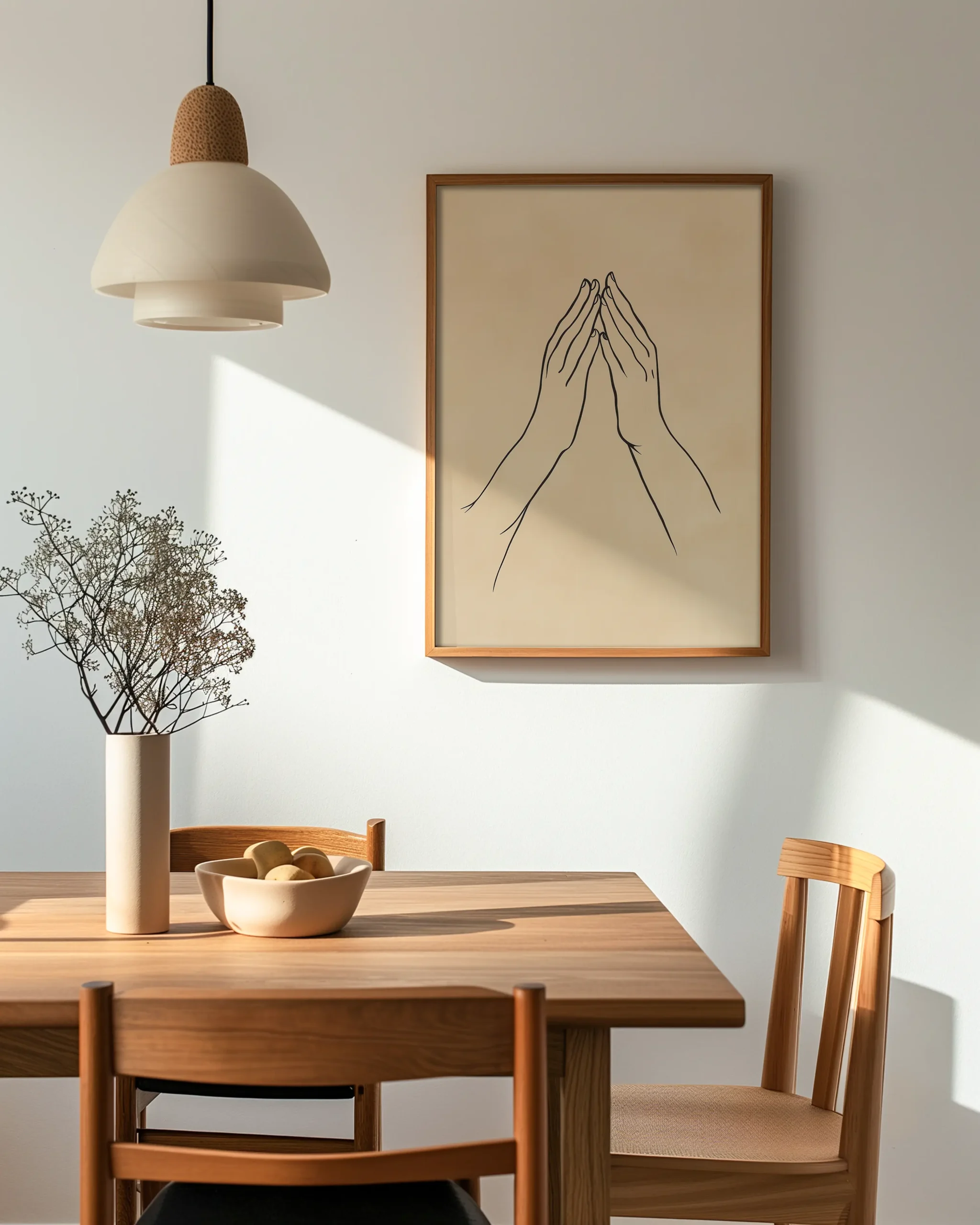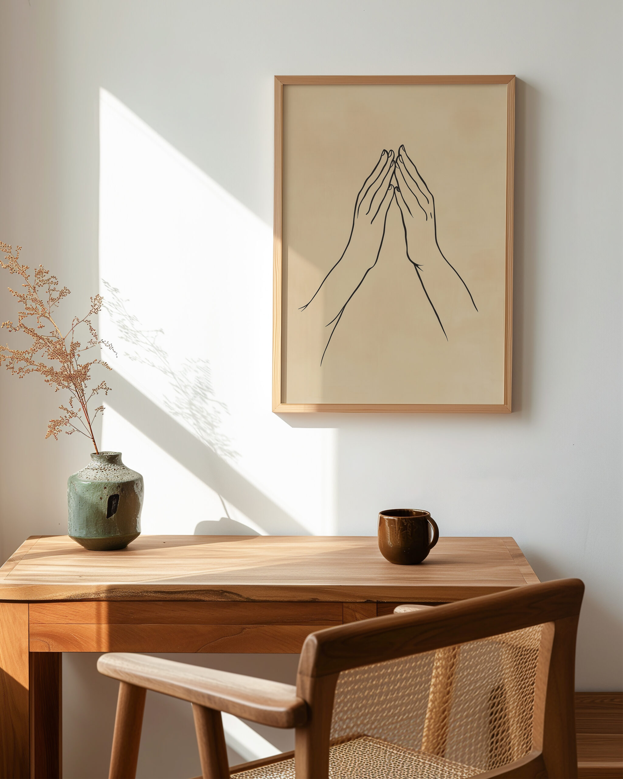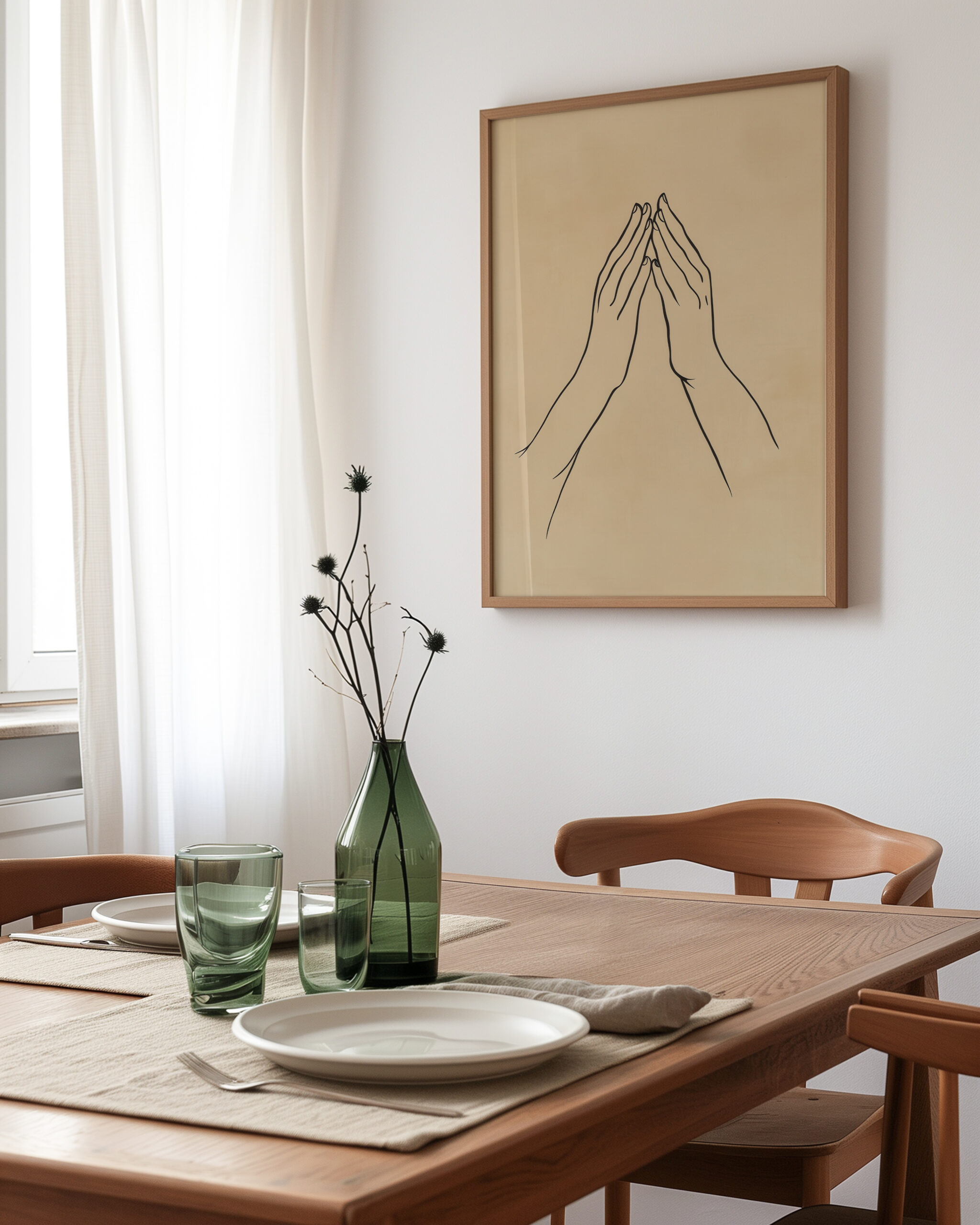 Two hands meet in the gyan mudra, drawn with elegant minimal lines on a soft neutral backdrop. The gesture symbolizes clarity and inner calm, bringing a meditative presence to your space.