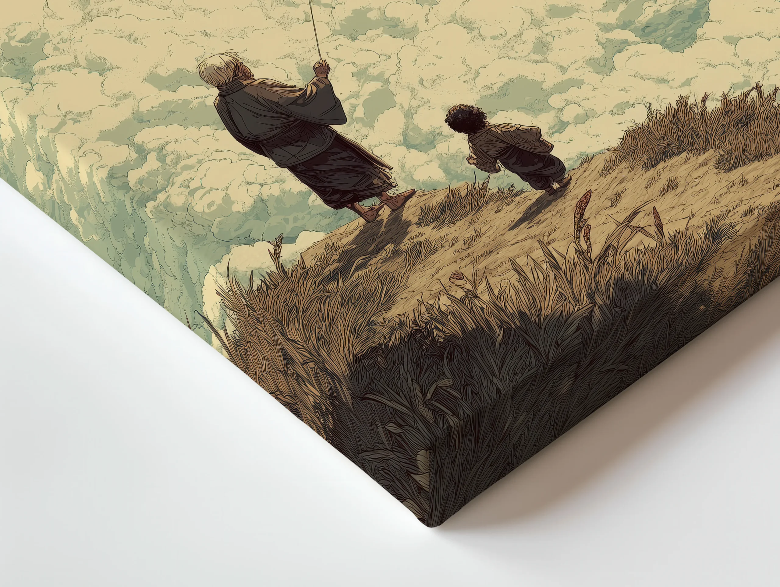 In “High Above the Clouds Ukiyo-e,” an elder and a child stand at the cliff’s edge, guiding a kite into an endless sky of rolling clouds. The quiet landscape captures a moment of calm wonder and shared journey.