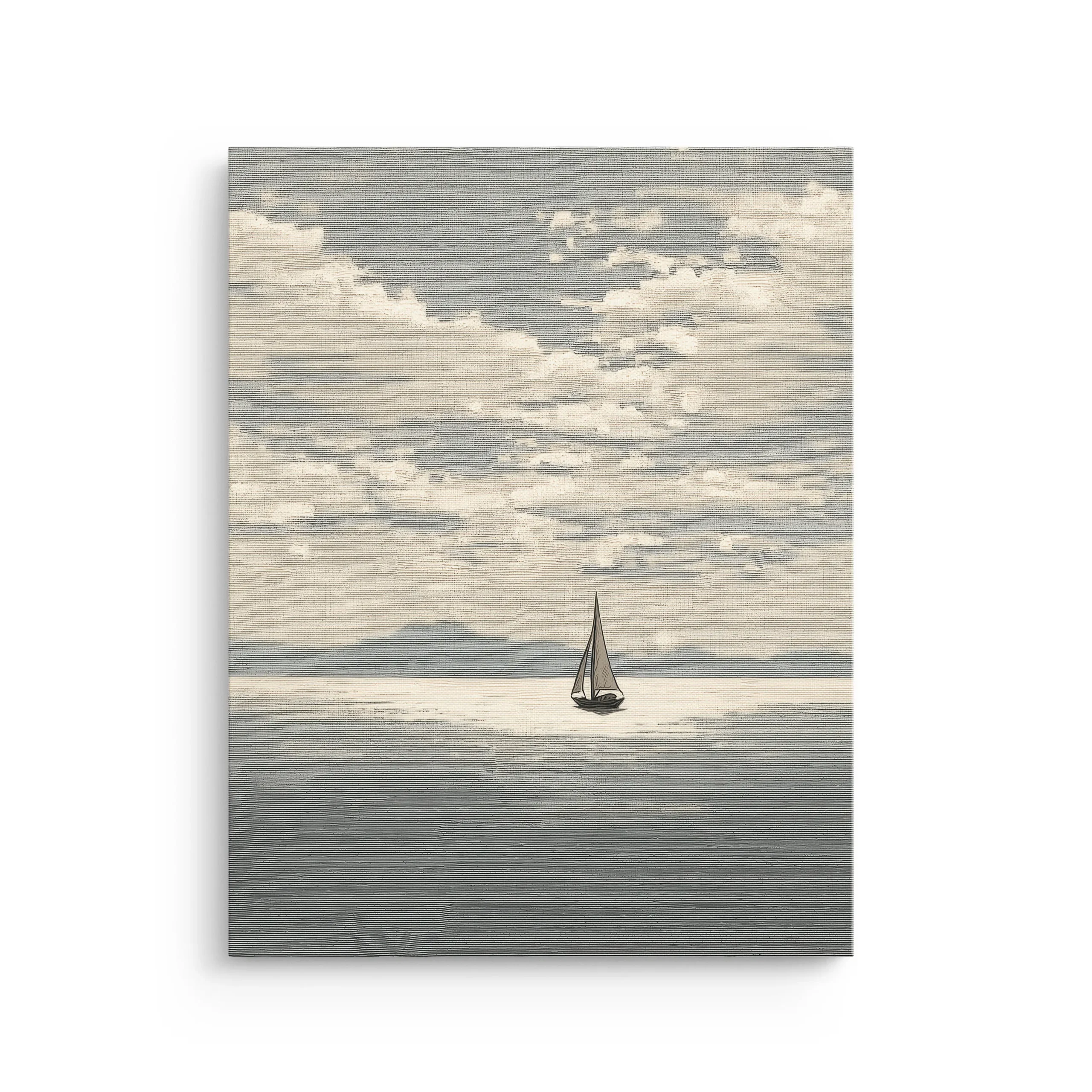 Sailboat Calm captures a quiet horizon and drifting clouds, with a single sailboat centered in a wide field of still water for a clean, meditative coastal look.