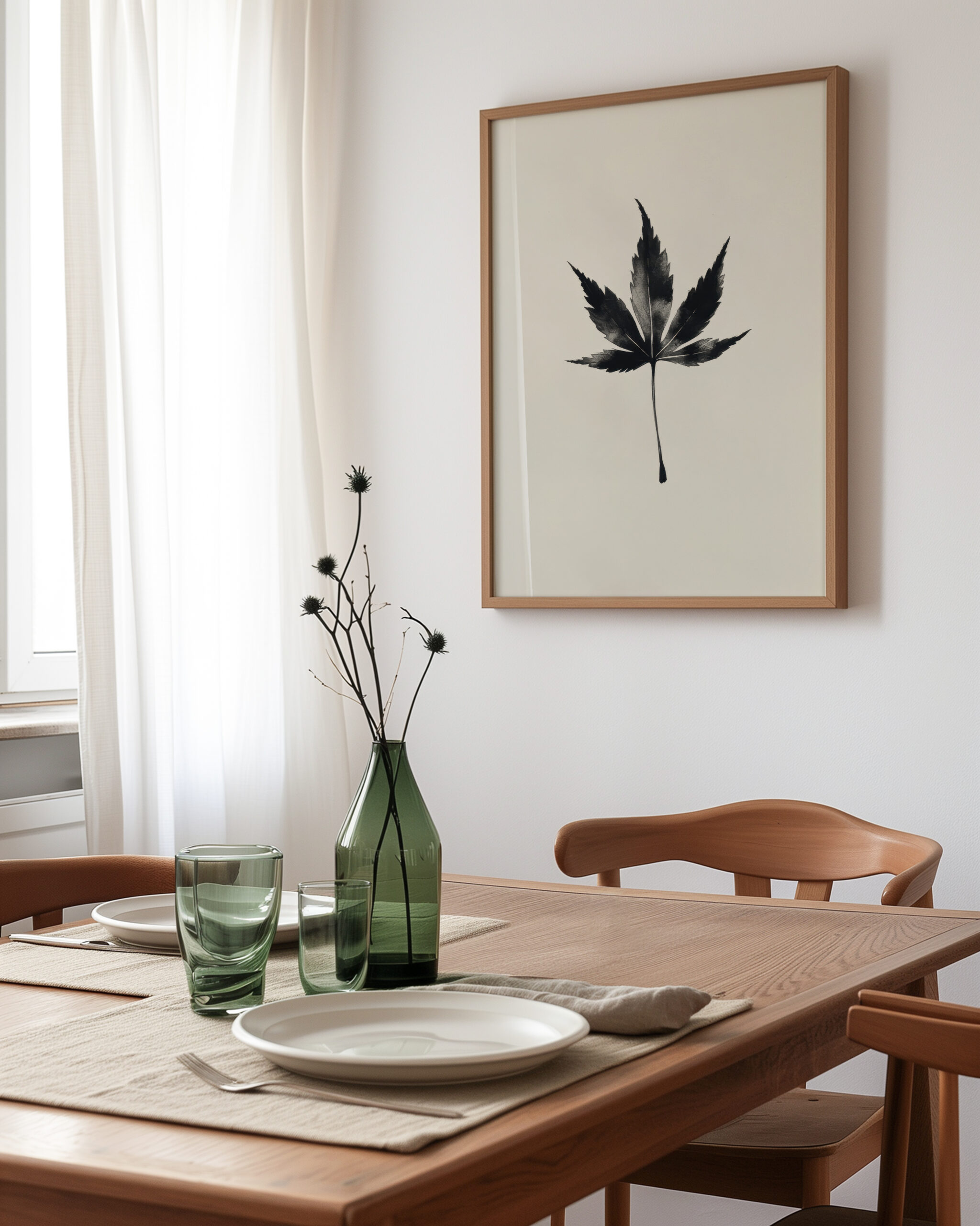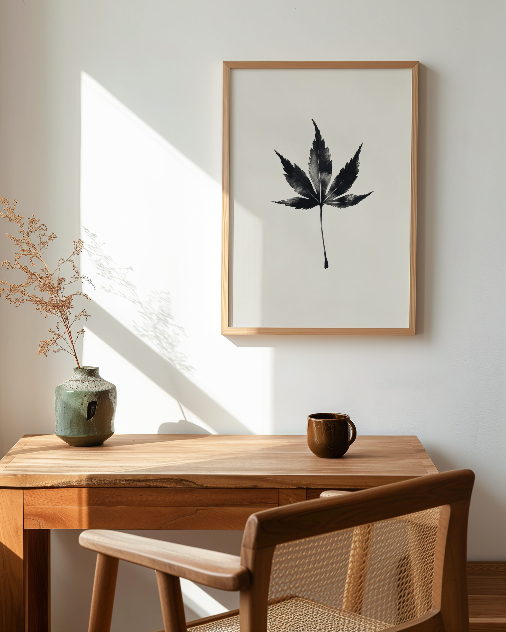 Sumi-e Ink Maple distills a minimalist single Sumi-e maple leaf into pure shape and shadow. The soft wash and crisp edges evoke sumi-e brushwork, bringing a quiet, meditative presence that suits minimalist, Japandi, and contemporary interiors.