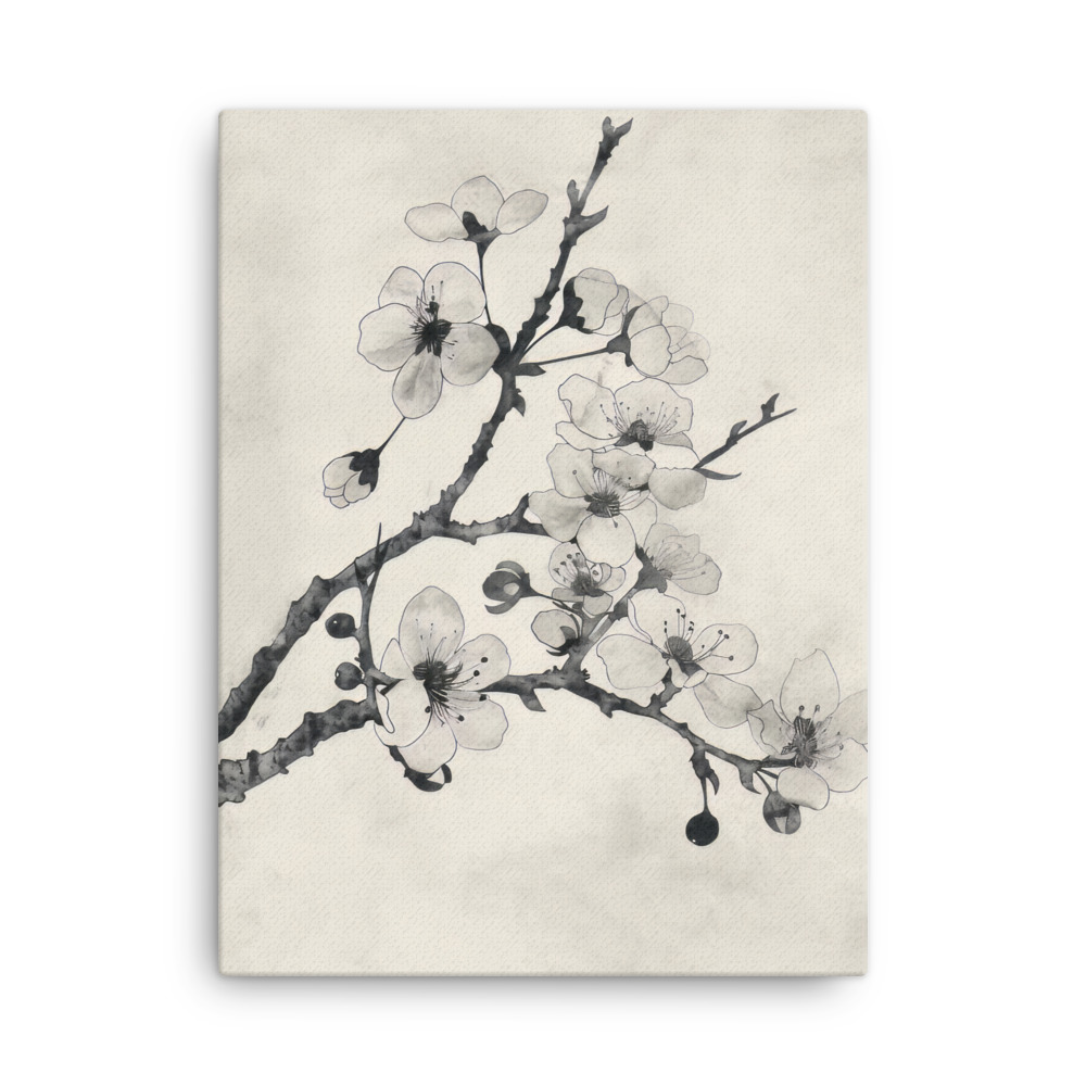 Delicate sumi-e ink blossoms on a minimalist branch bring calm Japandi elegance to your space, printed on a premium thin canvas and ready to hang.