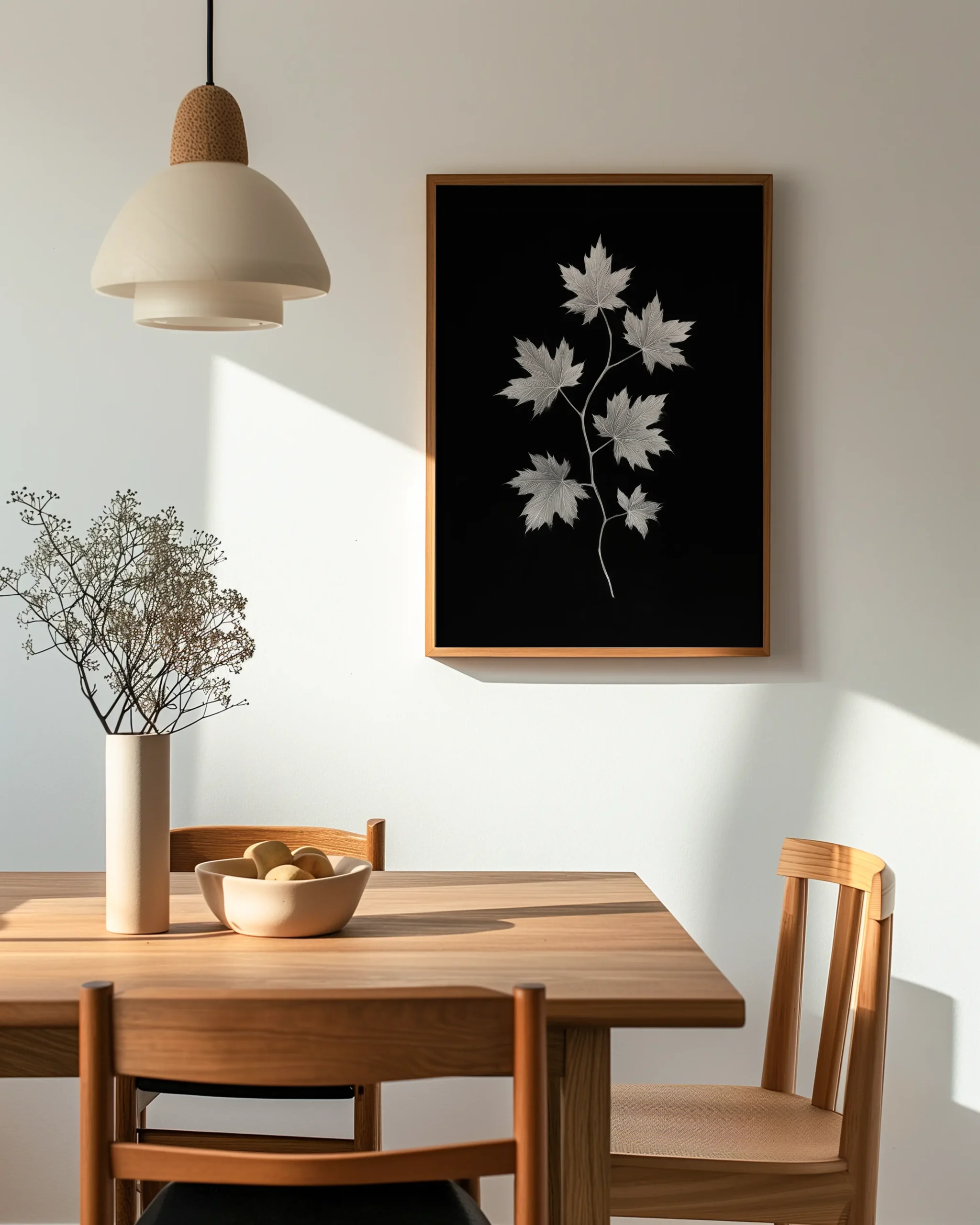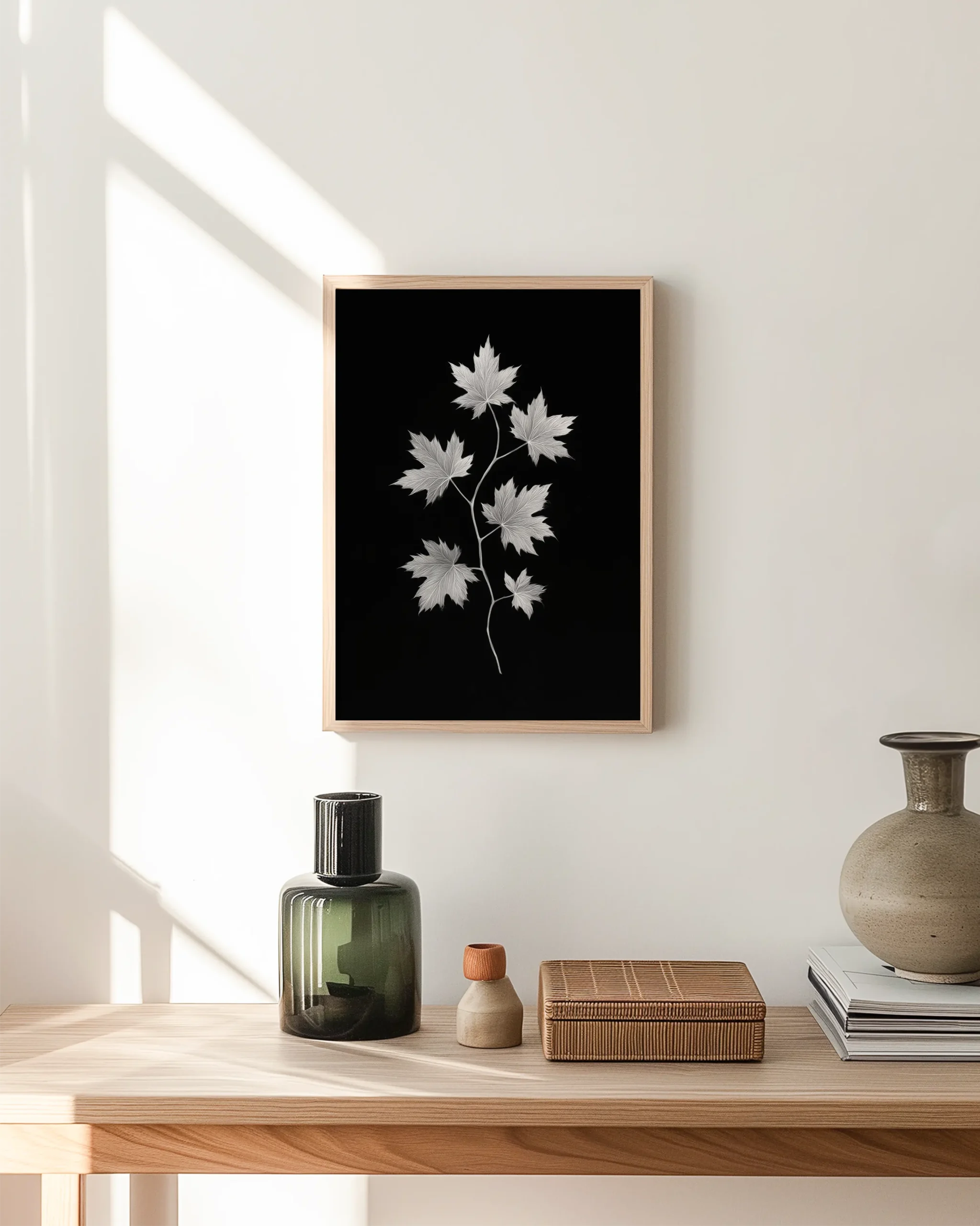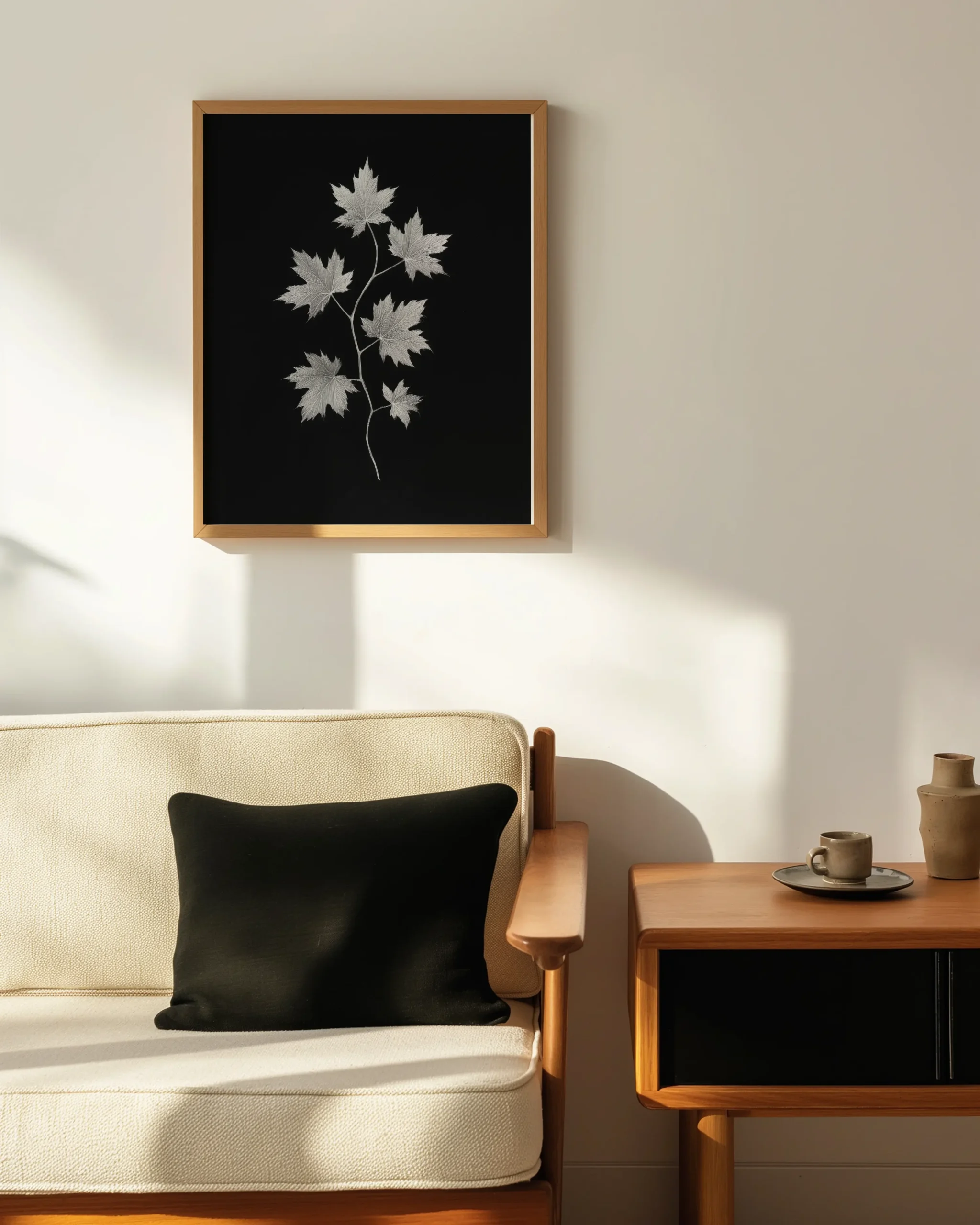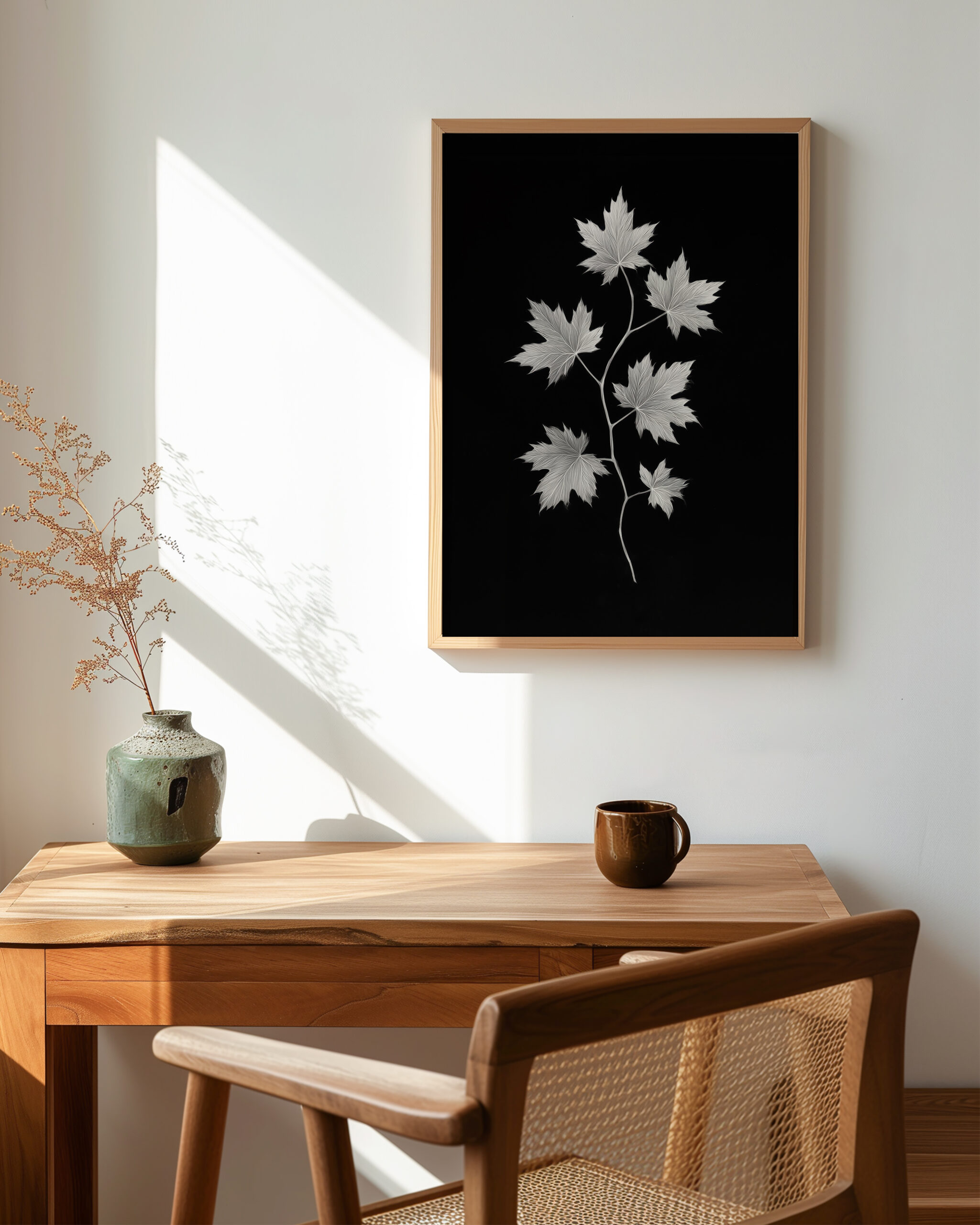 Ivory Veins celebrates the quiet geometry of the Japanese maple. Each leaf is traced in fine lines that bloom like lace against a midnight field, turning natural structure into modern sculpture. The restrained palette and generous negative space bring calm clarity to any room.