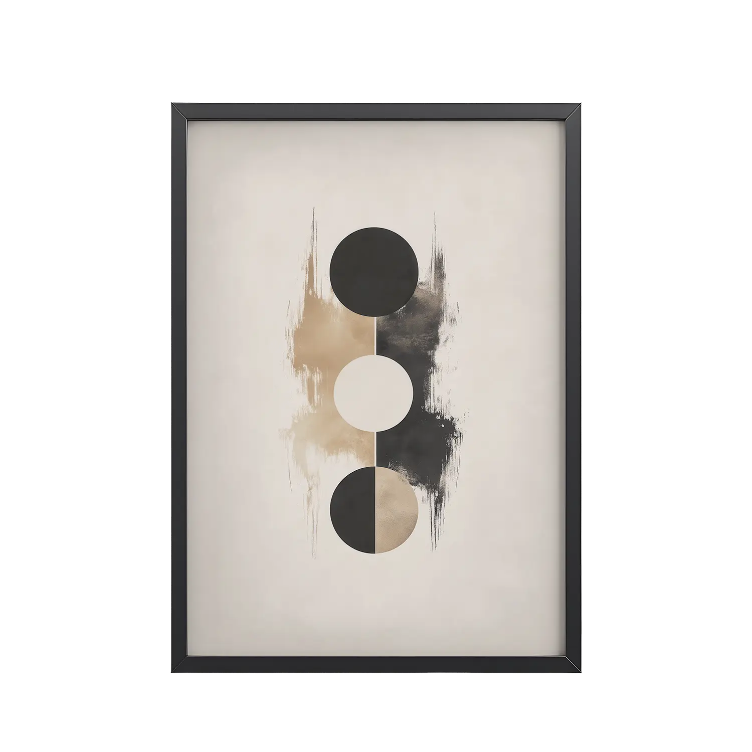 Three aligned circles—charcoal, ivory, and taupe—sit within subtle ink washes, forming a calm, symmetrical composition. The restrained palette and generous negative space deliver a Japandi sensibility that pairs beautifully with wood, linen, and stone.