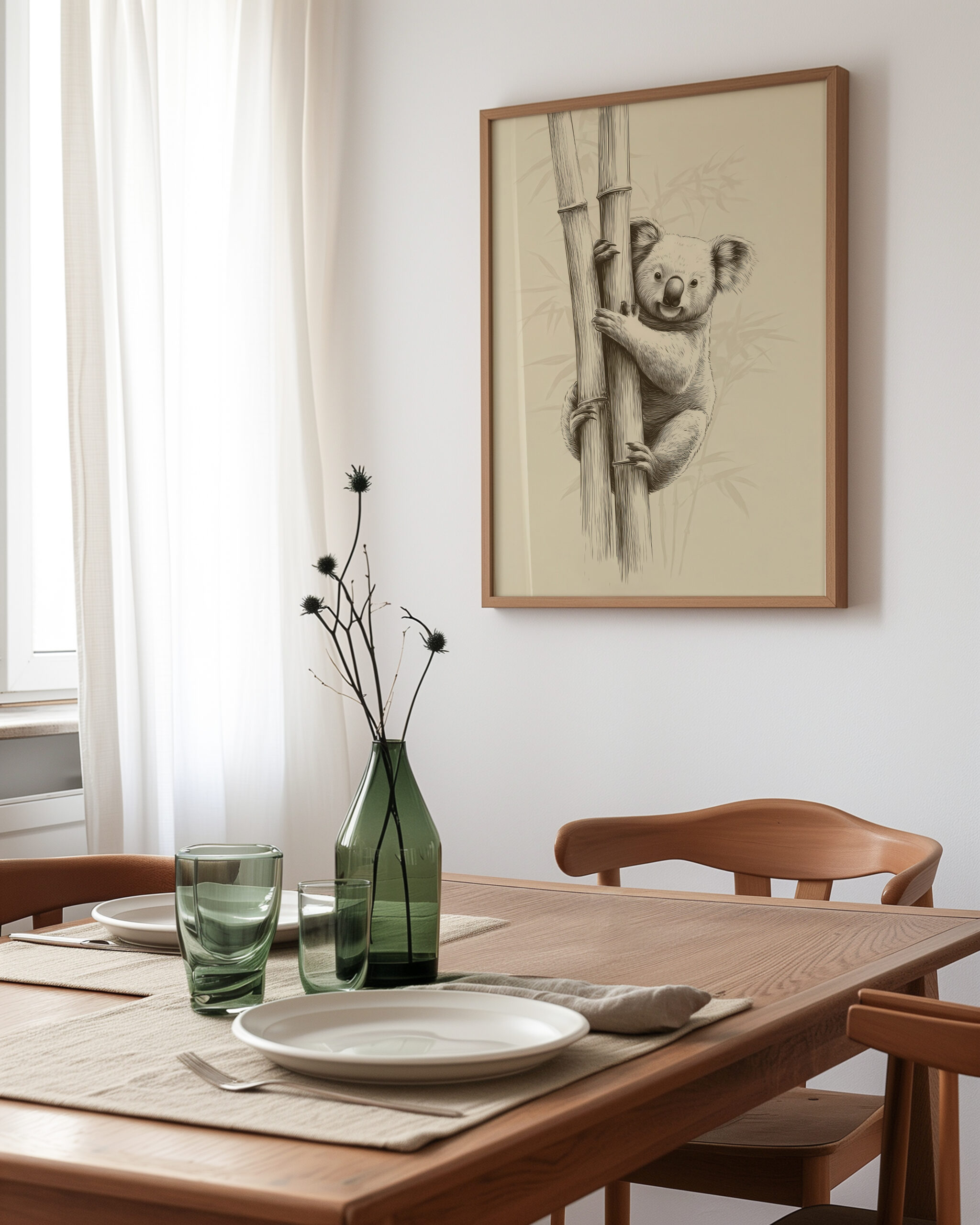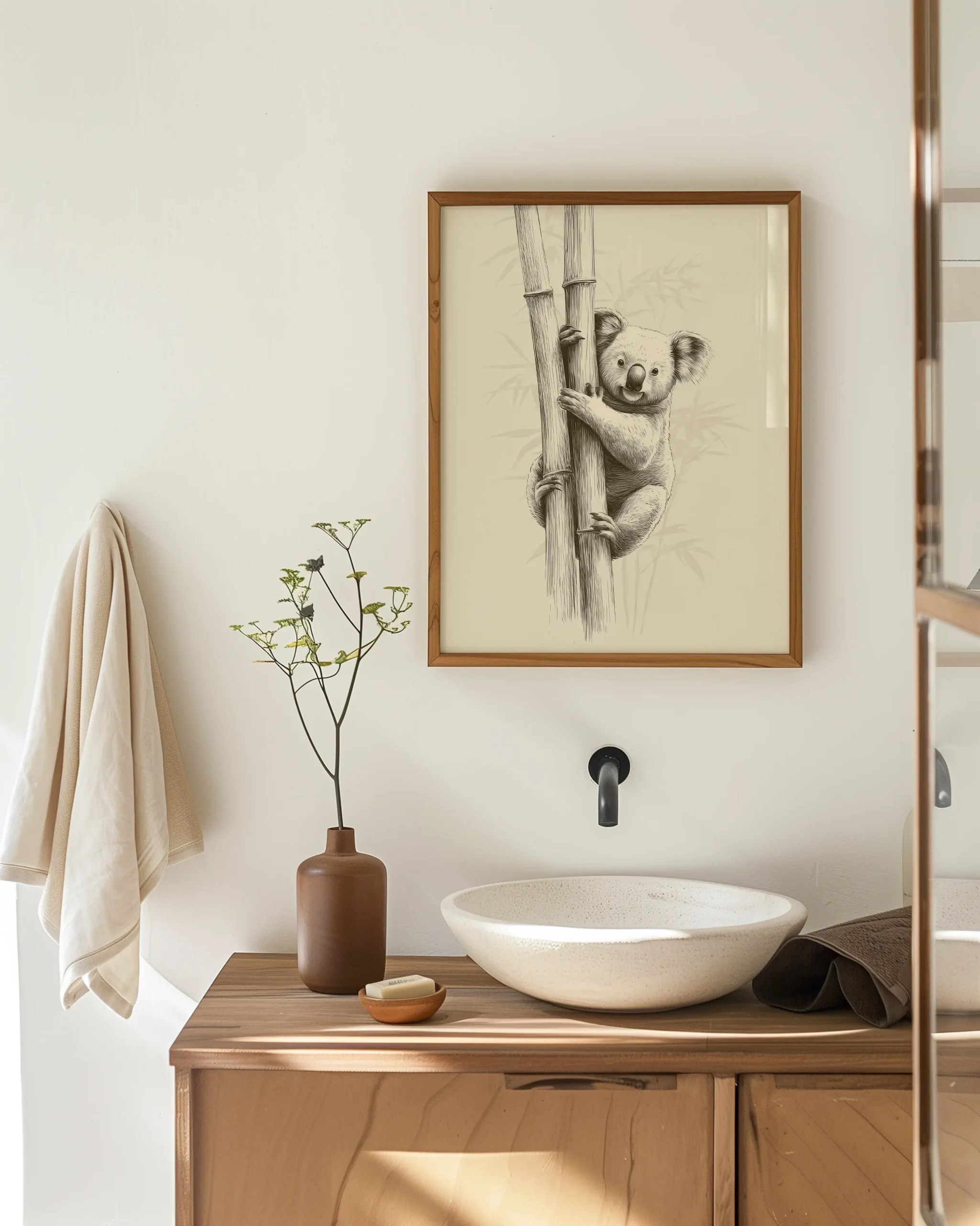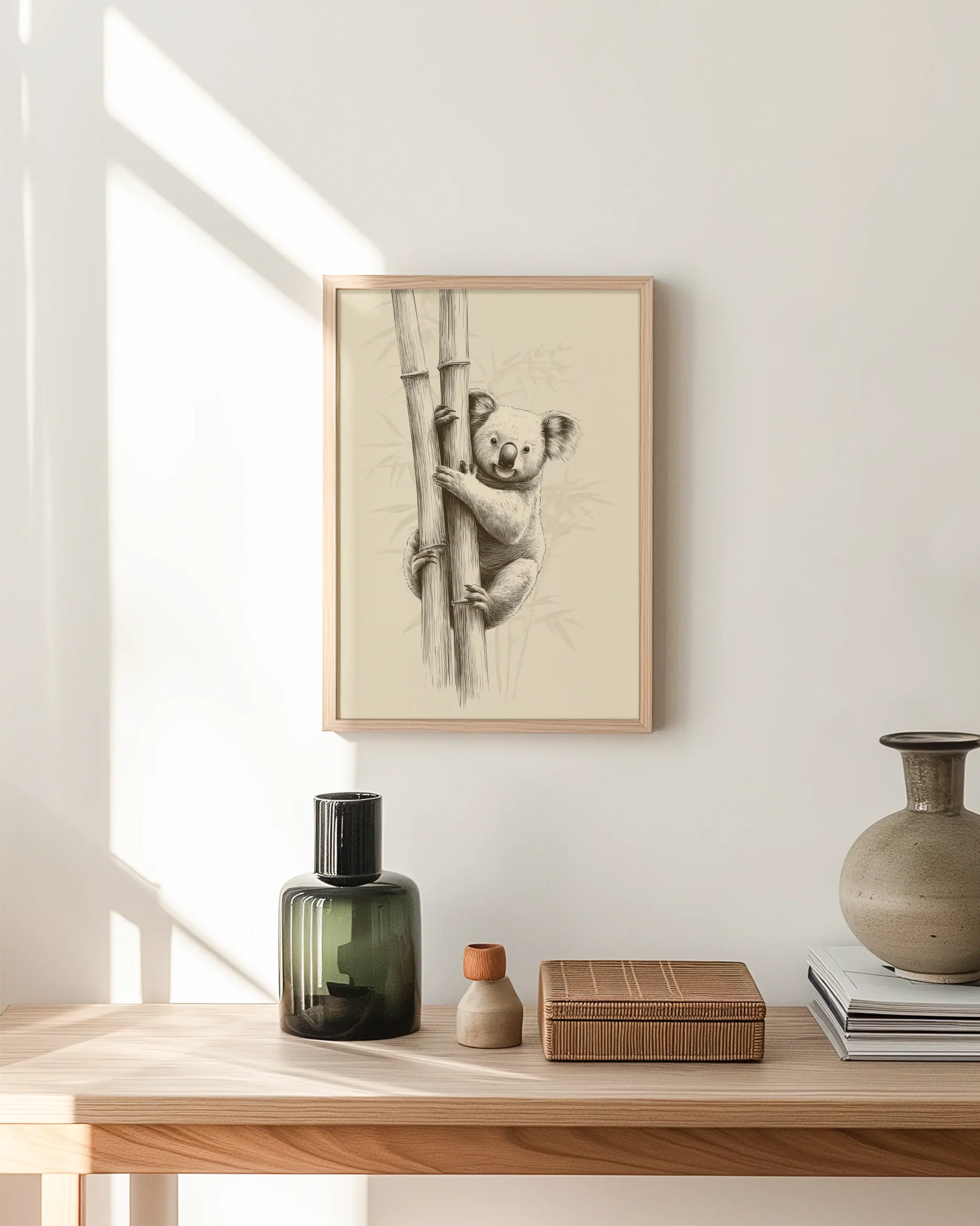 Koala Bamboo I captures a gentle moment in the grove: a curious koala wraps its paws around two bamboo stems, drawn in soft graphite lines over a warm, calming ground. The simplicity, negative space, and quiet expression make it an inviting piece for living rooms, nurseries, and serene reading corners.