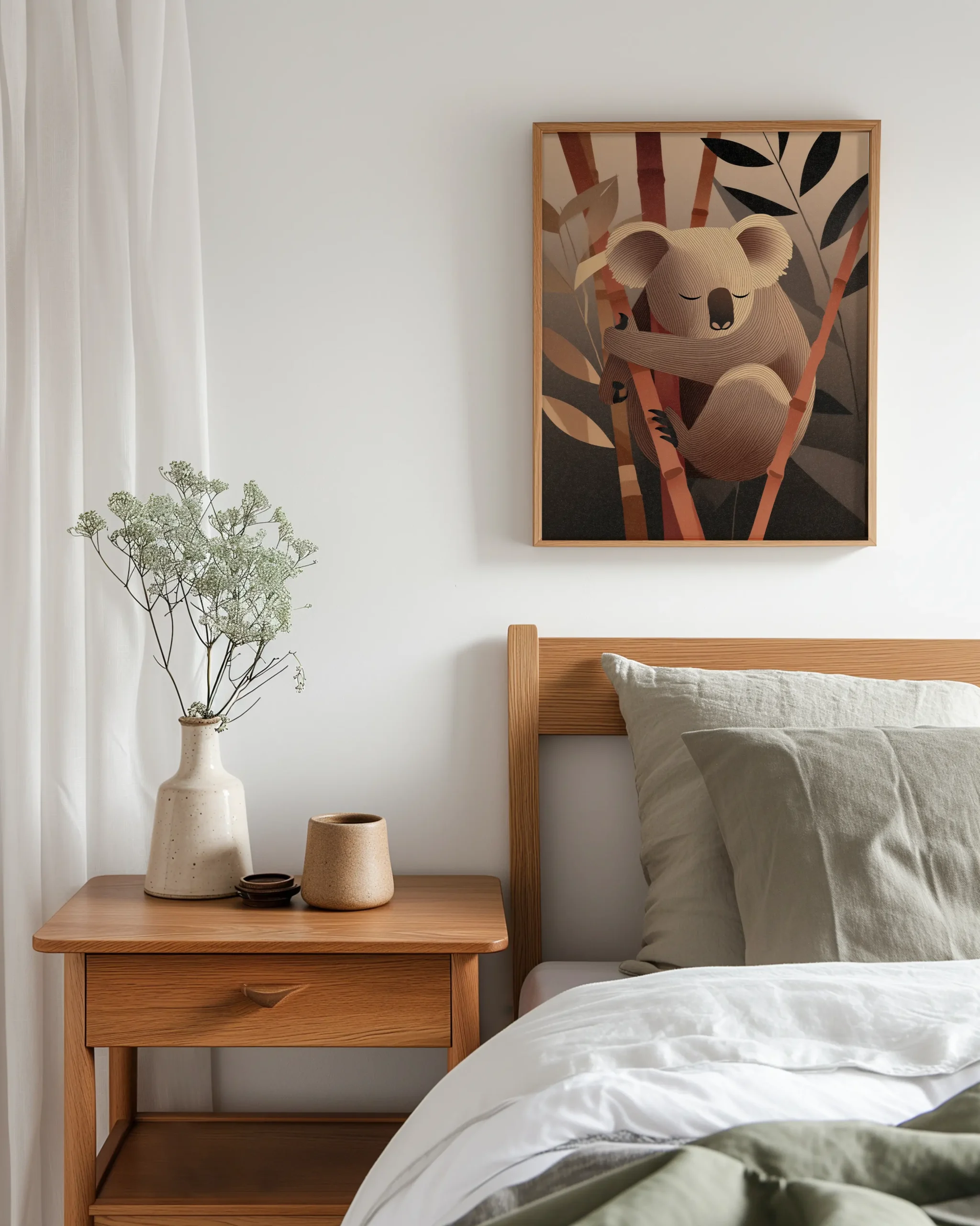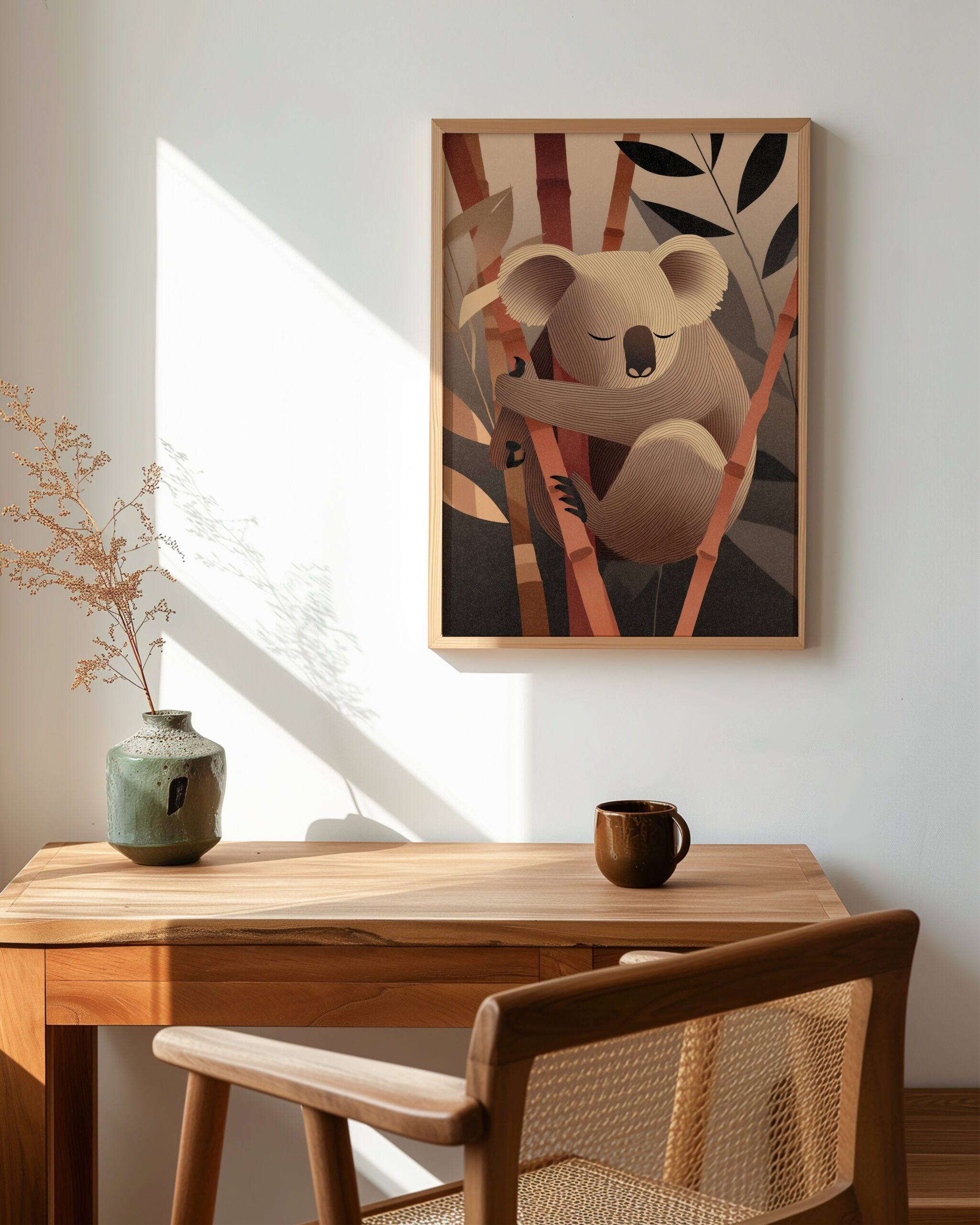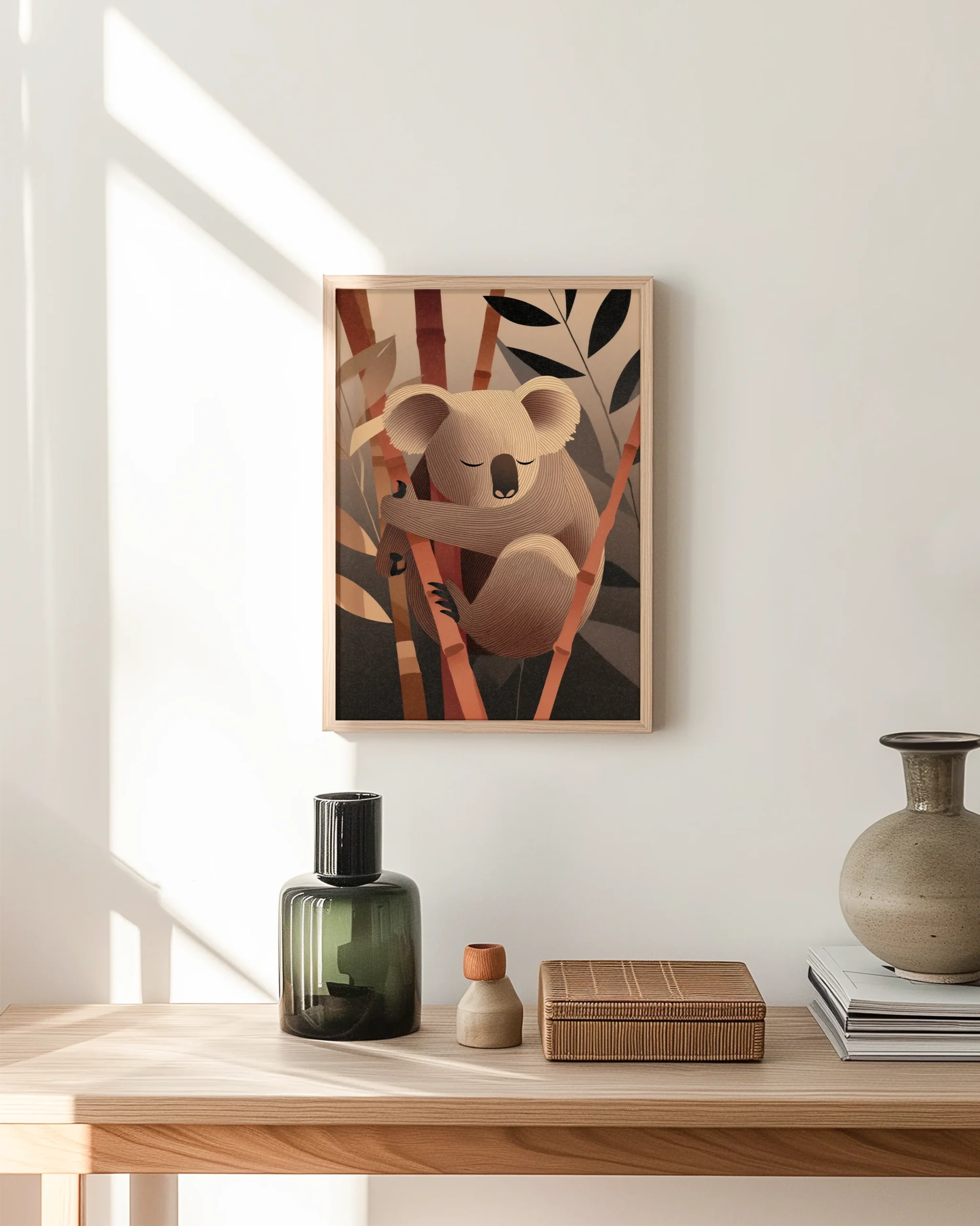 Koala Dreams in Bamboo captures a tranquil nap in the canopy: softly carved linework shapes a curled koala resting on a bamboo stem, surrounded by abstract foliage. The warm taupe-and-terracotta palette and gentle gradients create a soothing focal point for Japandi and modern neutral interiors.