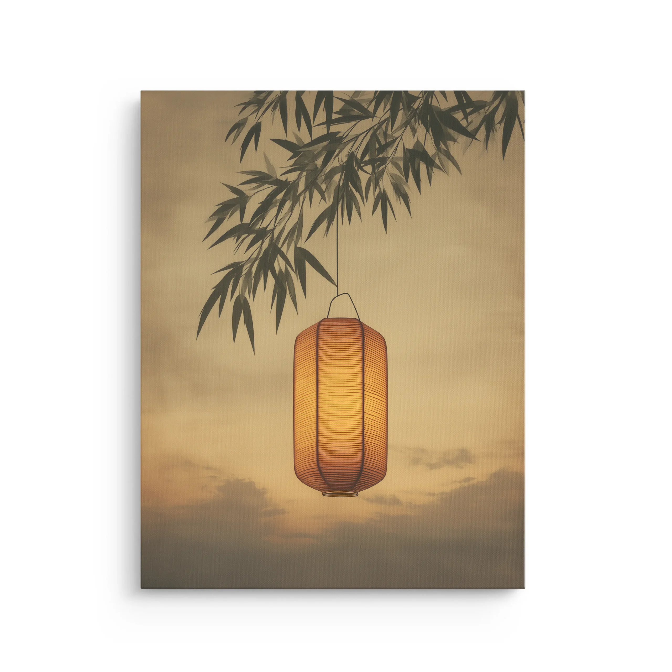 A softly glowing paper lantern hangs beneath bamboo leaves, capturing a quiet dusk moment in a minimal Japanese-inspired style.