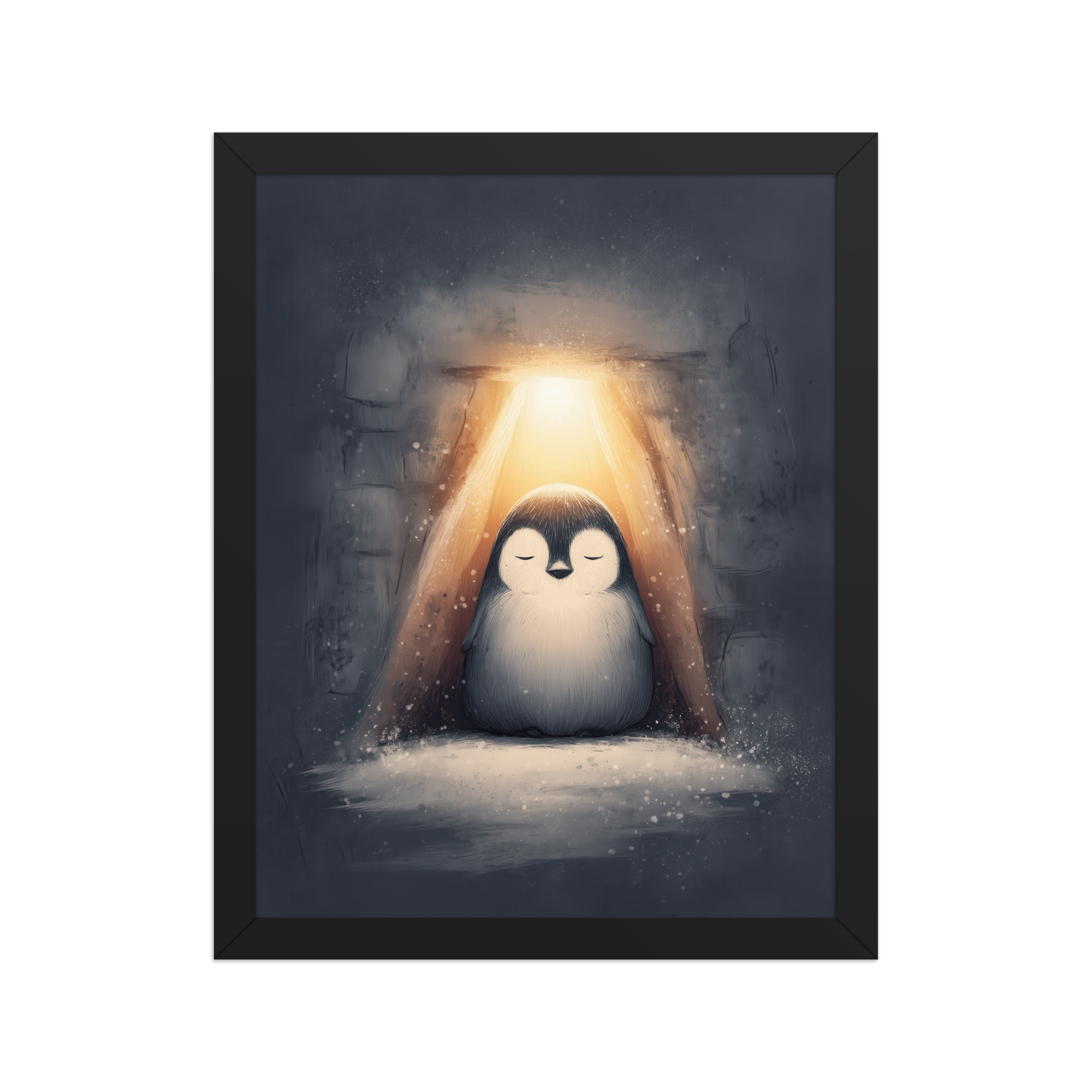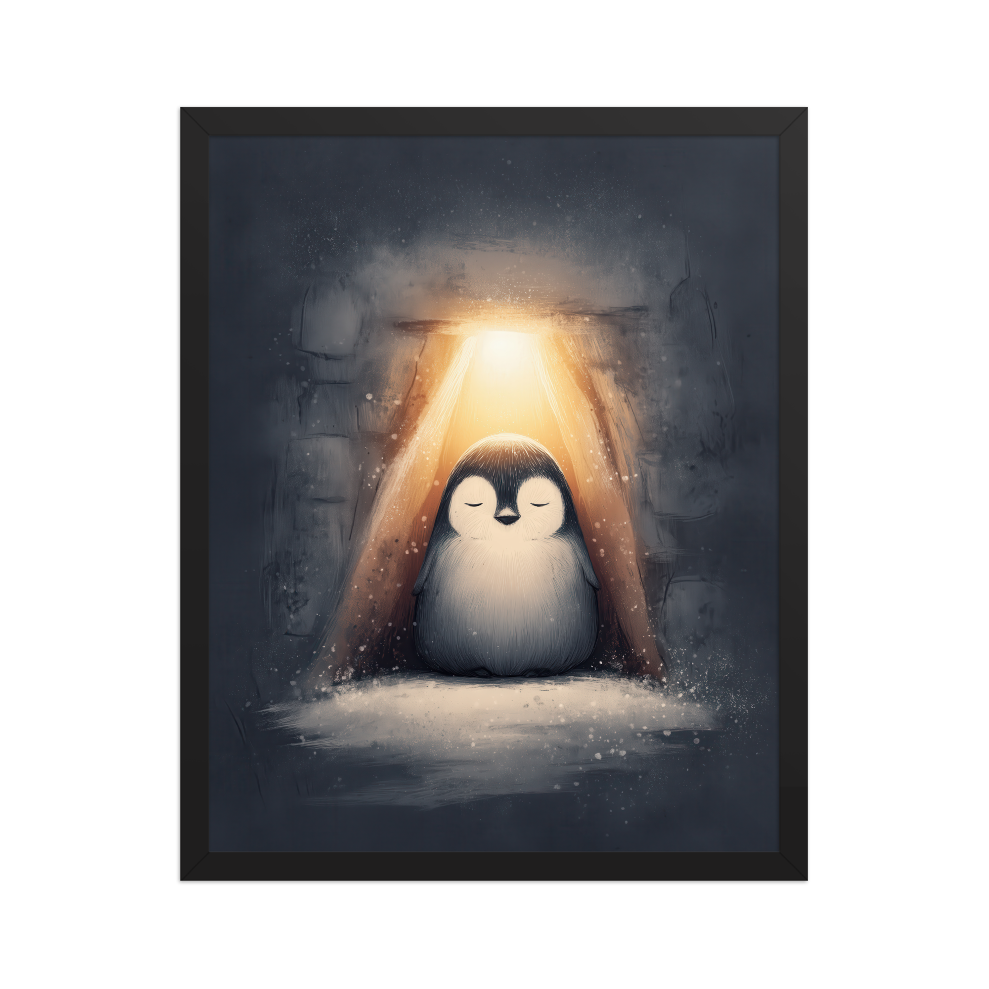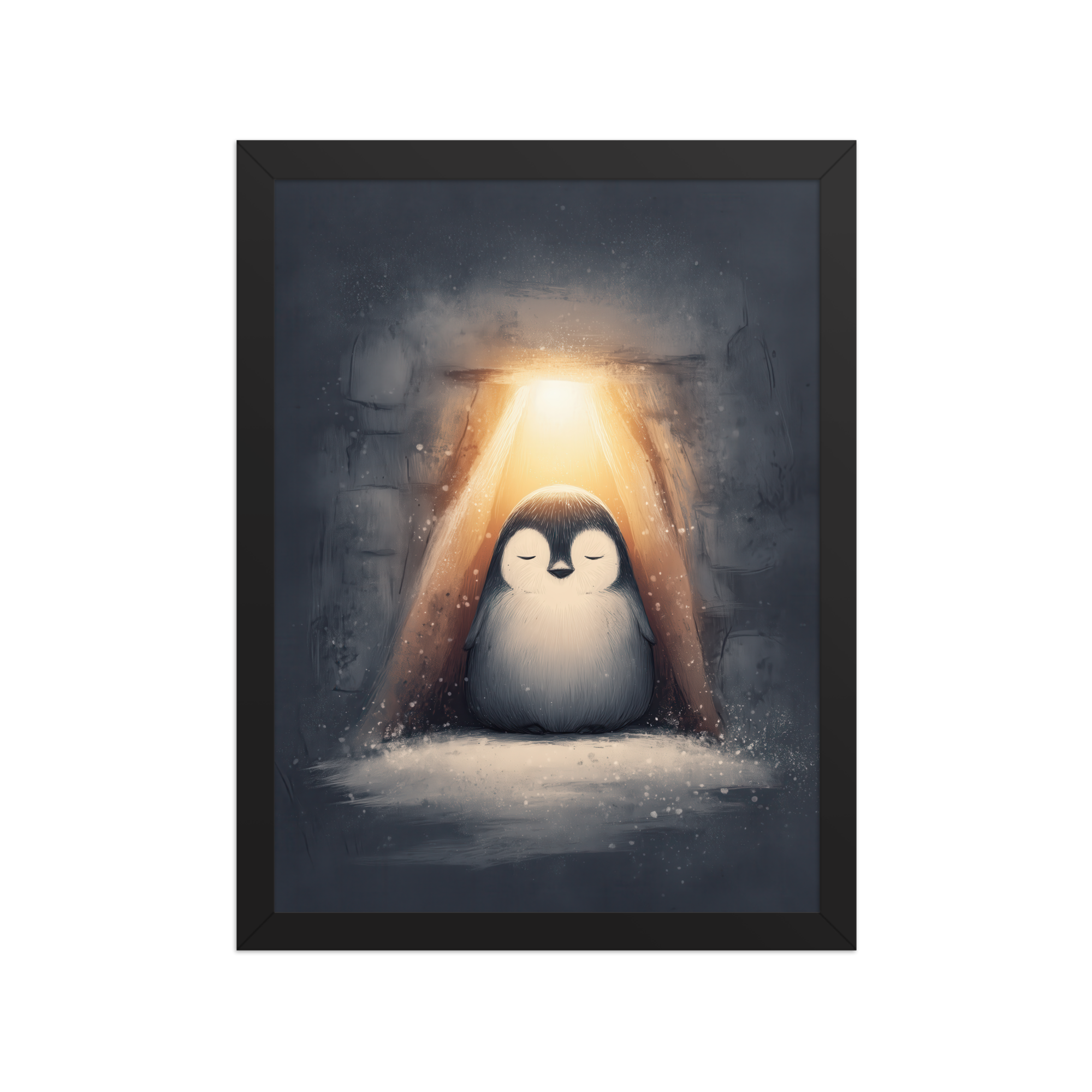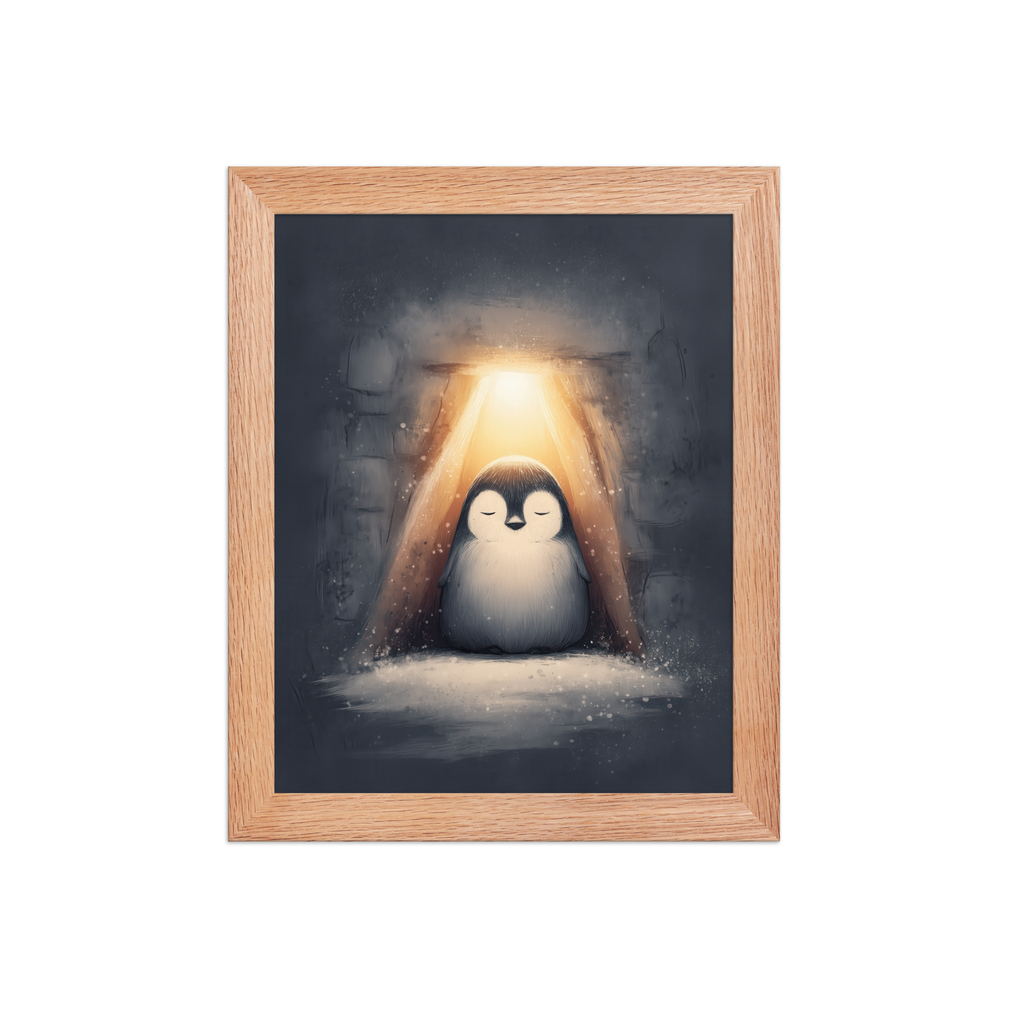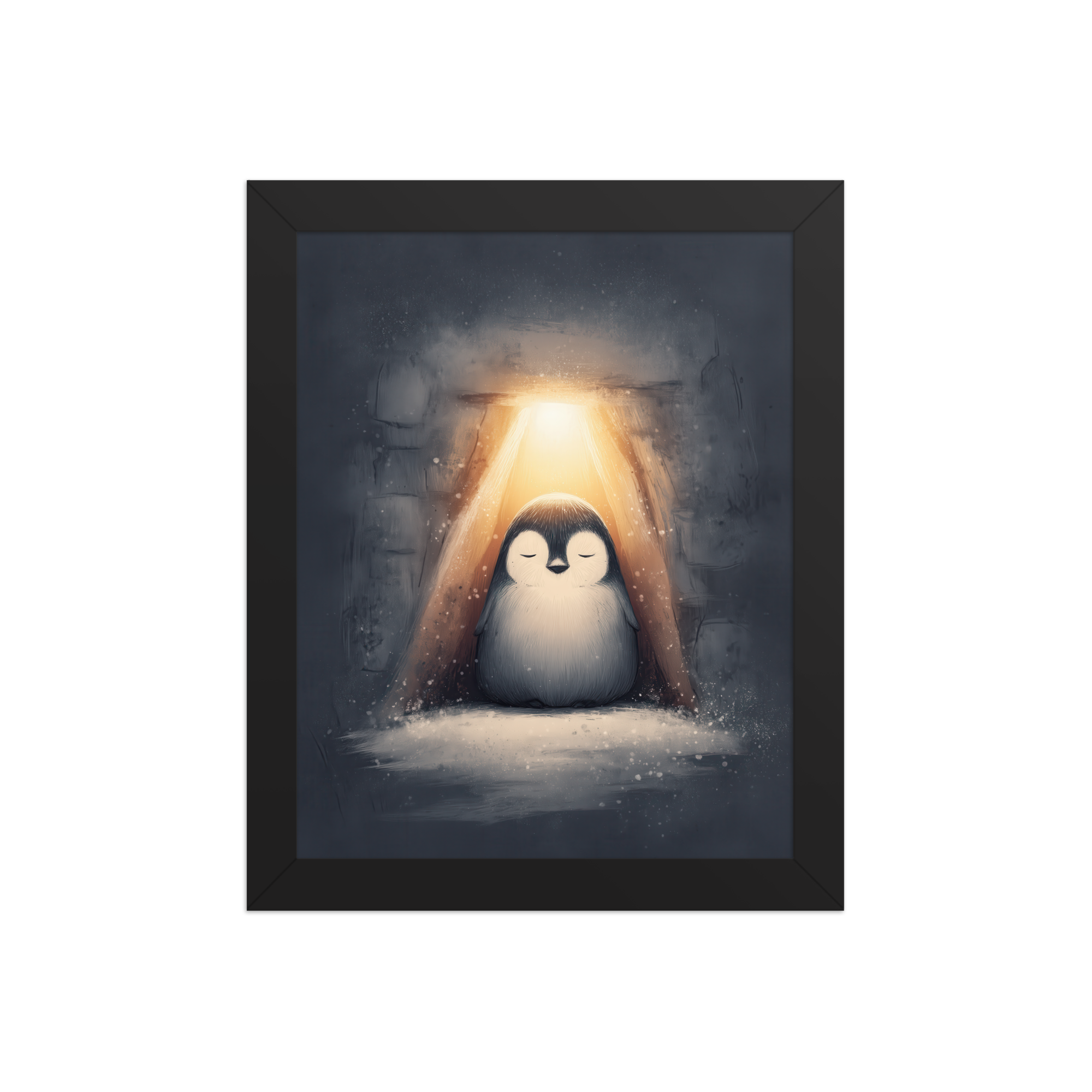 A peaceful penguin meditates beneath a warm golden glow inside a snowy shelter—cozy winter wall art in soft blue-greys and neutrals, printed on museum-quality enhanced matte paper. Framed and ready to hang with your preferred frame (Black, White, or Red Oak).