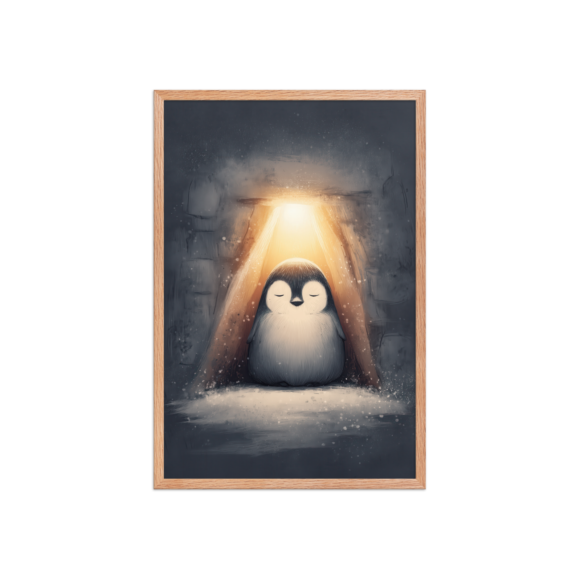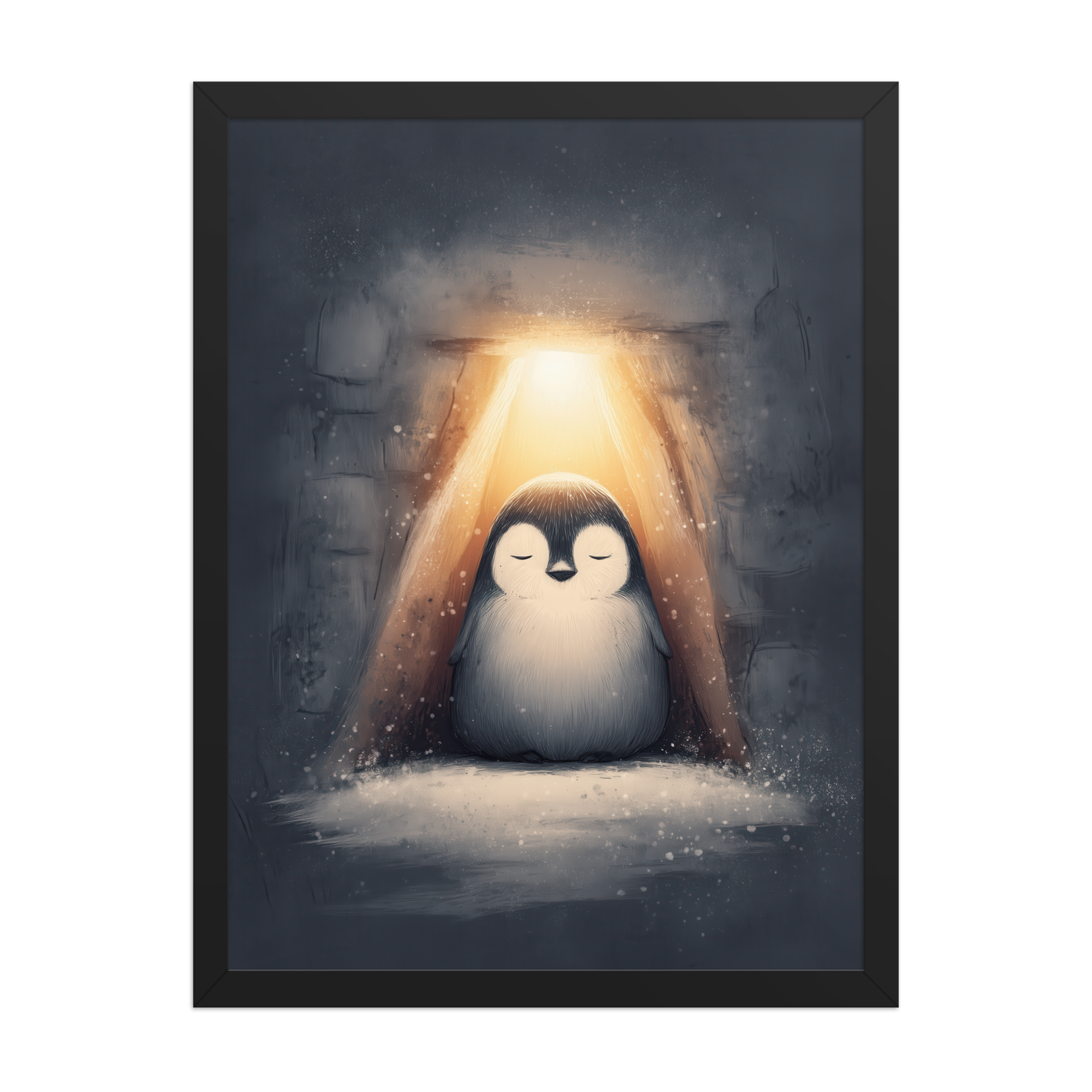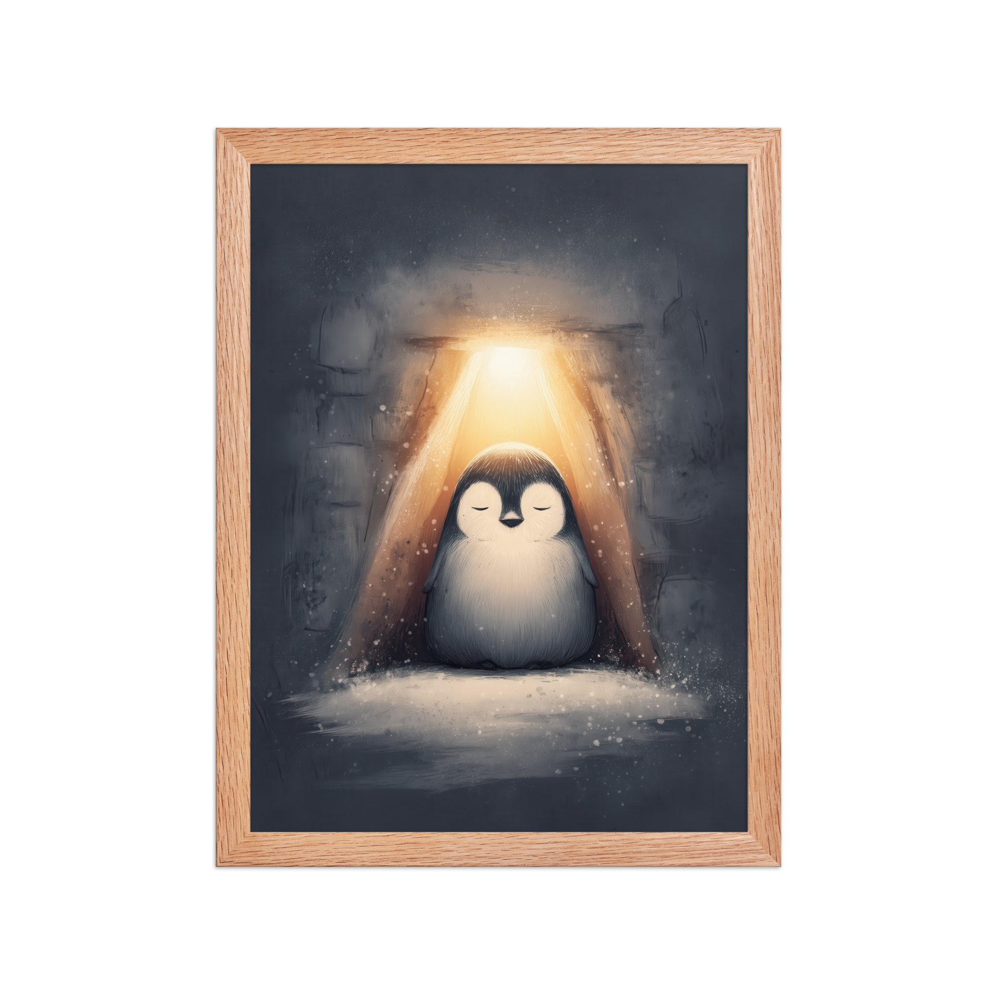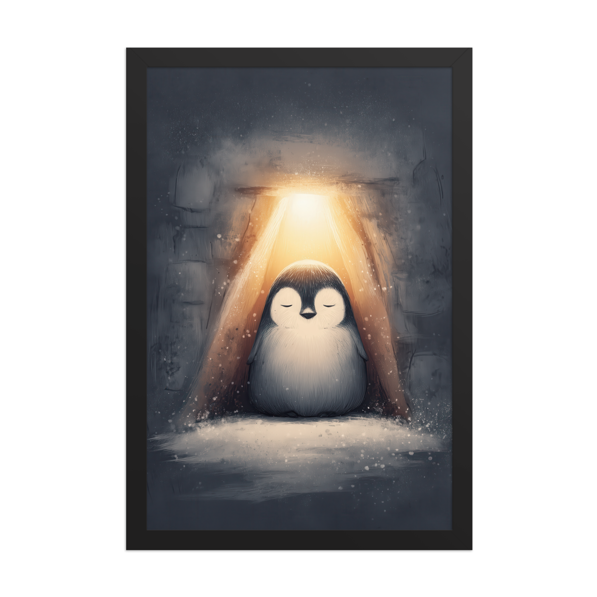A peaceful penguin meditates beneath a warm golden glow inside a snowy shelter—cozy winter wall art in soft blue-greys and neutrals, printed on museum-quality enhanced matte paper. Framed and ready to hang with your preferred frame (Black, White, or Red Oak).