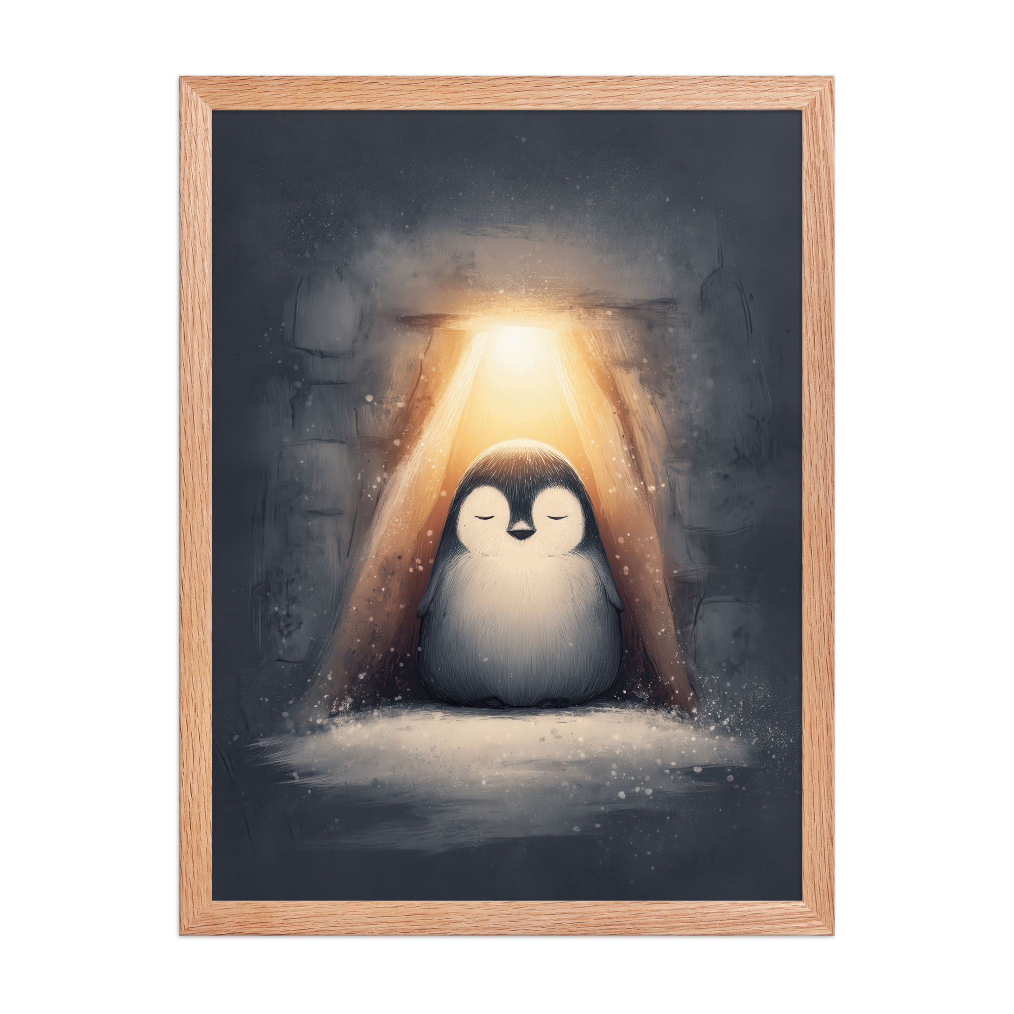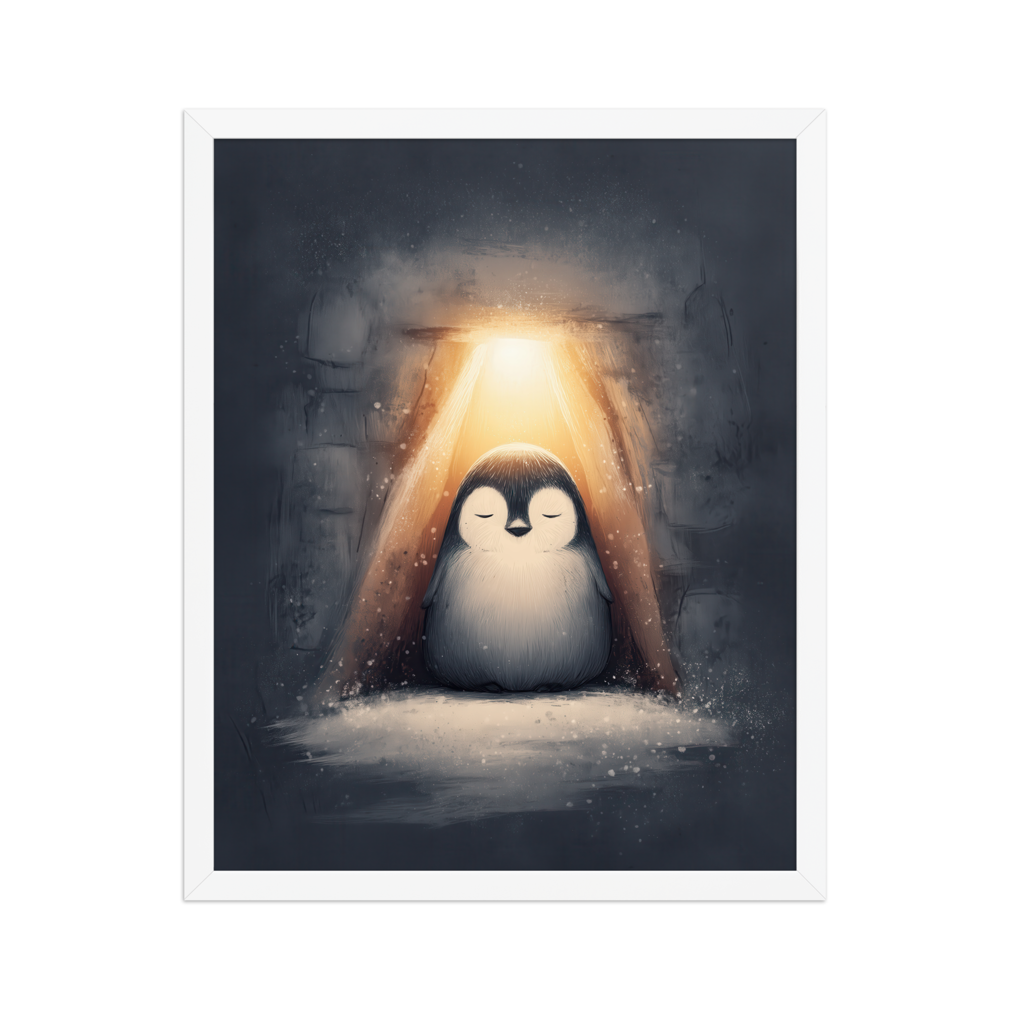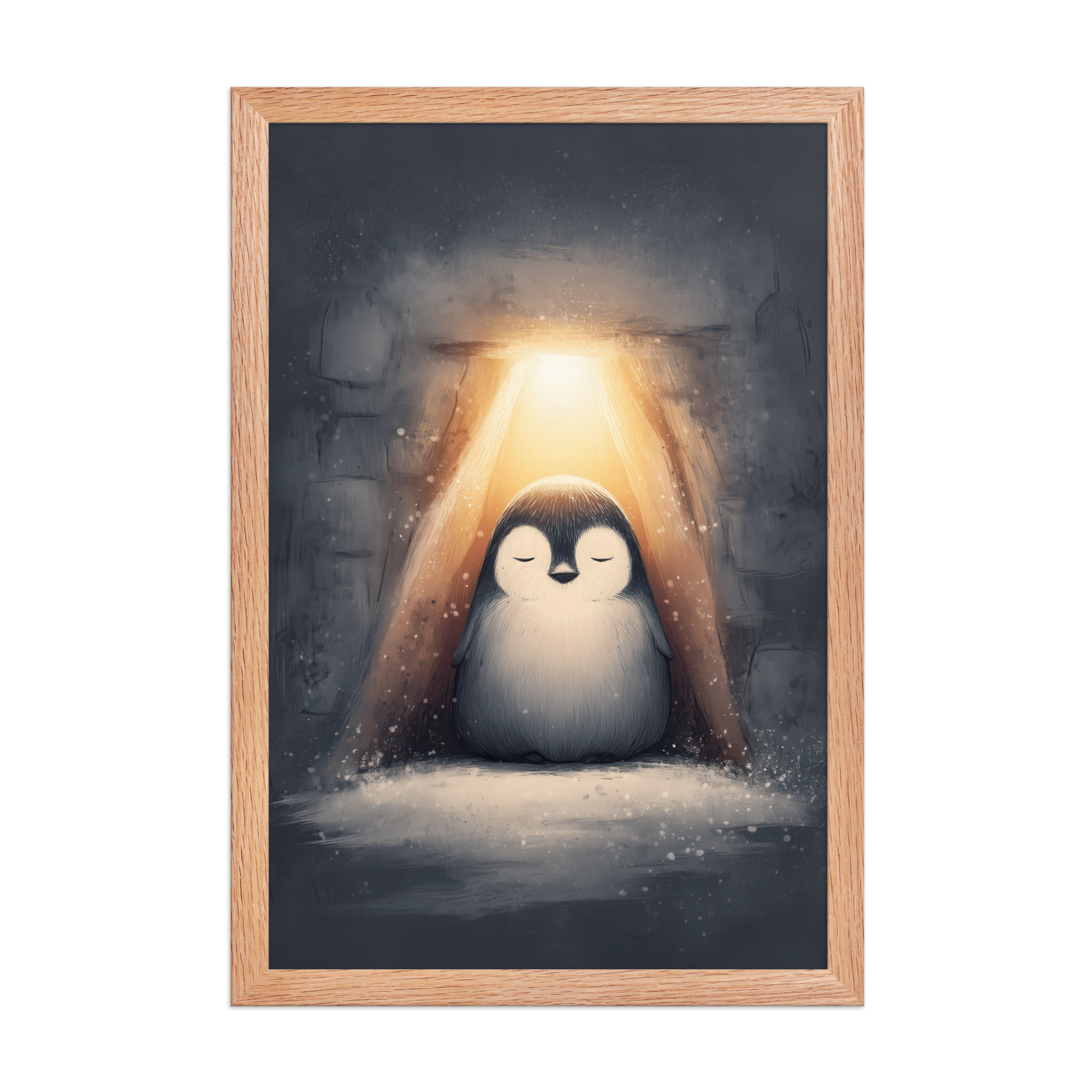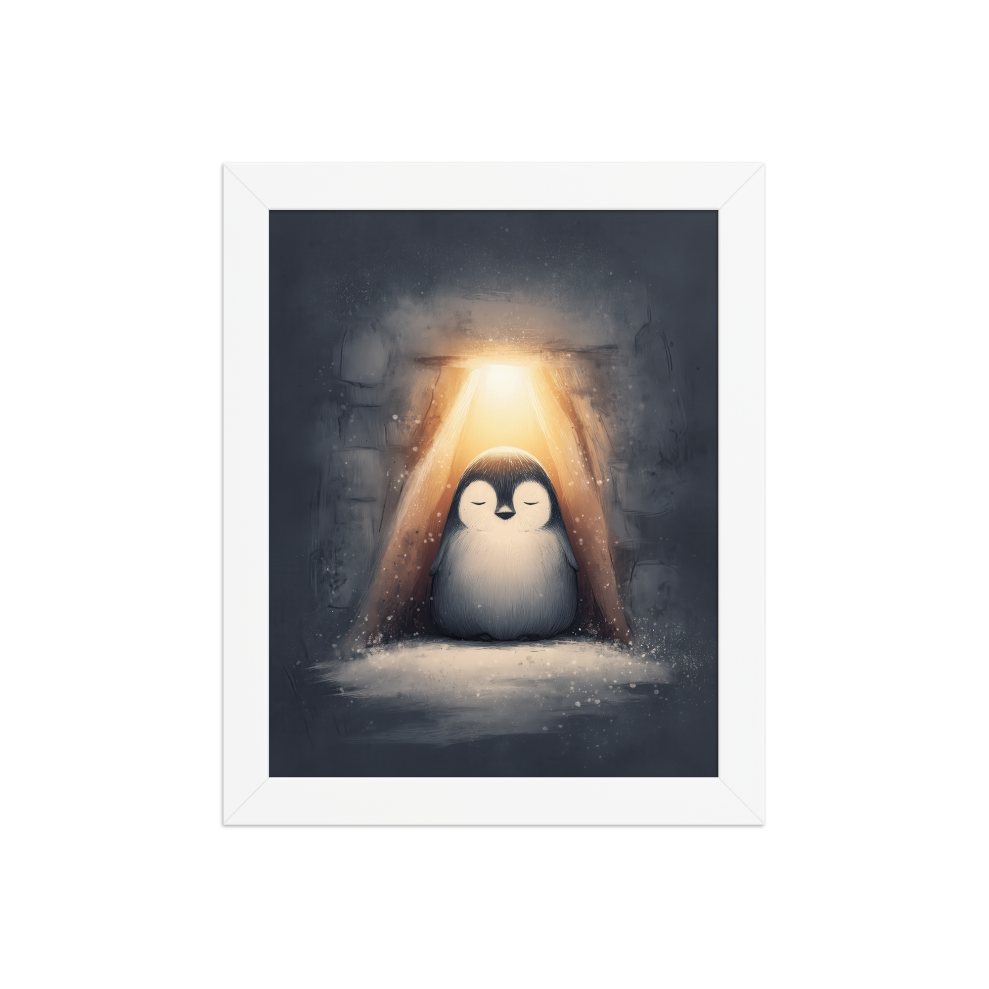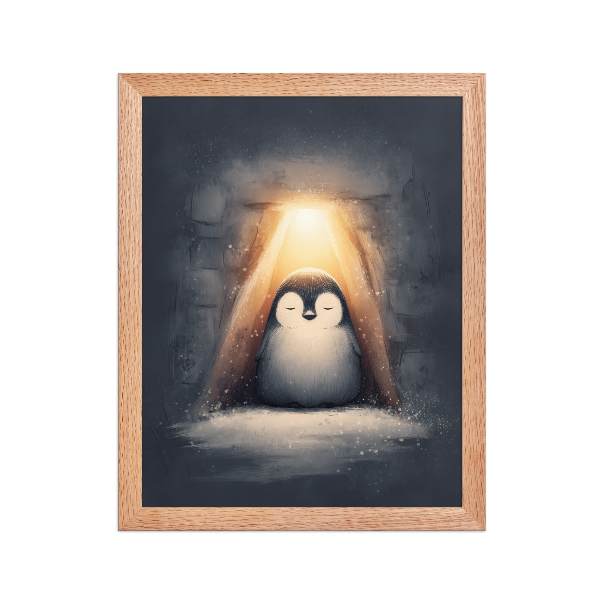 A peaceful penguin meditates beneath a warm golden glow inside a snowy shelter—cozy winter wall art in soft blue-greys and neutrals, printed on museum-quality enhanced matte paper. Framed and ready to hang with your preferred frame (Black, White, or Red Oak).