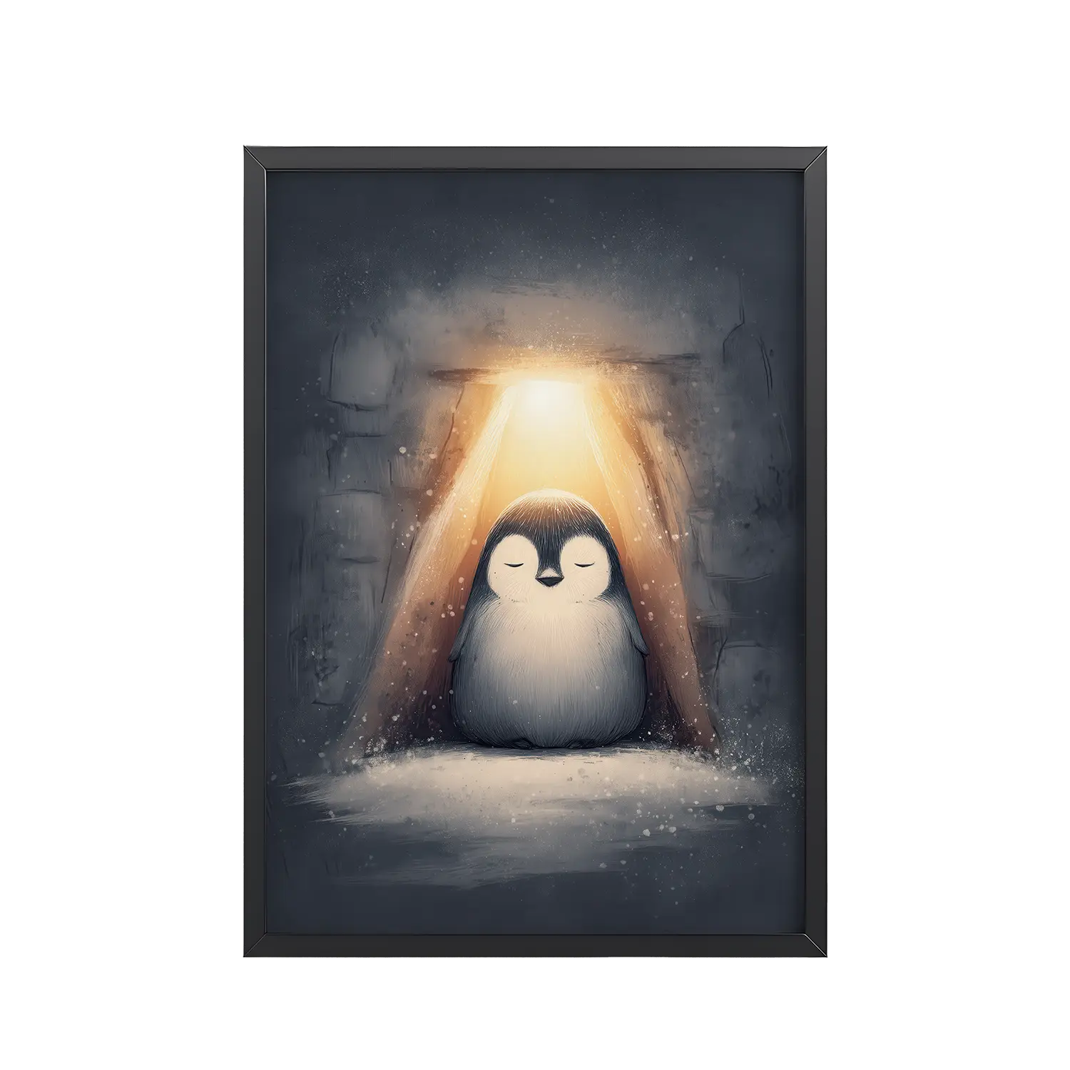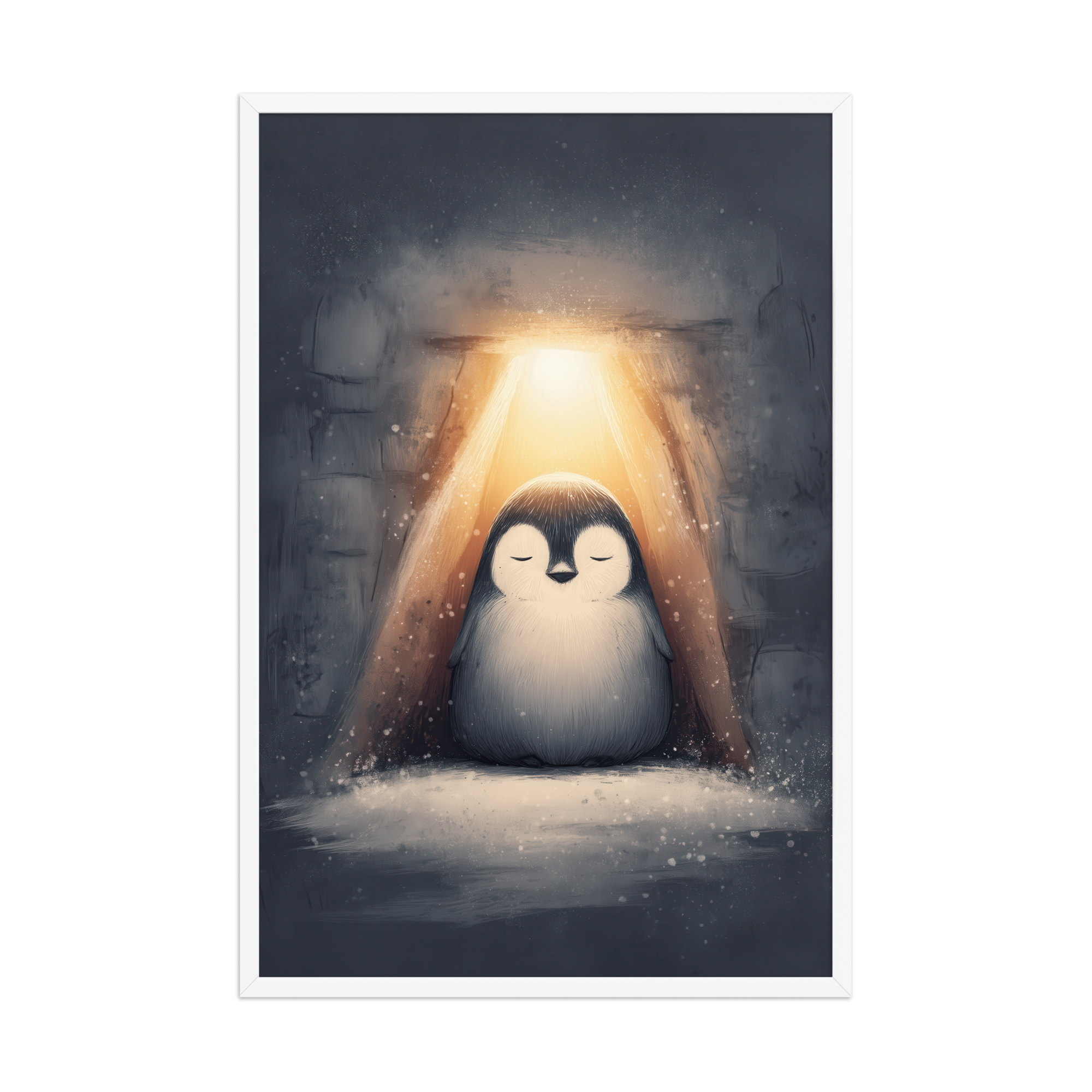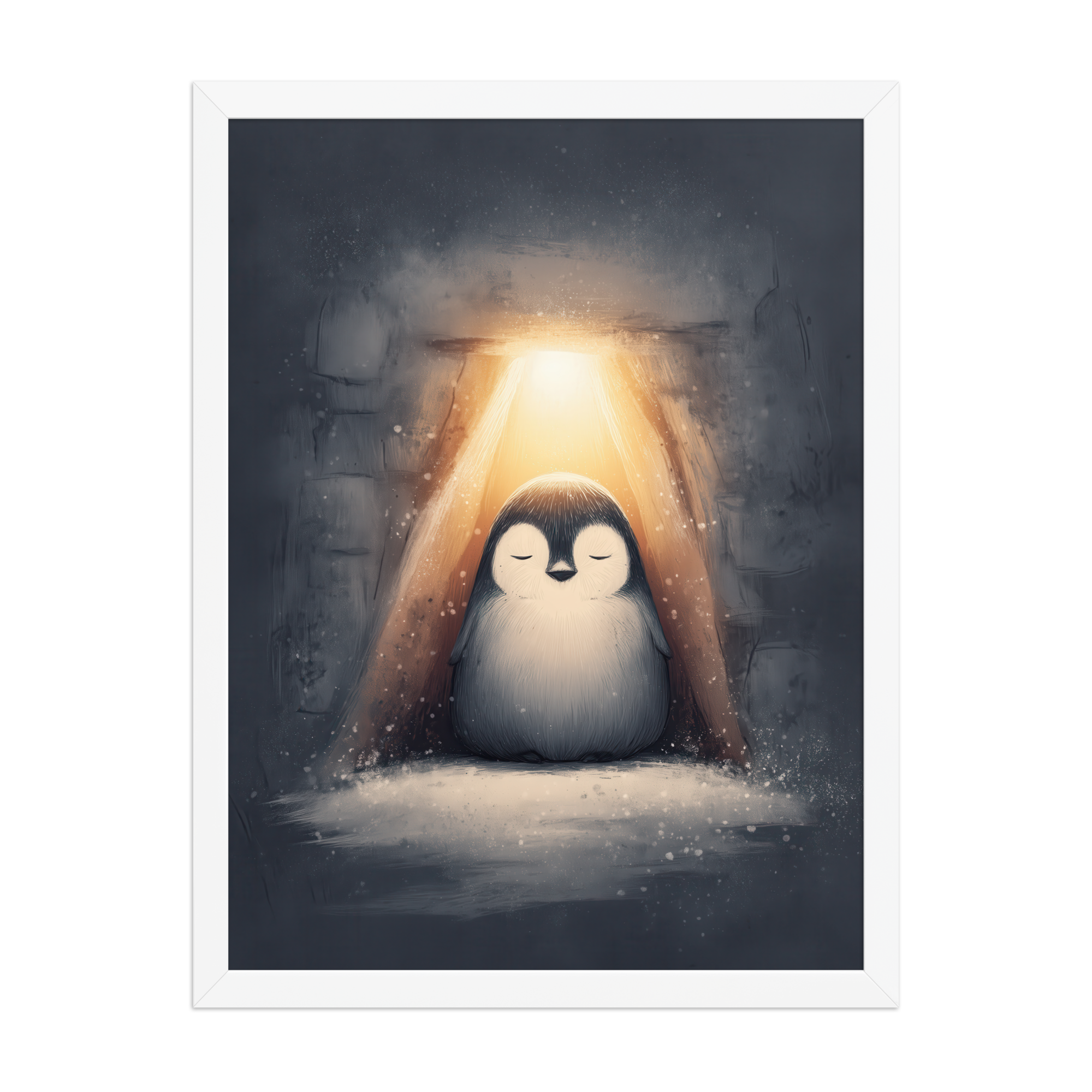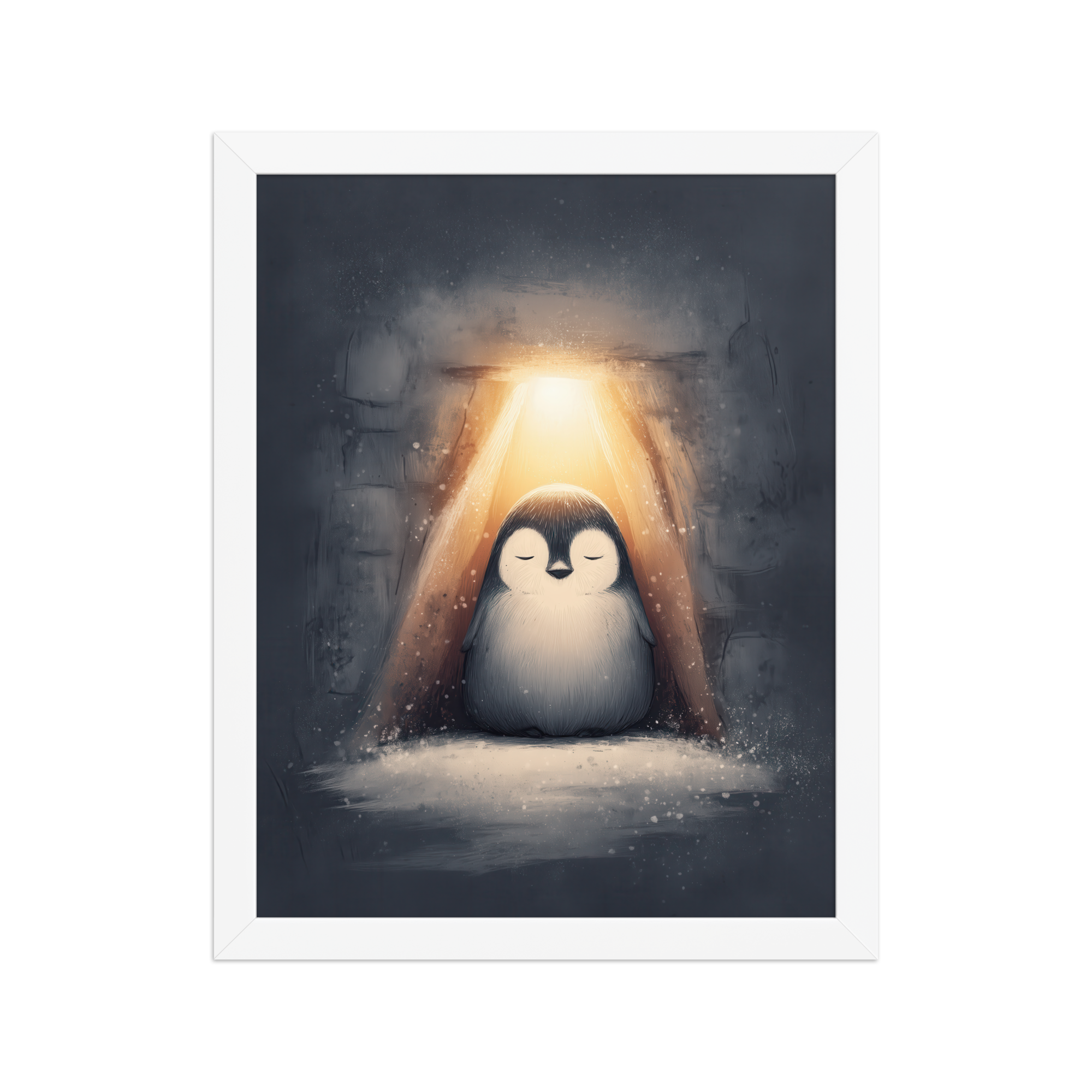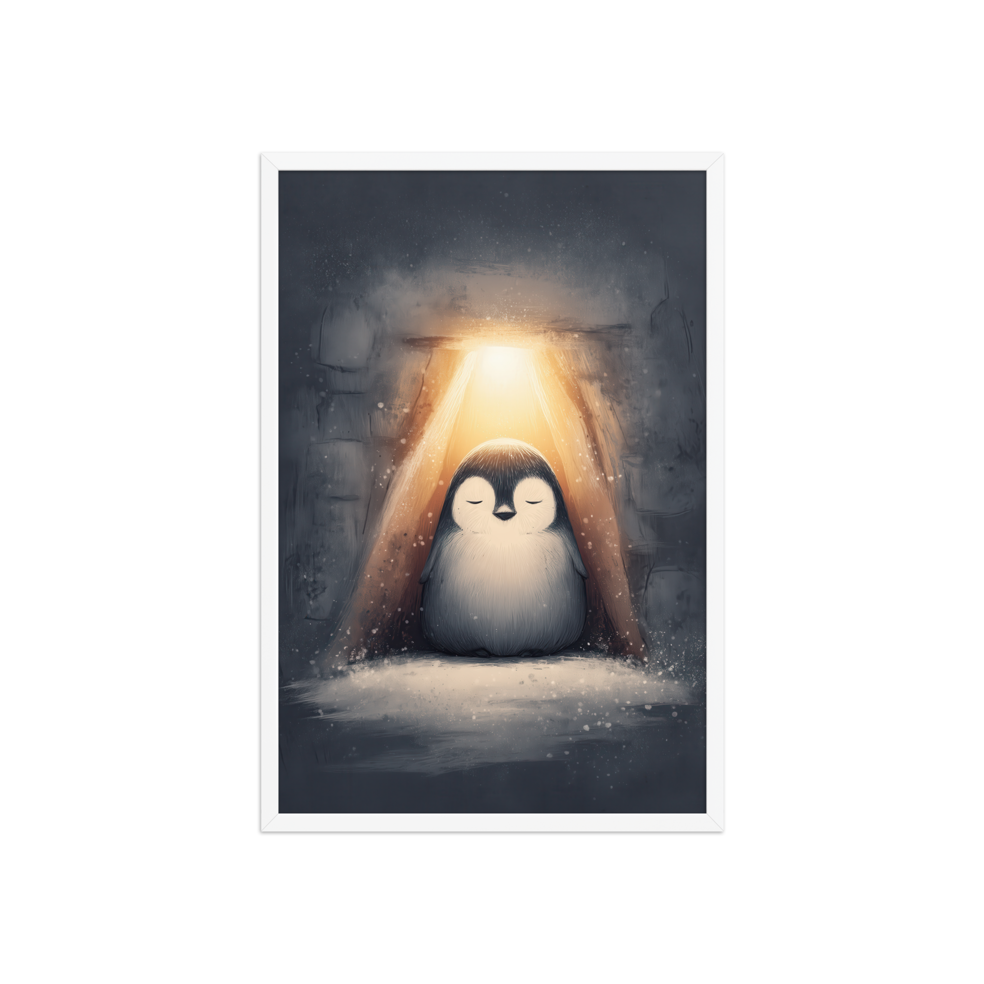 A peaceful penguin meditates beneath a warm golden glow inside a snowy shelter—cozy winter wall art in soft blue-greys and neutrals, printed on museum-quality enhanced matte paper. Framed and ready to hang with your preferred frame (Black, White, or Red Oak).