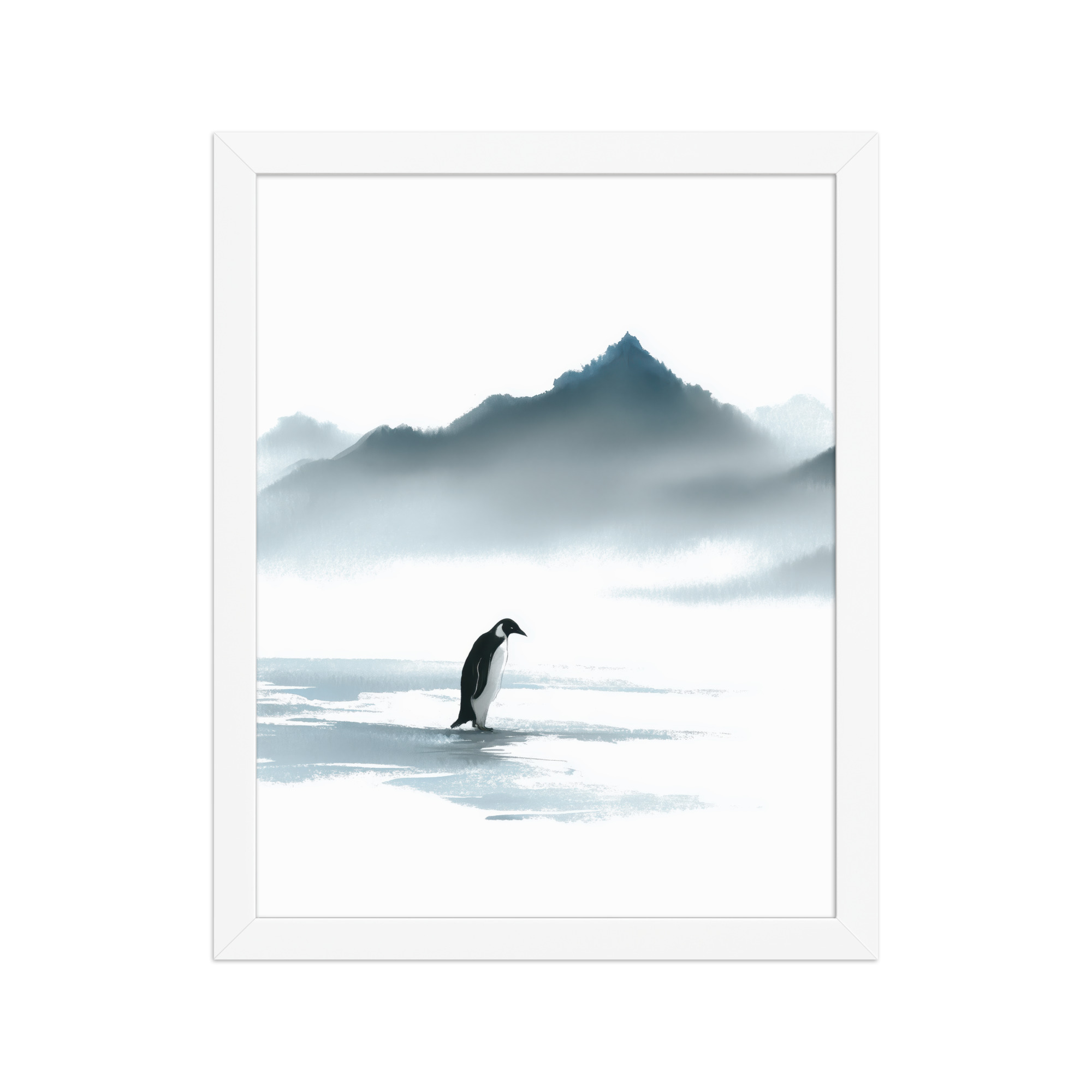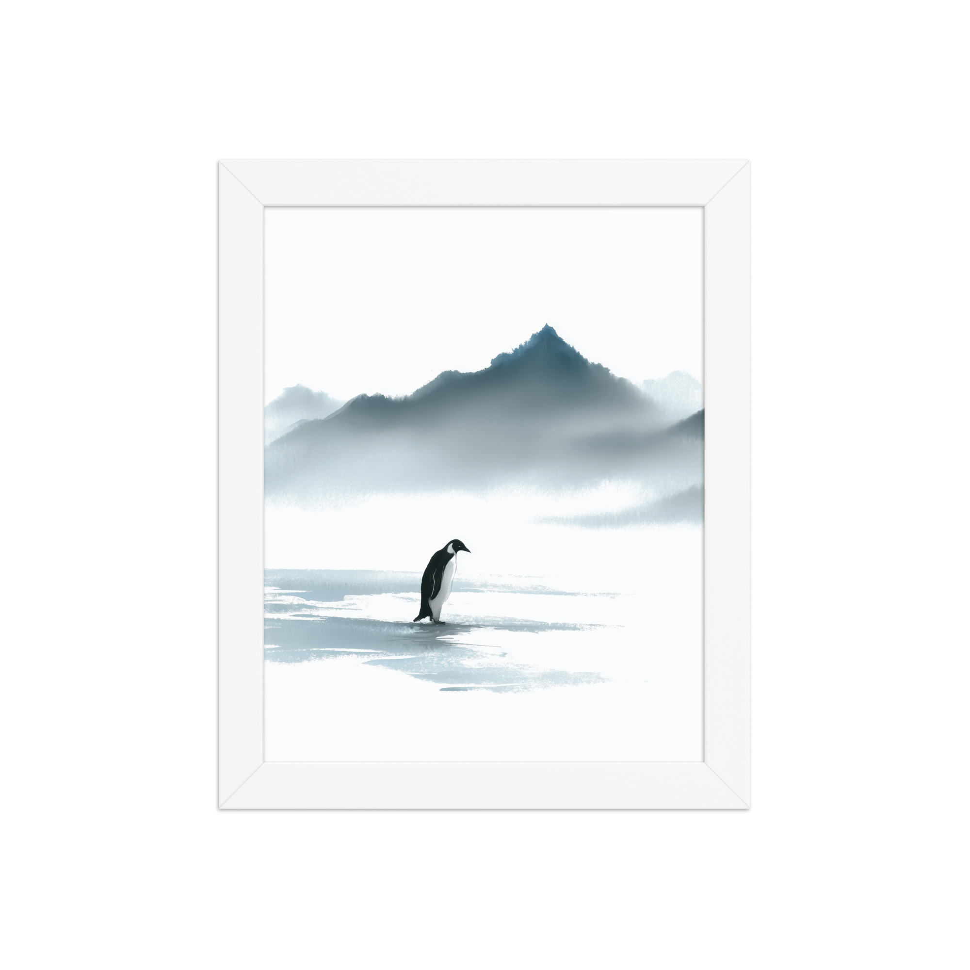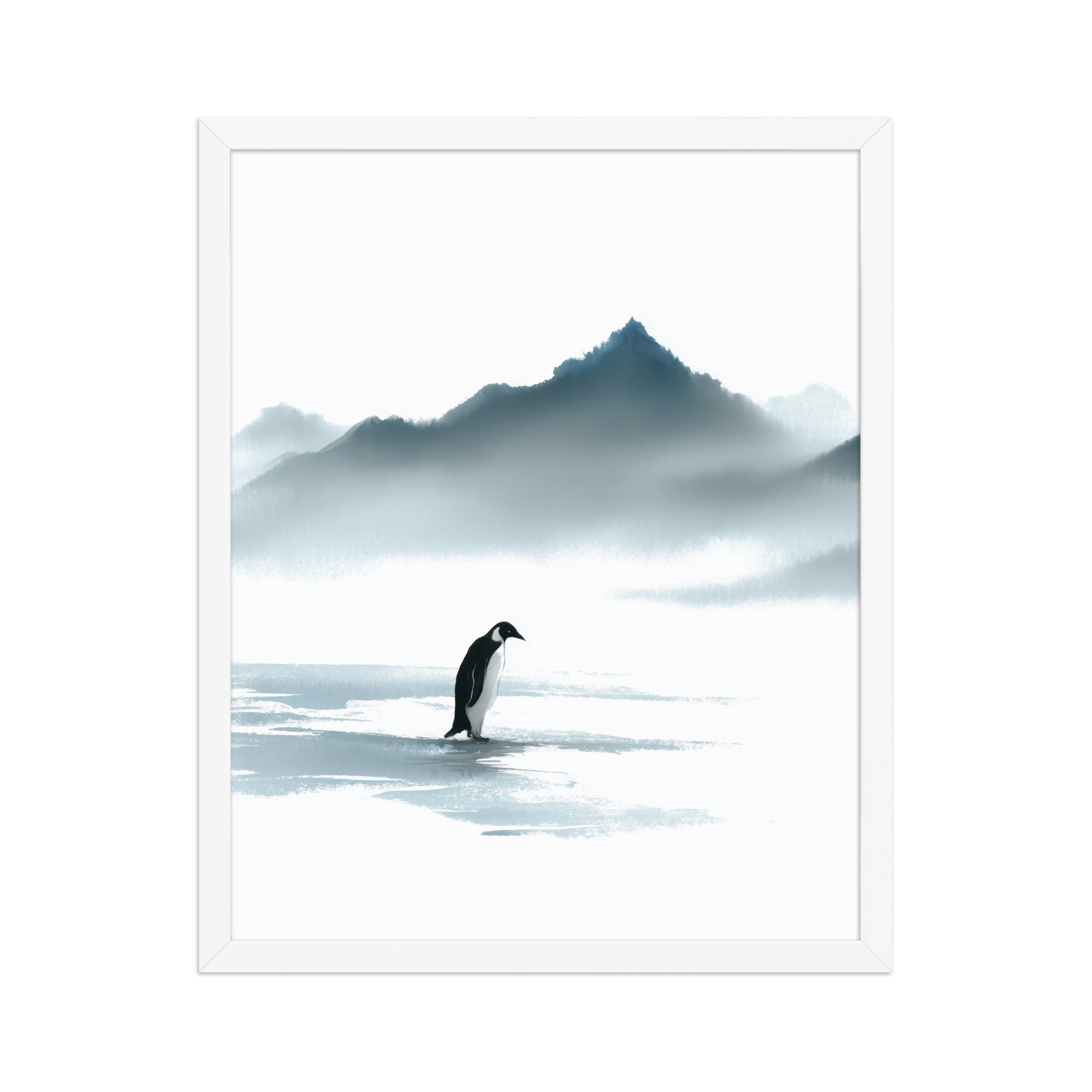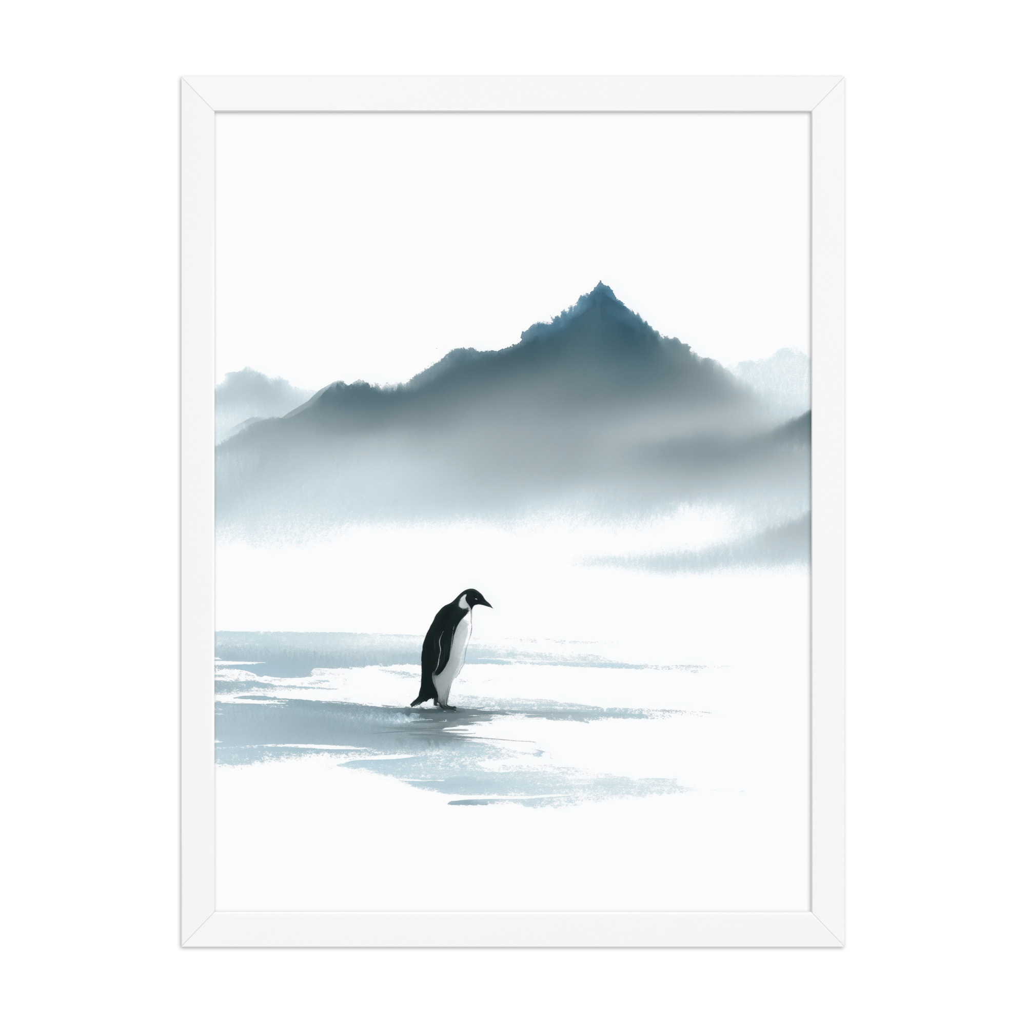Lone Penguin Mist I captures a quiet pause in the arctic: a single penguin holding still while cool light washes over fog-softened peaks. The generous negative space and restrained palette create an atmosphere of clarity and calm for minimalist and Japandi interiors.