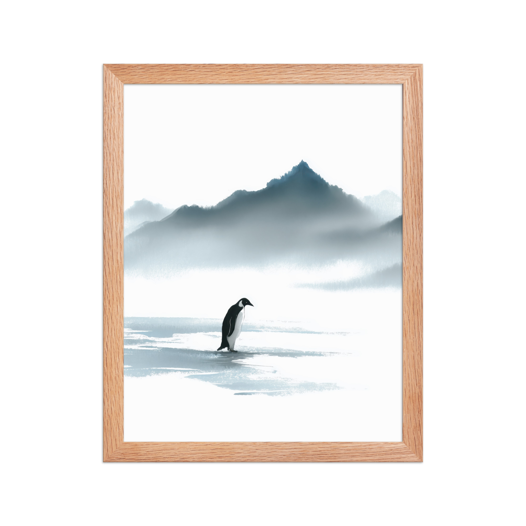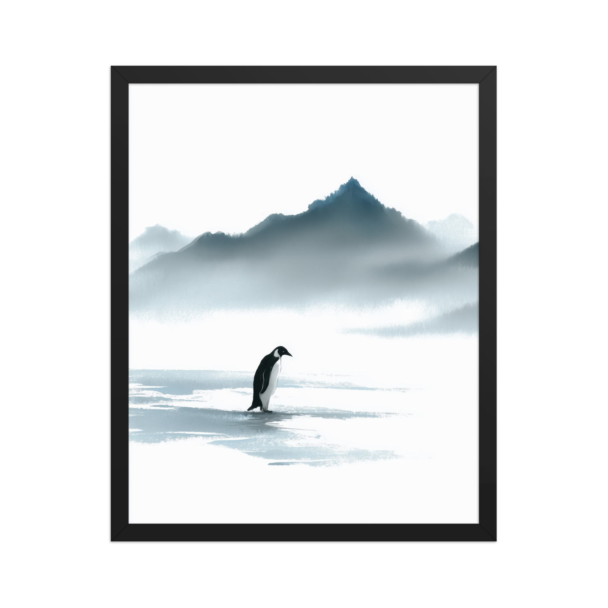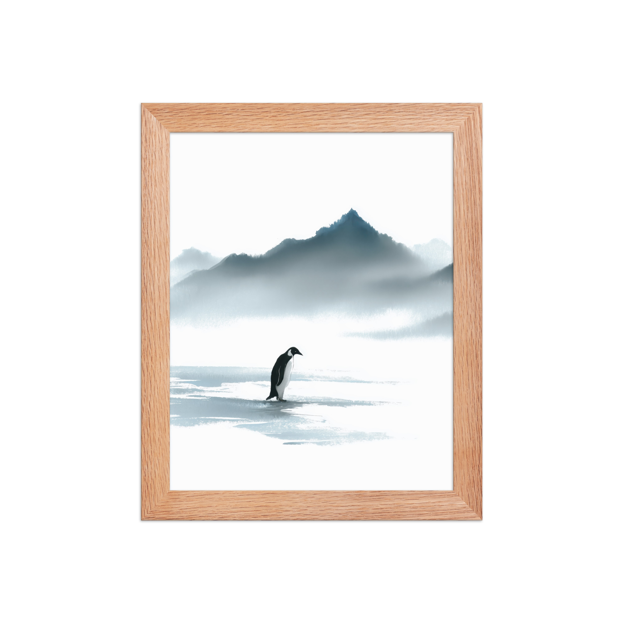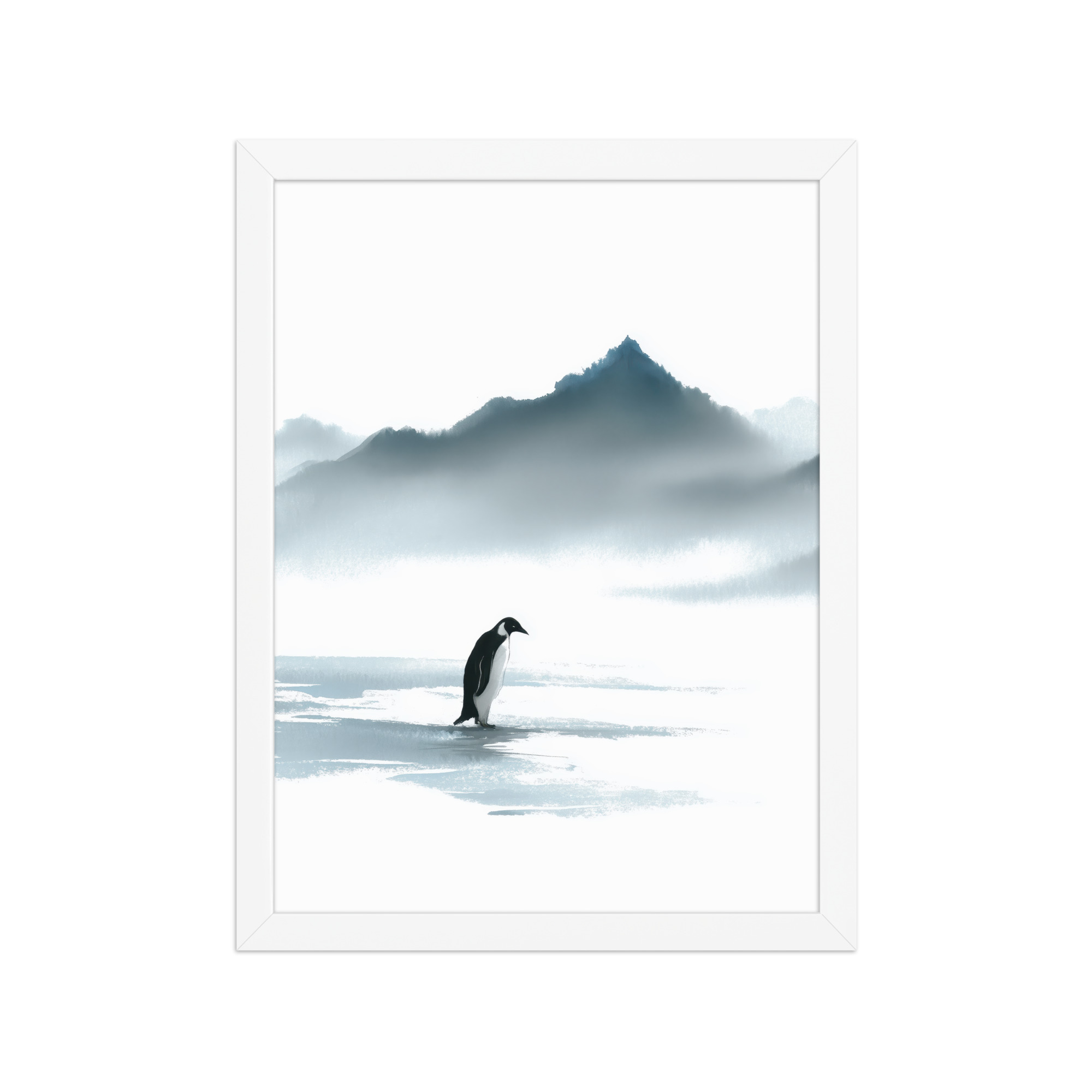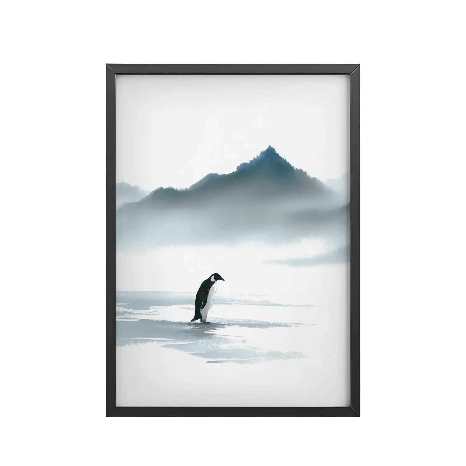 Lone Penguin Mist I captures a quiet pause in the arctic: a single penguin holding still while cool light washes over fog-softened peaks. The generous negative space and restrained palette create an atmosphere of clarity and calm for minimalist and Japandi interiors.